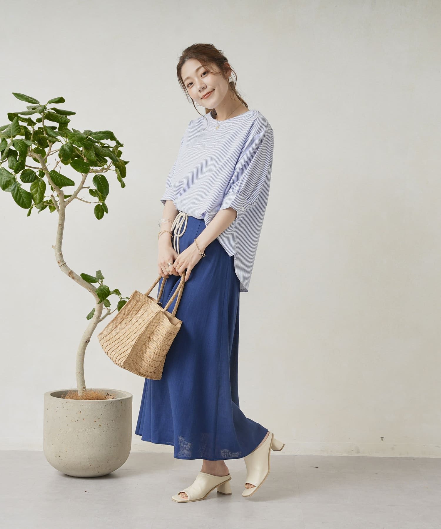 夏はTシャツ、秋口にかけてはショート丈のカーディガンや薄手ニットと合わせて