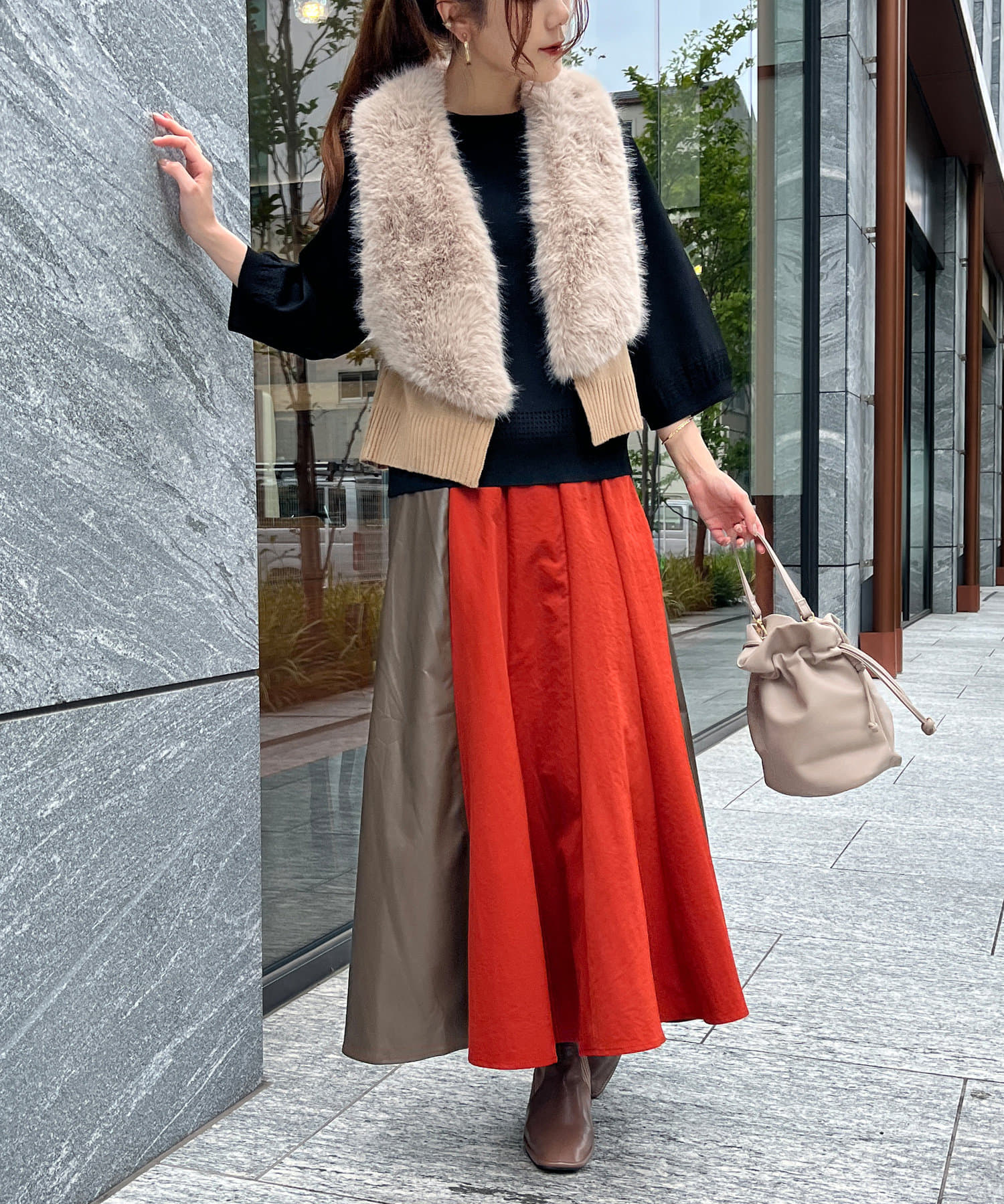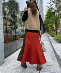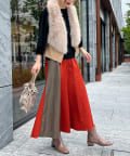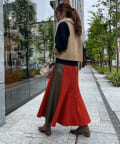 幅広くスタイリングに取り入れやすいベストは、スカートコーディネートや