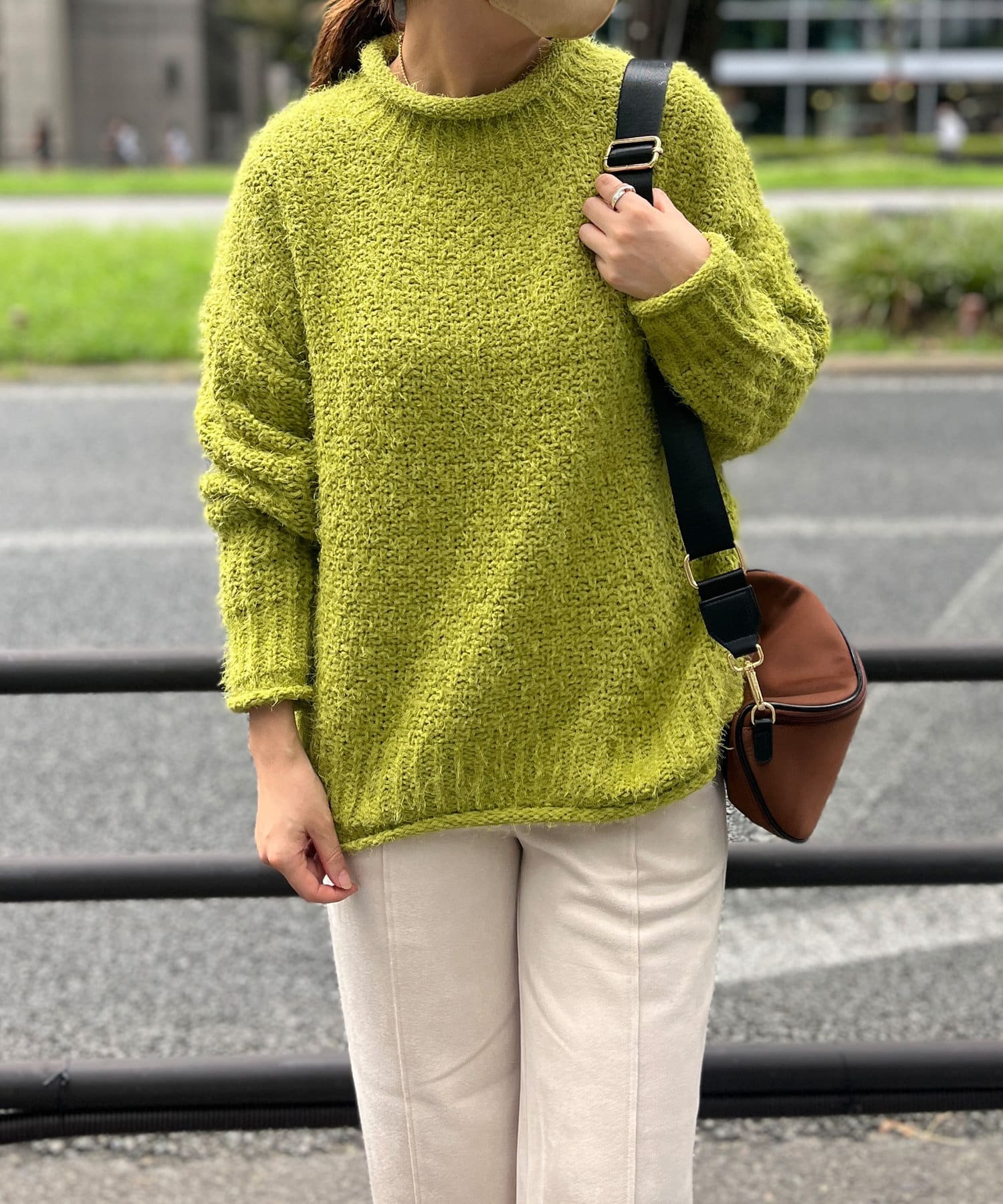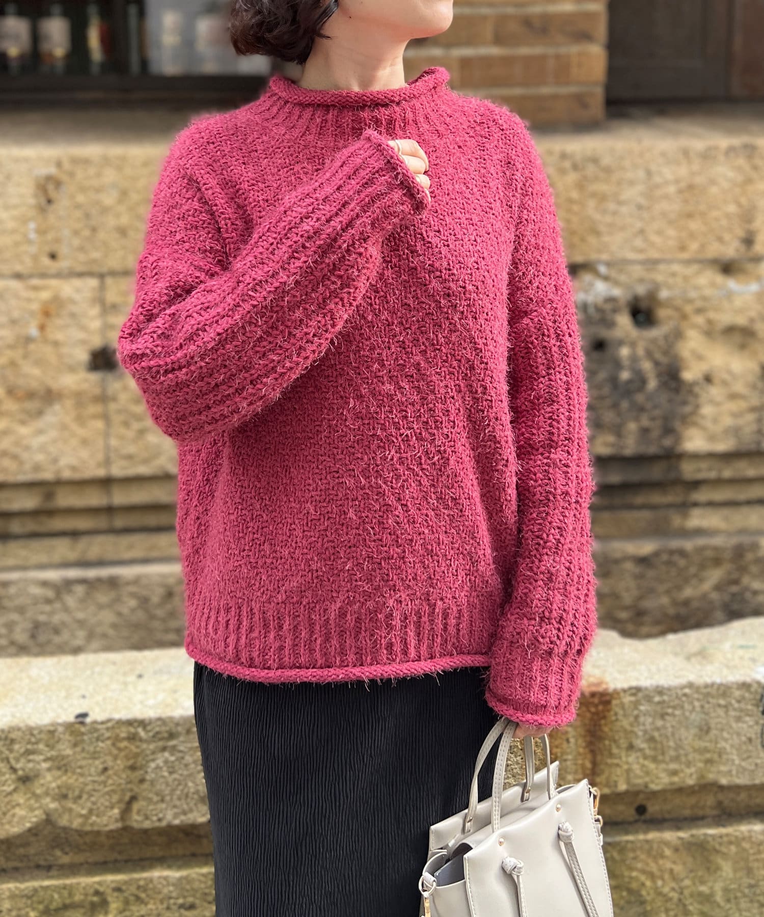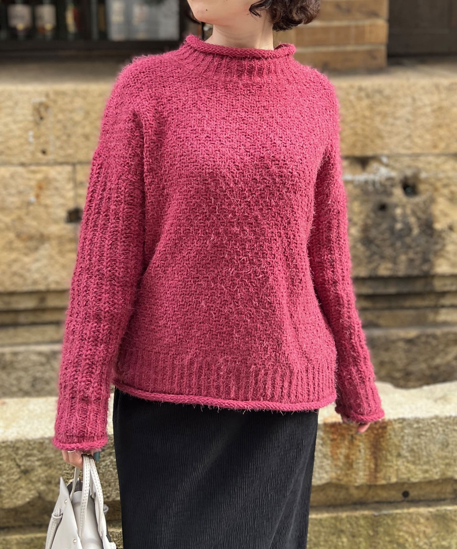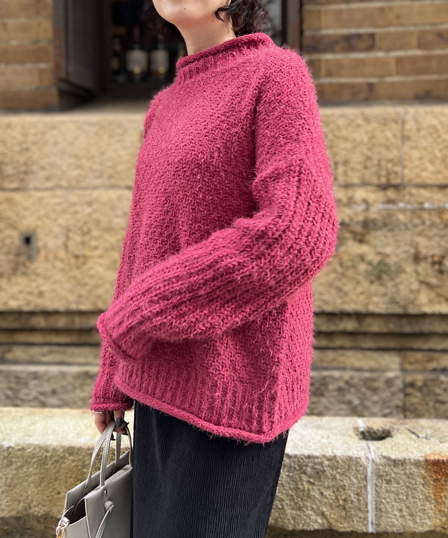 バスケットのような凹凸のある編立てがシンプルなコーディネートにも映える1枚です。