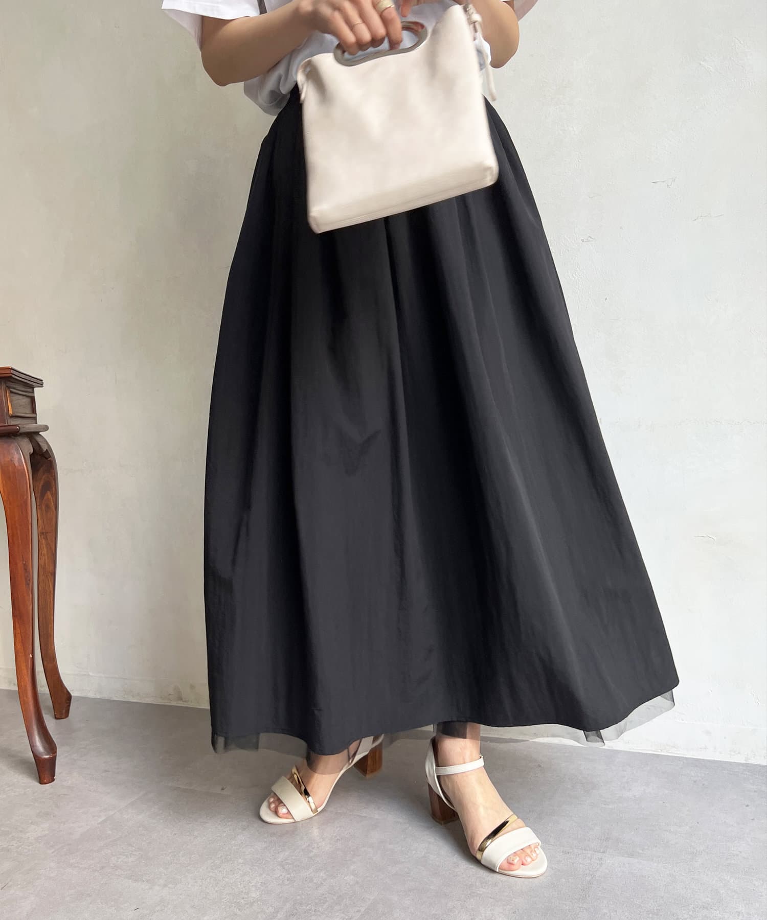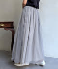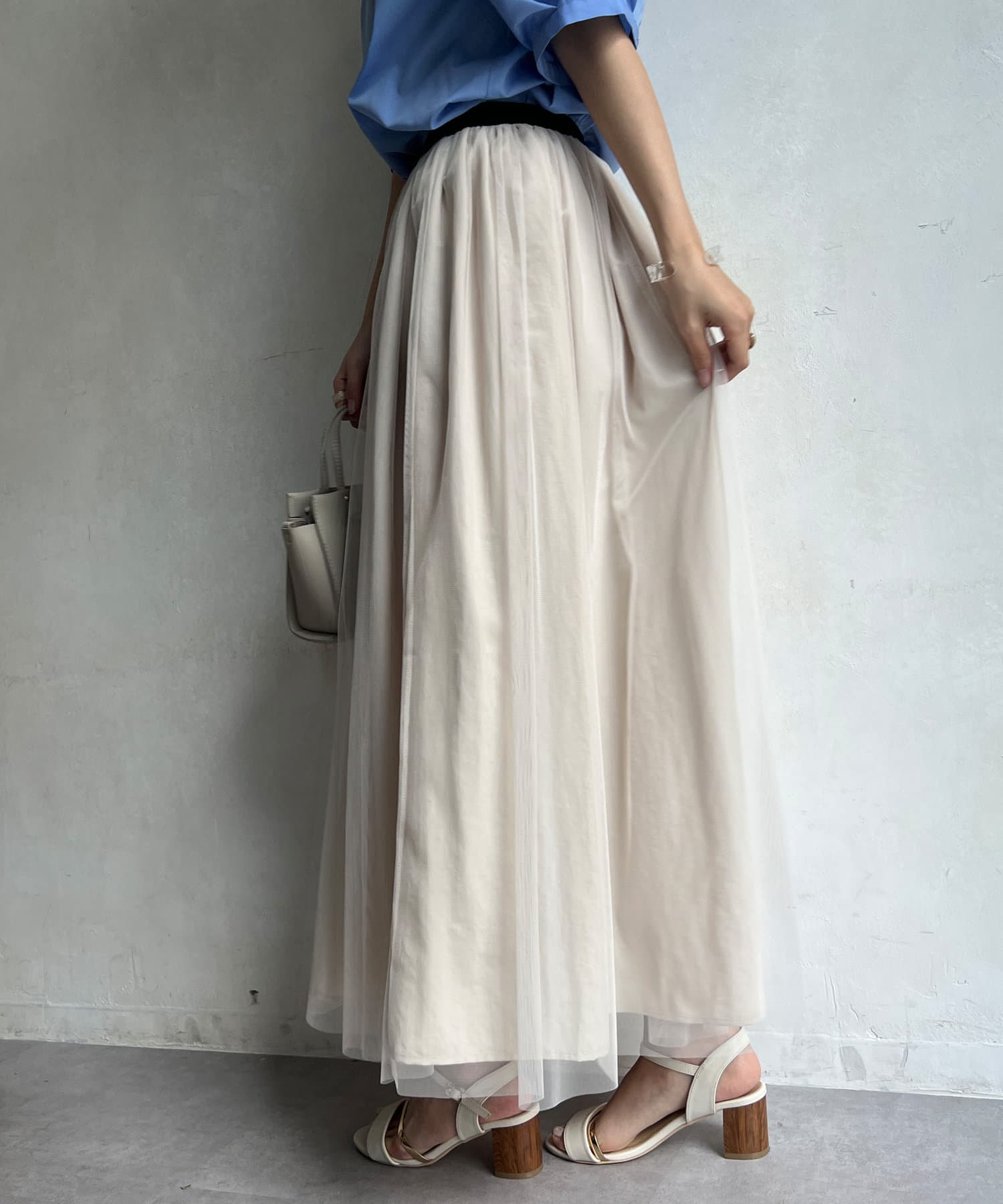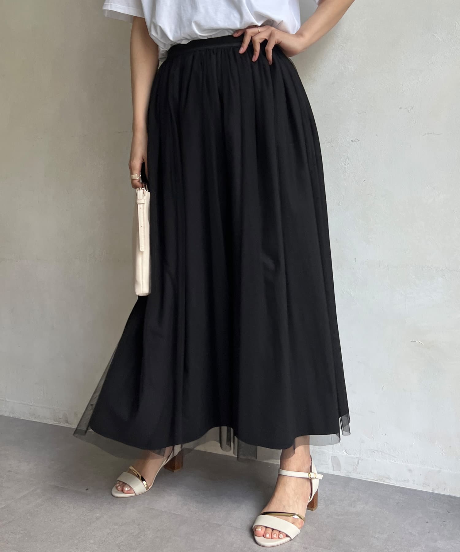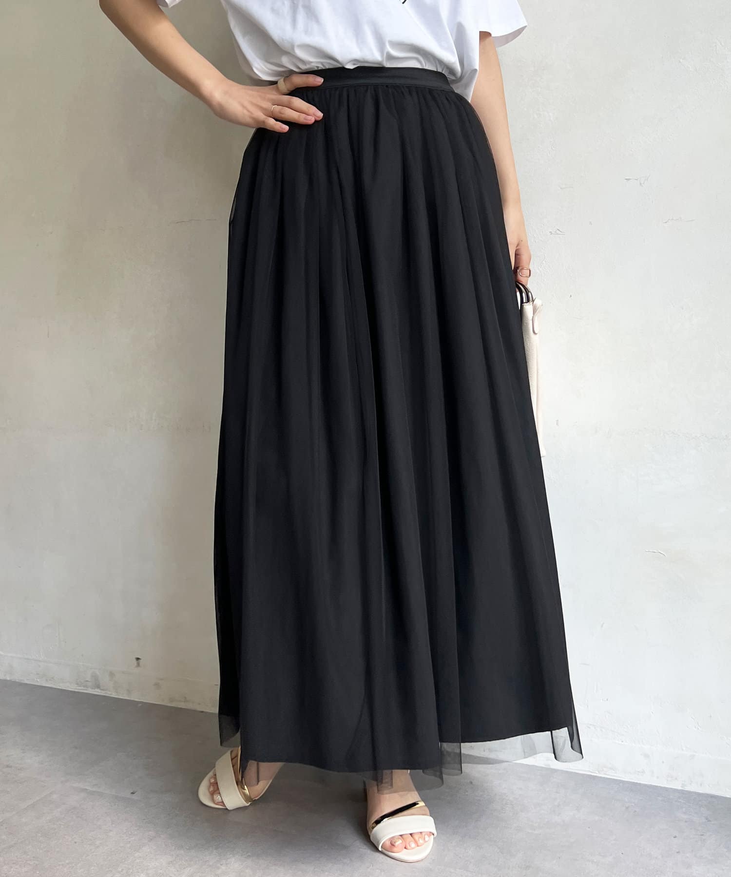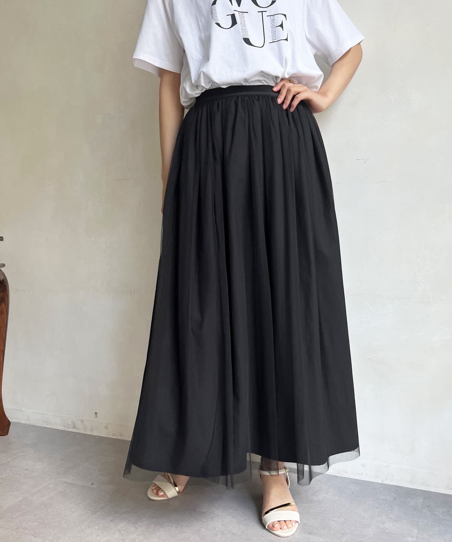 ・ふんわりと広がるチュールがエレガントなフレアロングスカート。
