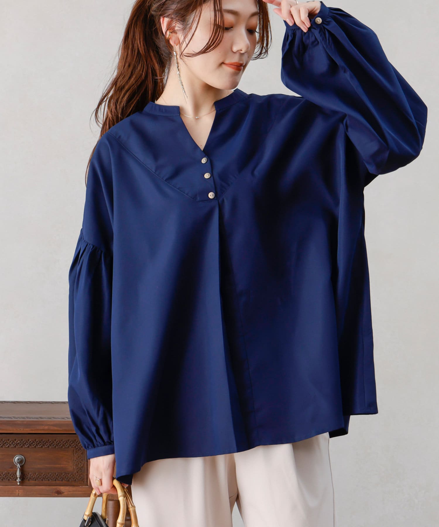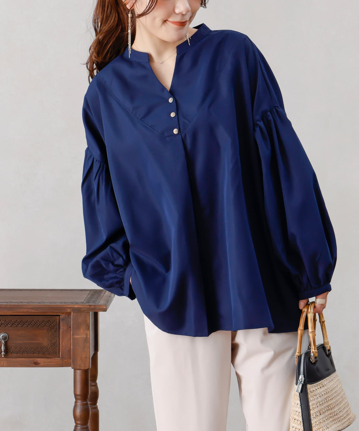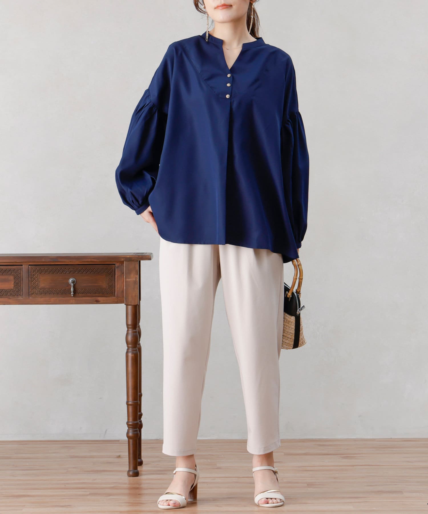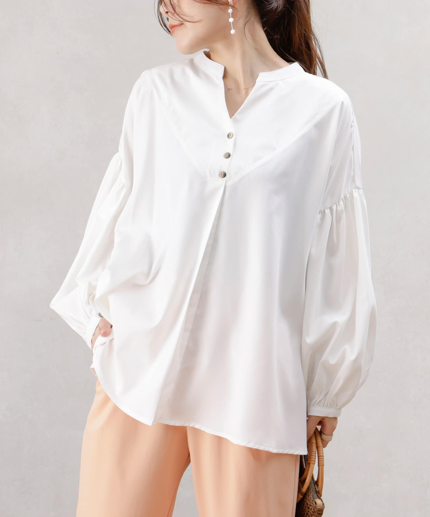 デコルテラインを華奢に見せてくれるスリットネック仕様に。首元に3つ並んだボタンが可愛らしく、きれいめカジュアルなコーディネートにぴったりな春ブラウスです。