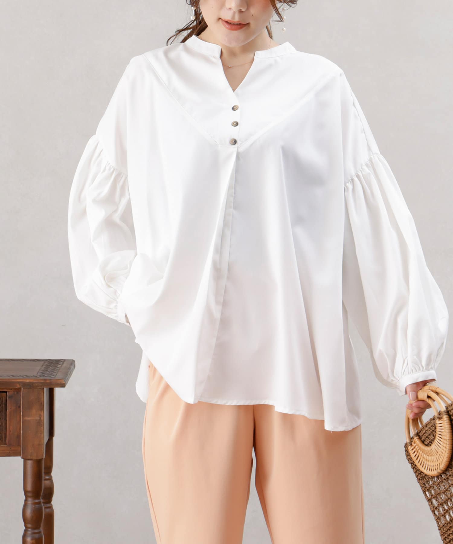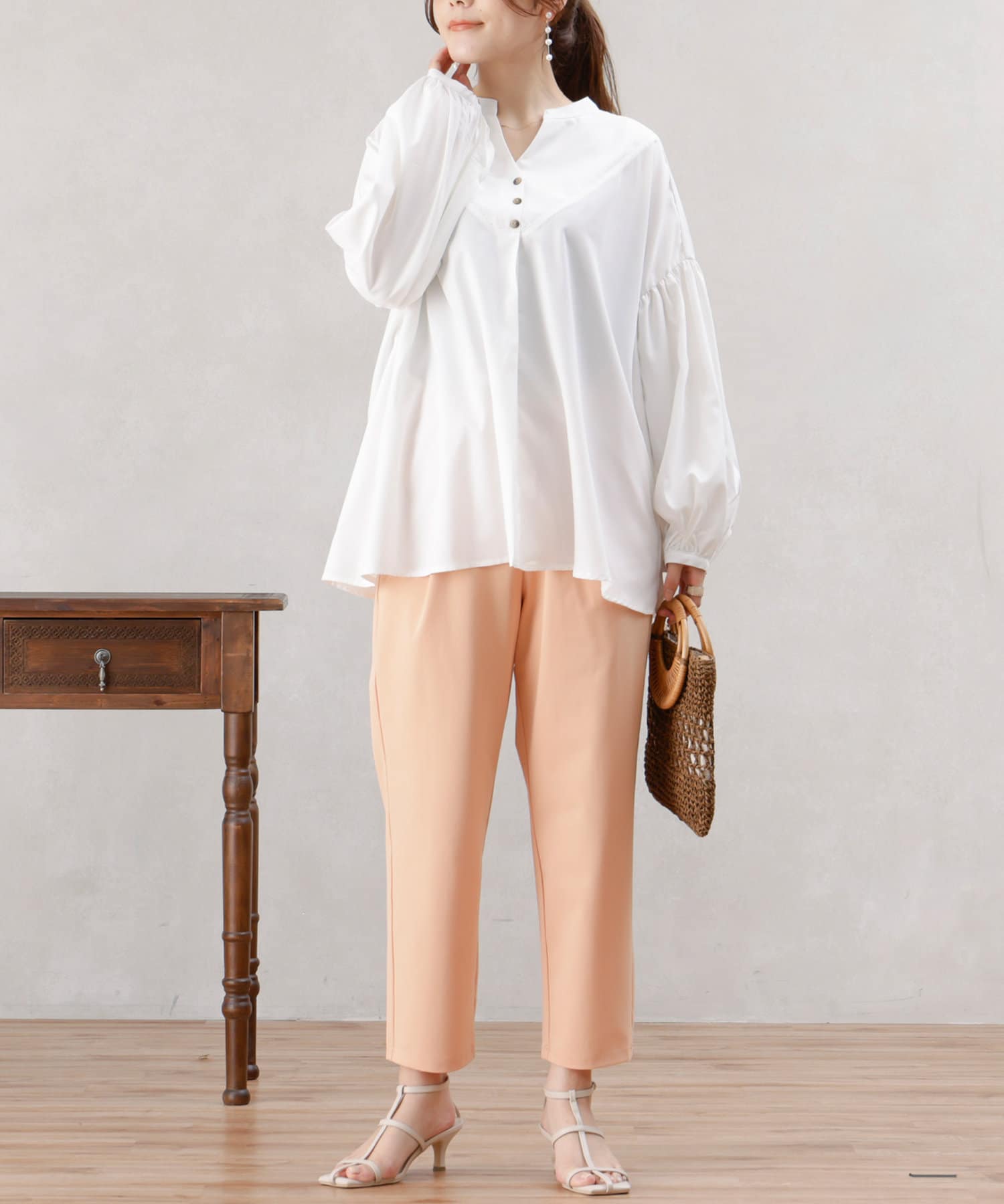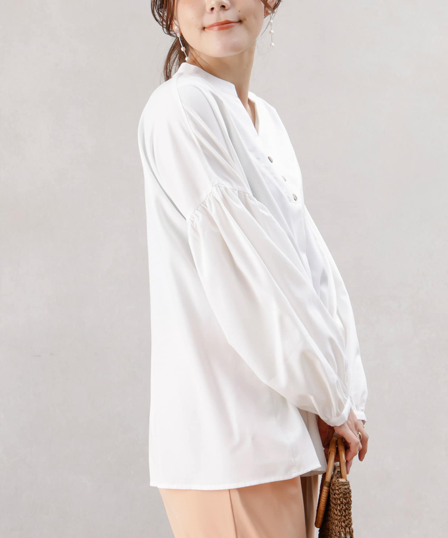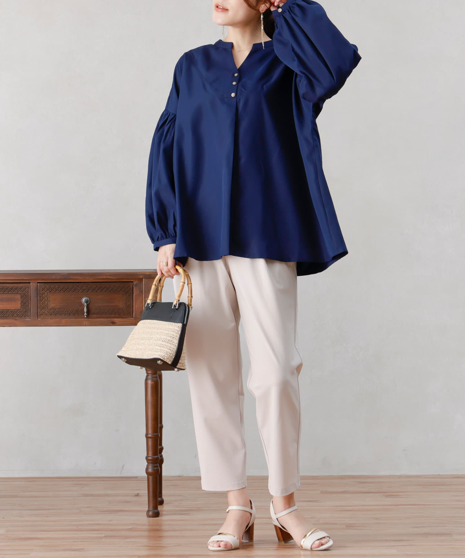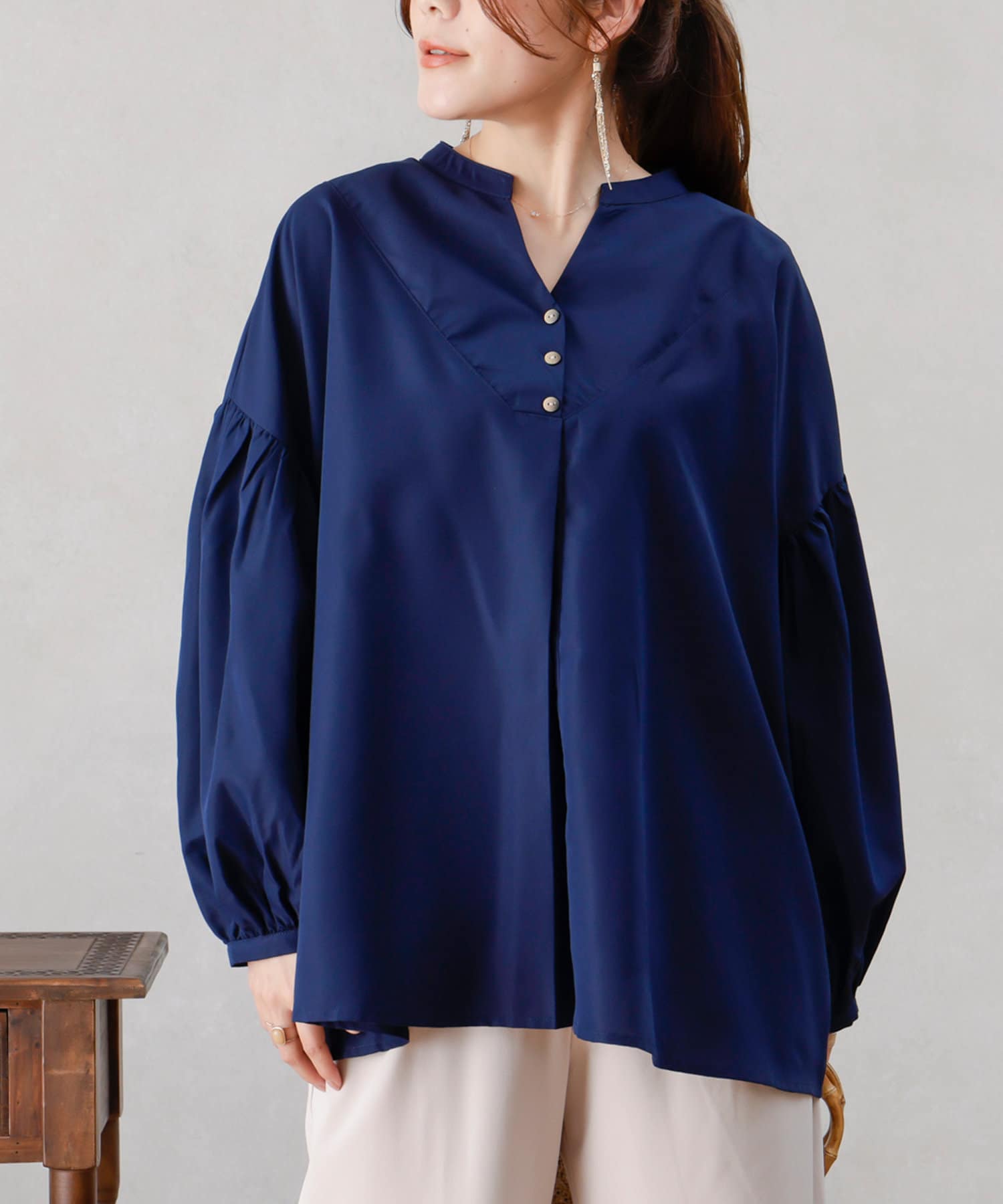 デコルテラインを華奢に見せてくれるスリットネック仕様に。首元に3つ並んだボタンが可愛らしく、きれいめカジュアルなコーディネートにぴったりな春ブラウスです。