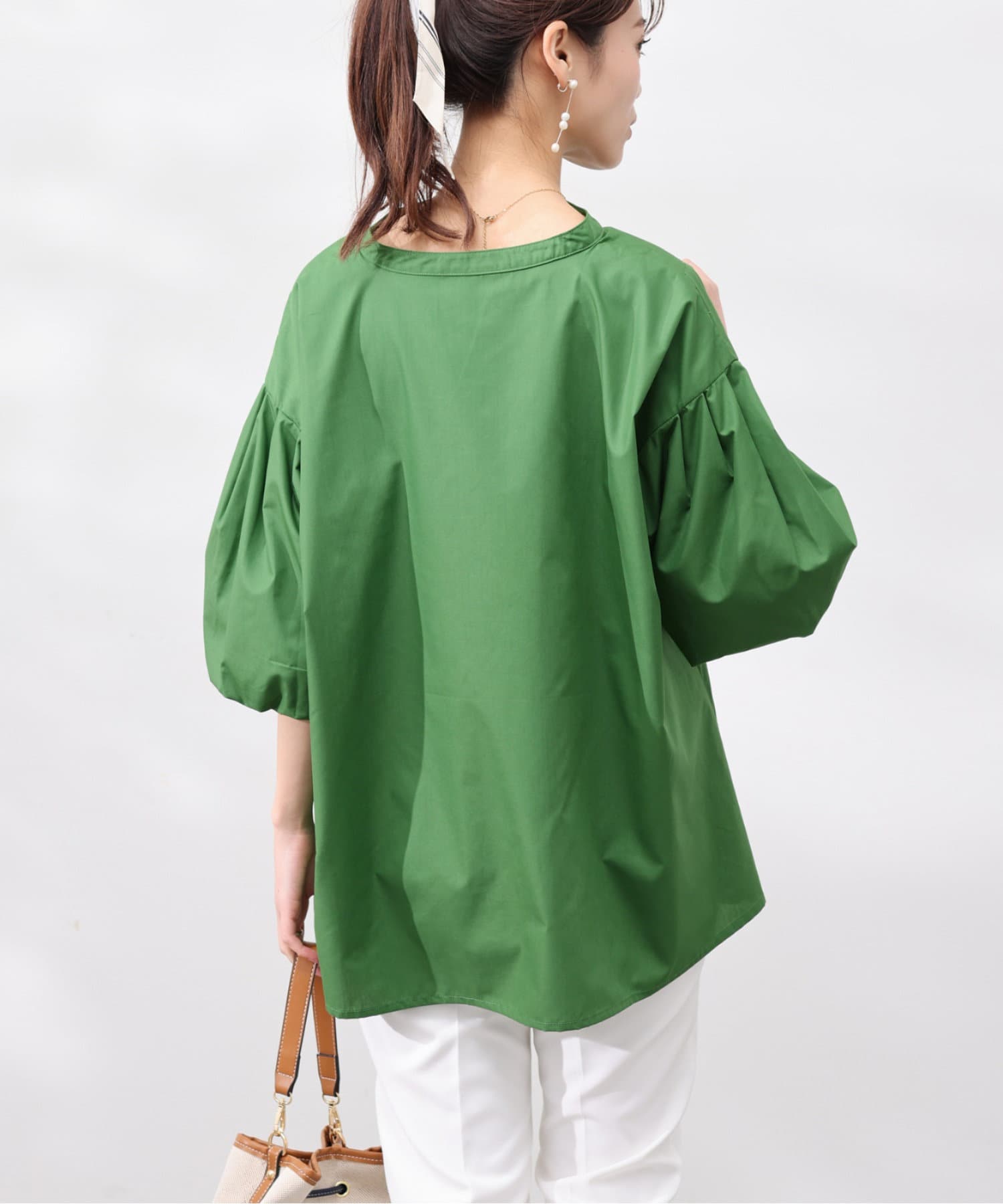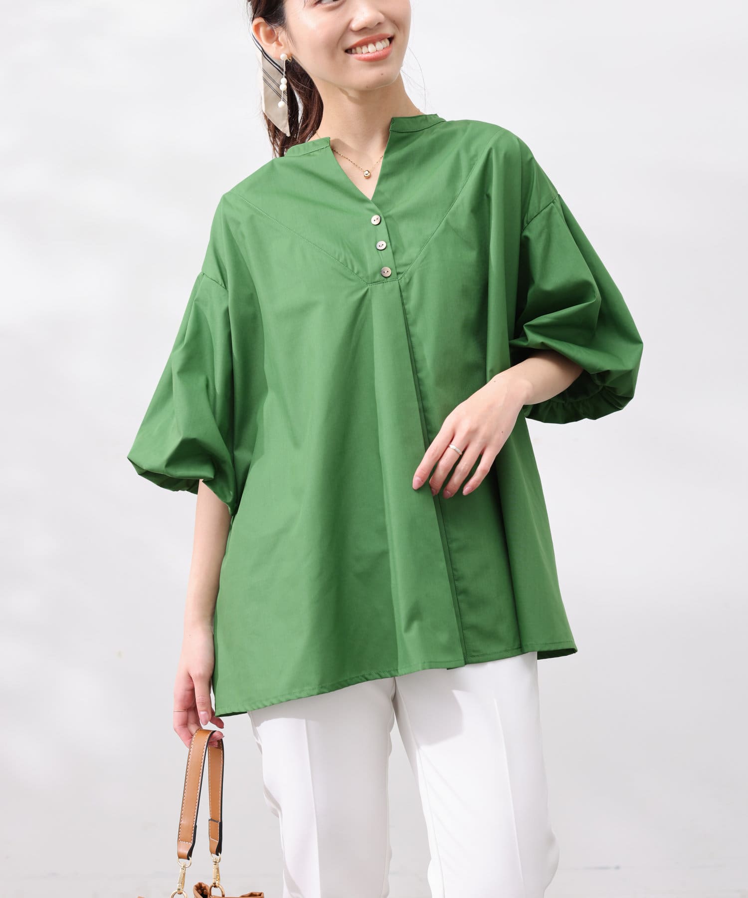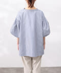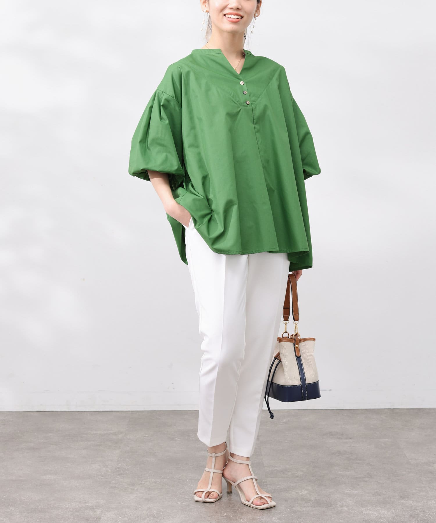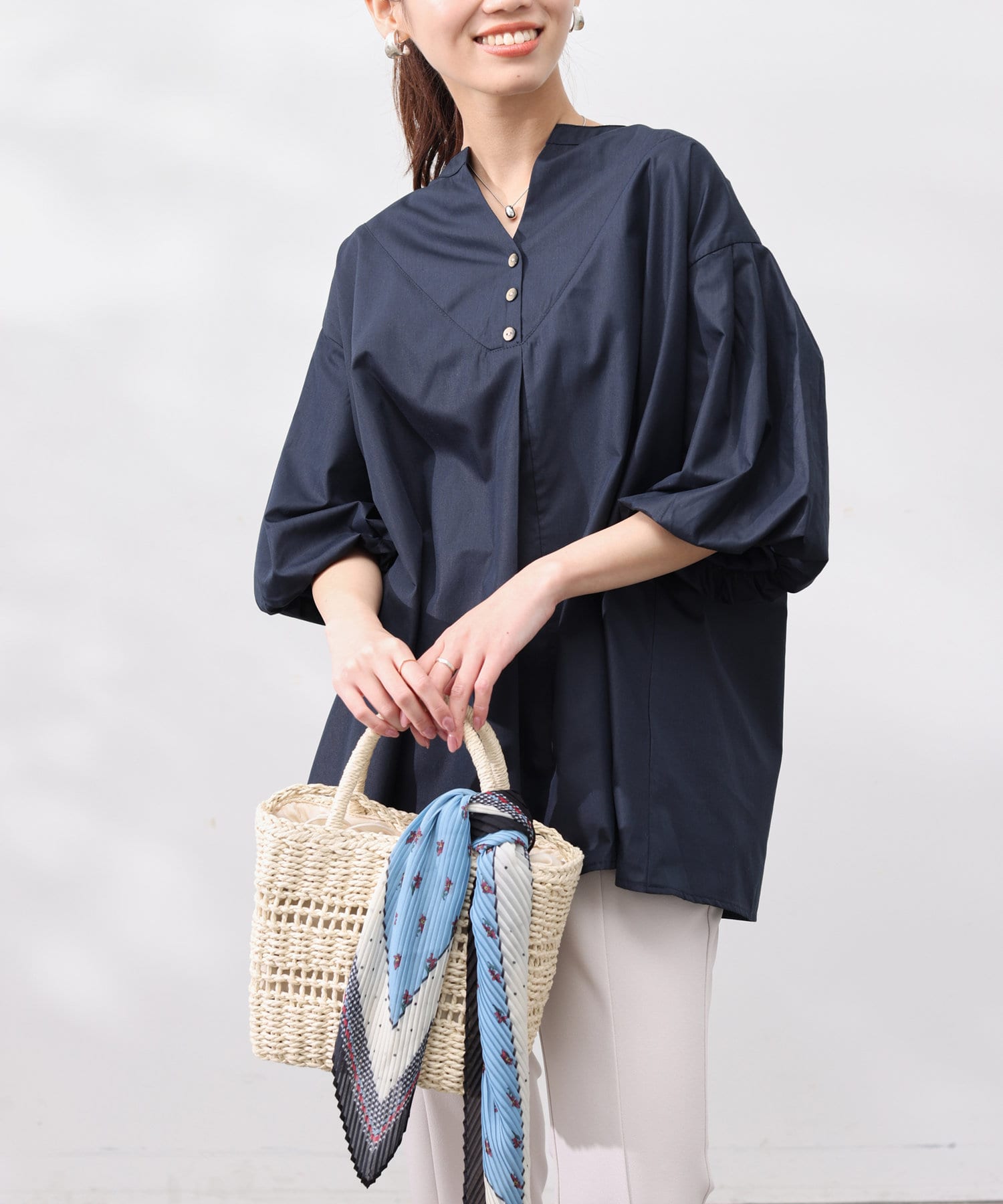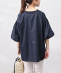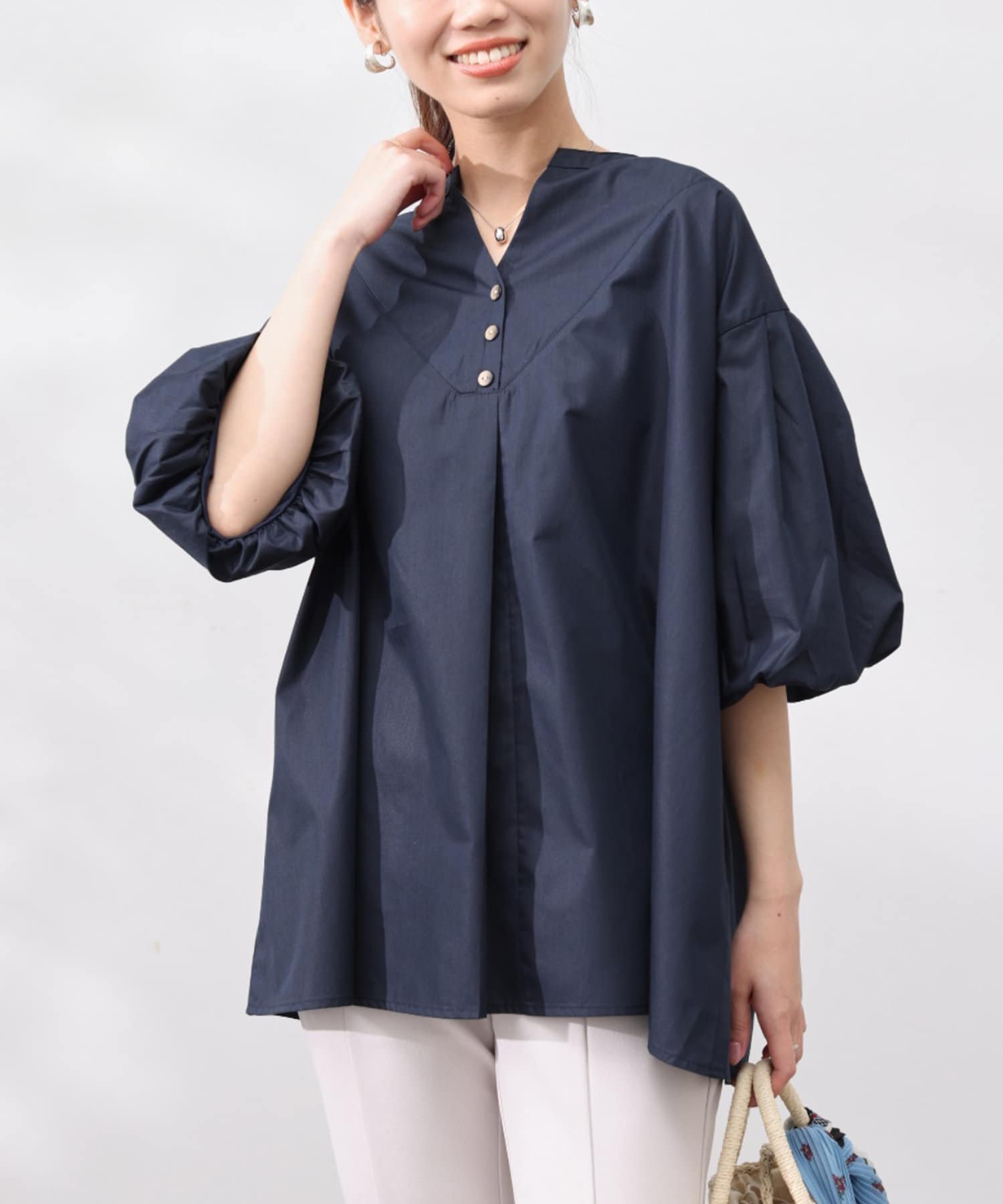 お顔周りがすっきり見えるスリットネックにふんわり感のある長めの着丈バランスはそのままに、肘が隠れる程の5分袖になりました。