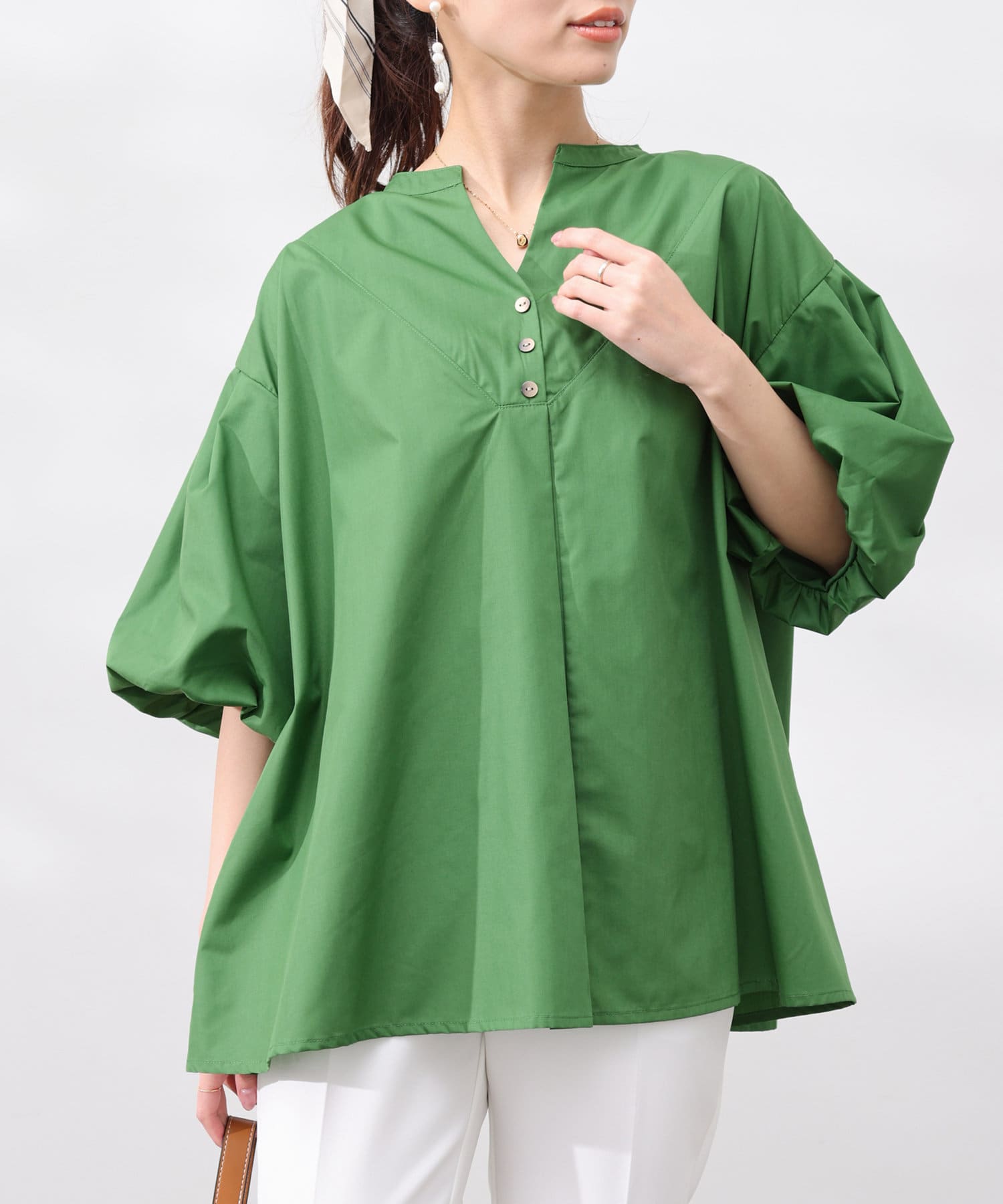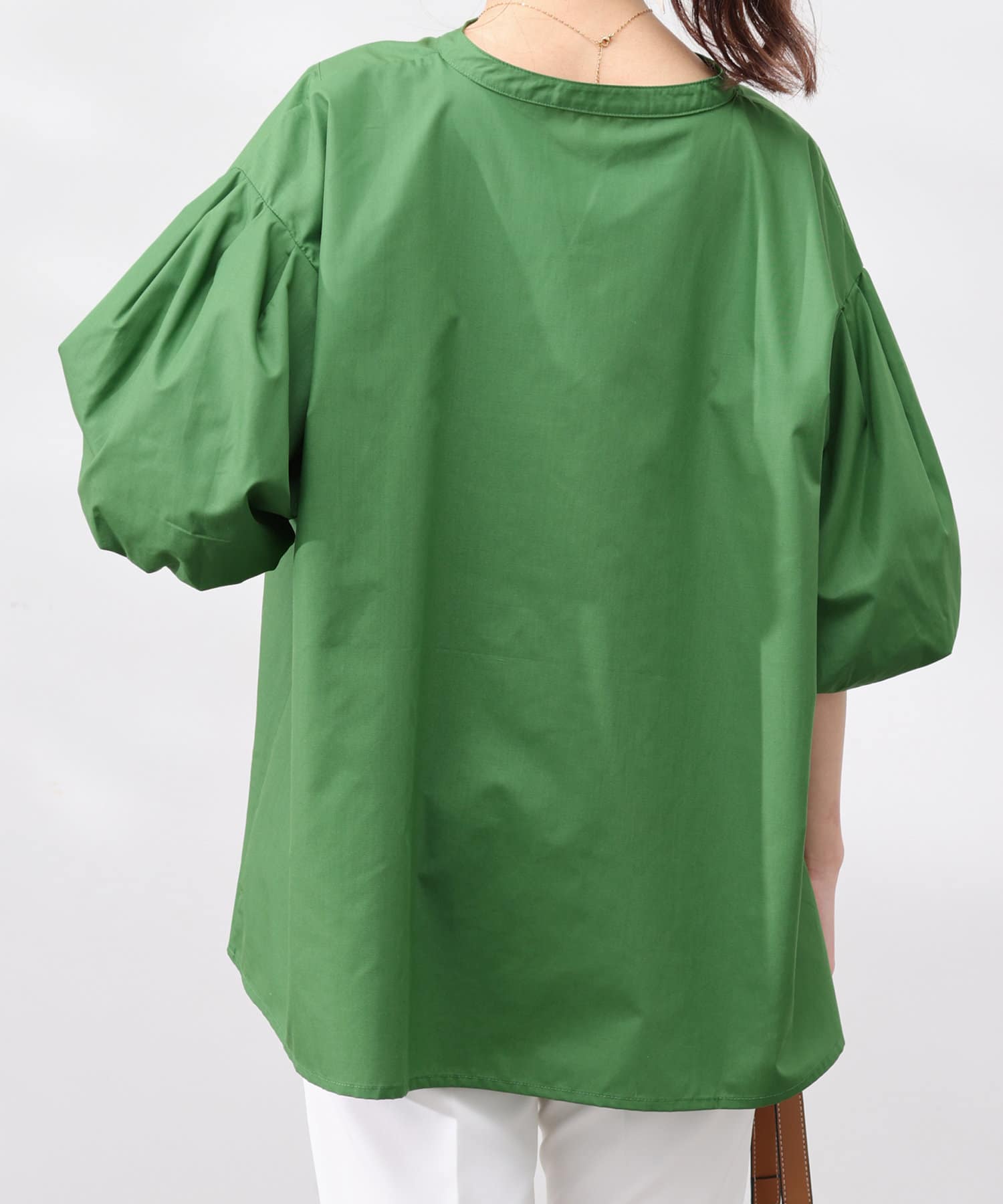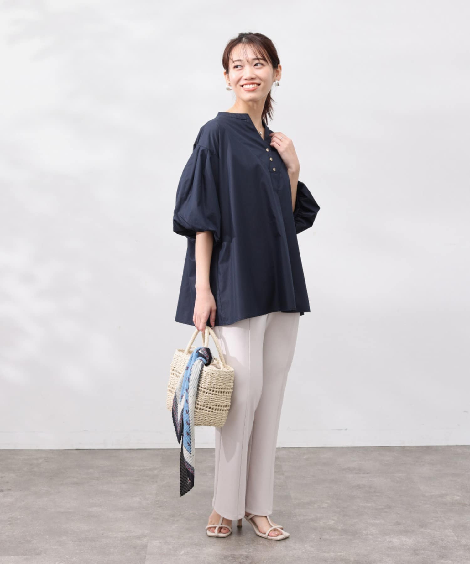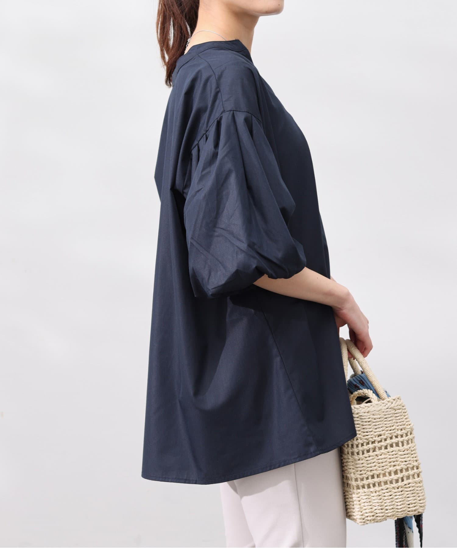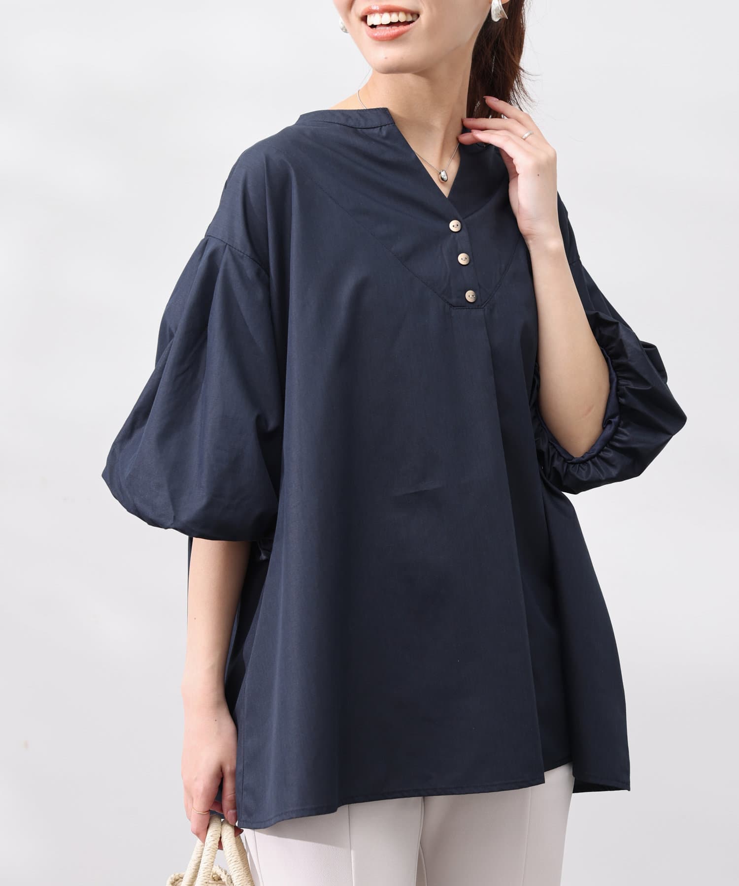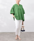 お顔周りがすっきり見えるスリットネックにふんわり感のある長めの着丈バランスはそのままに、肘が隠れる程の5分袖になりました。