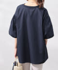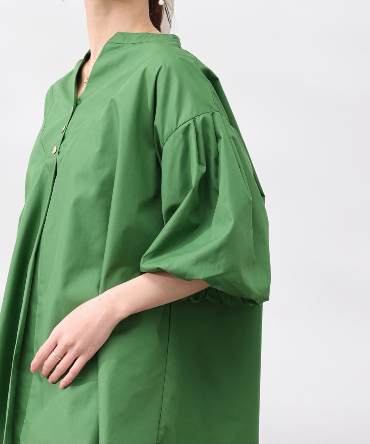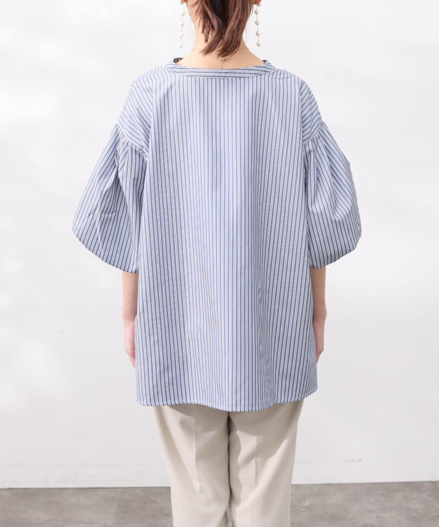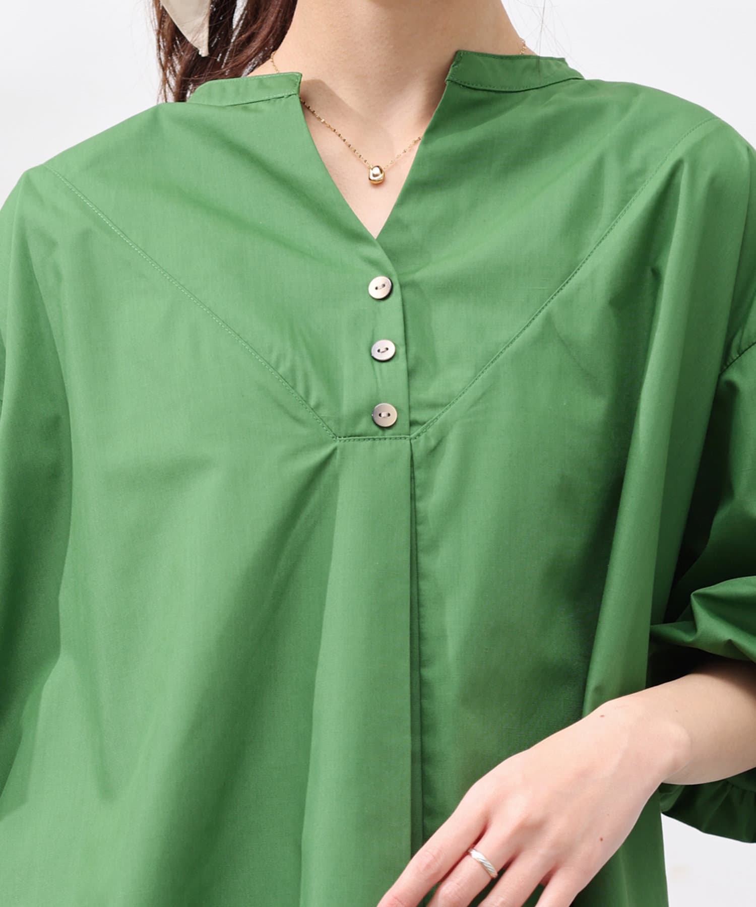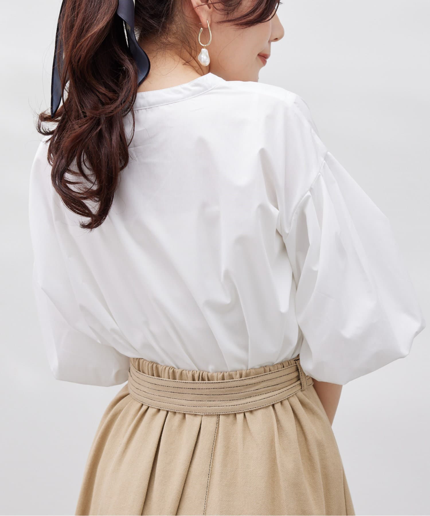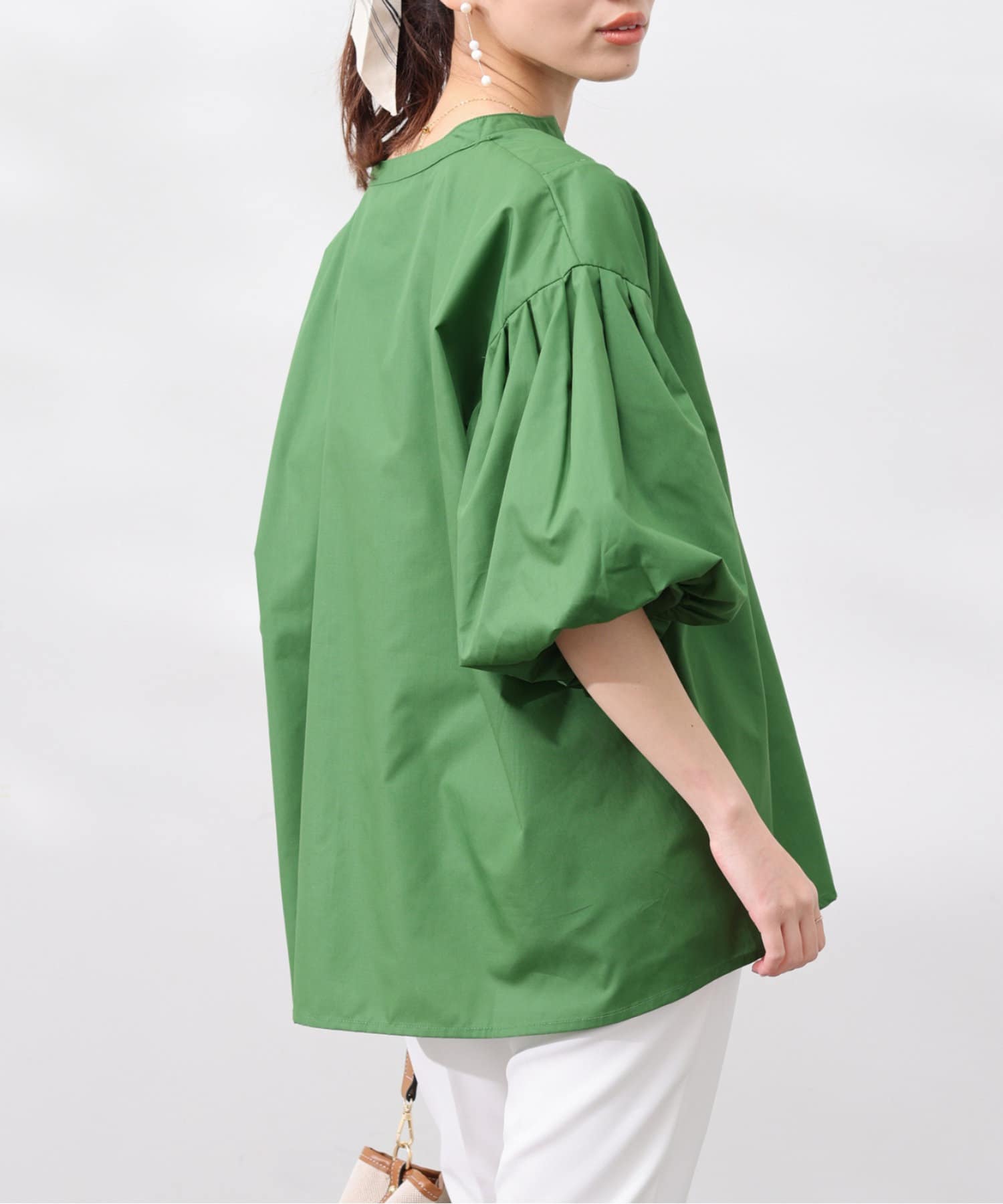 お顔周りがすっきり見えるスリットネックにふんわり感のある長めの着丈バランスはそのままに、肘が隠れる程の5分袖になりました。