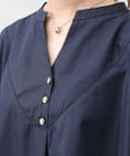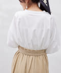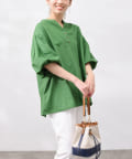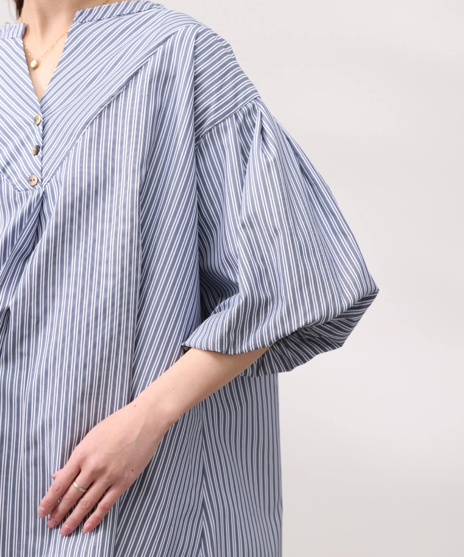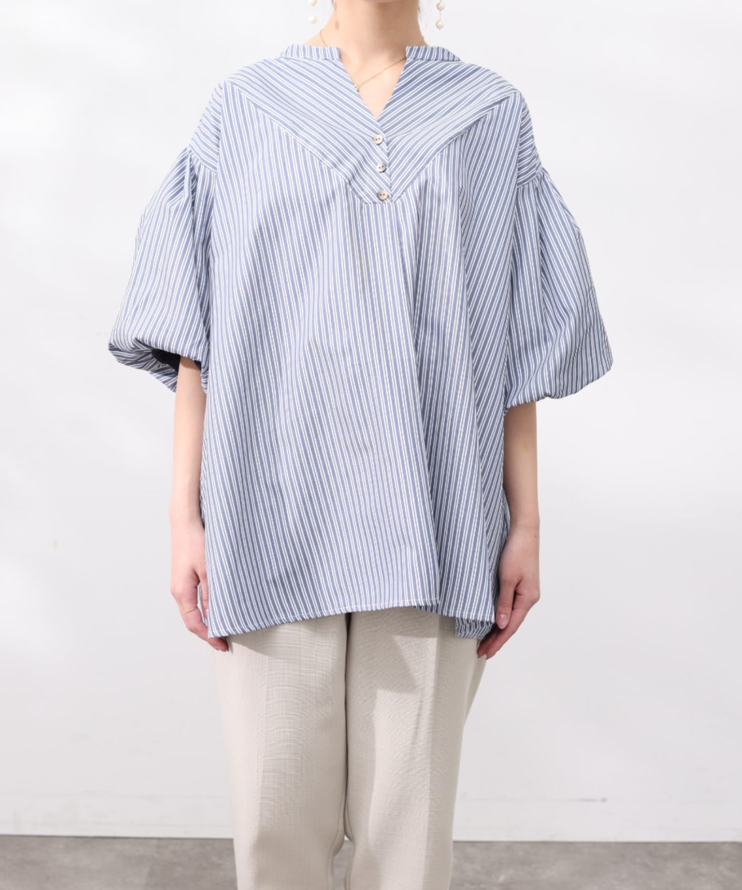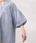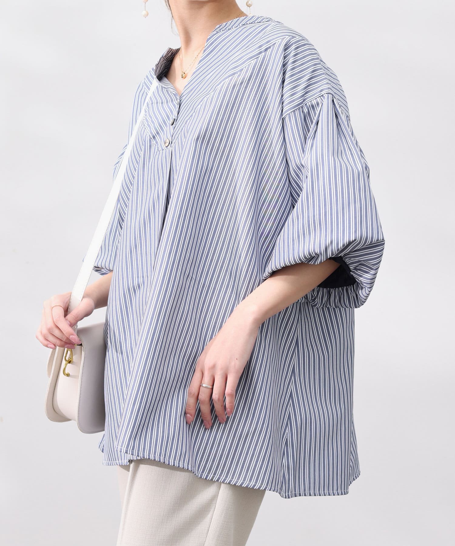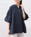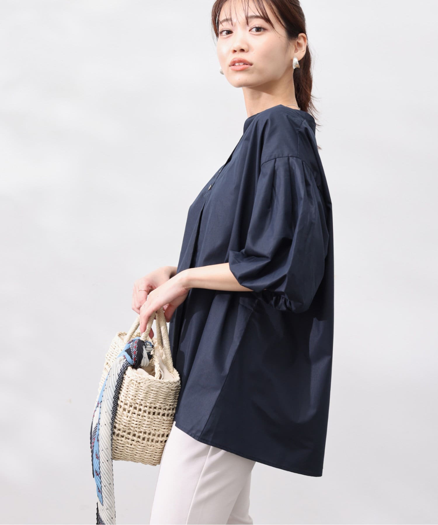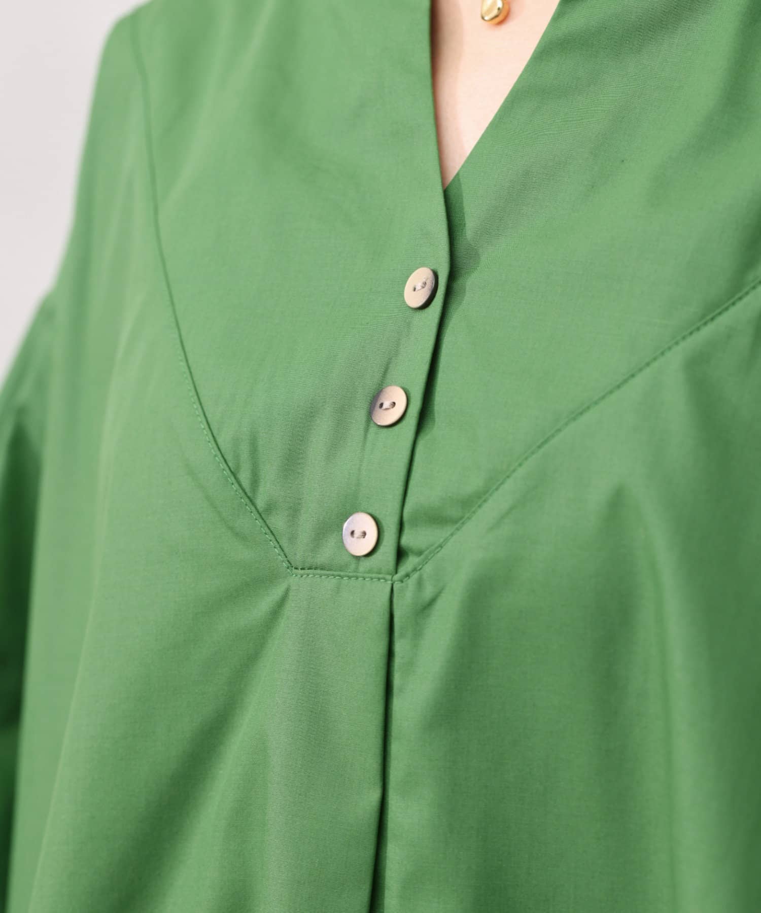 お顔周りがすっきり見えるスリットネックにふんわり感のある長めの着丈バランスはそのままに、肘が隠れる程の5分袖になりました。