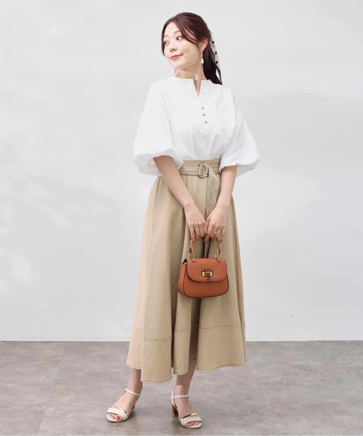 ウエストインしてフレアスカートで合わせても、首元のスリットネックがすっきりと見せていただけます。