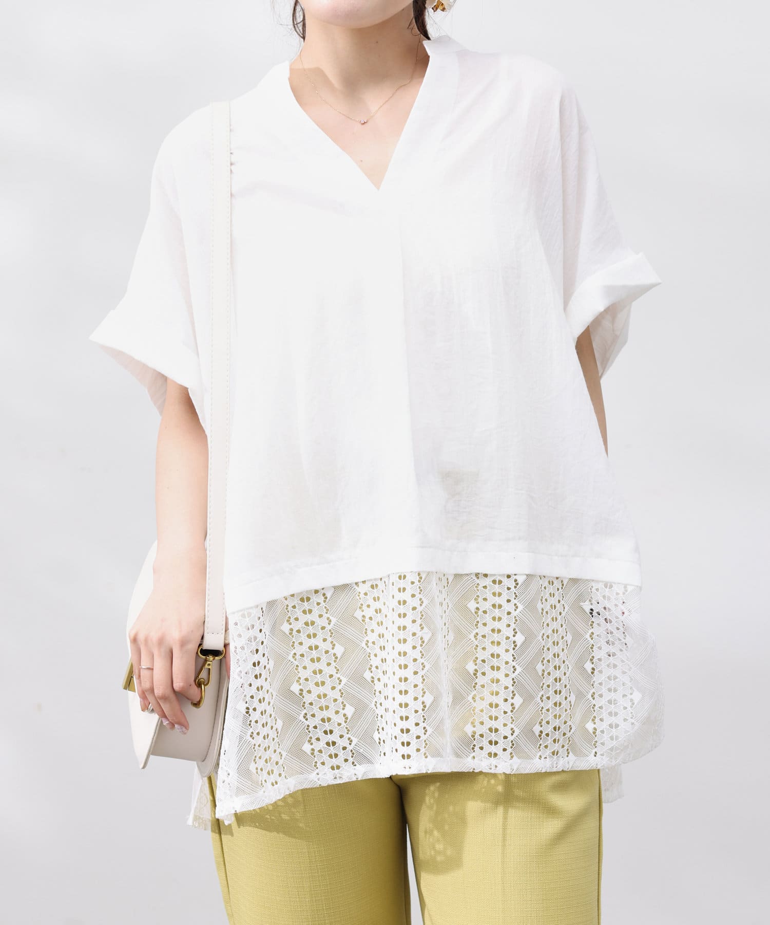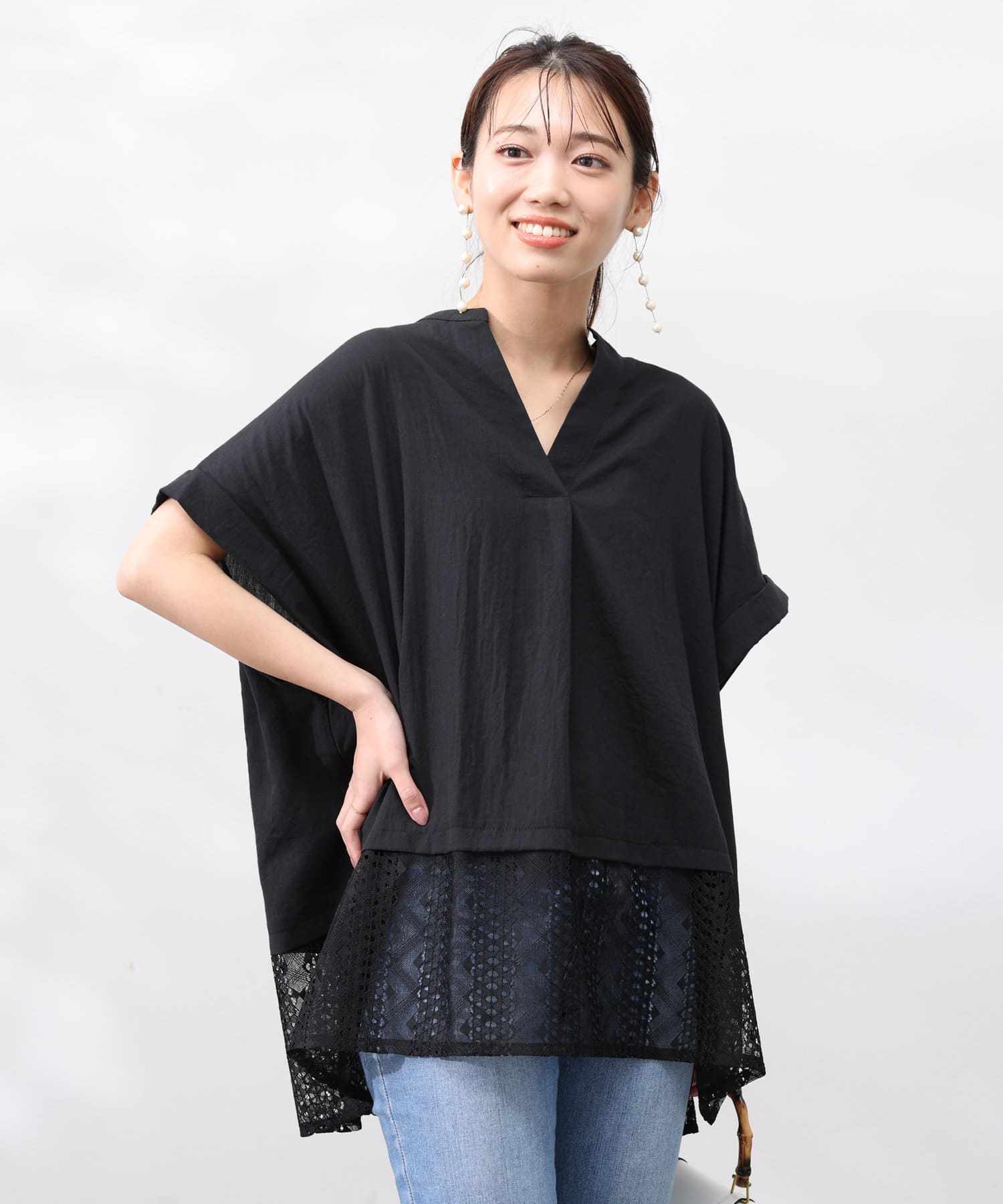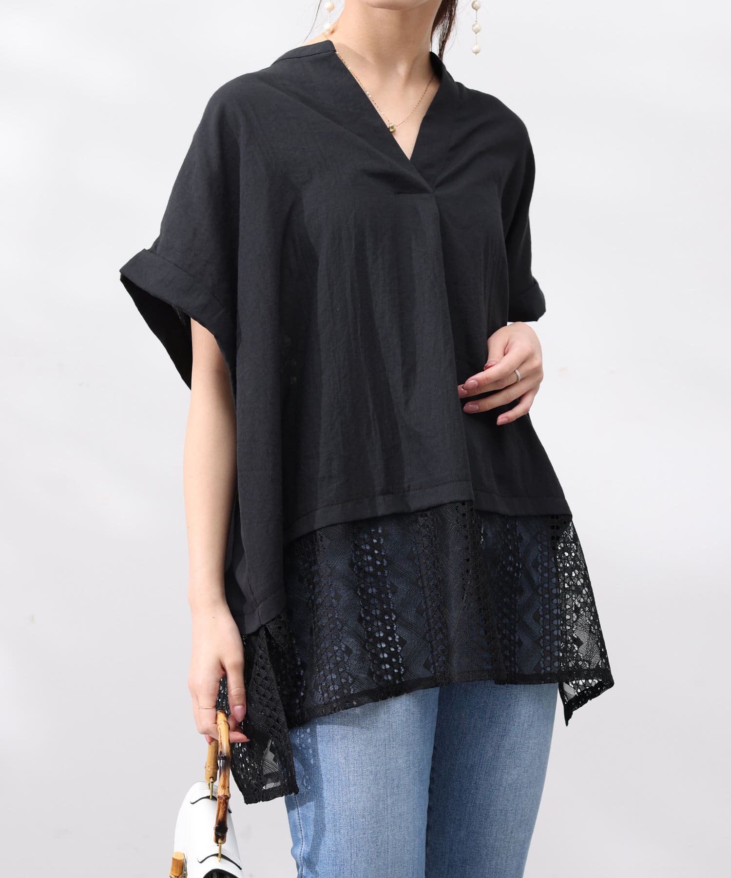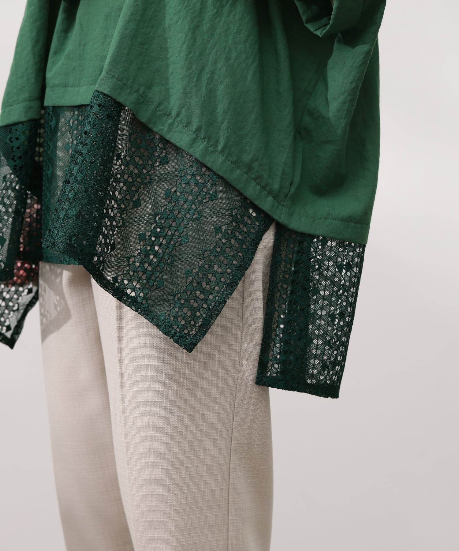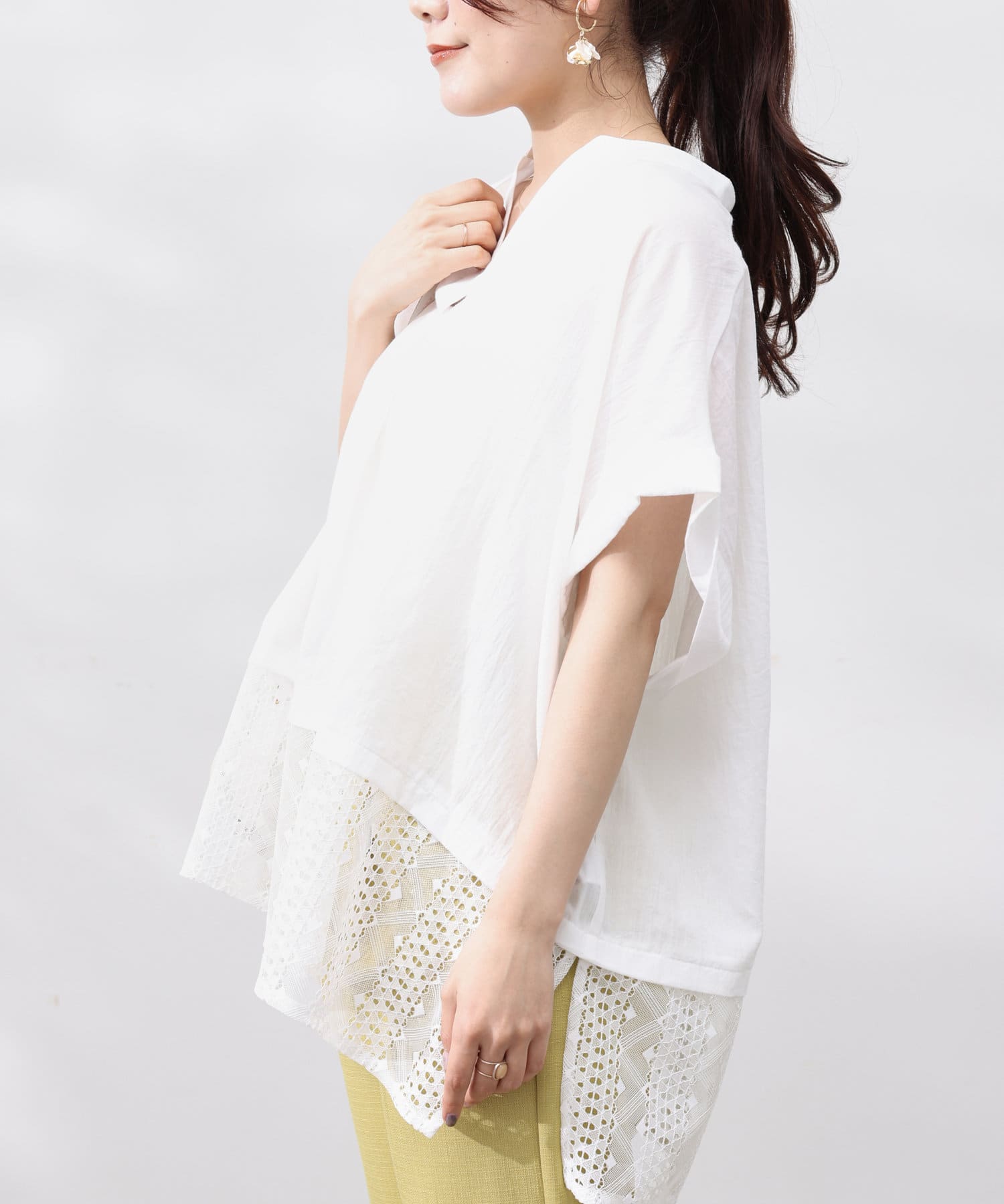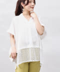 ゆったりとしたサイズ感に、裾のレース切替がポイントのスキッパーシャツです。