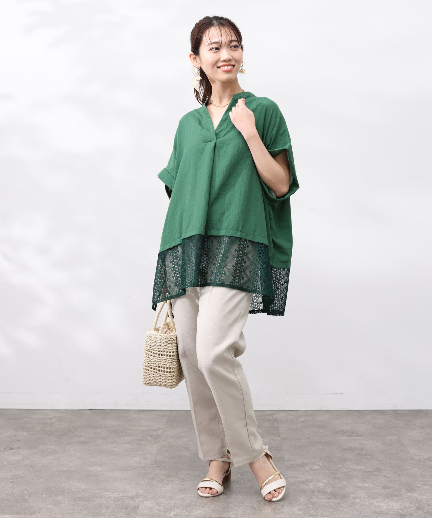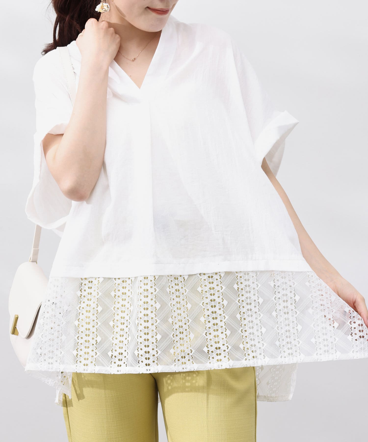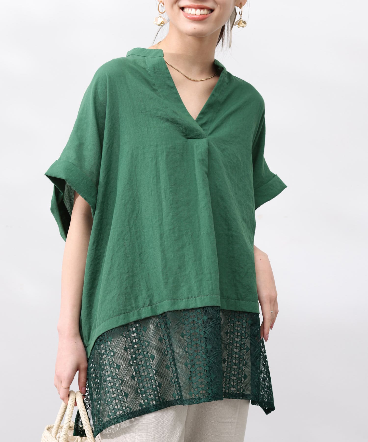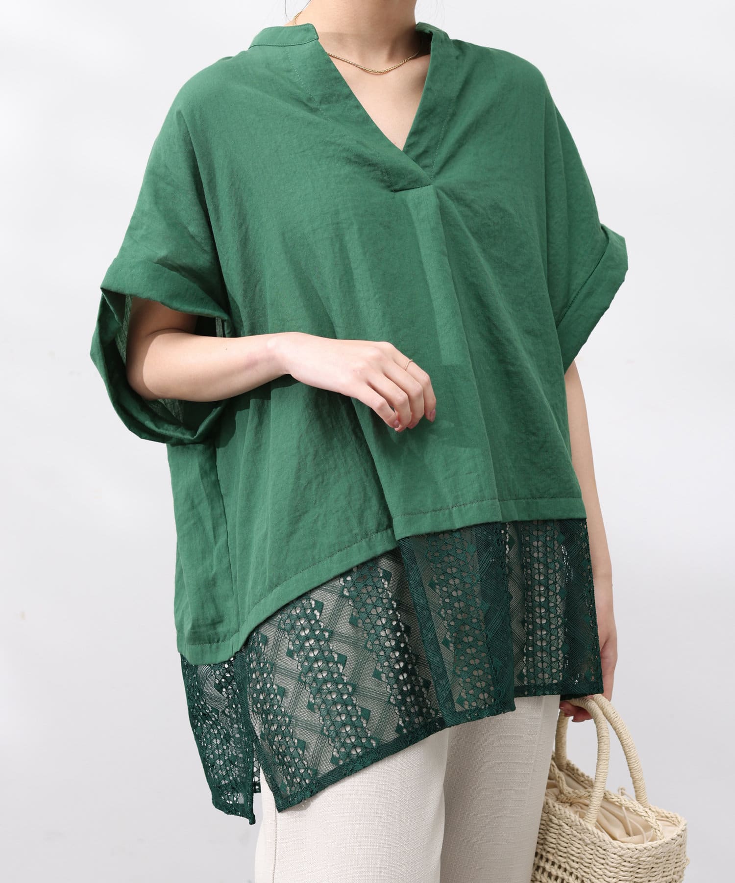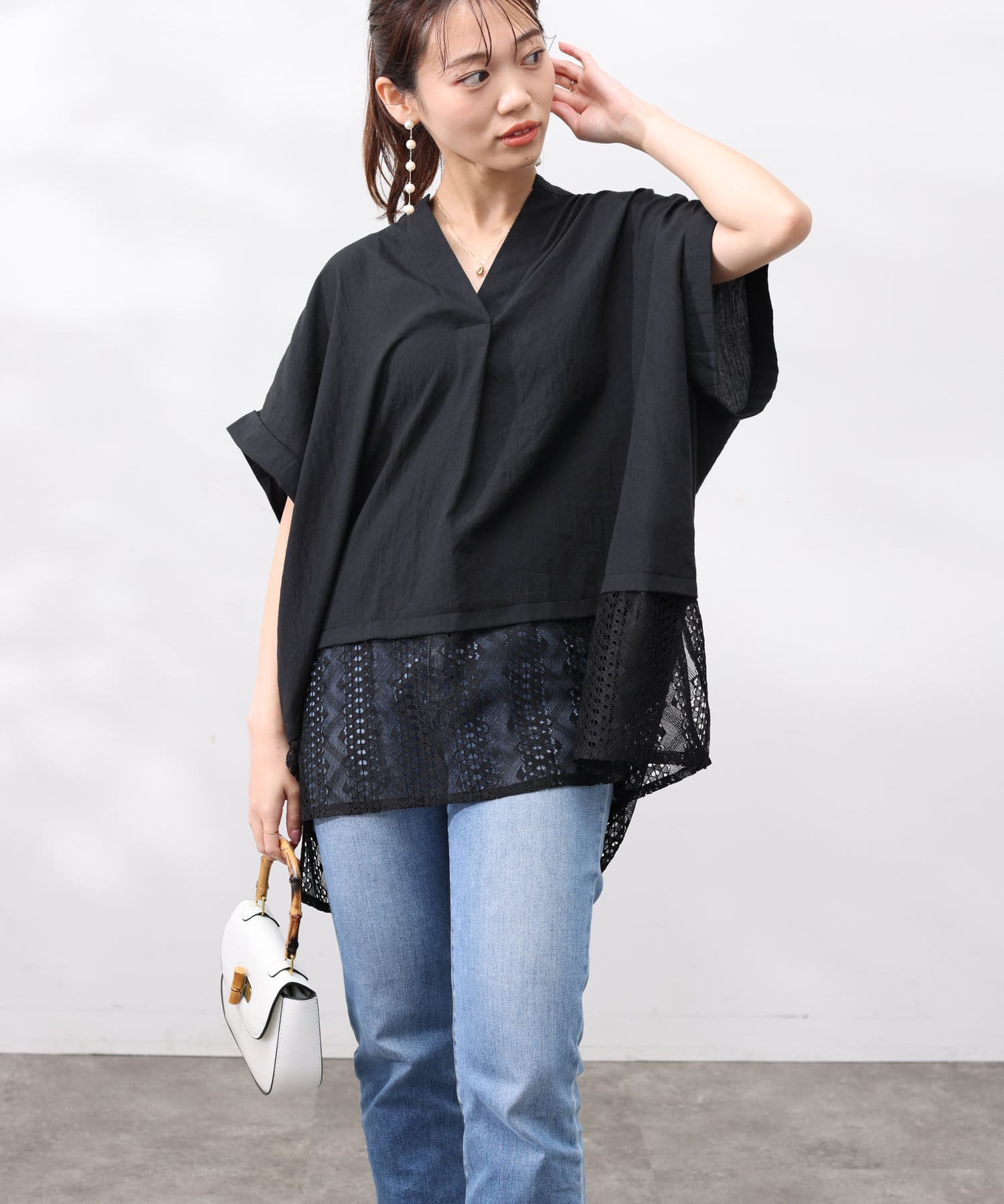 ゆったりとしたサイズ感に、裾のレース切替がポイントのスキッパーシャツです。
