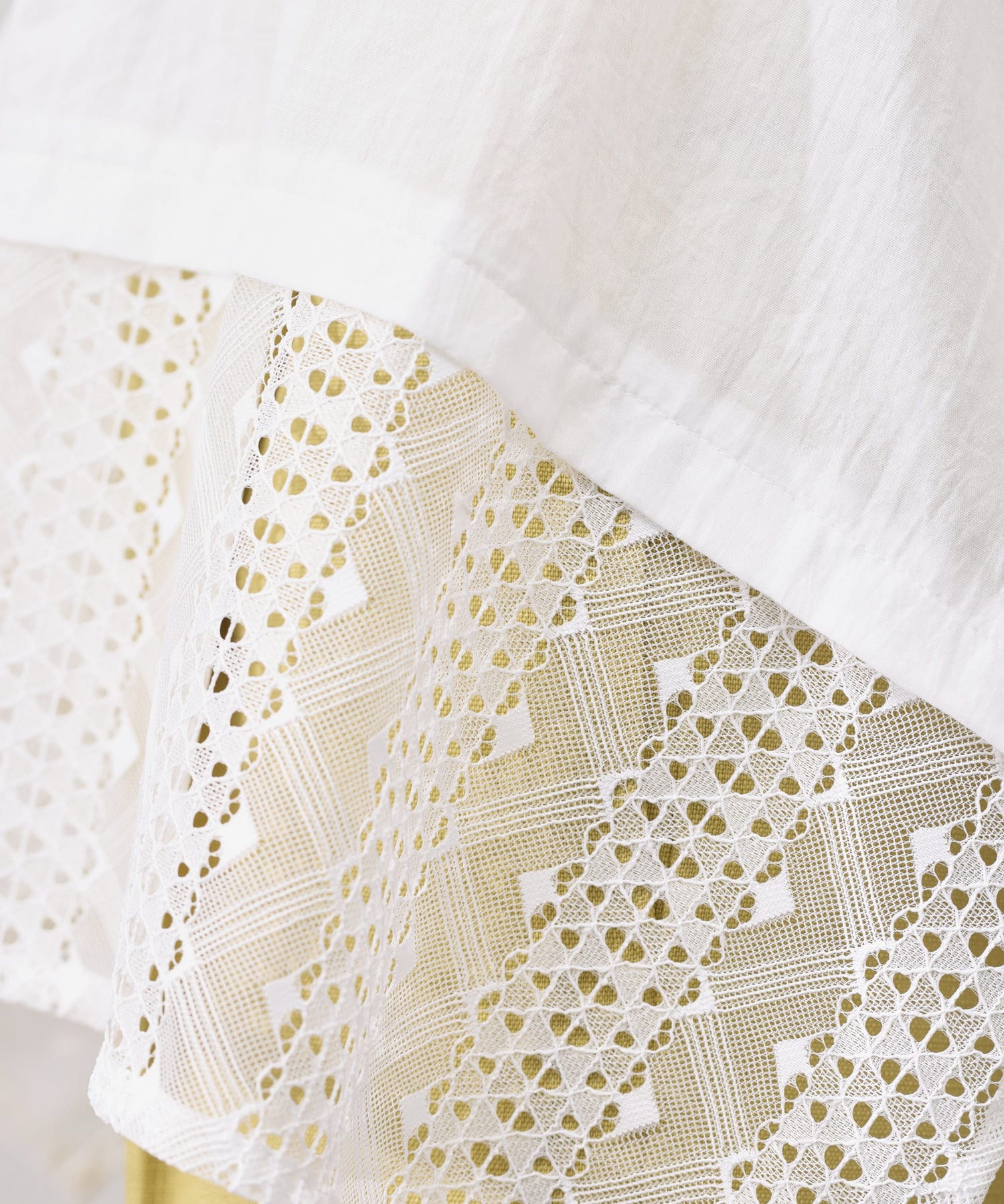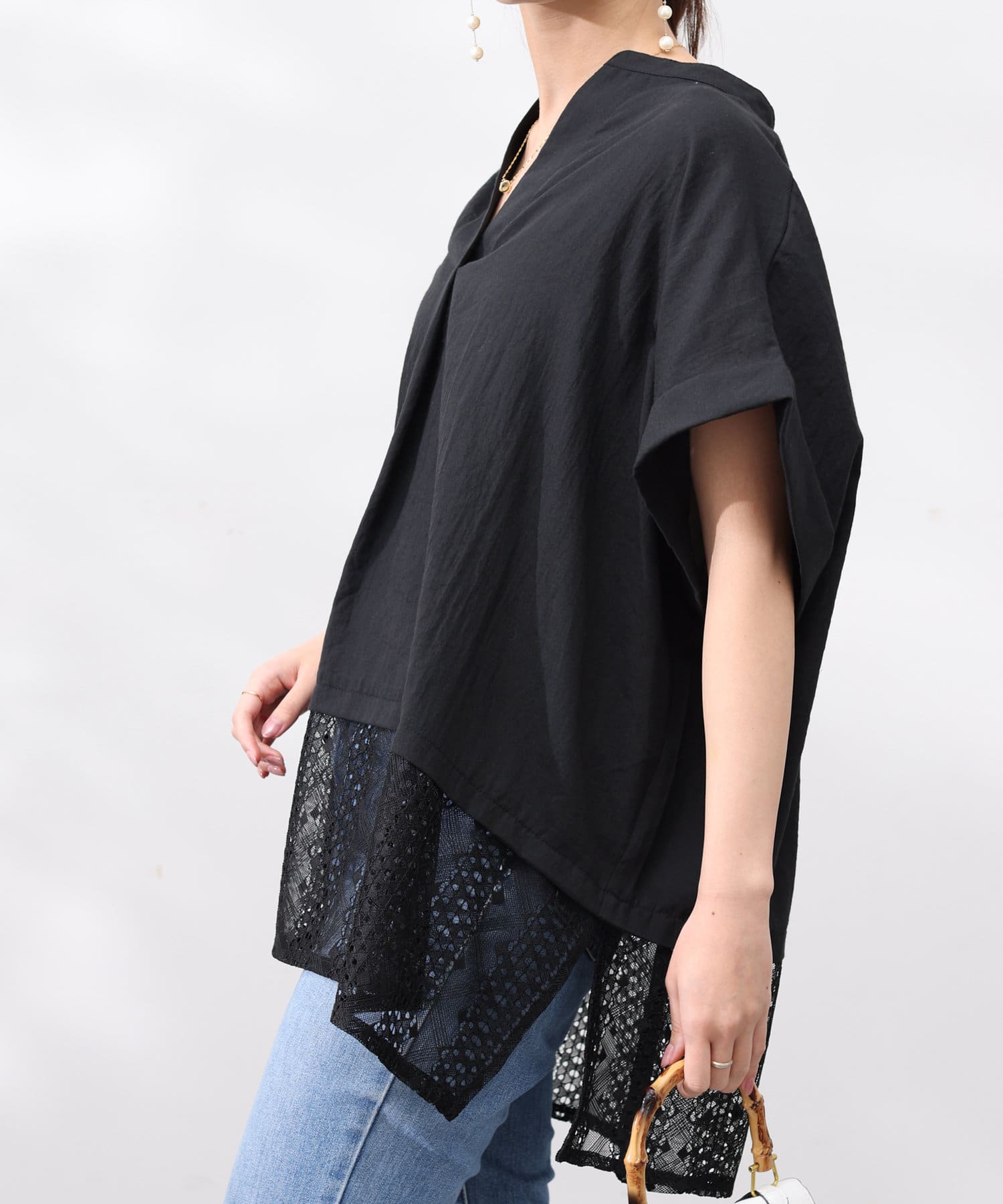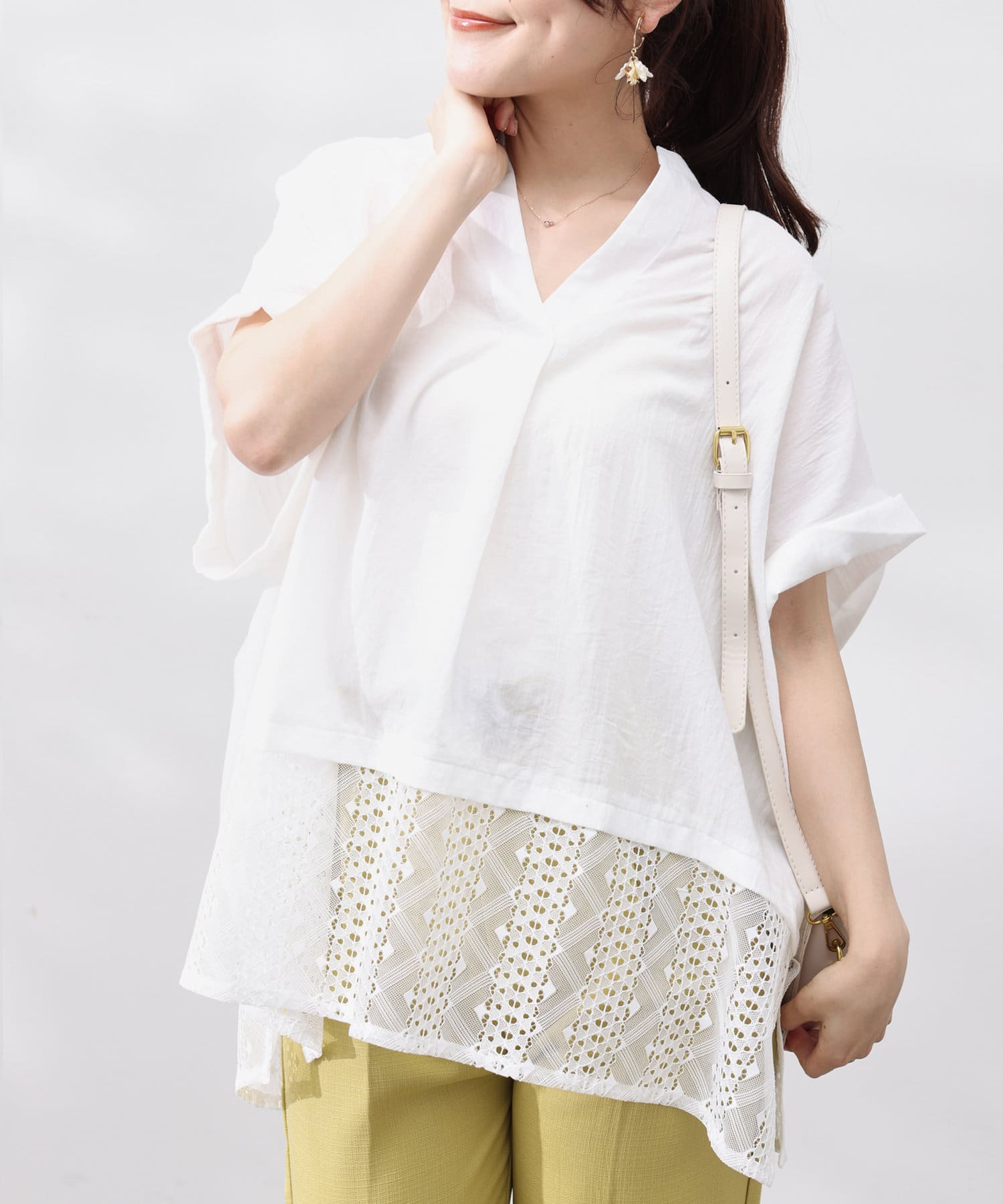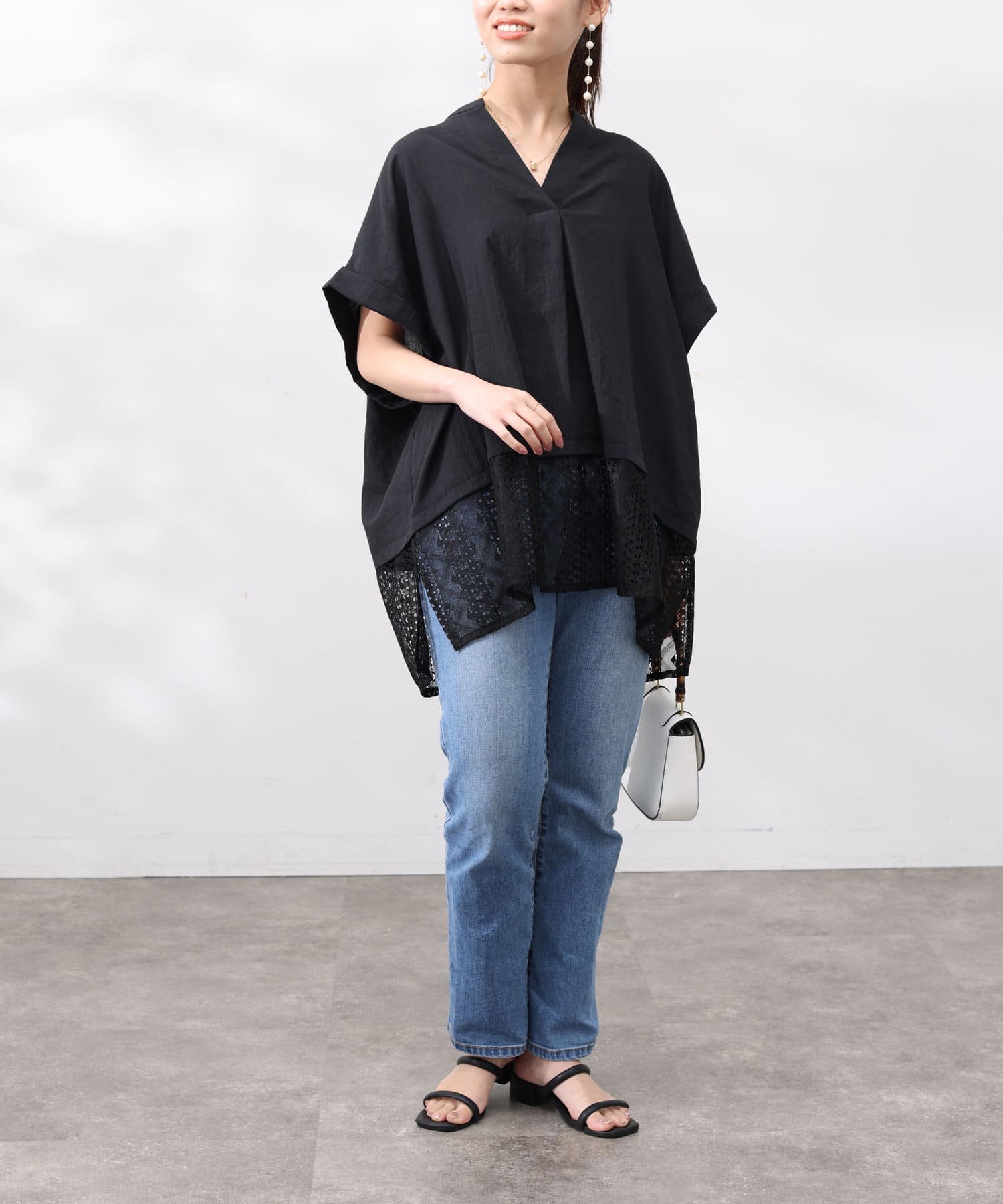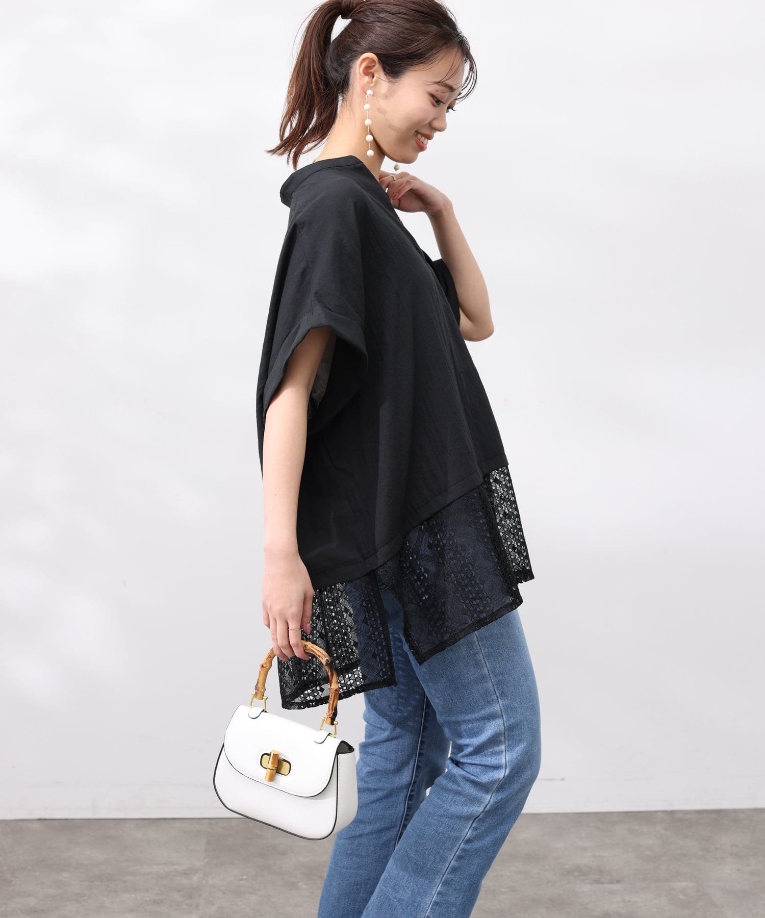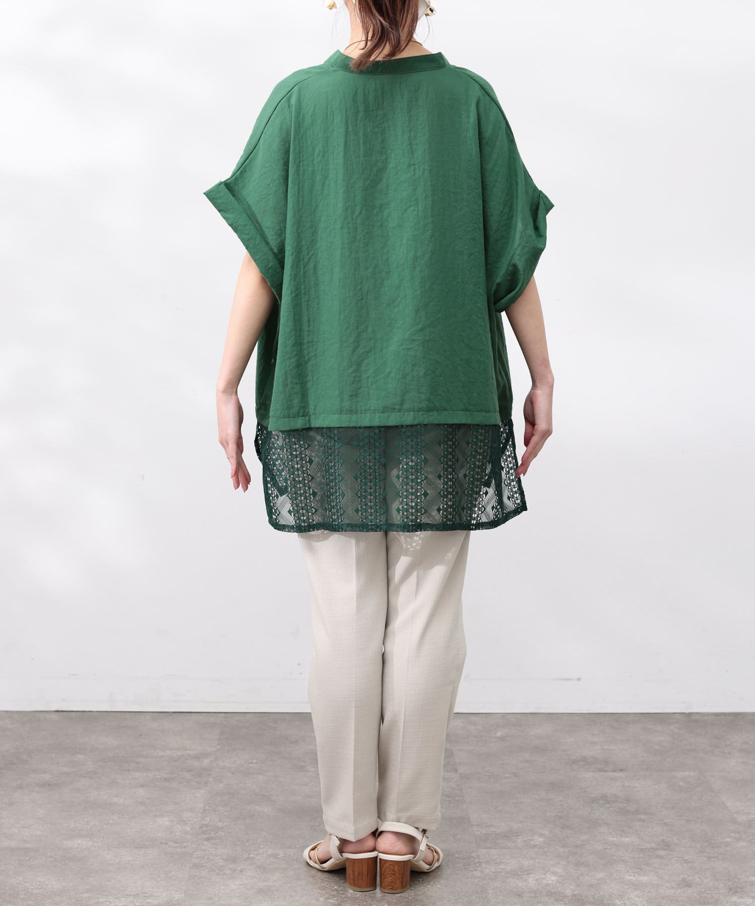 ゆったりとしたサイズ感に、裾のレース切替がポイントのスキッパーシャツです。