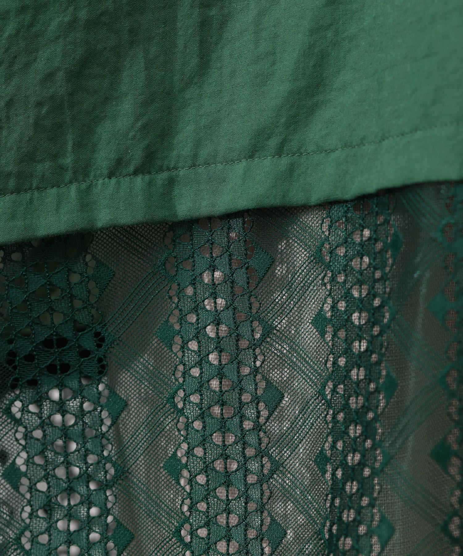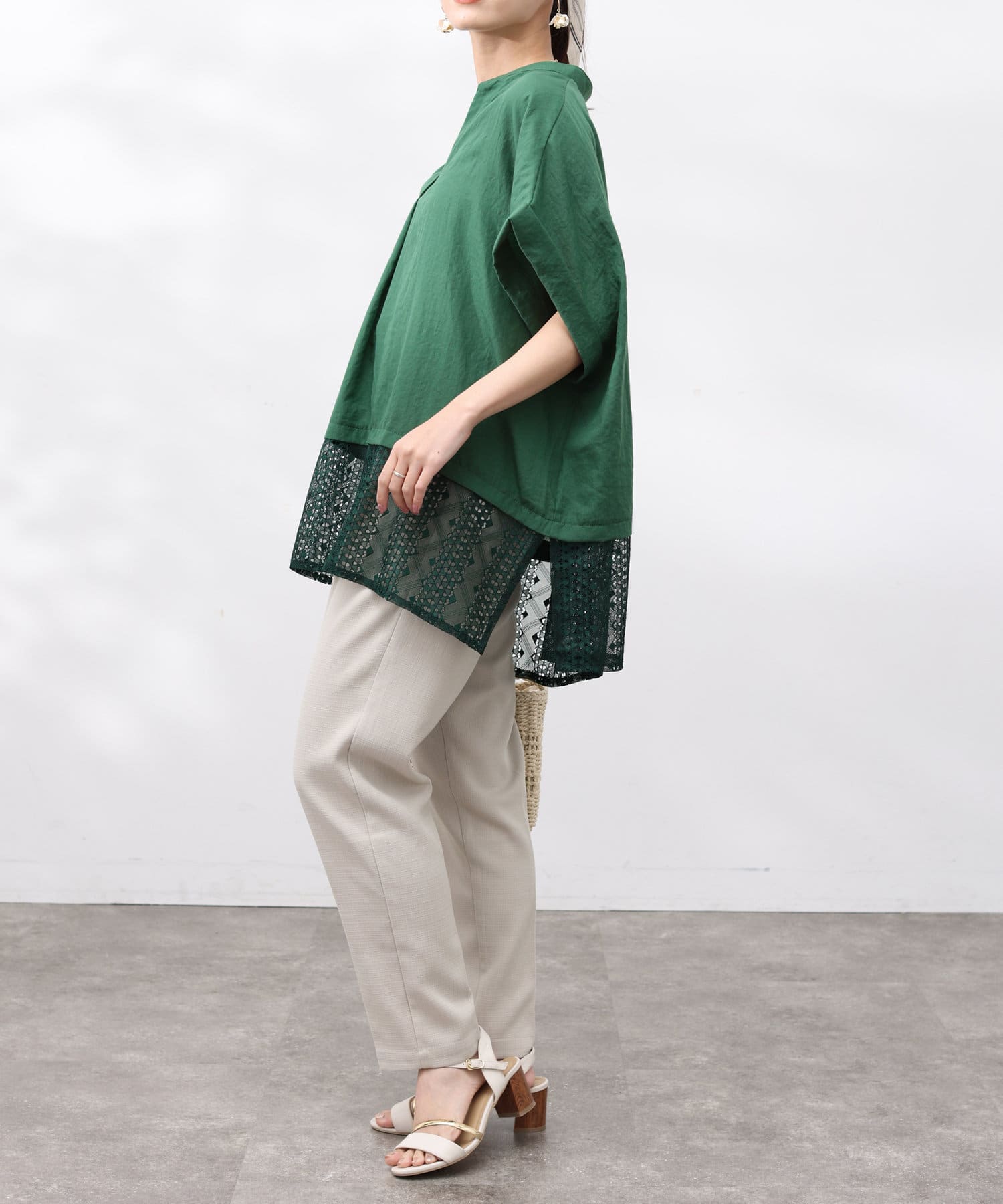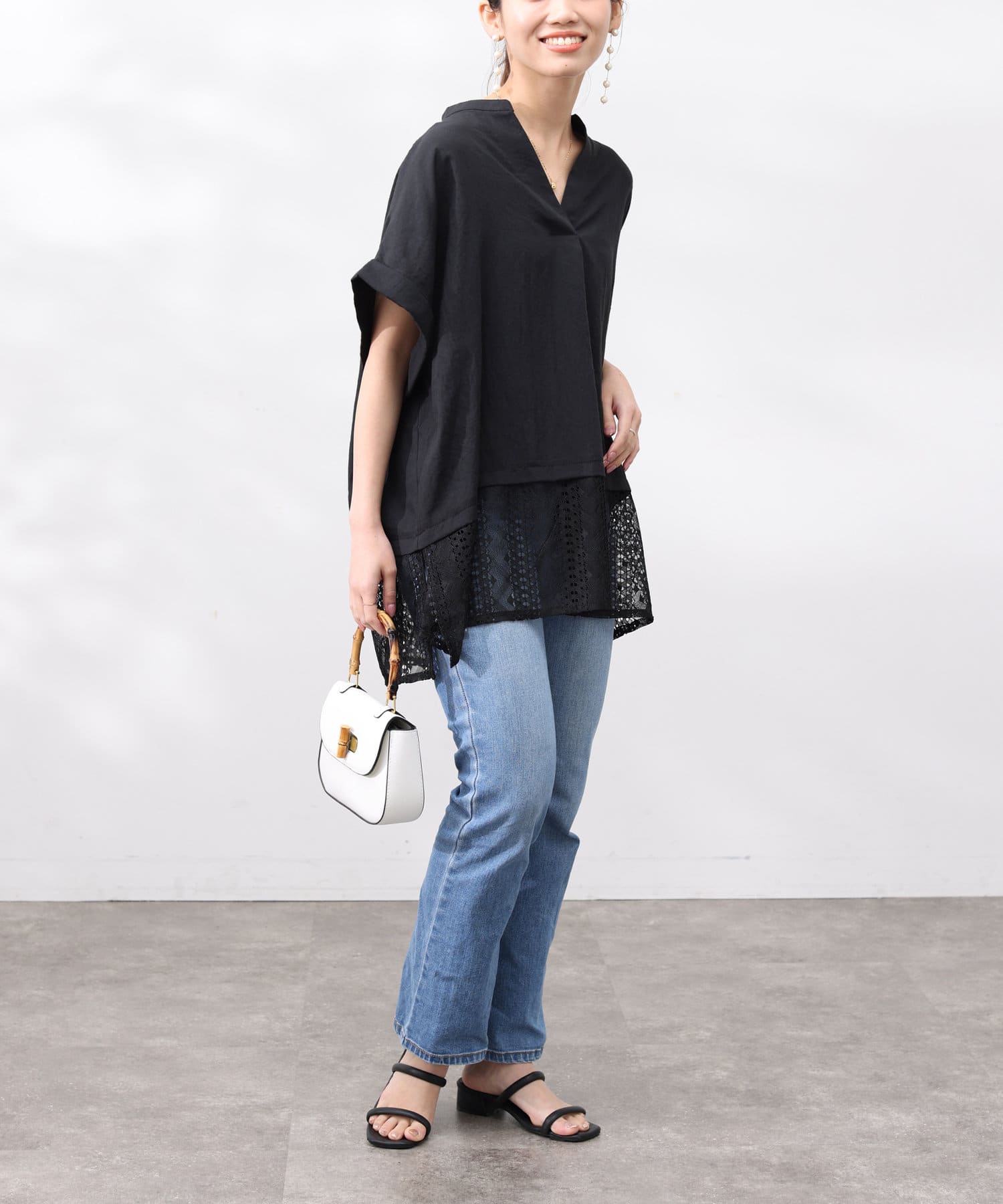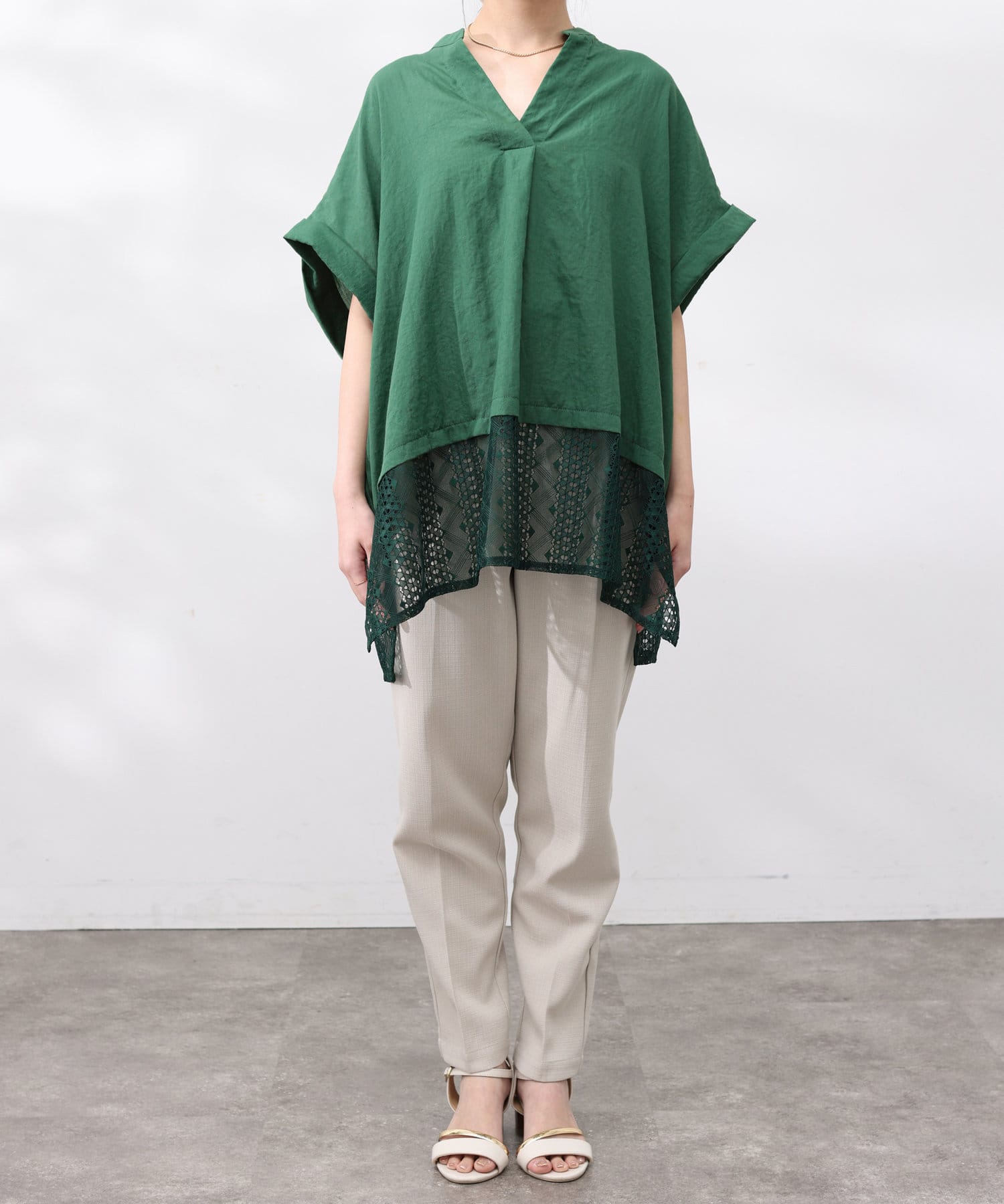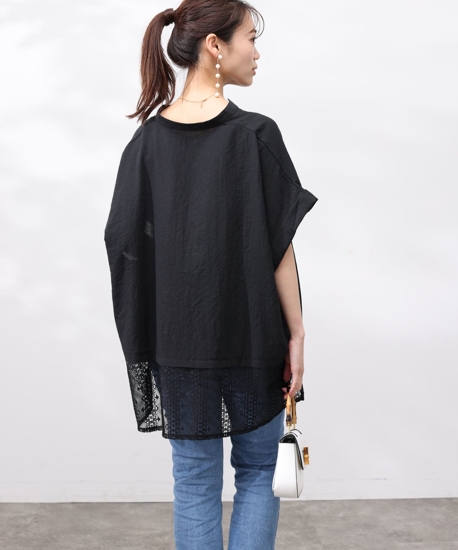 ゆったりとしたサイズ感に、裾のレース切替がポイントのスキッパーシャツです。