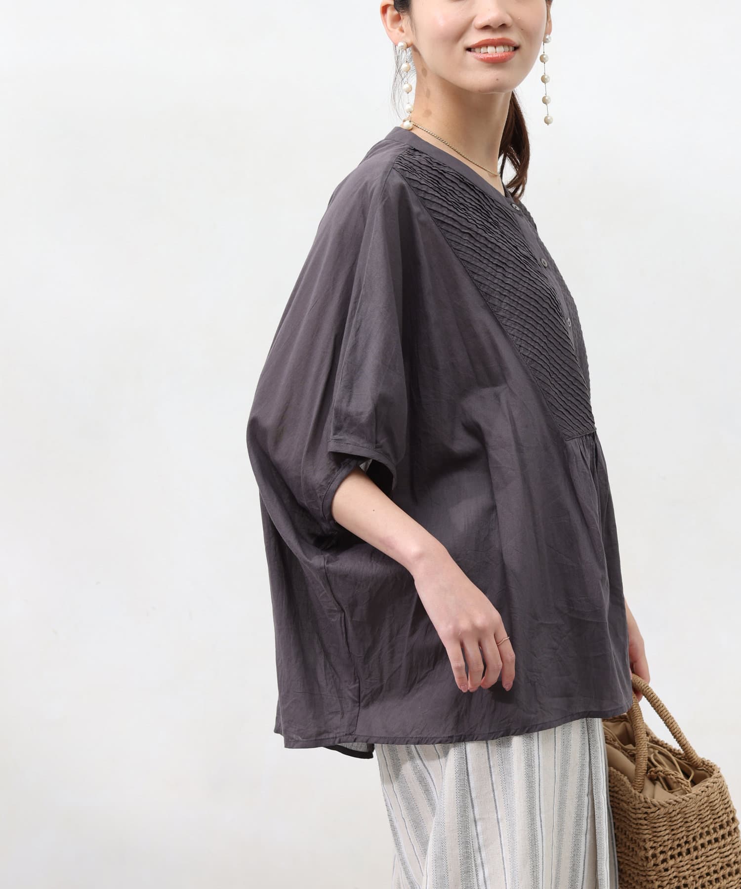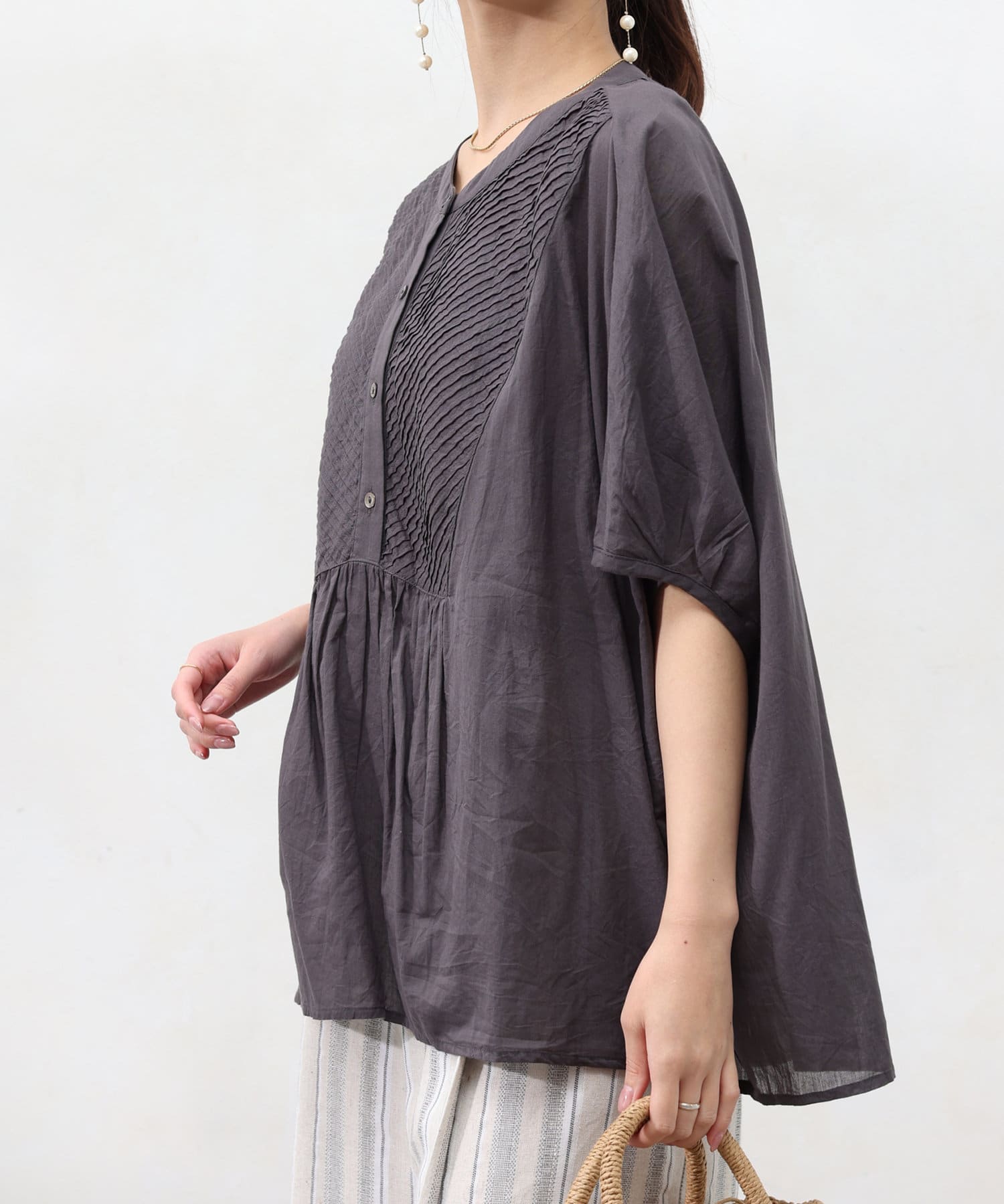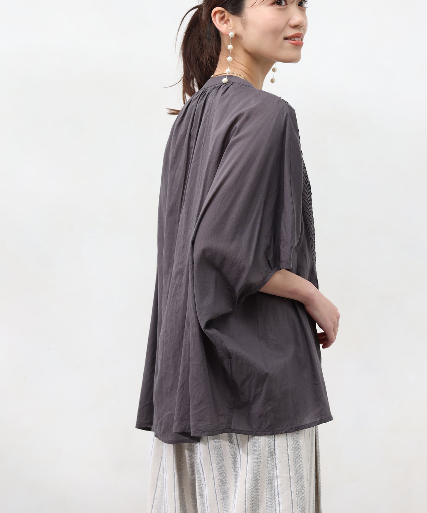 ドルマンスリーブでゆったりとしたシルエットながら、ピンタックのおかげですっきりとしたラインを強調できます。