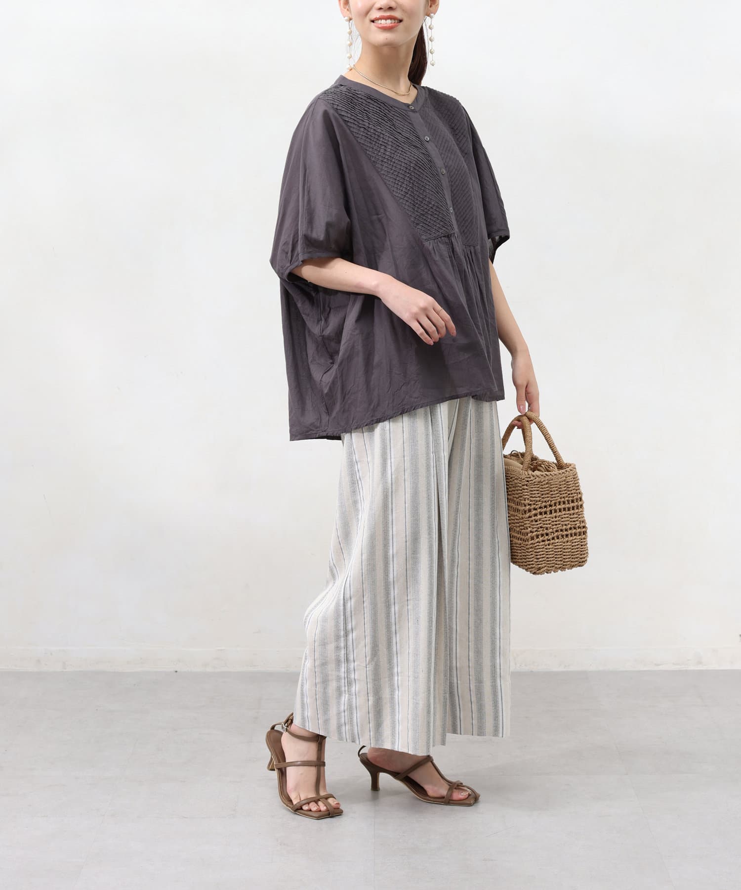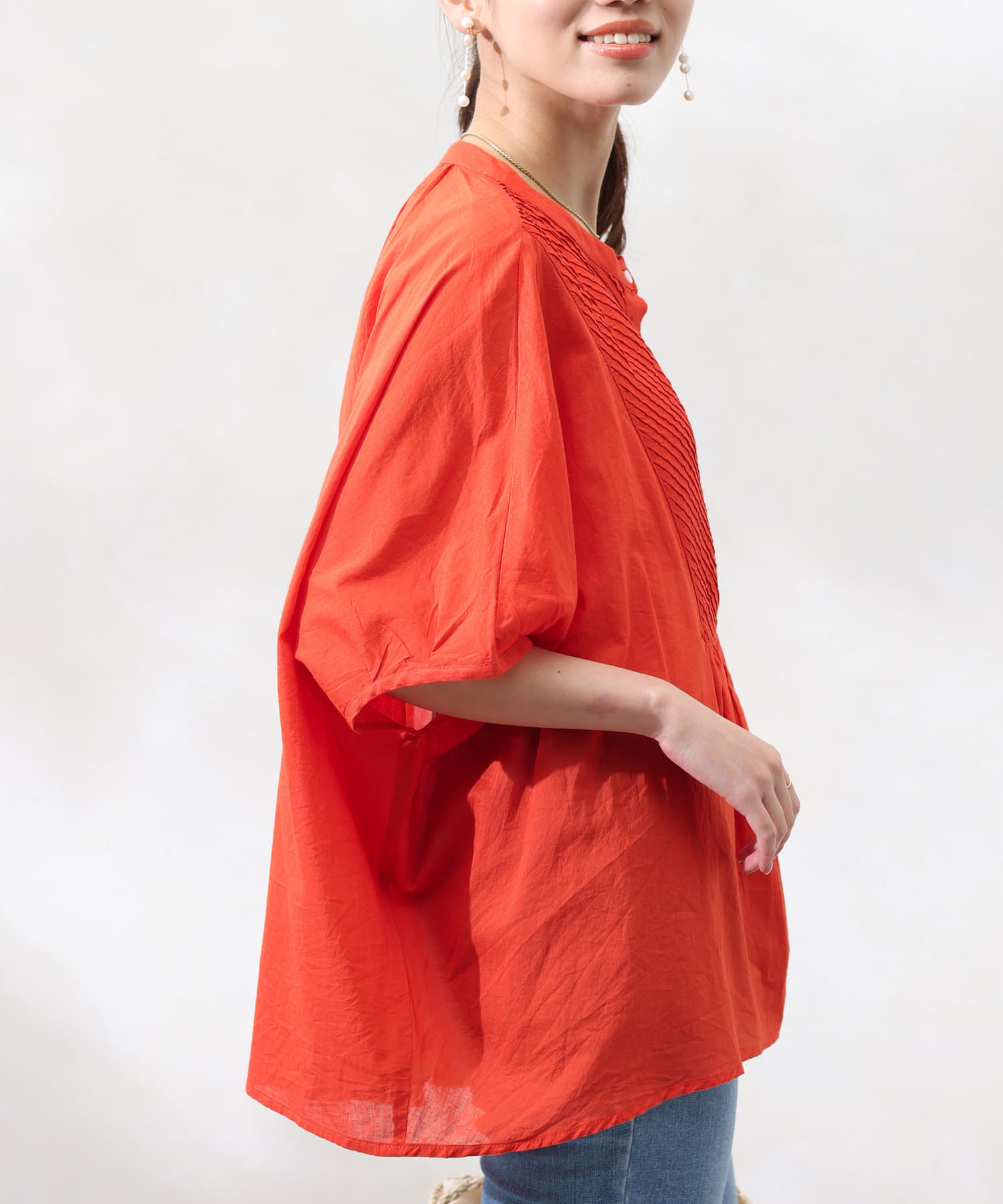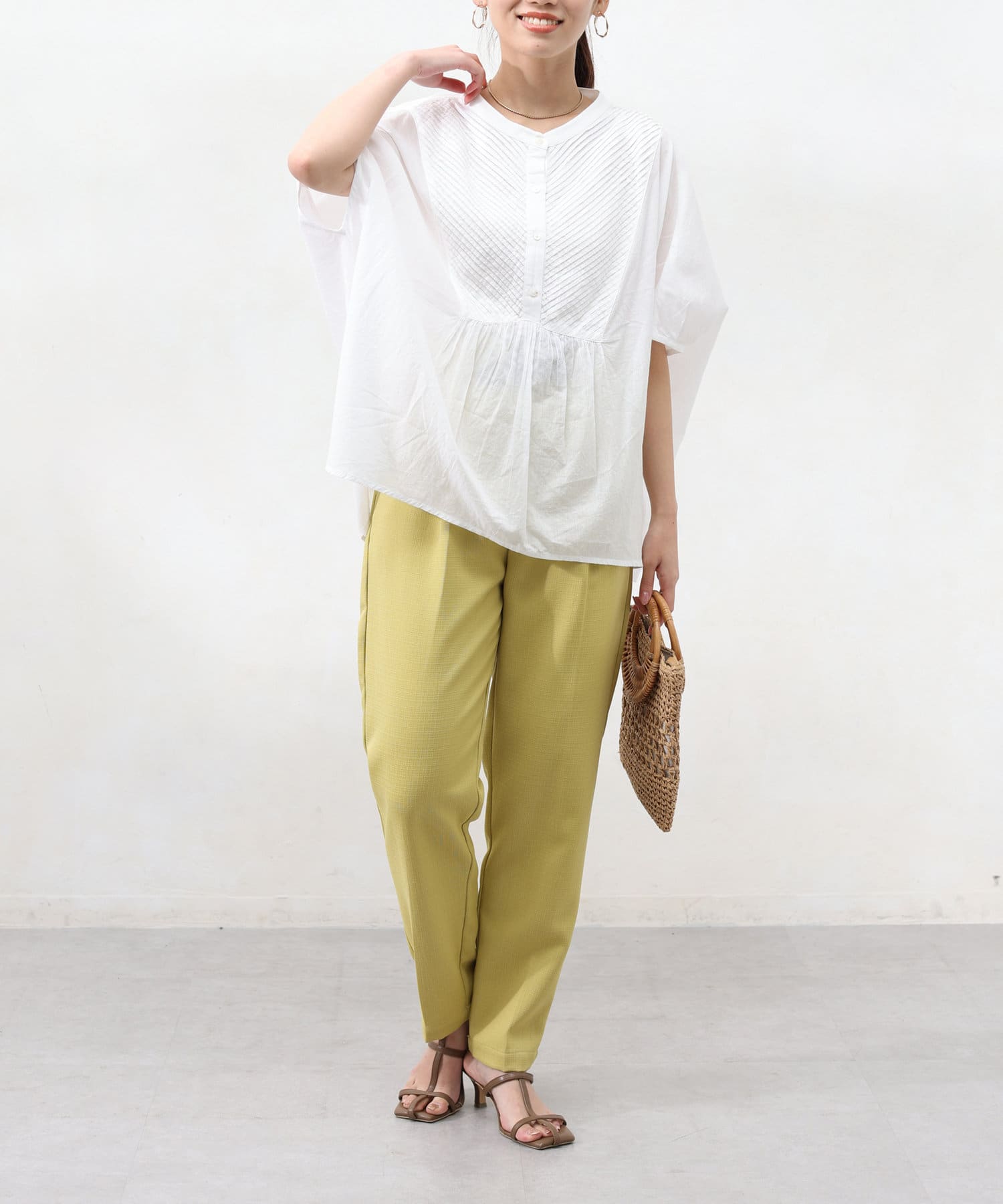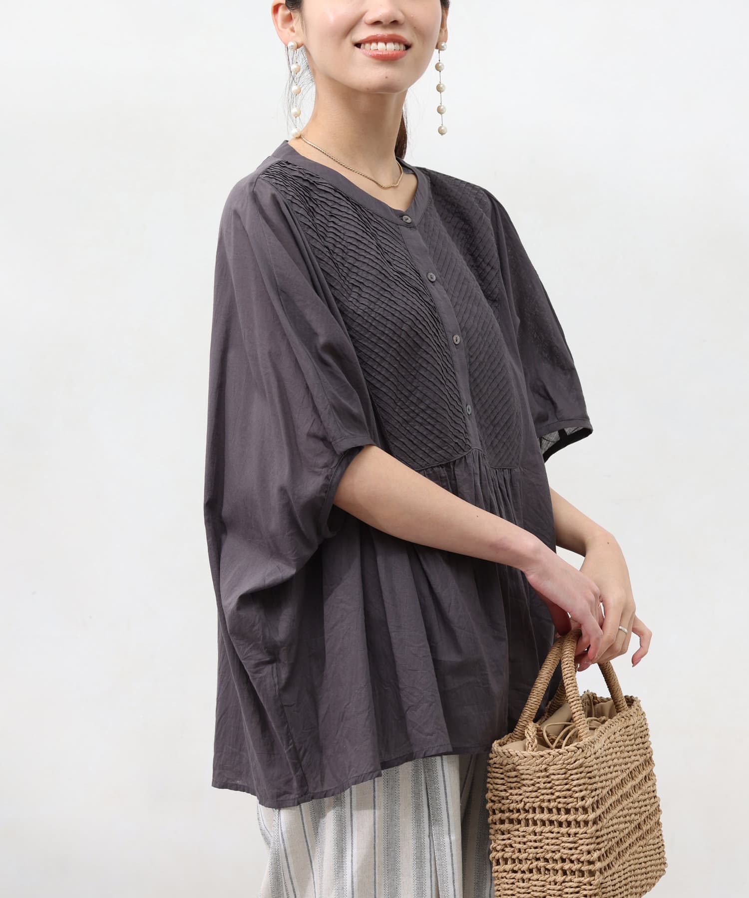 ドルマンスリーブでゆったりとしたシルエットながら、ピンタックのおかげですっきりとしたラインを強調できます。