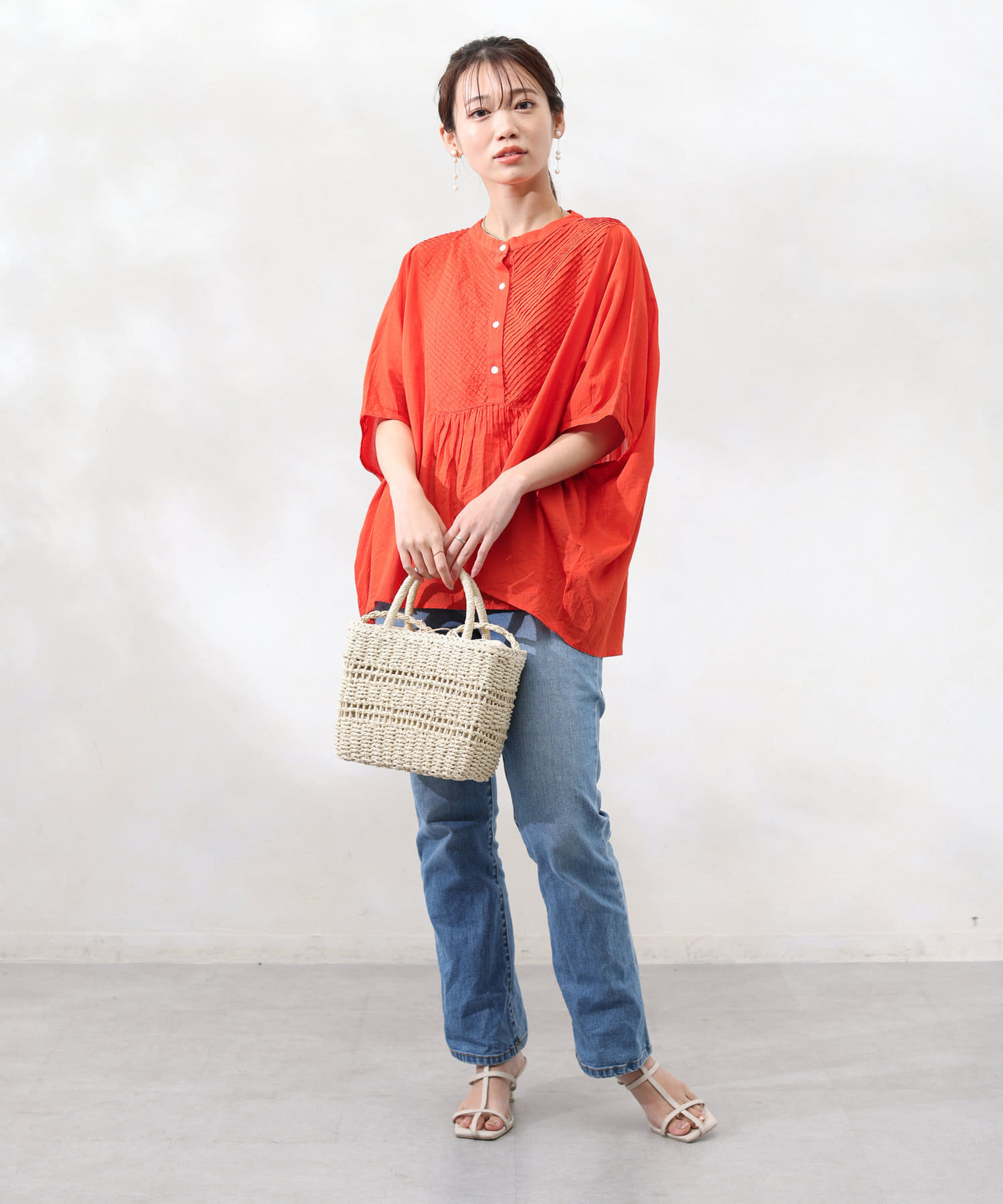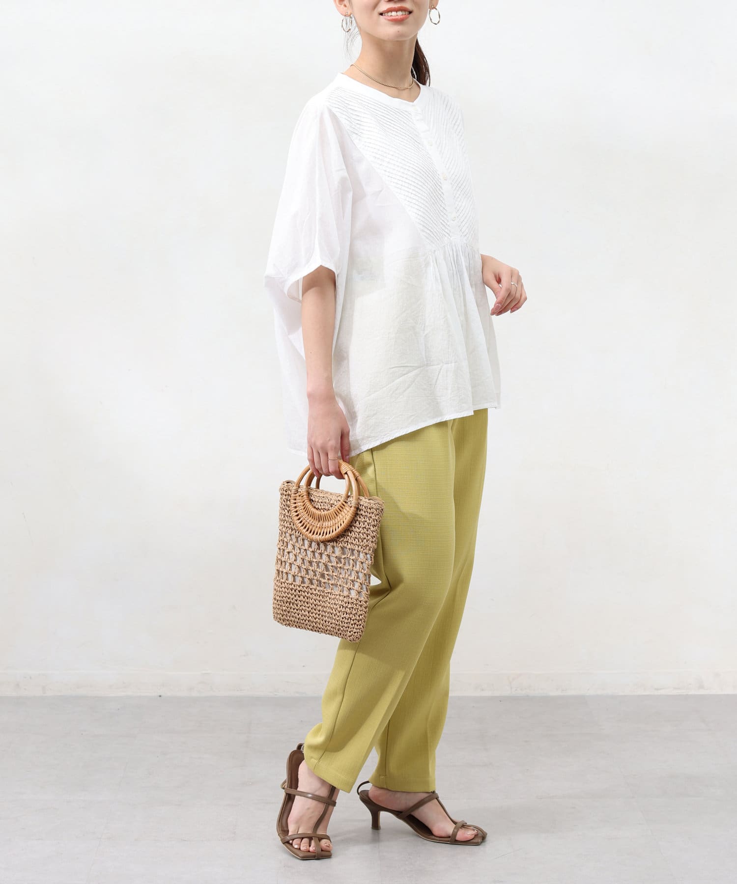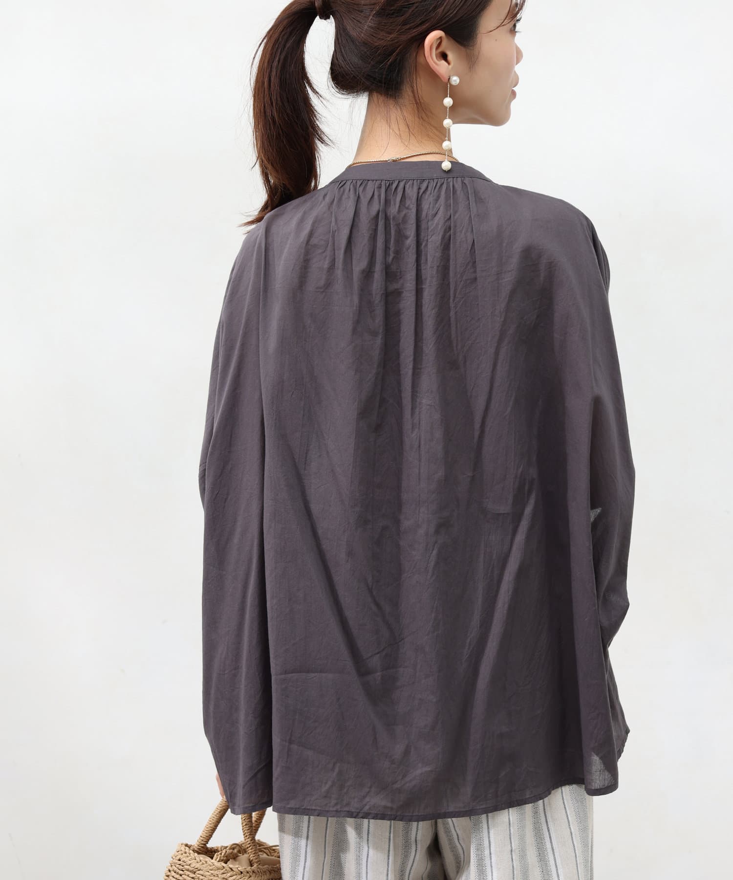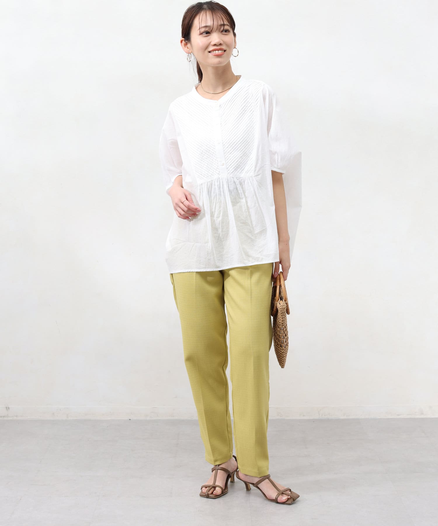 襟元はバンドカラーできれいめ見えするので、大人女子にもおすすめのディティール。