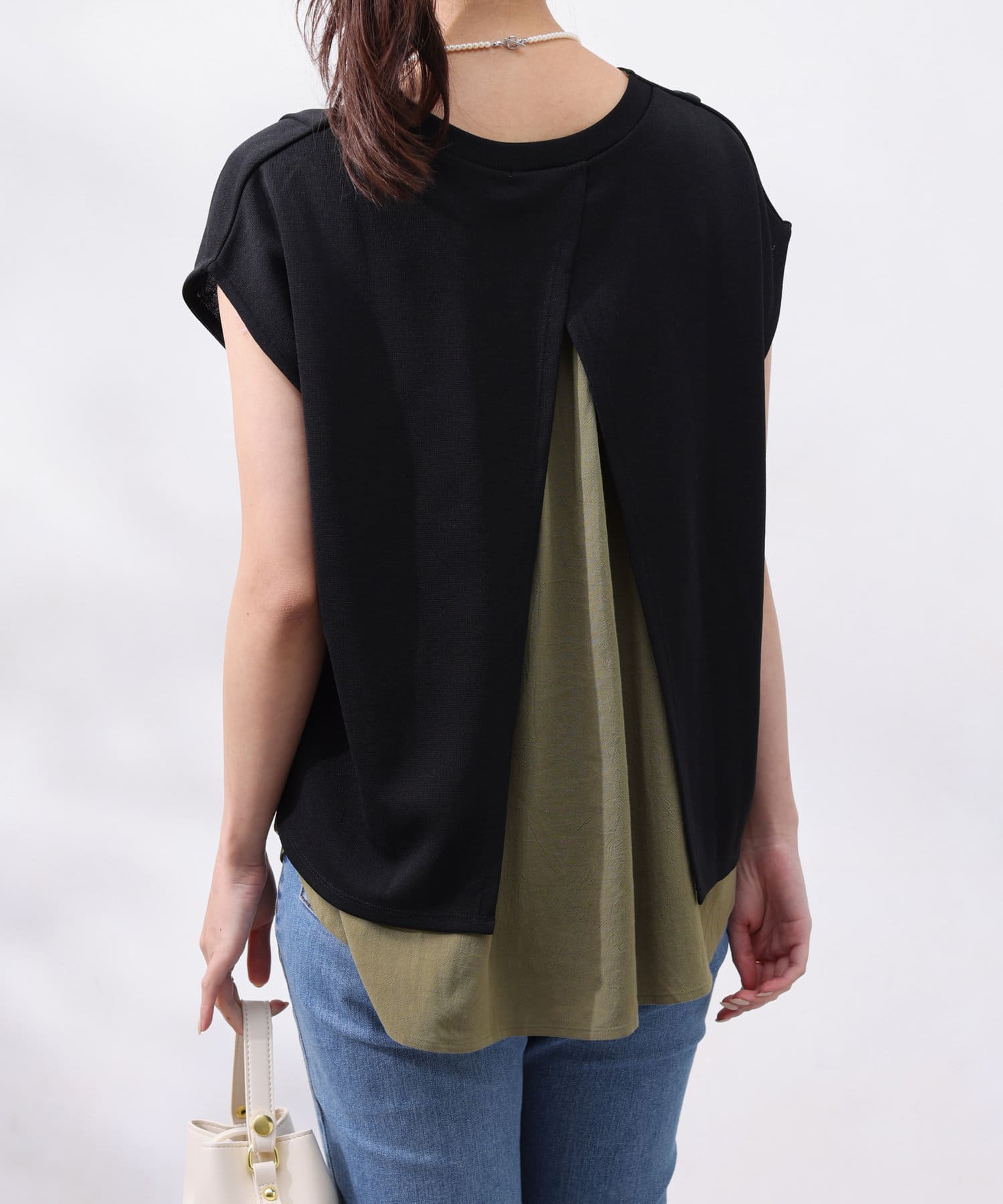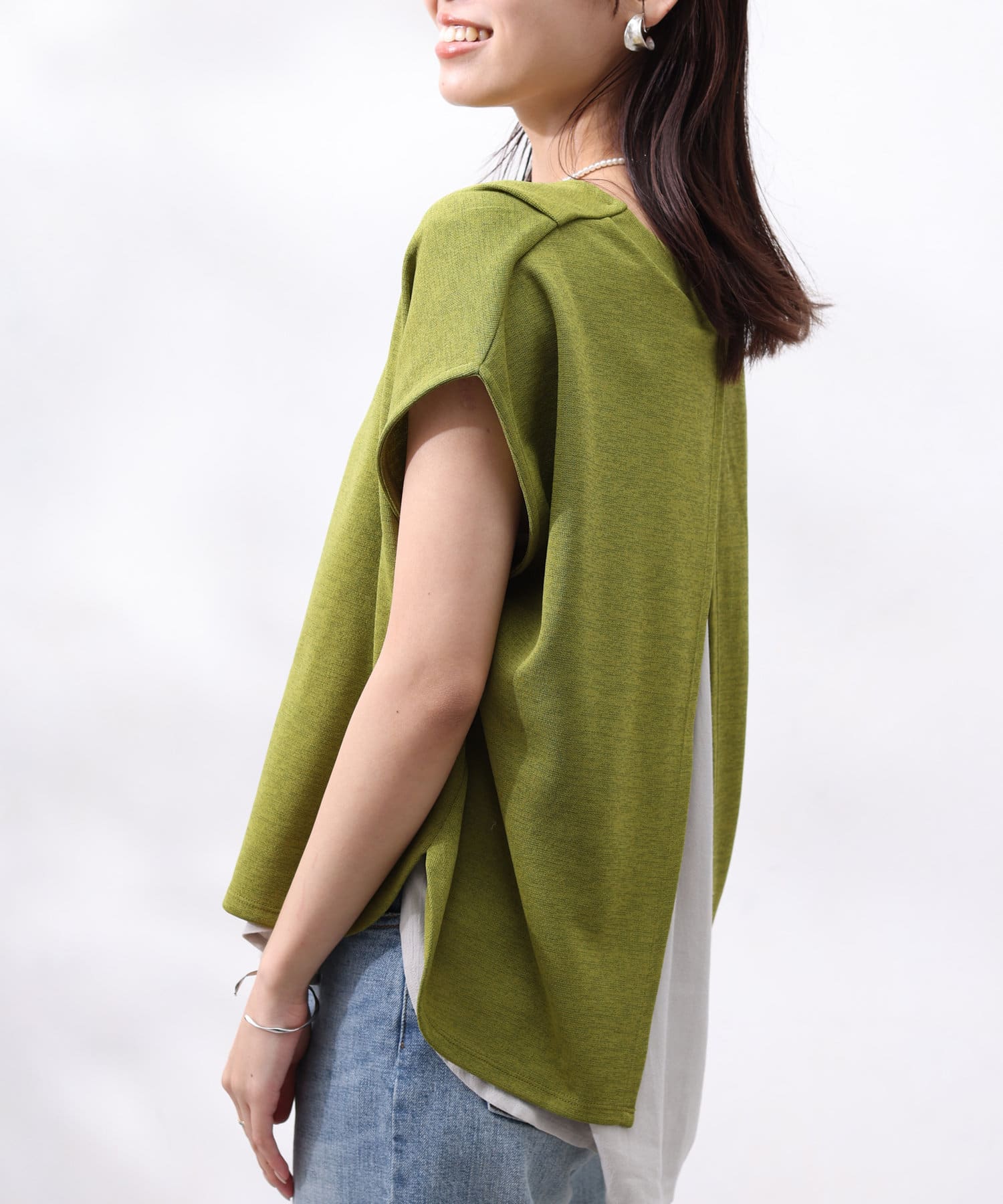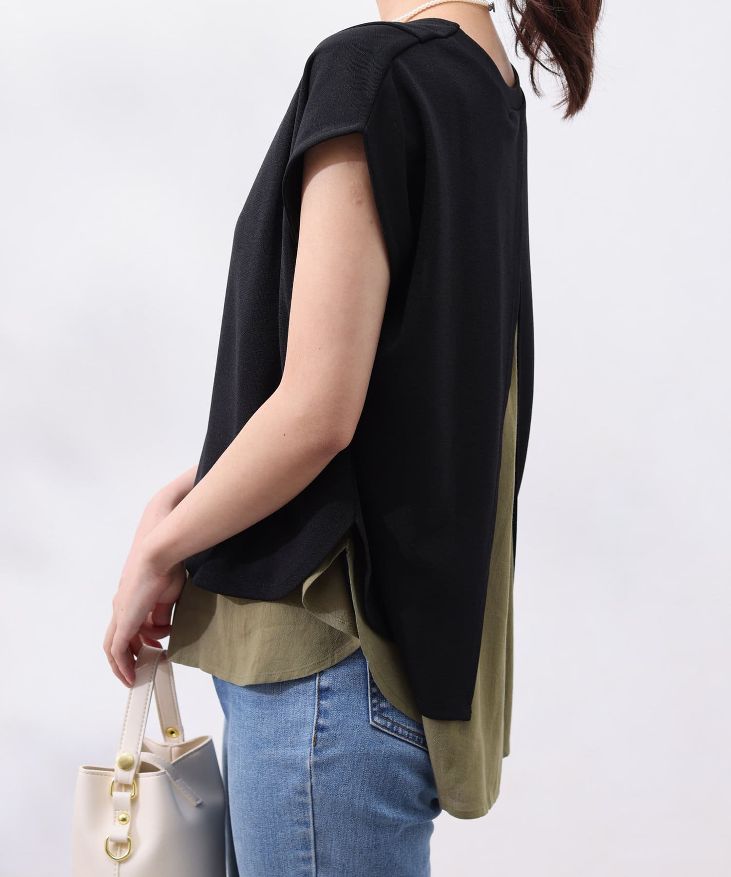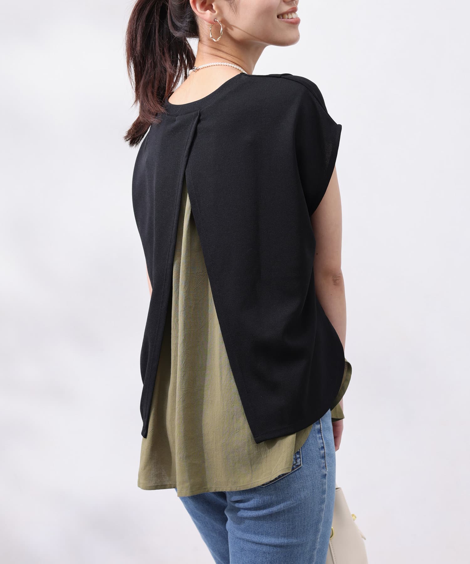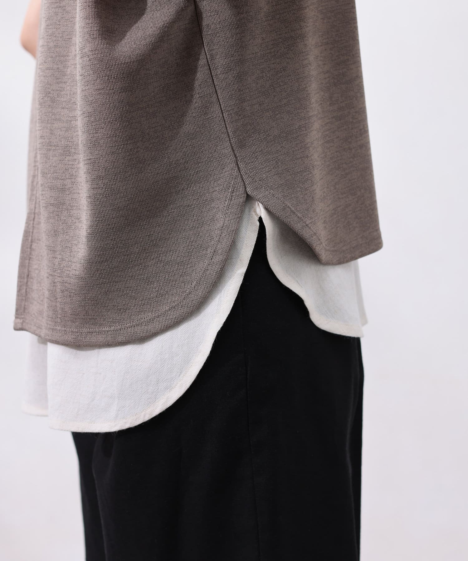後身頃のスリットから別布が見えるデザインで、1枚で簡単にレイヤードコーデが叶うお洒落トップスです。