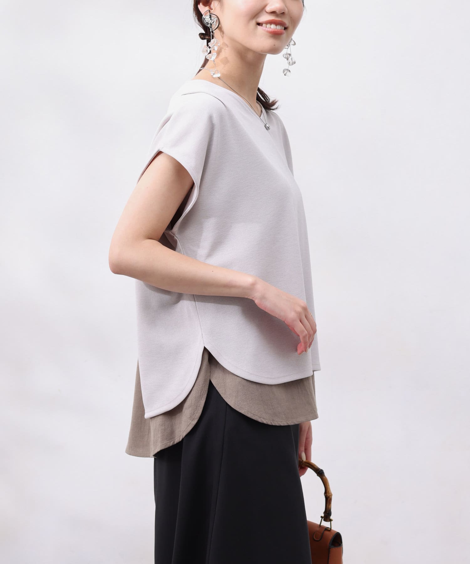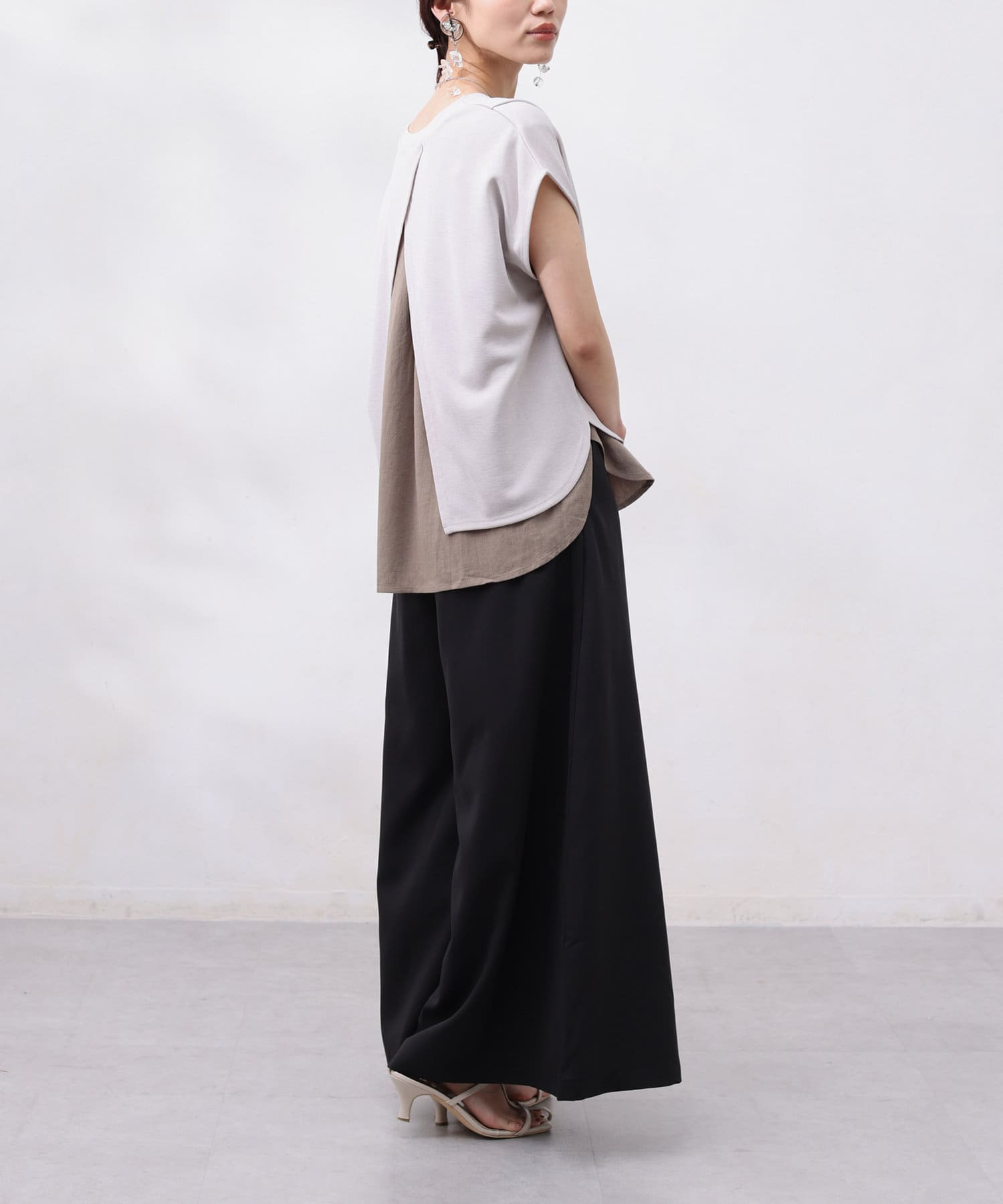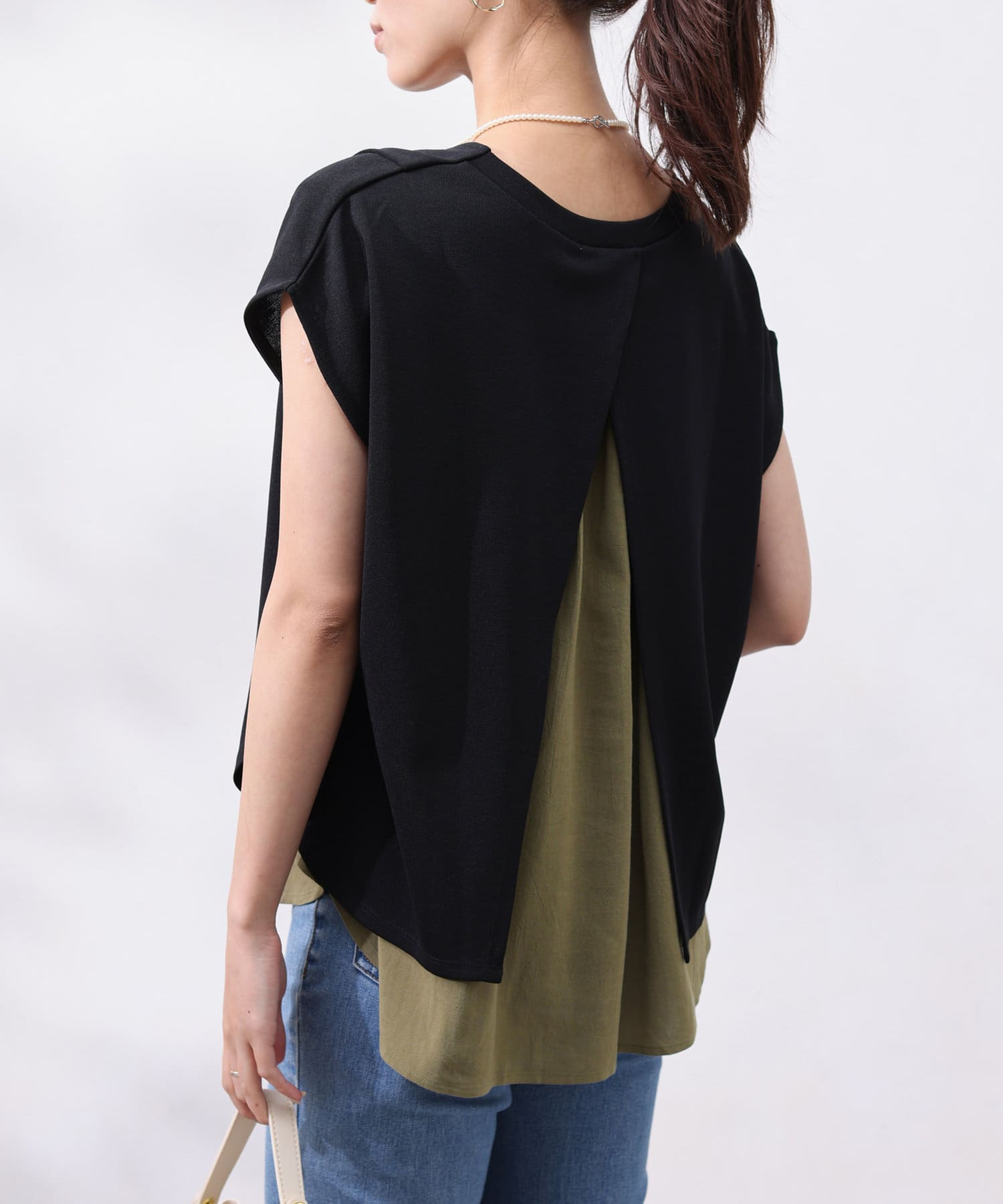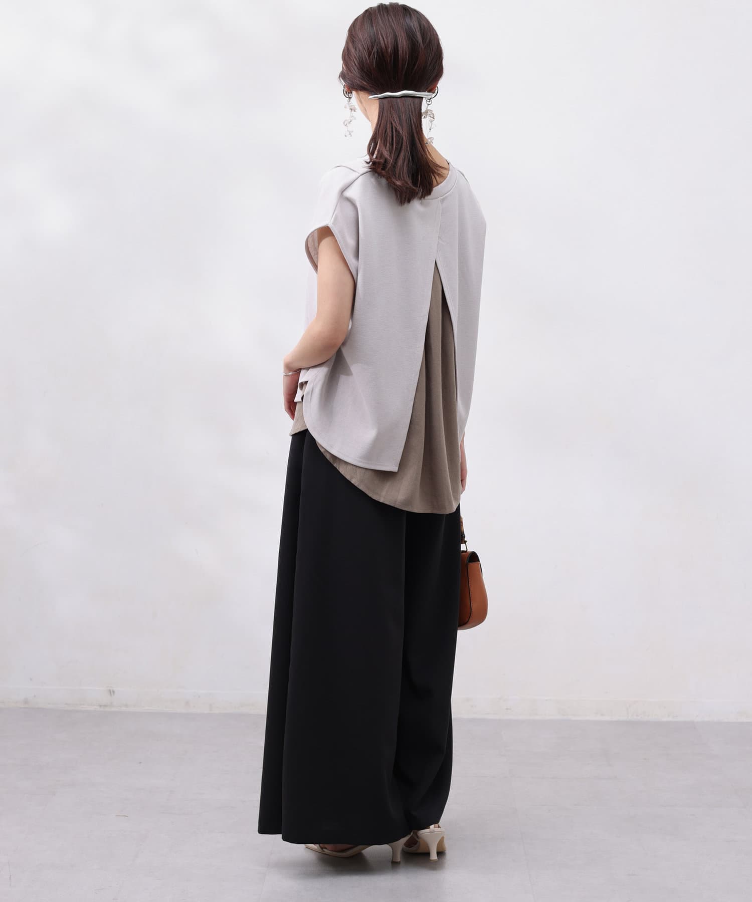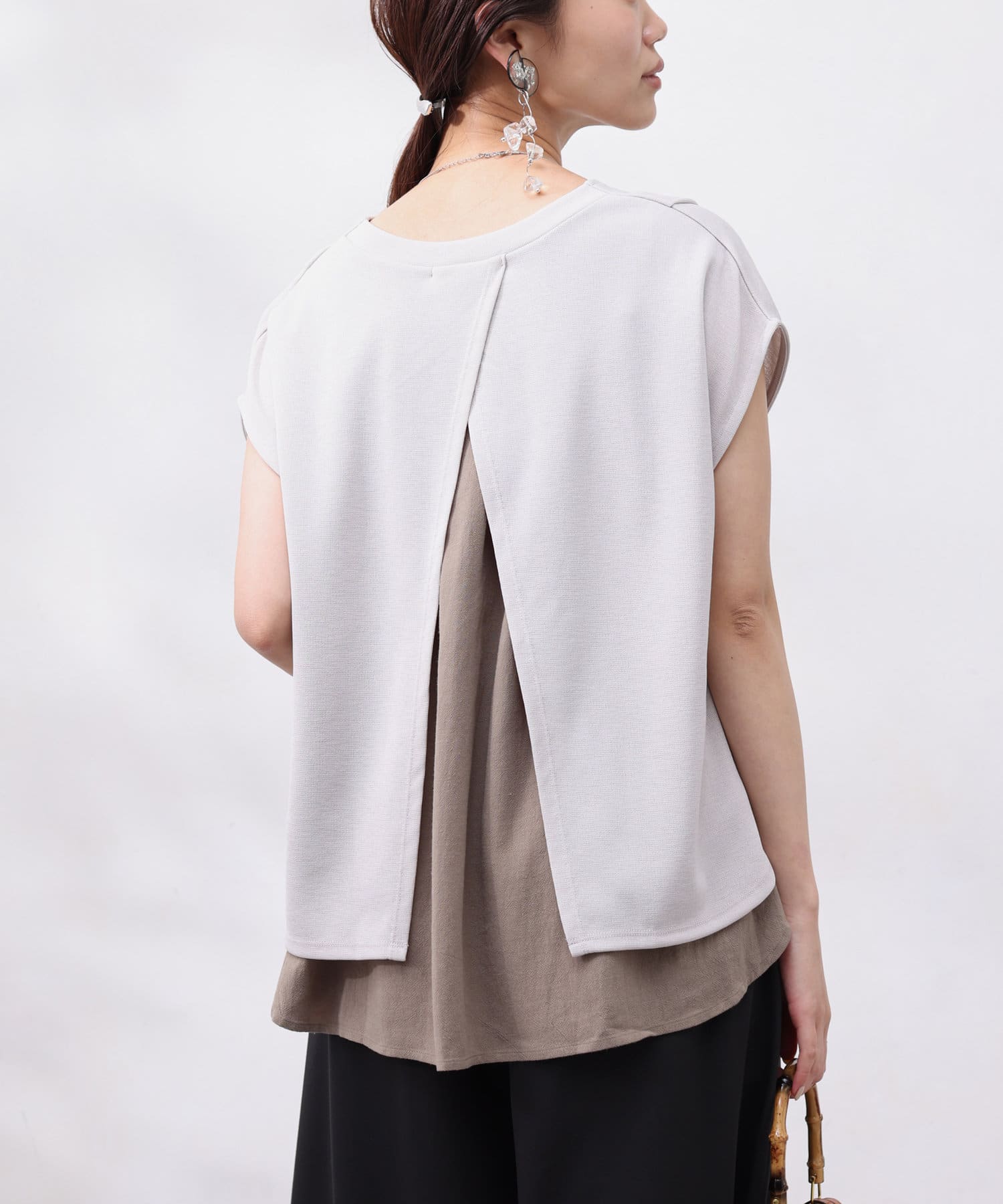 後身頃のスリットから別布が見えるデザインで、1枚で簡単にレイヤードコーデが叶うお洒落トップスです。