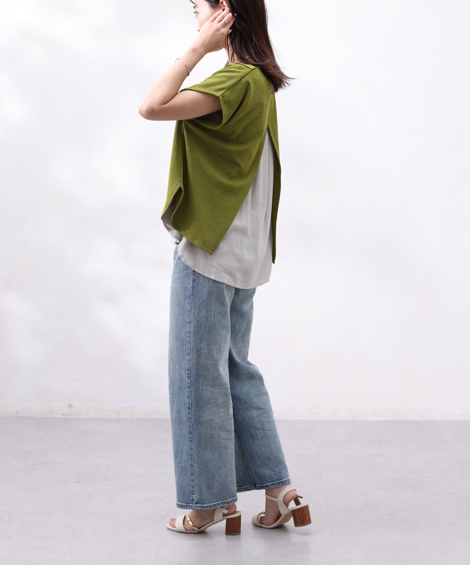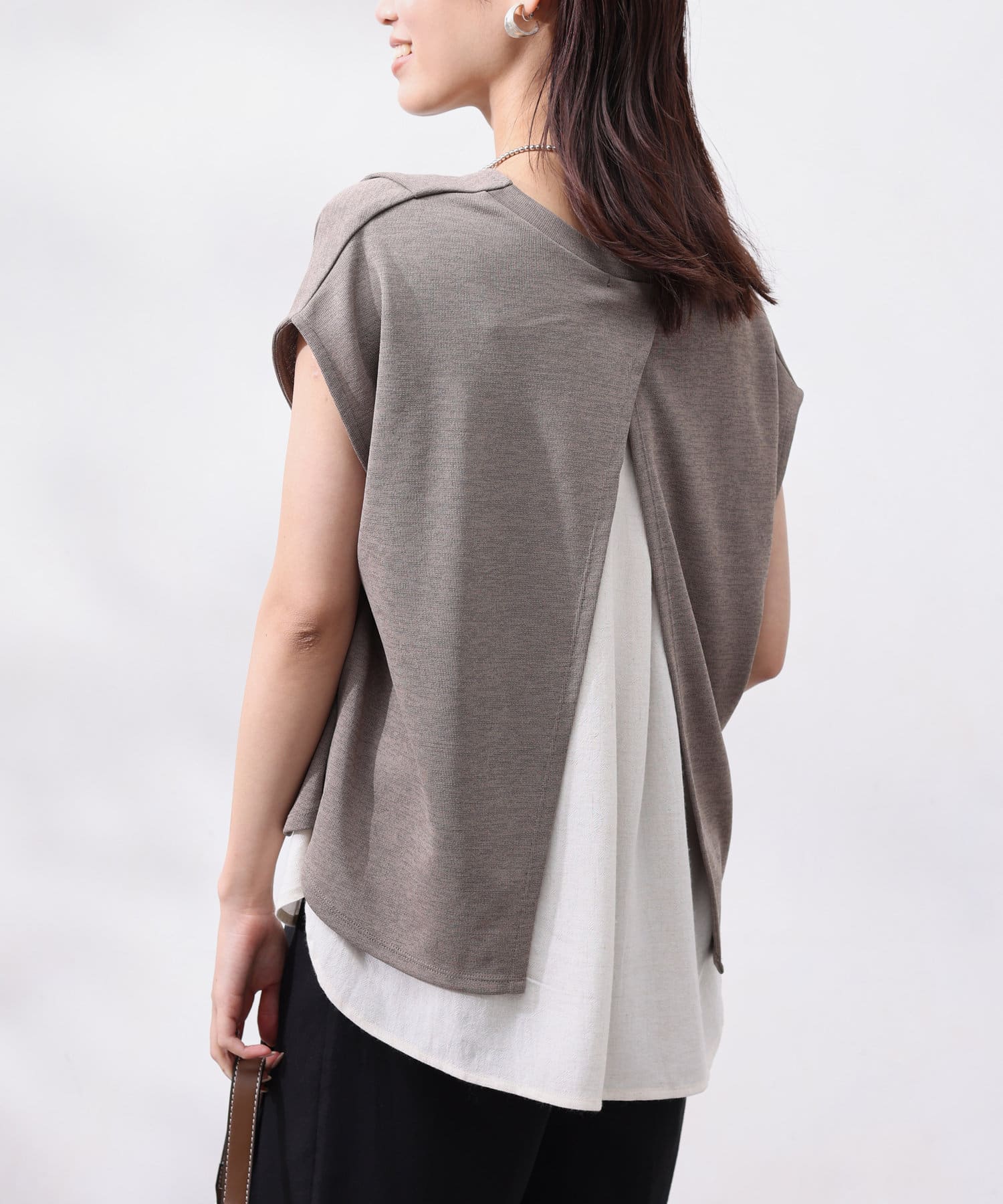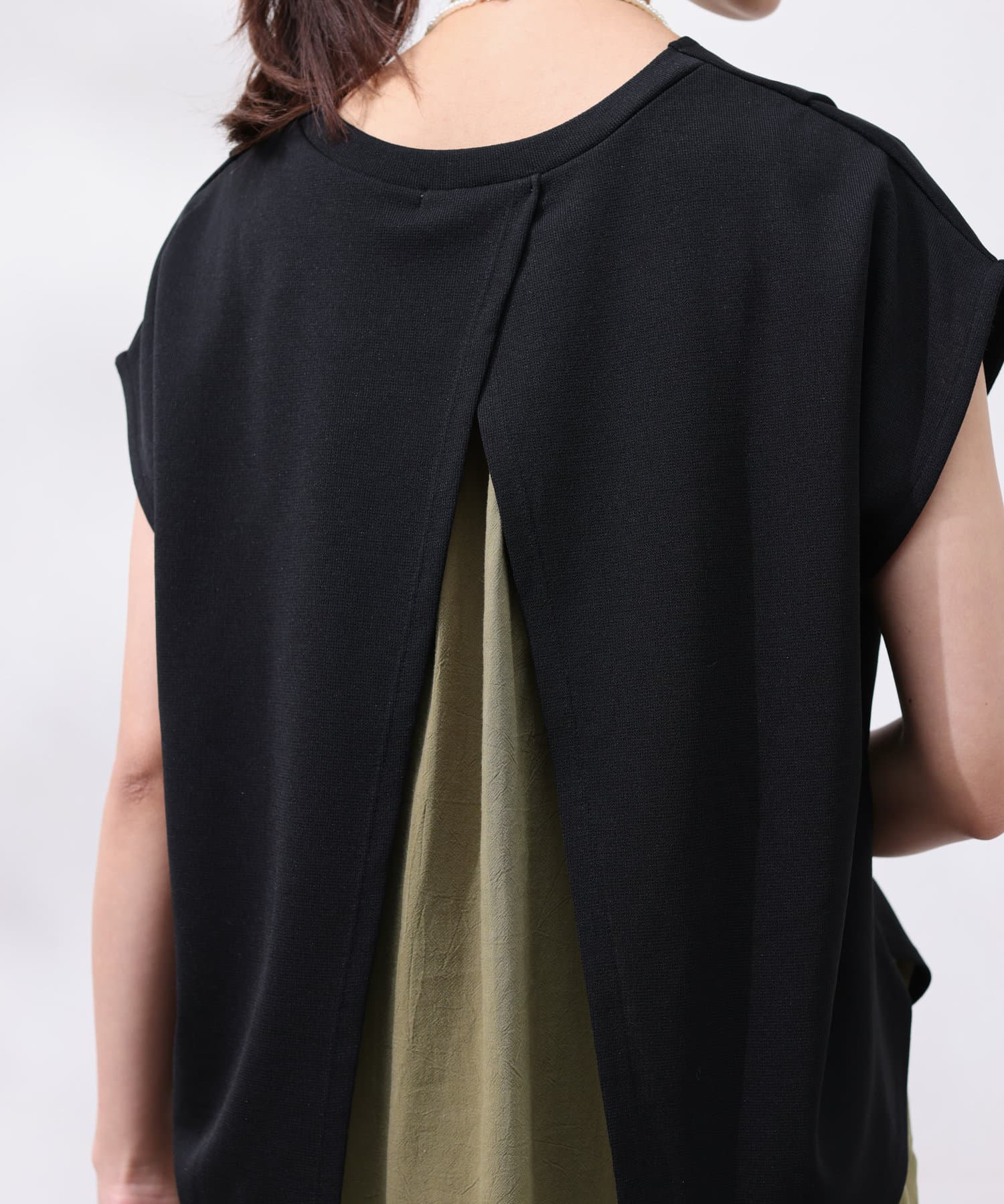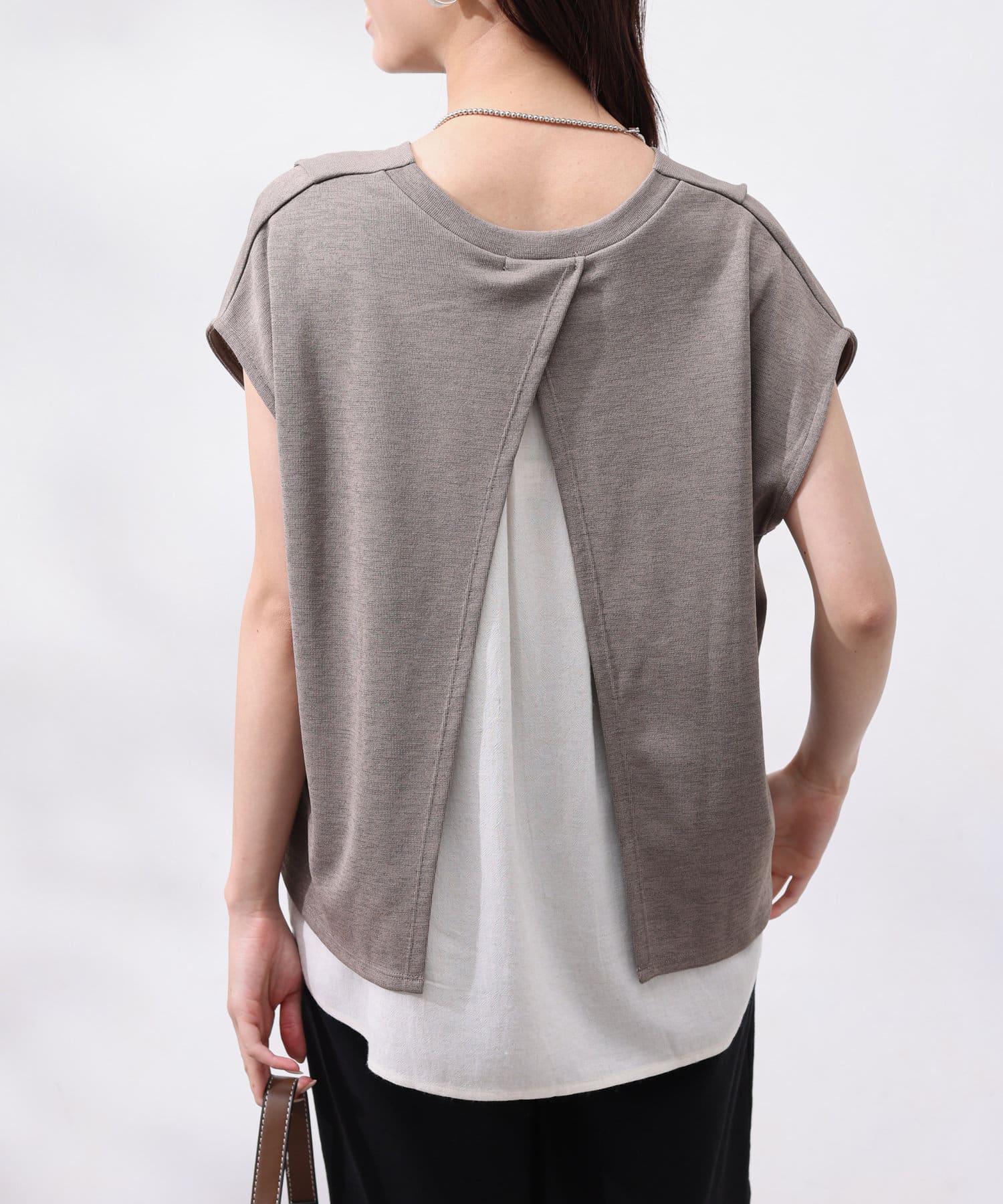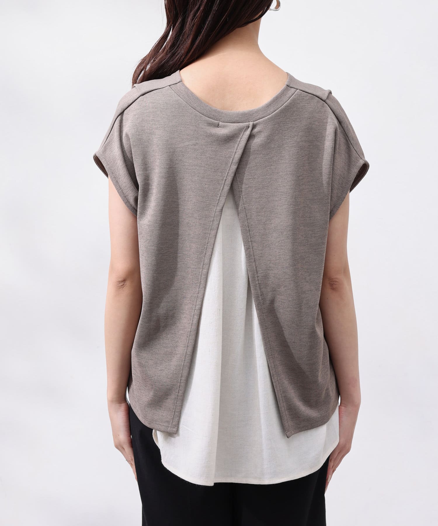 後身頃のスリットから別布が見えるデザインで、1枚で簡単にレイヤードコーデが叶うお洒落トップスです。