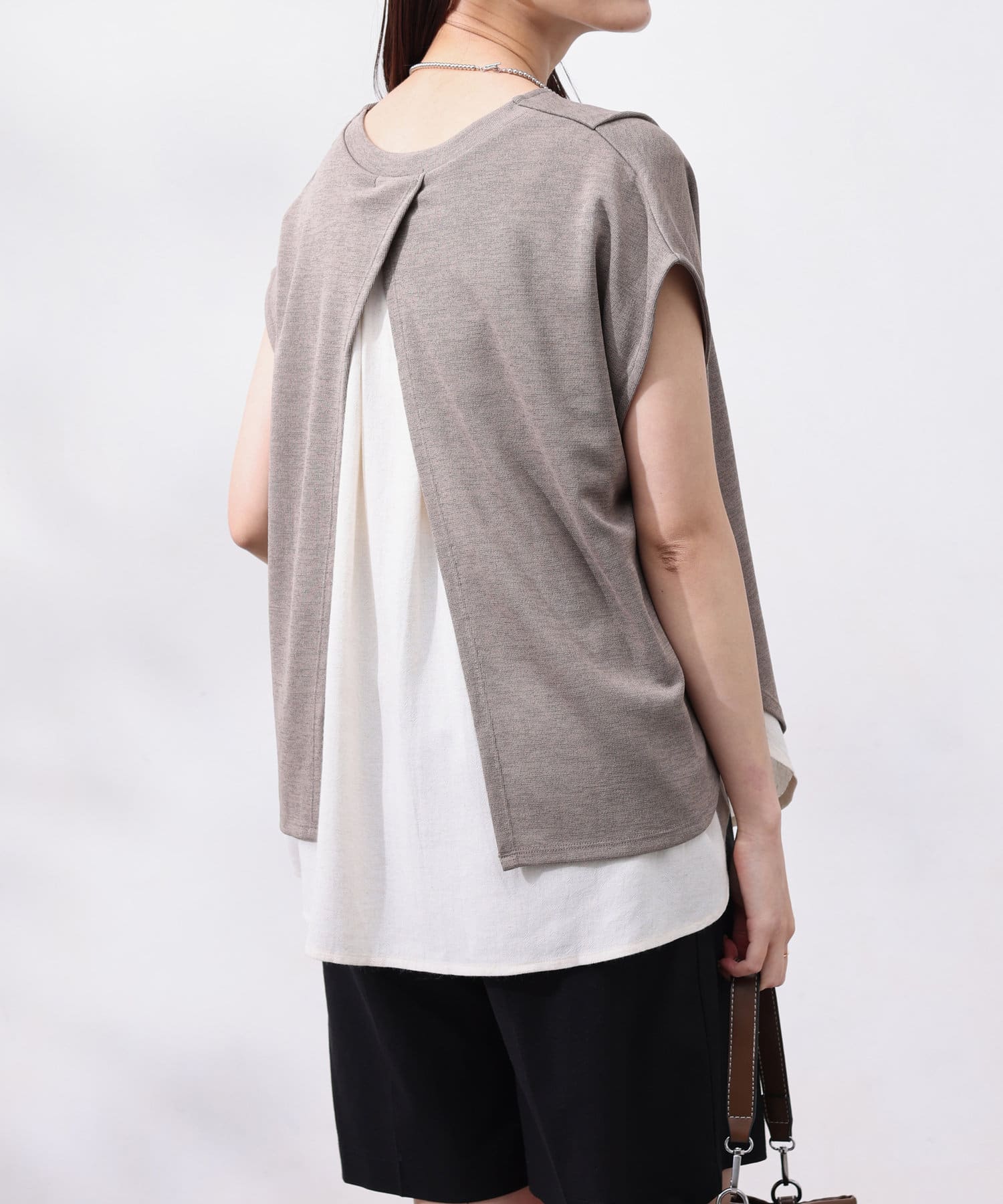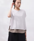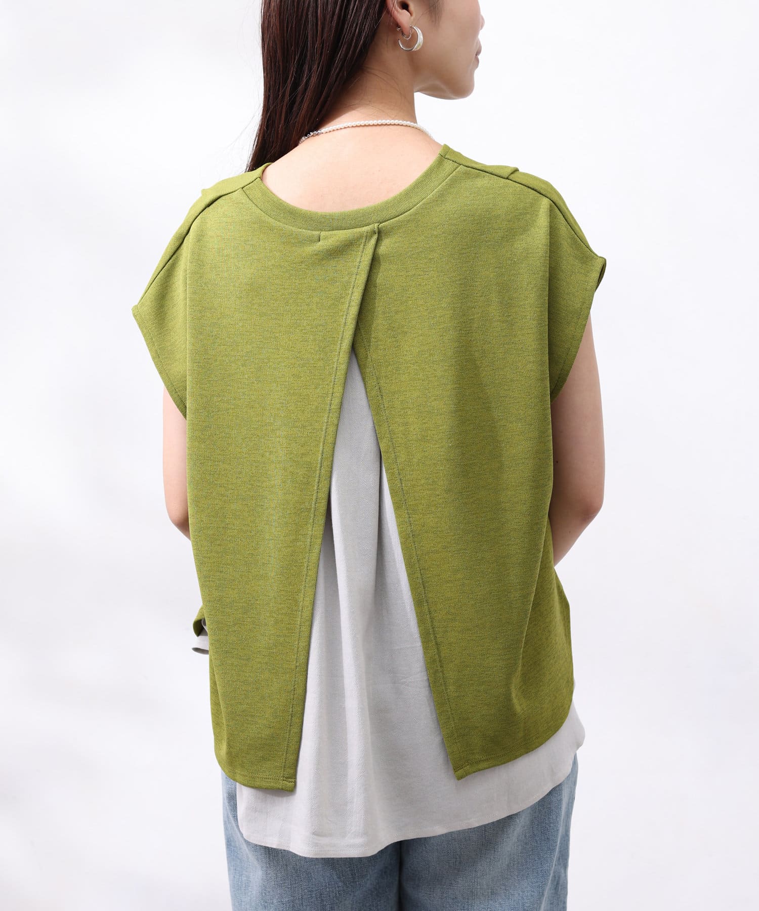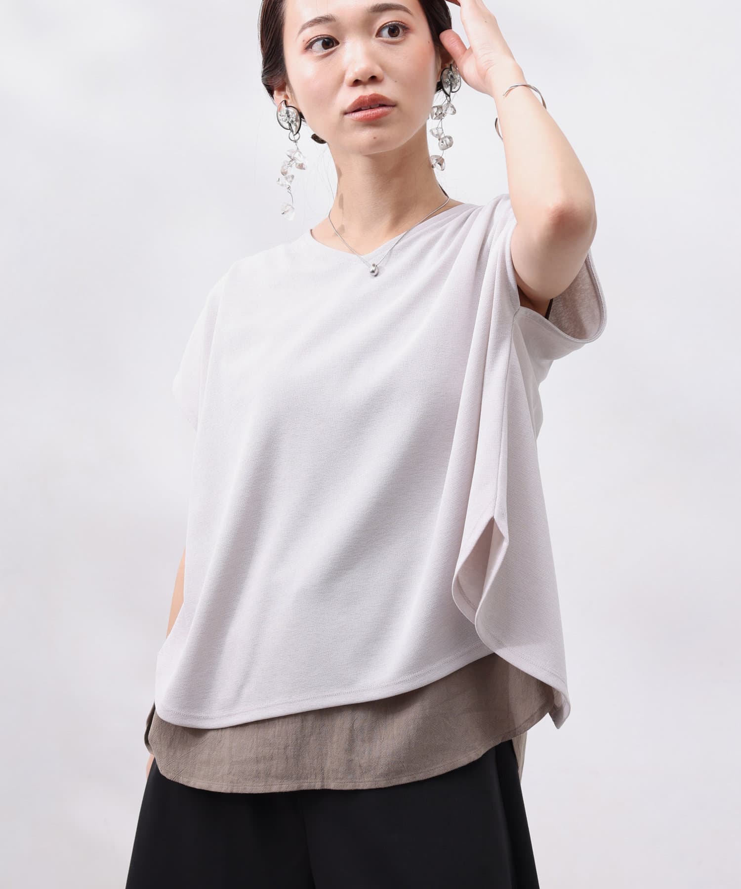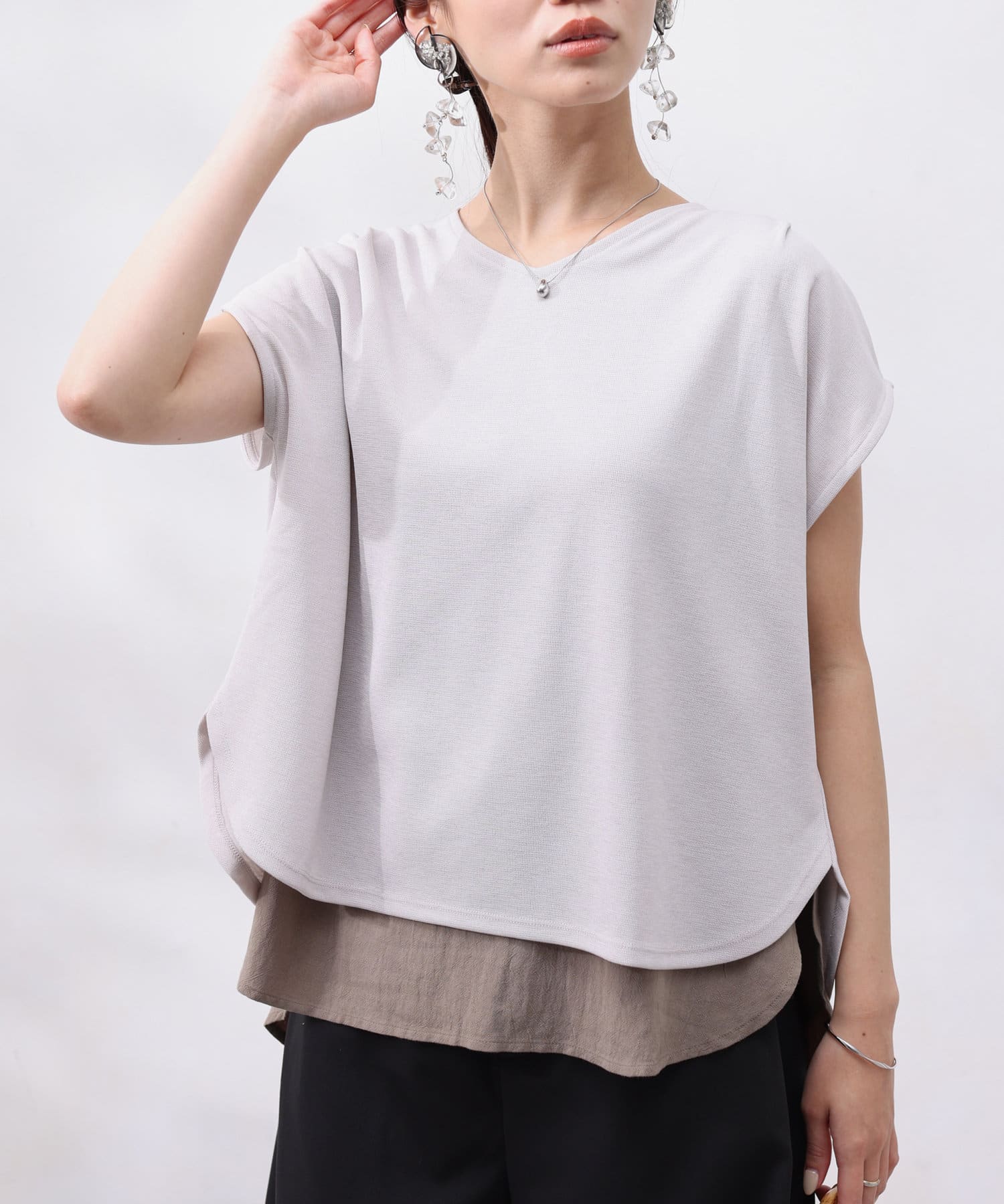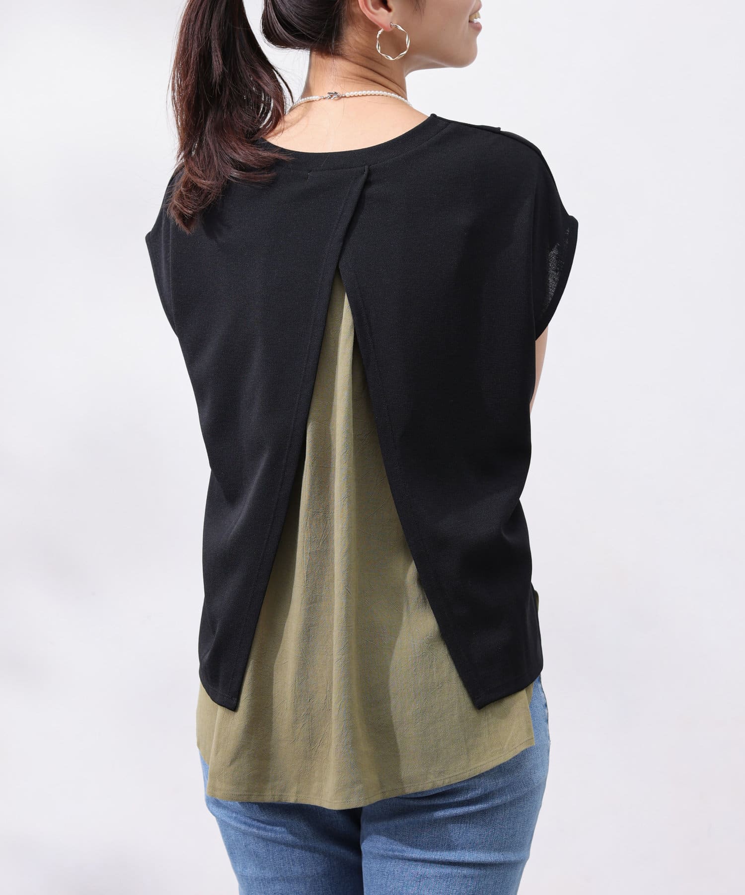 後身頃のスリットから別布が見えるデザインで、1枚で簡単にレイヤードコーデが叶うお洒落トップスです。