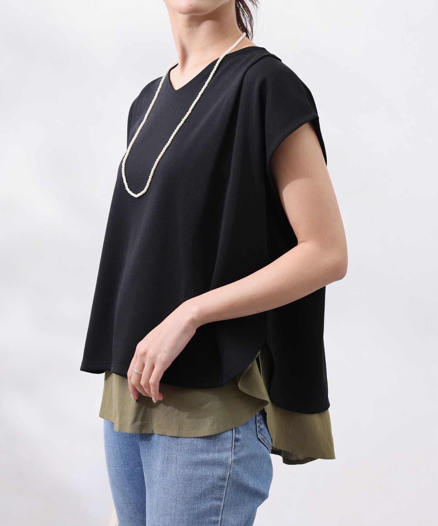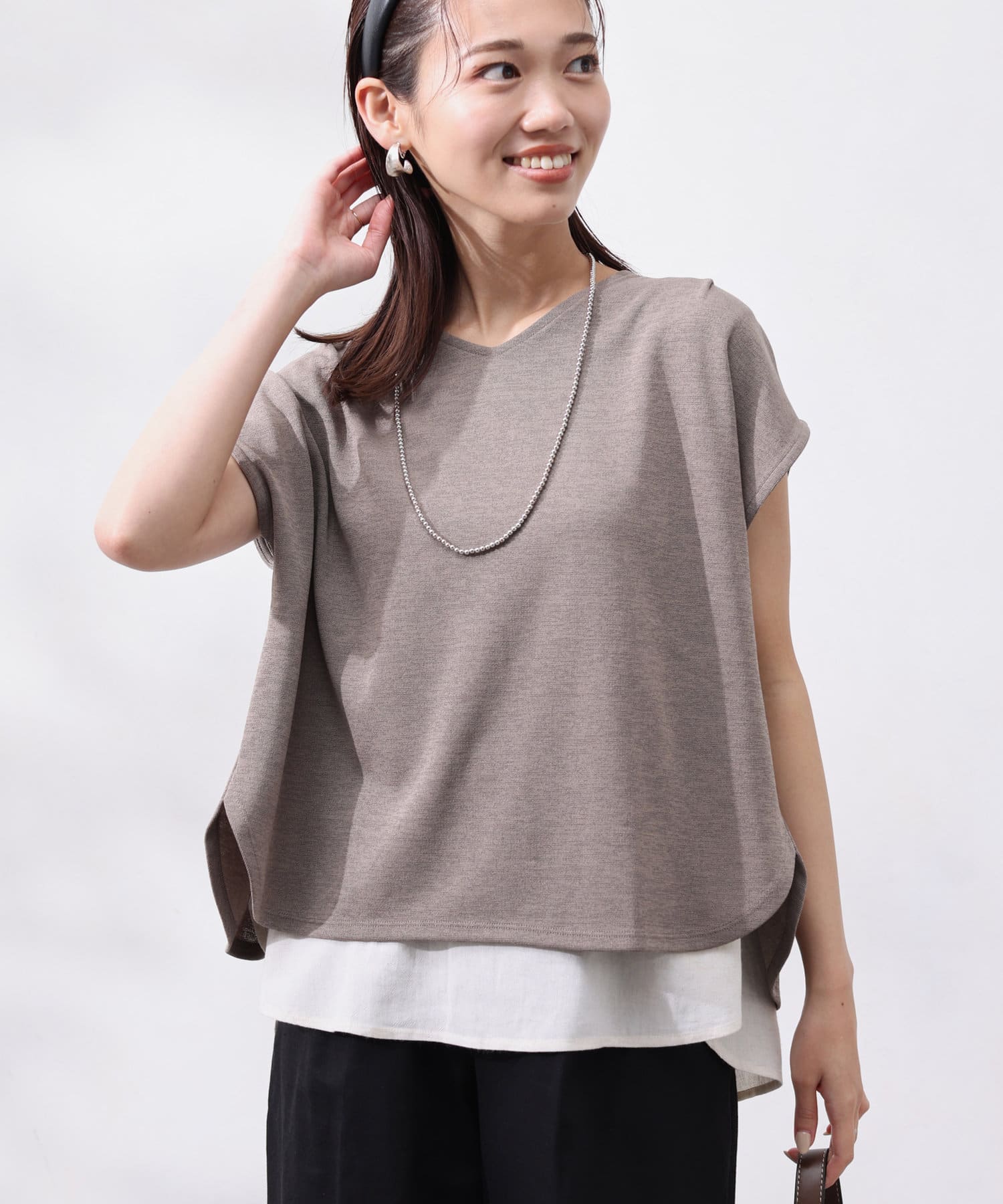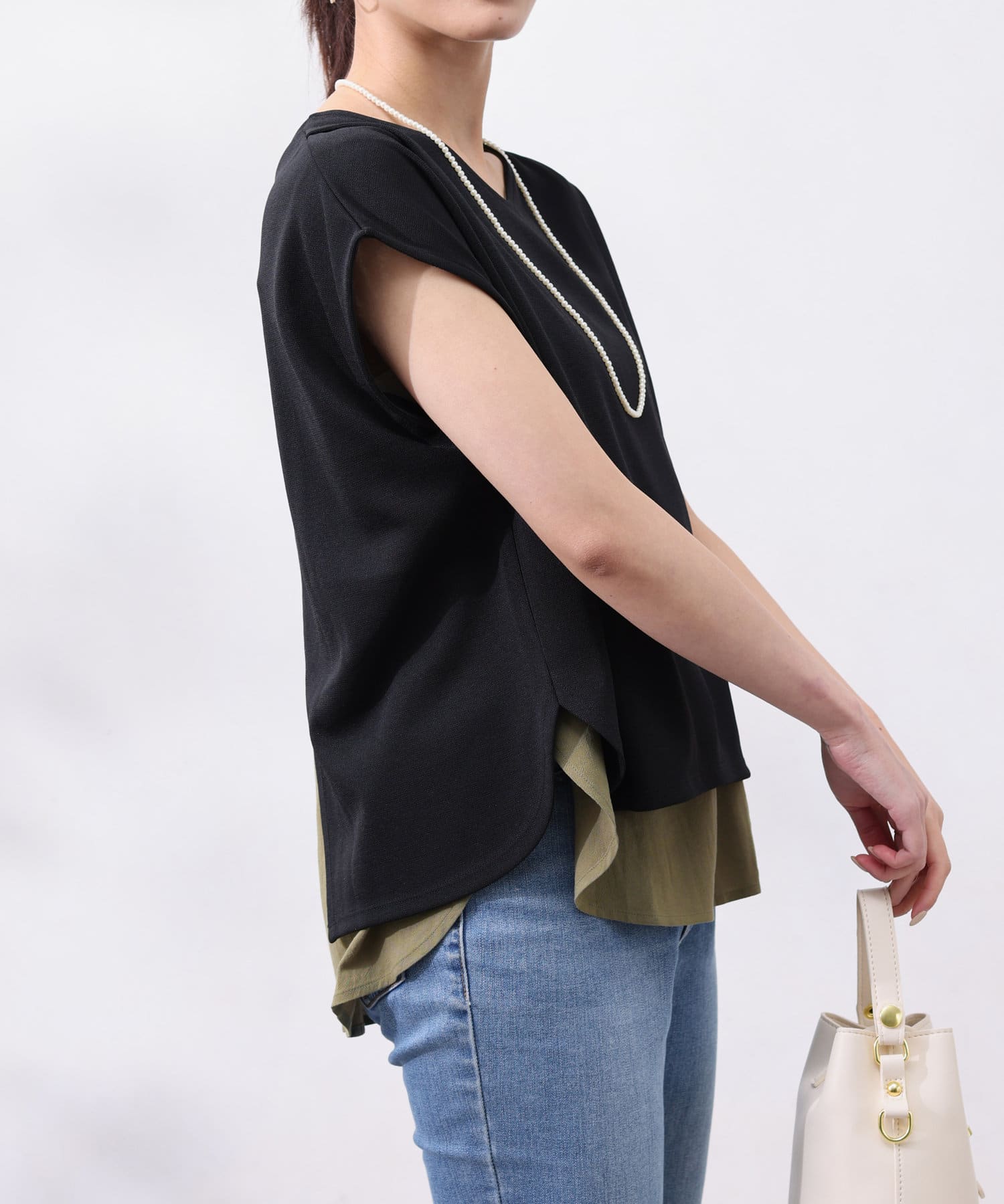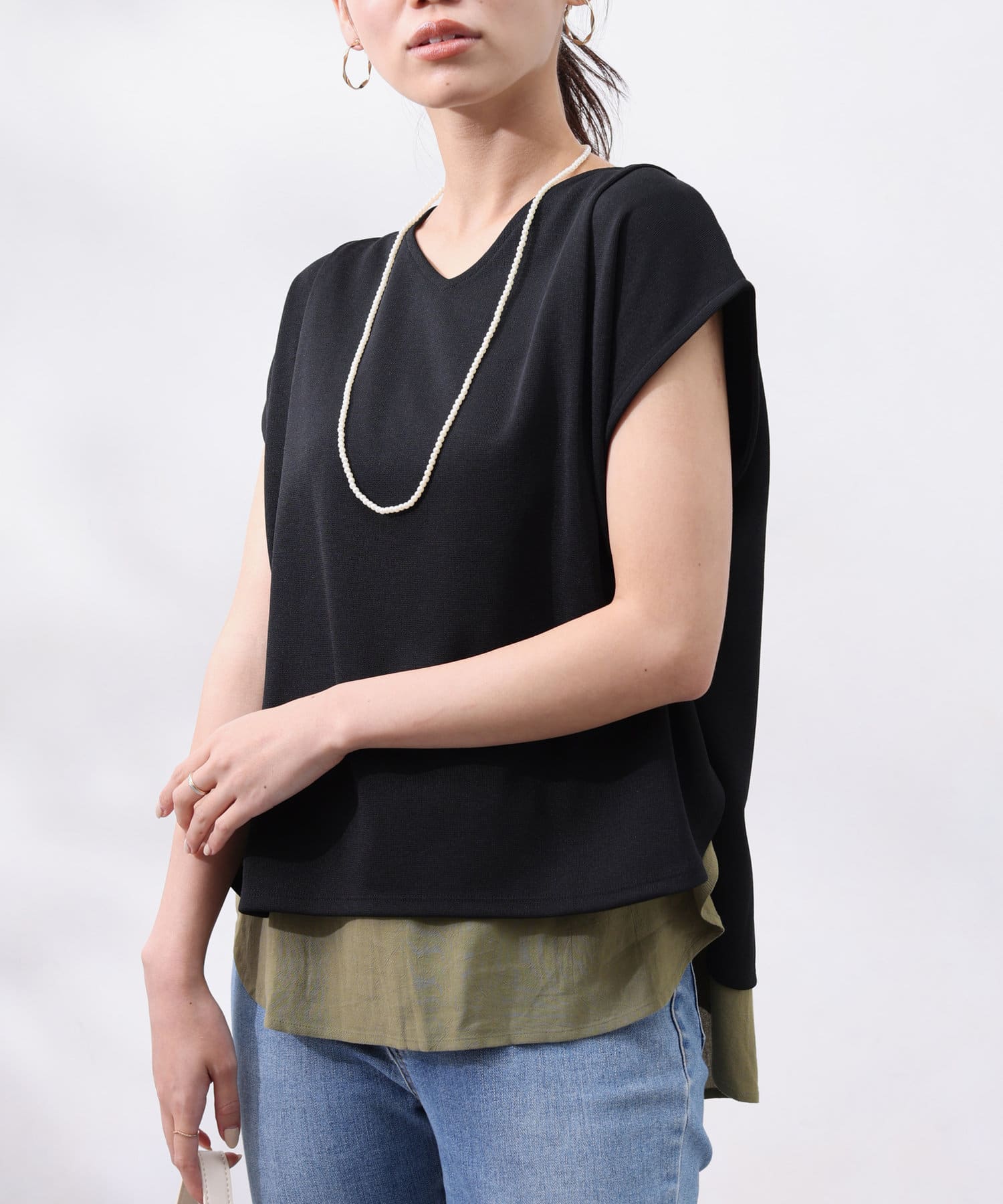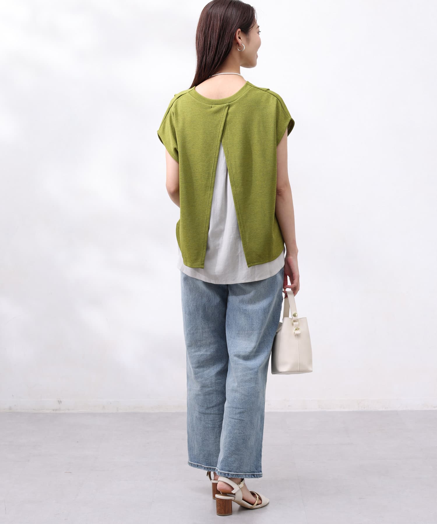後身頃のスリットから別布が見えるデザインで、1枚で簡単にレイヤードコーデが叶うお洒落トップスです。