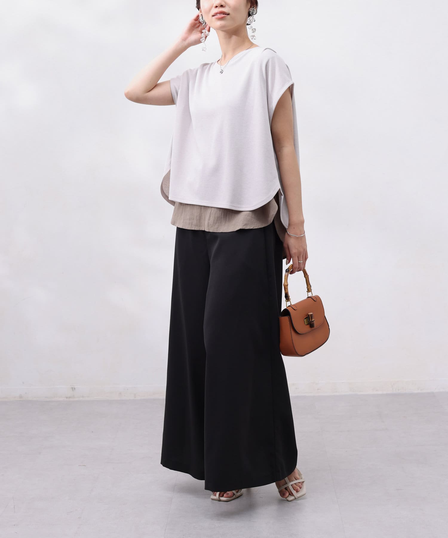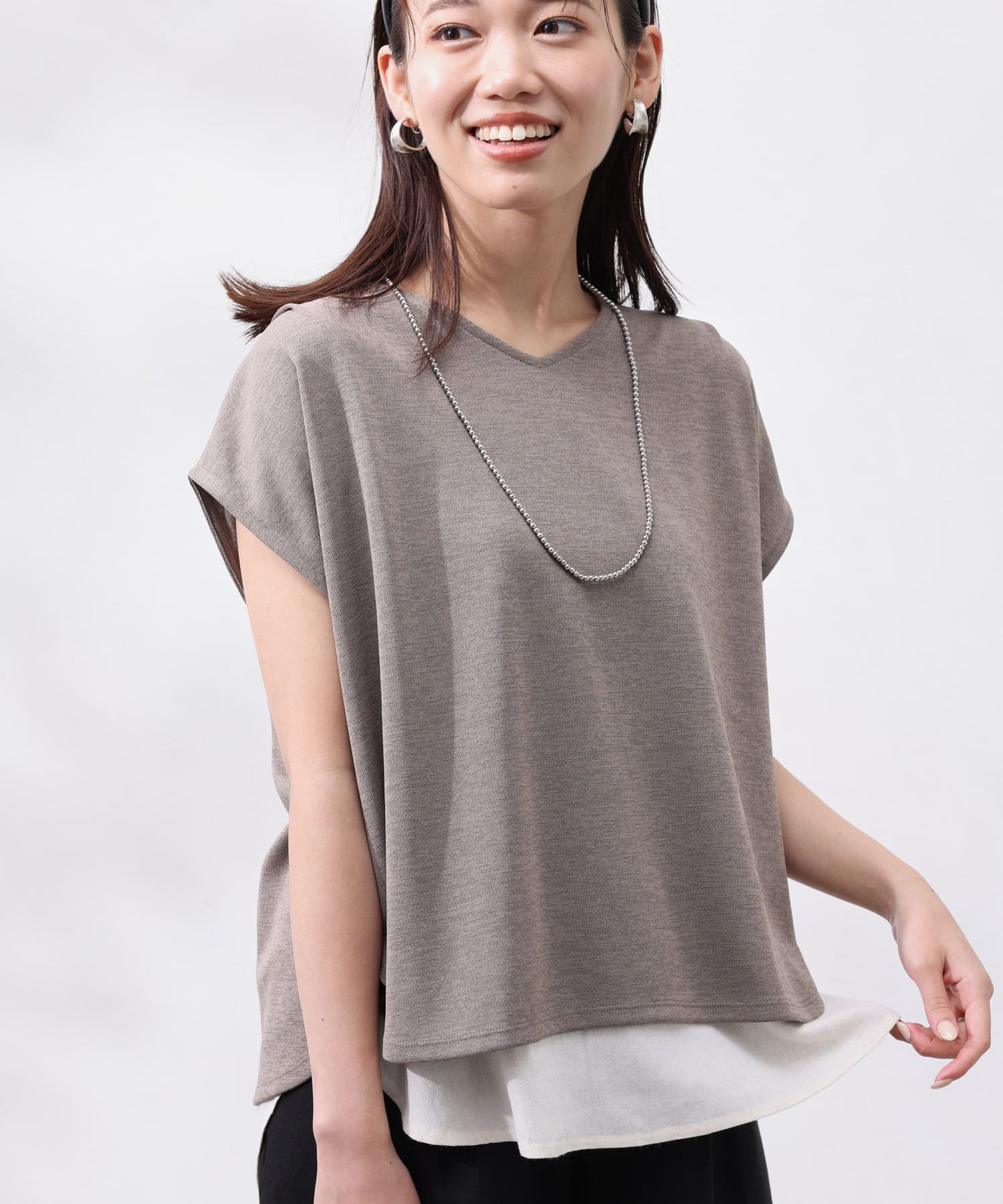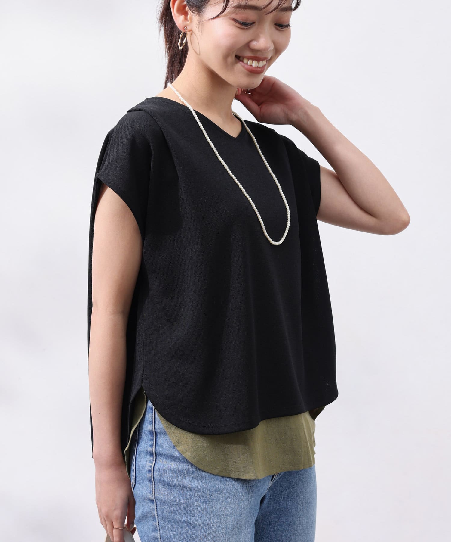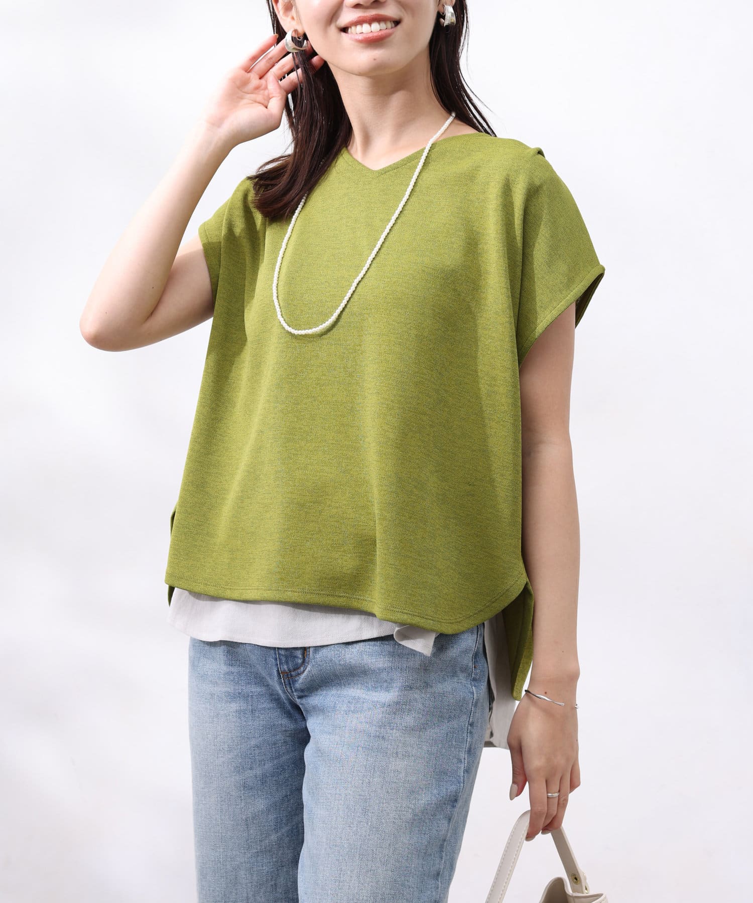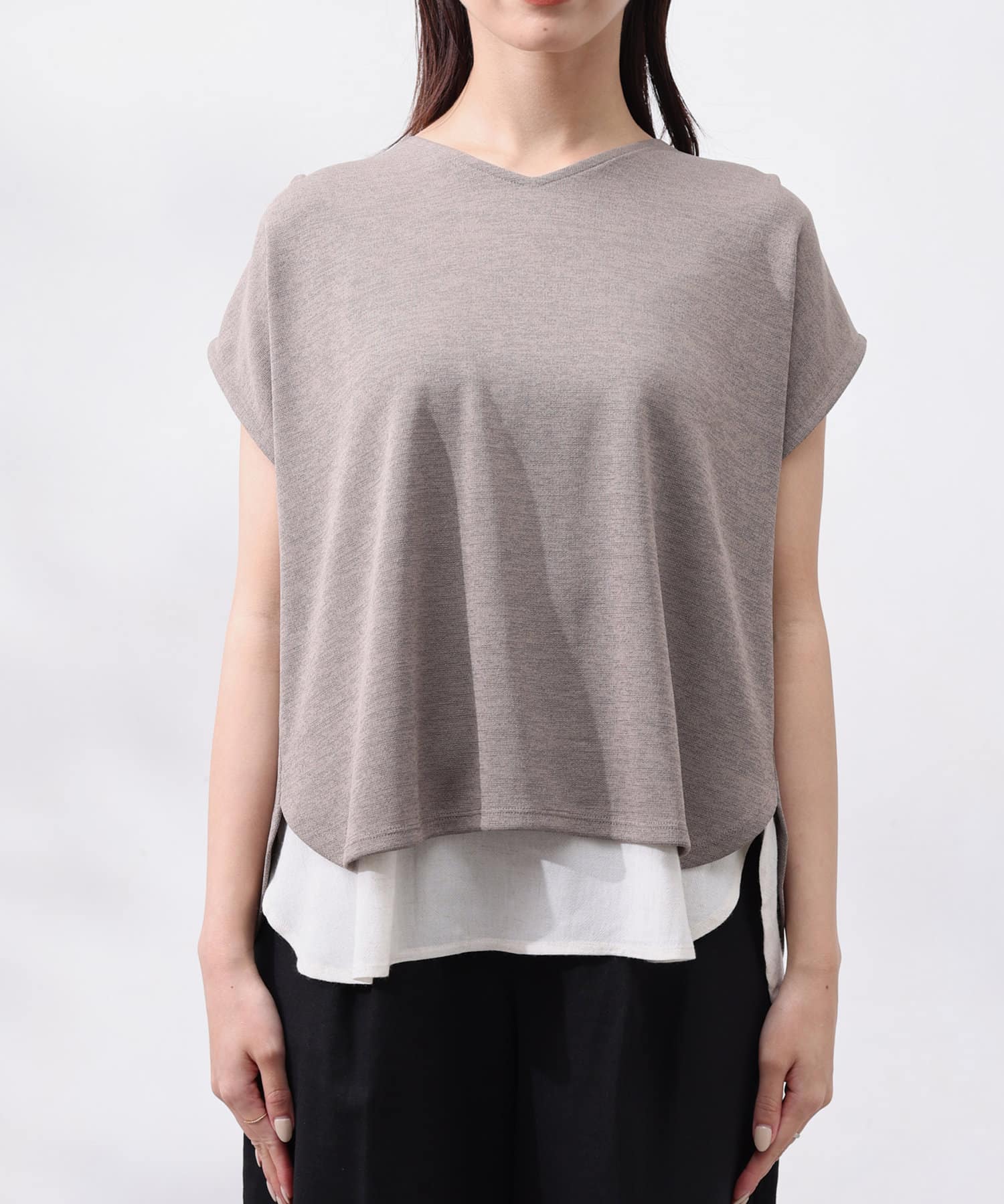 後身頃のスリットから別布が見えるデザインで、1枚で簡単にレイヤードコーデが叶うお洒落トップスです。