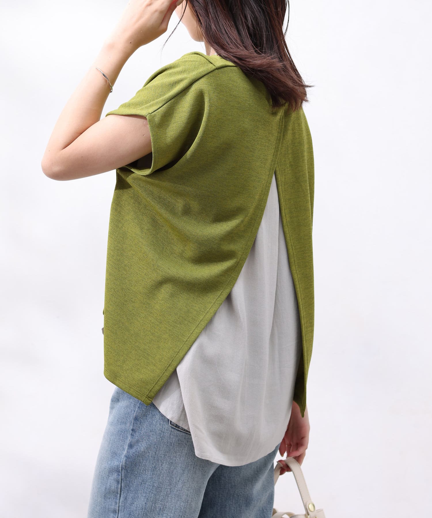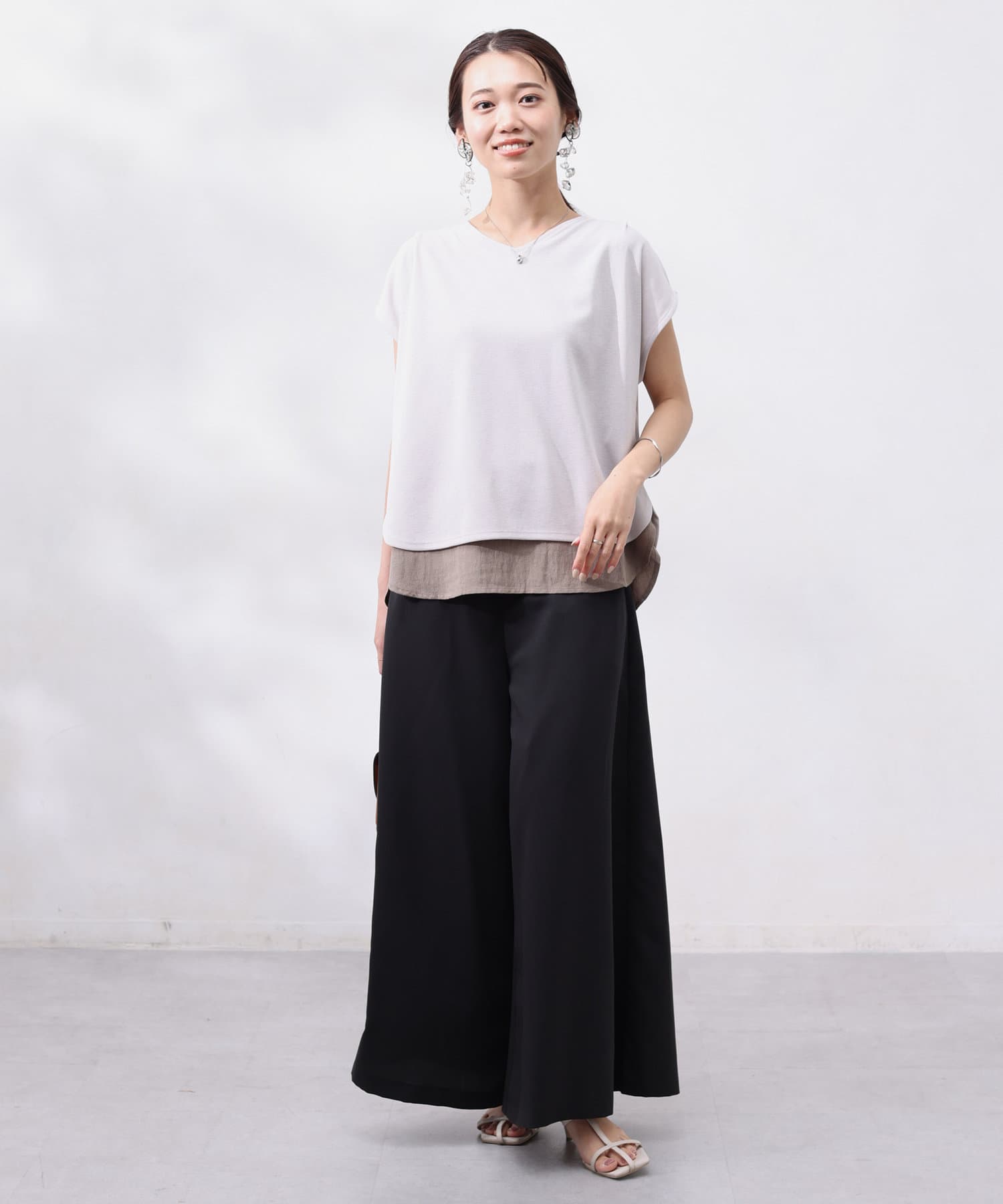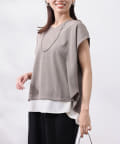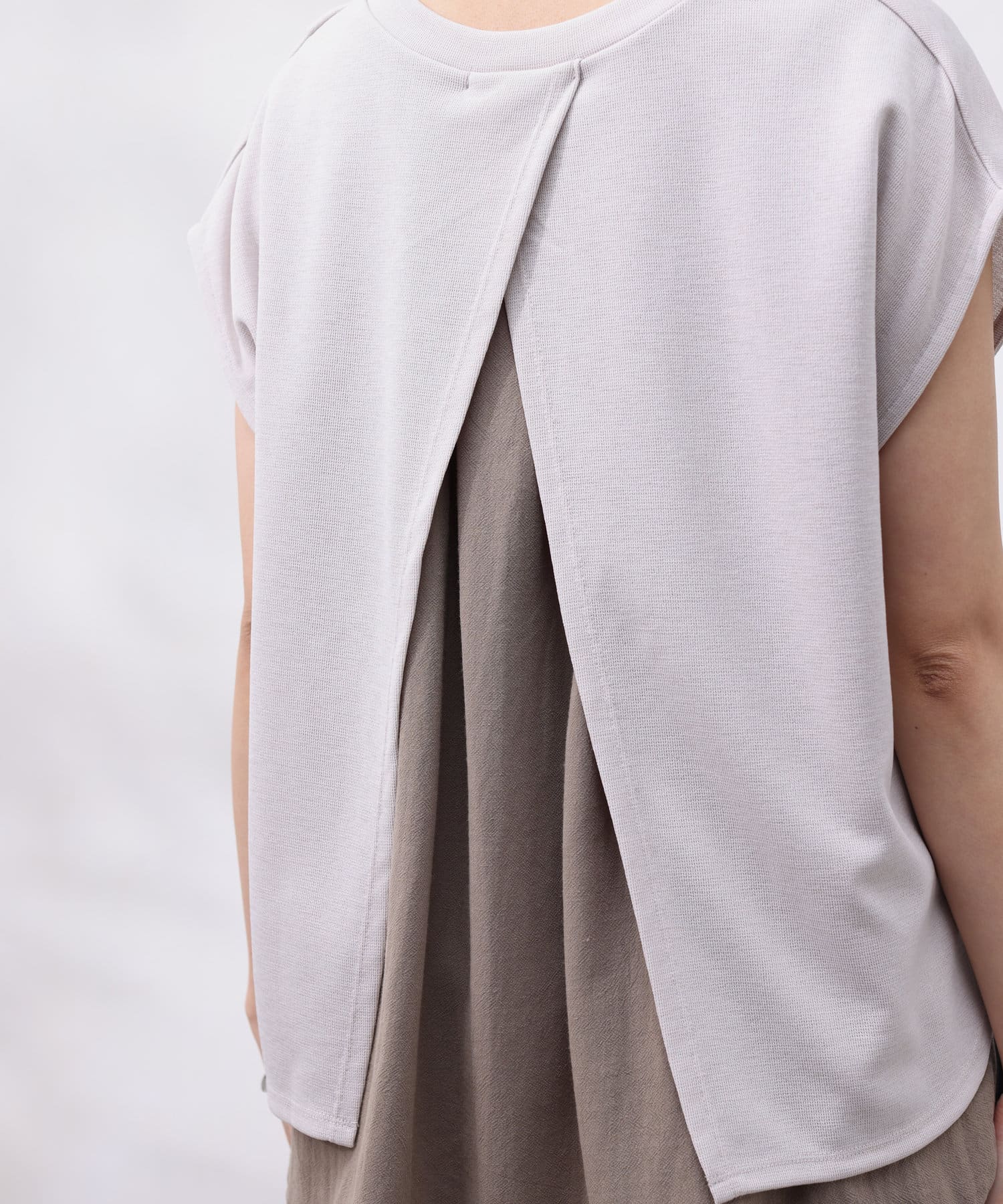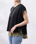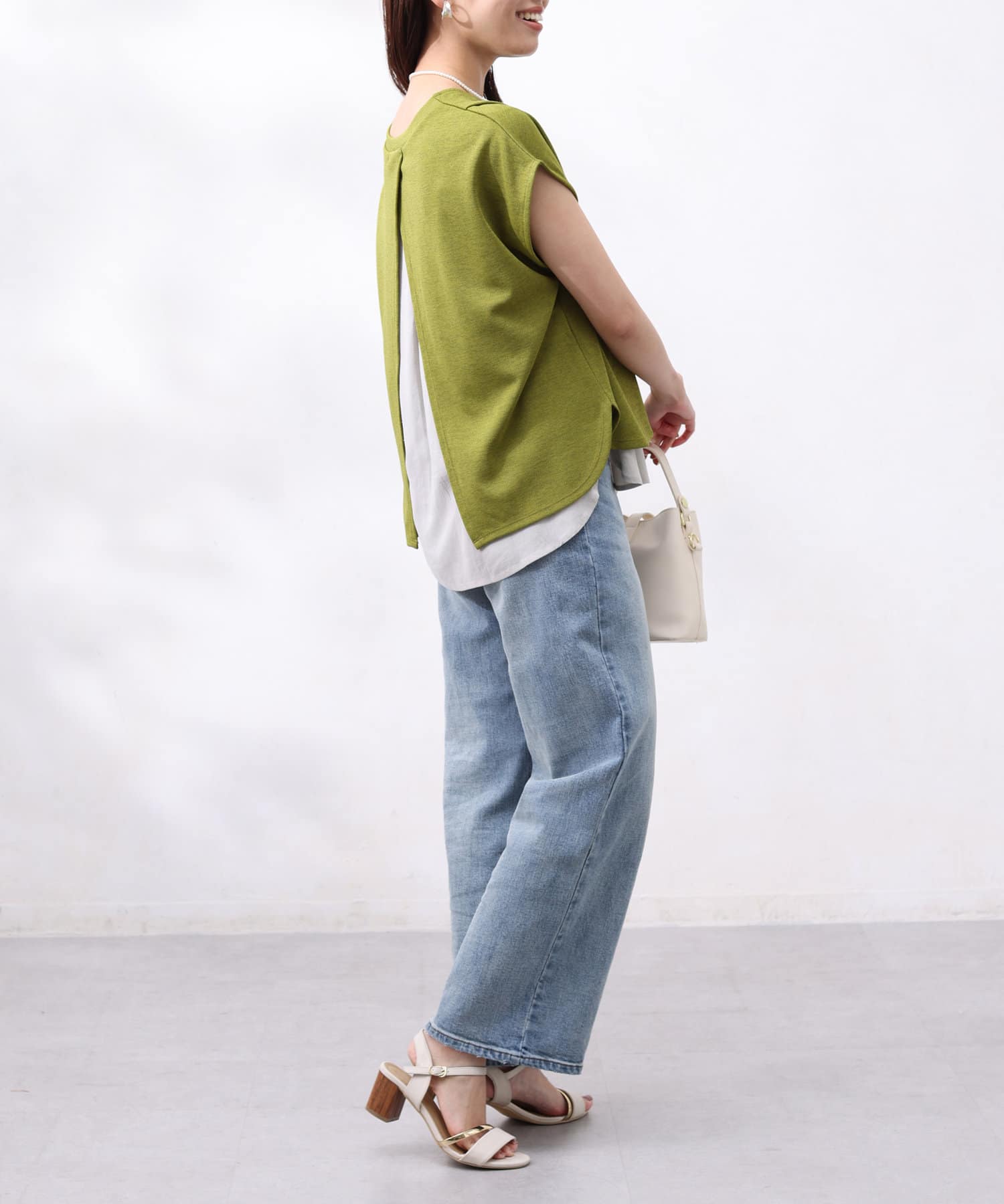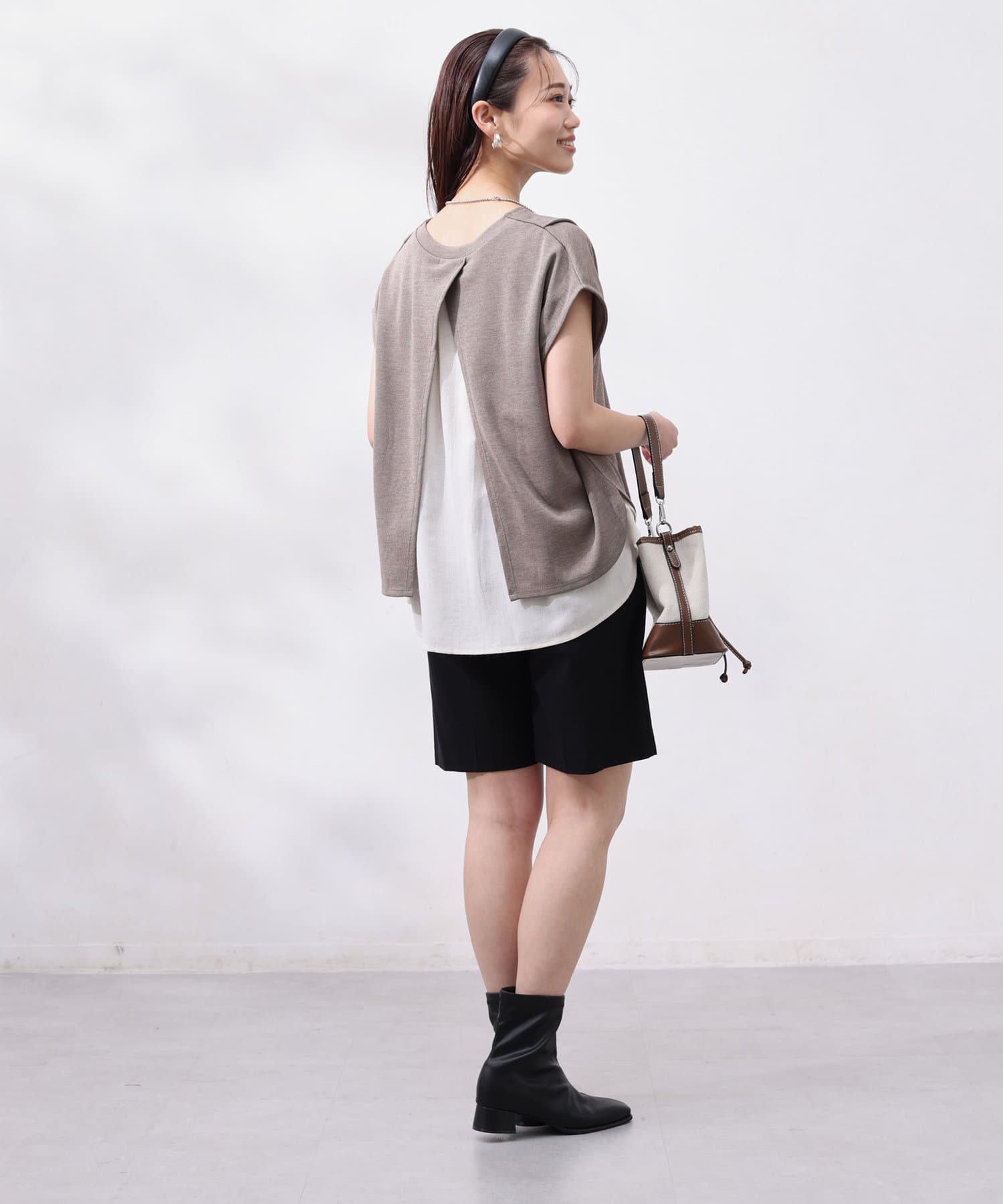 後身頃のスリットから別布が見えるデザインで、1枚で簡単にレイヤードコーデが叶うお洒落トップスです。