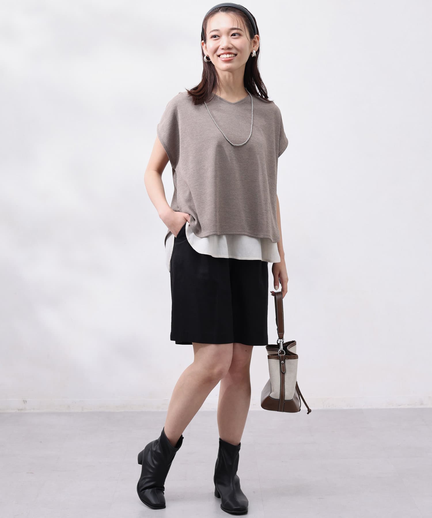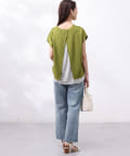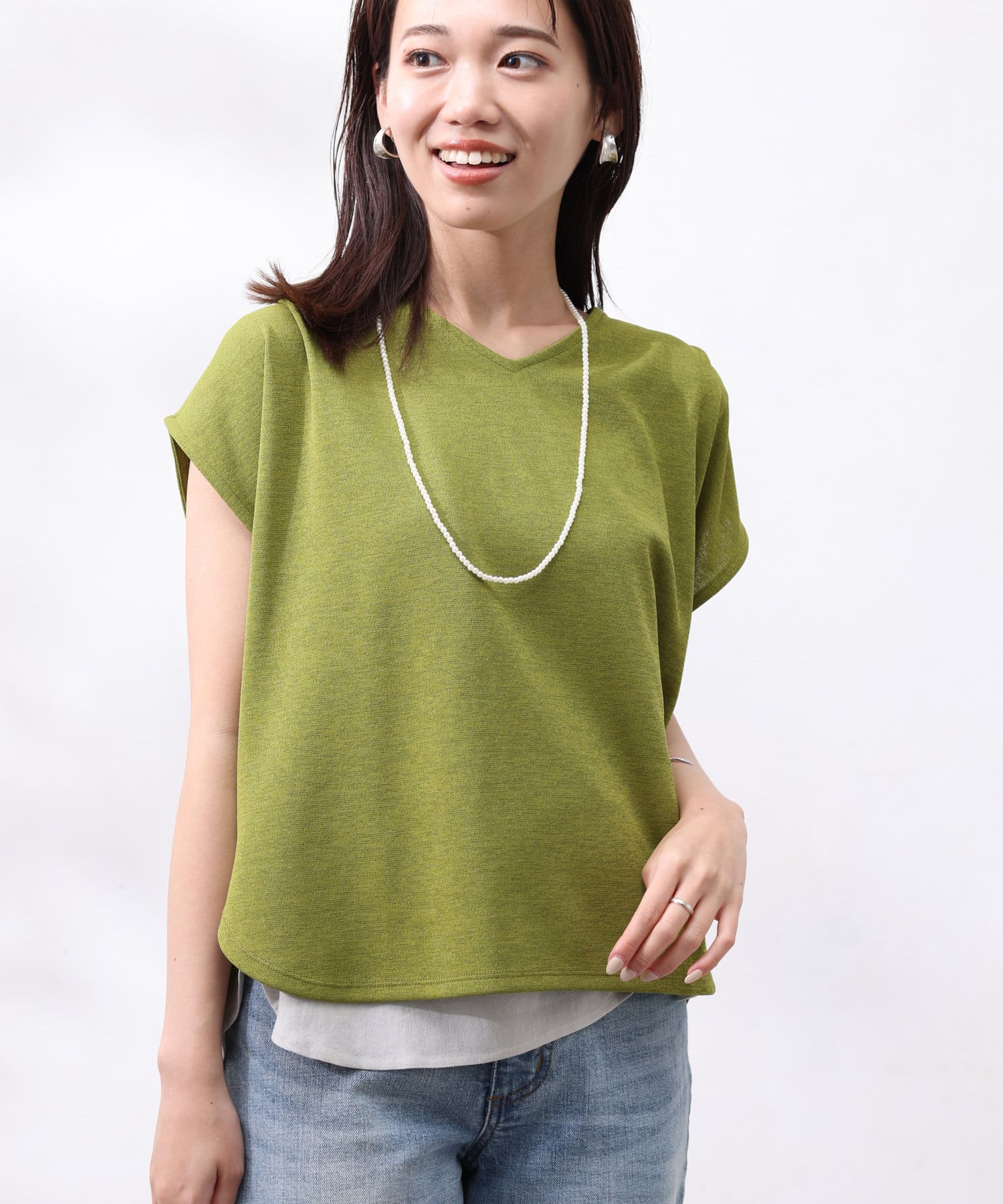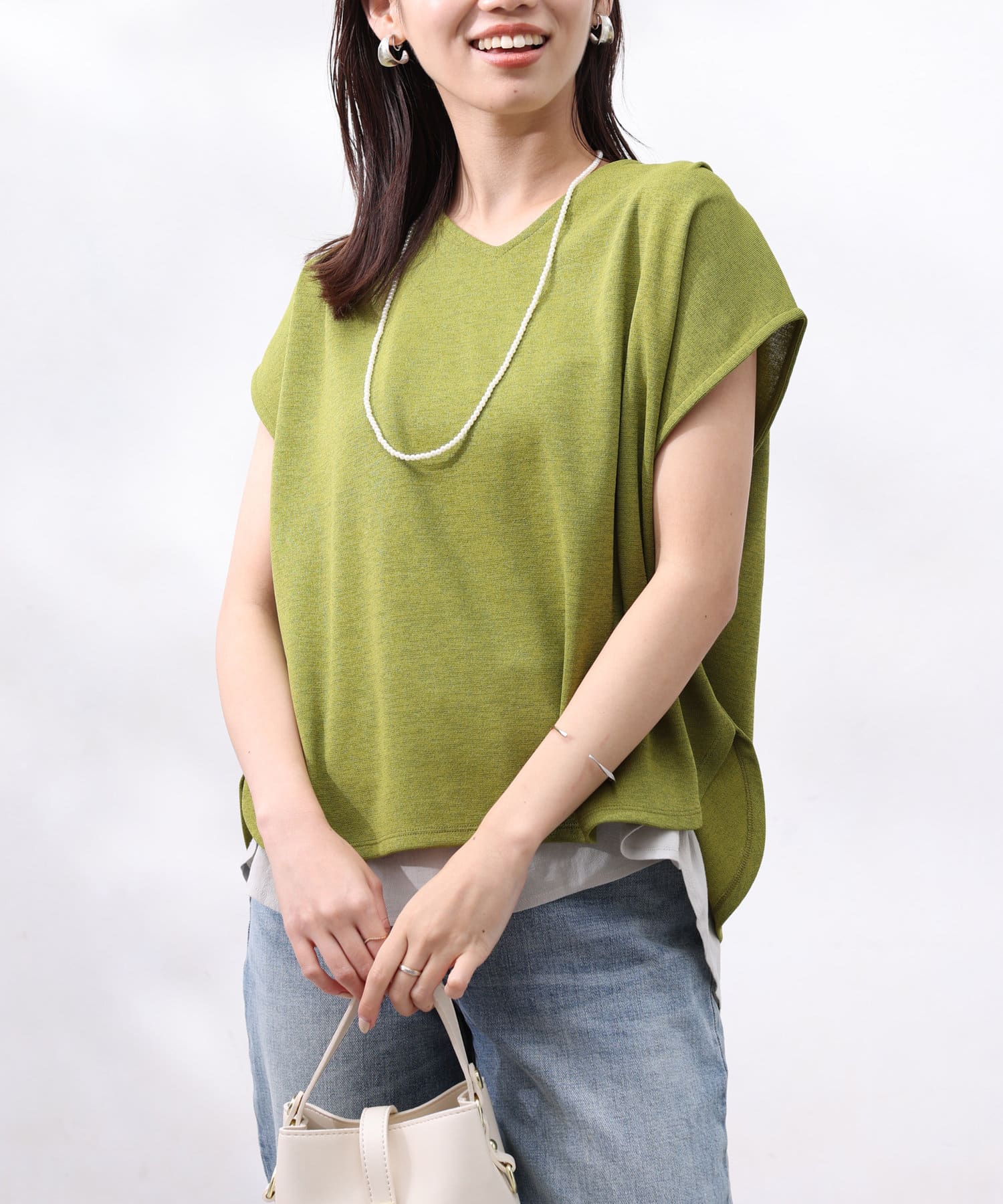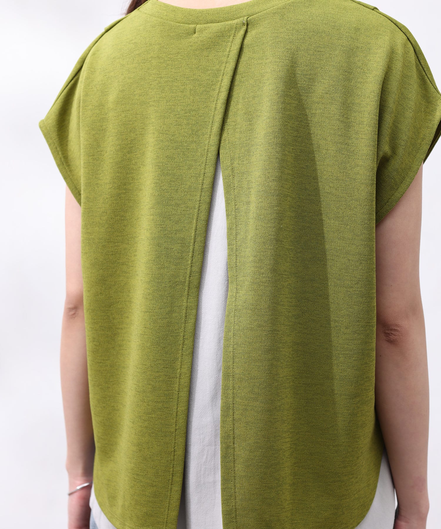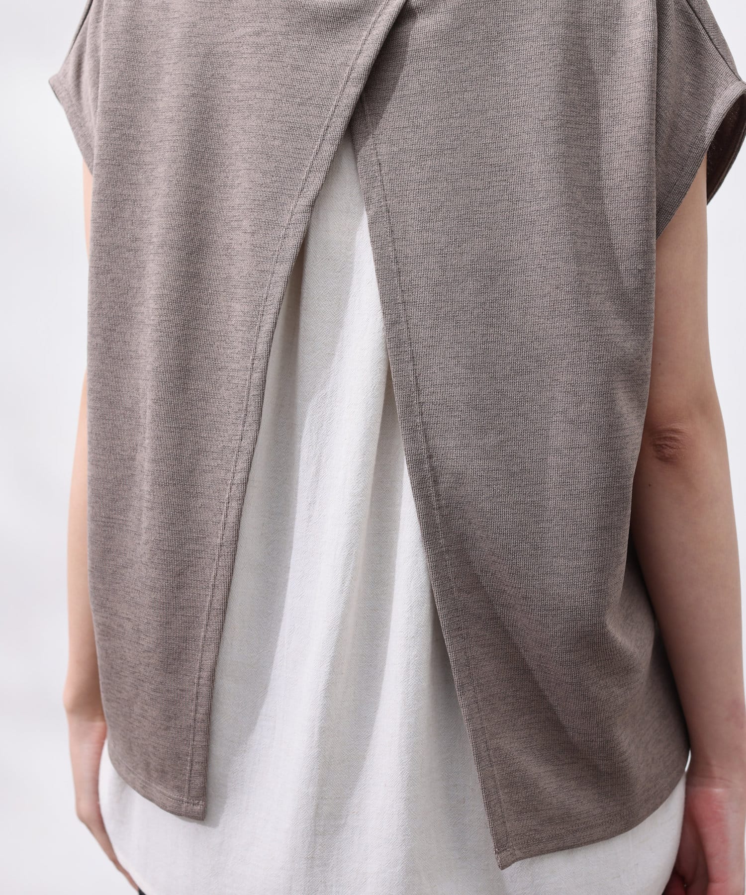 後身頃のスリットから別布が見えるデザインで、1枚で簡単にレイヤードコーデが叶うお洒落トップスです。