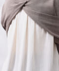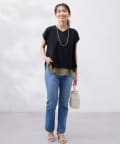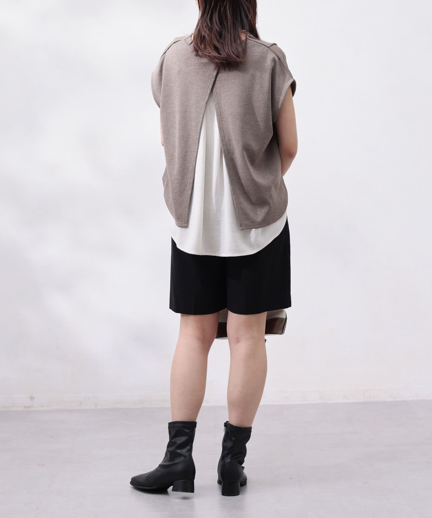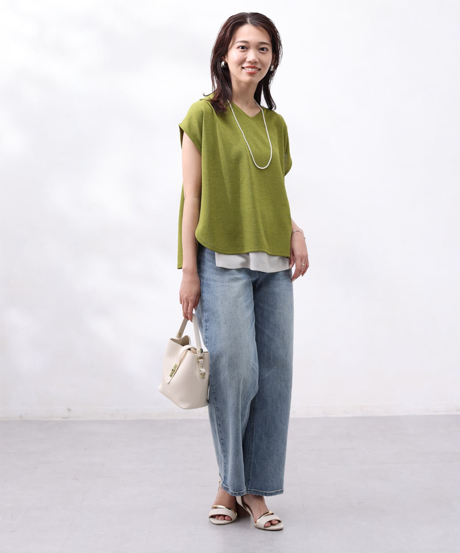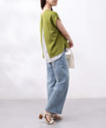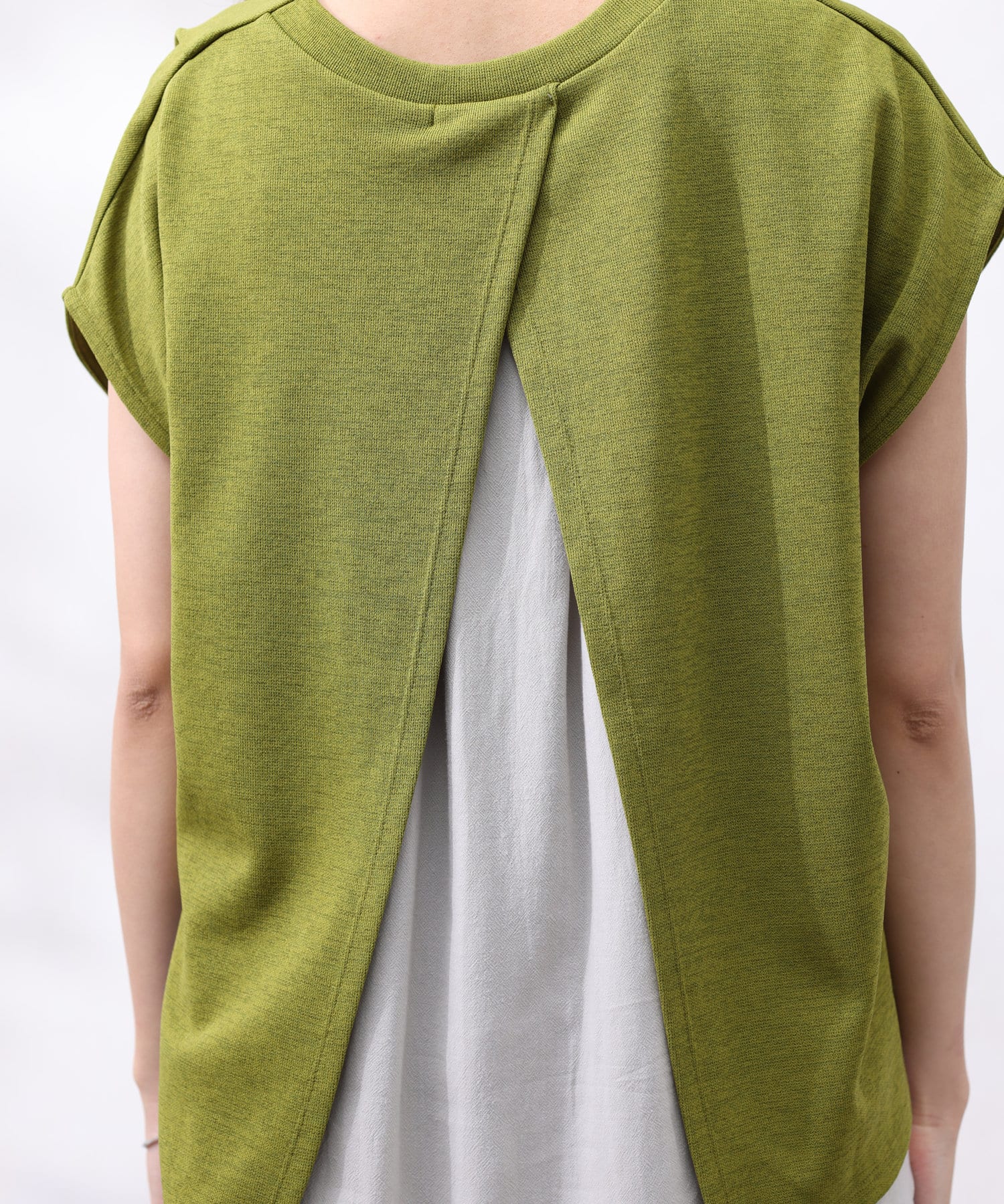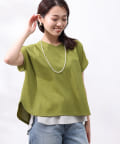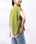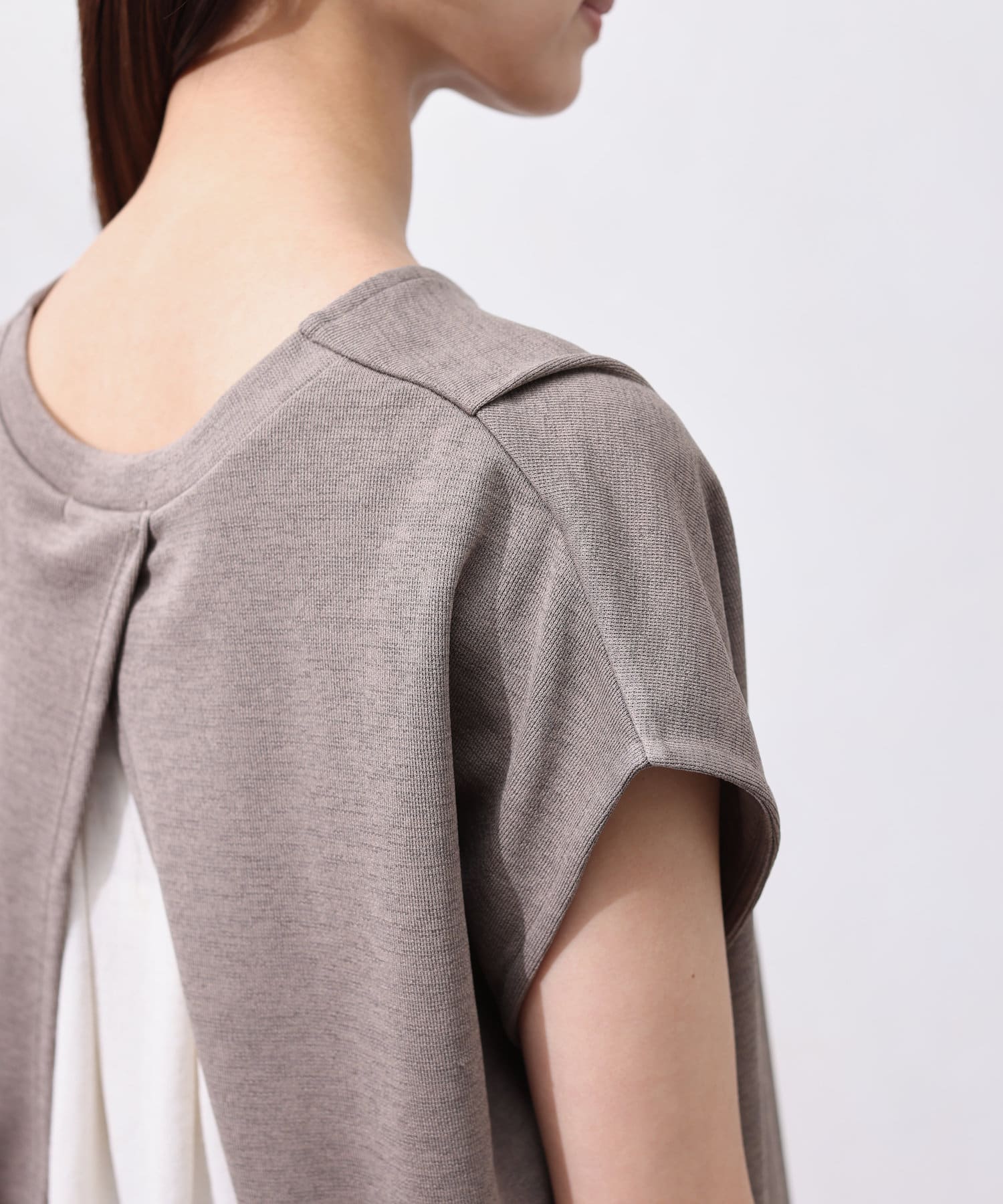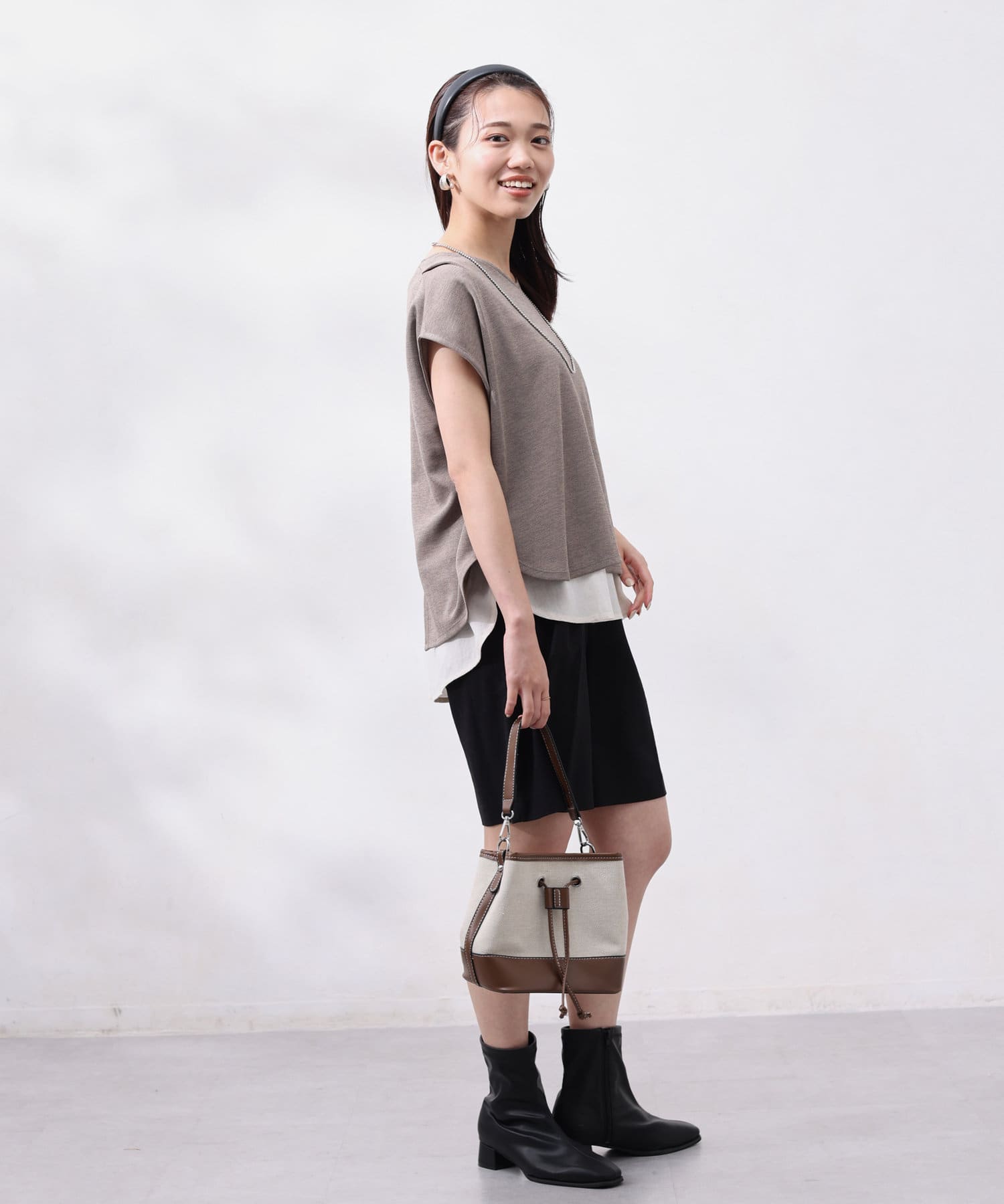 後身頃のスリットから別布が見えるデザインで、1枚で簡単にレイヤードコーデが叶うお洒落トップスです。