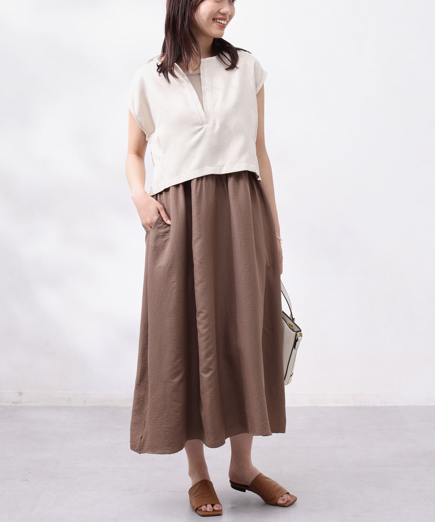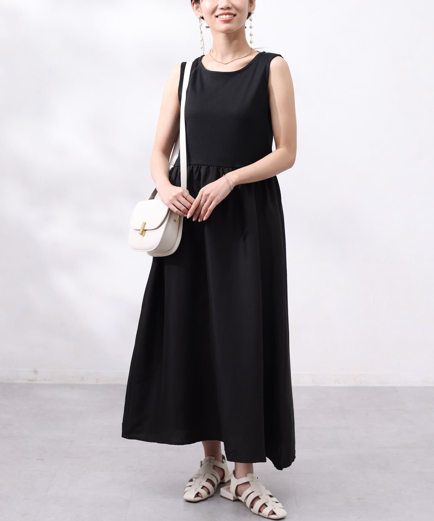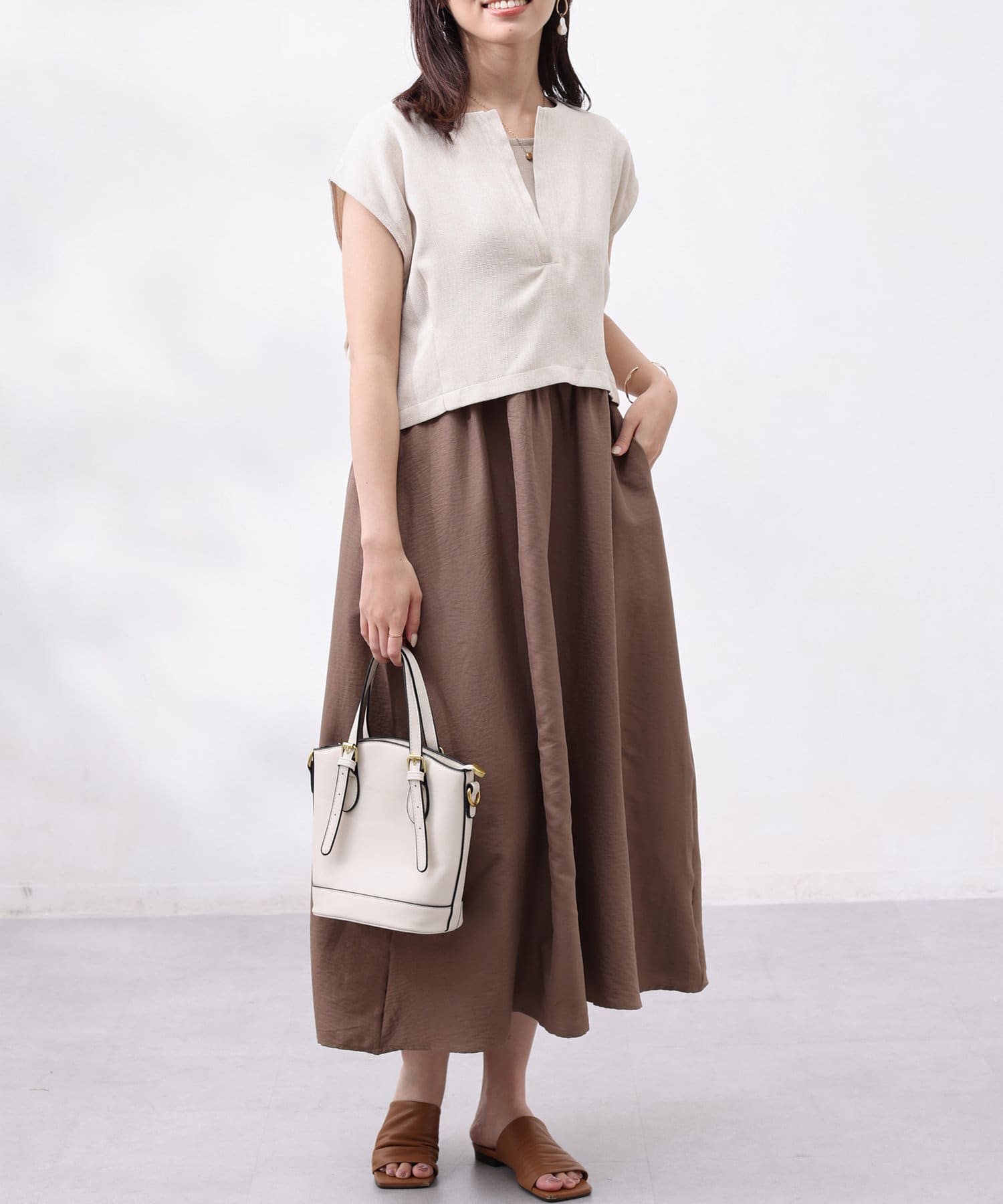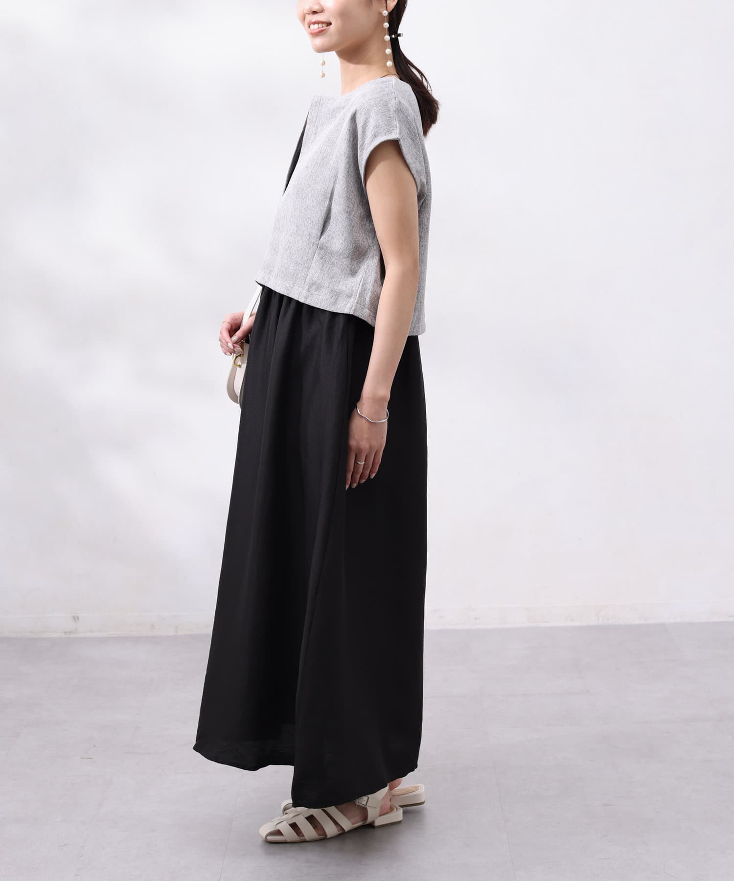 ワンピースは上部がリブの切替になっており、インナー感の出ない大人カジュアルなデザイン。