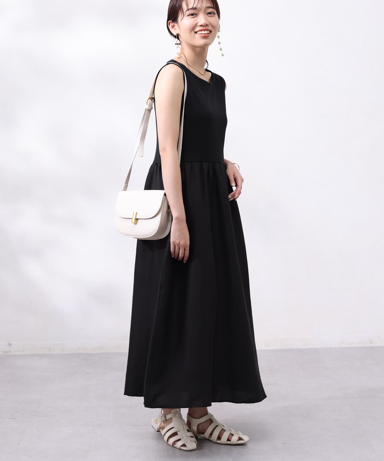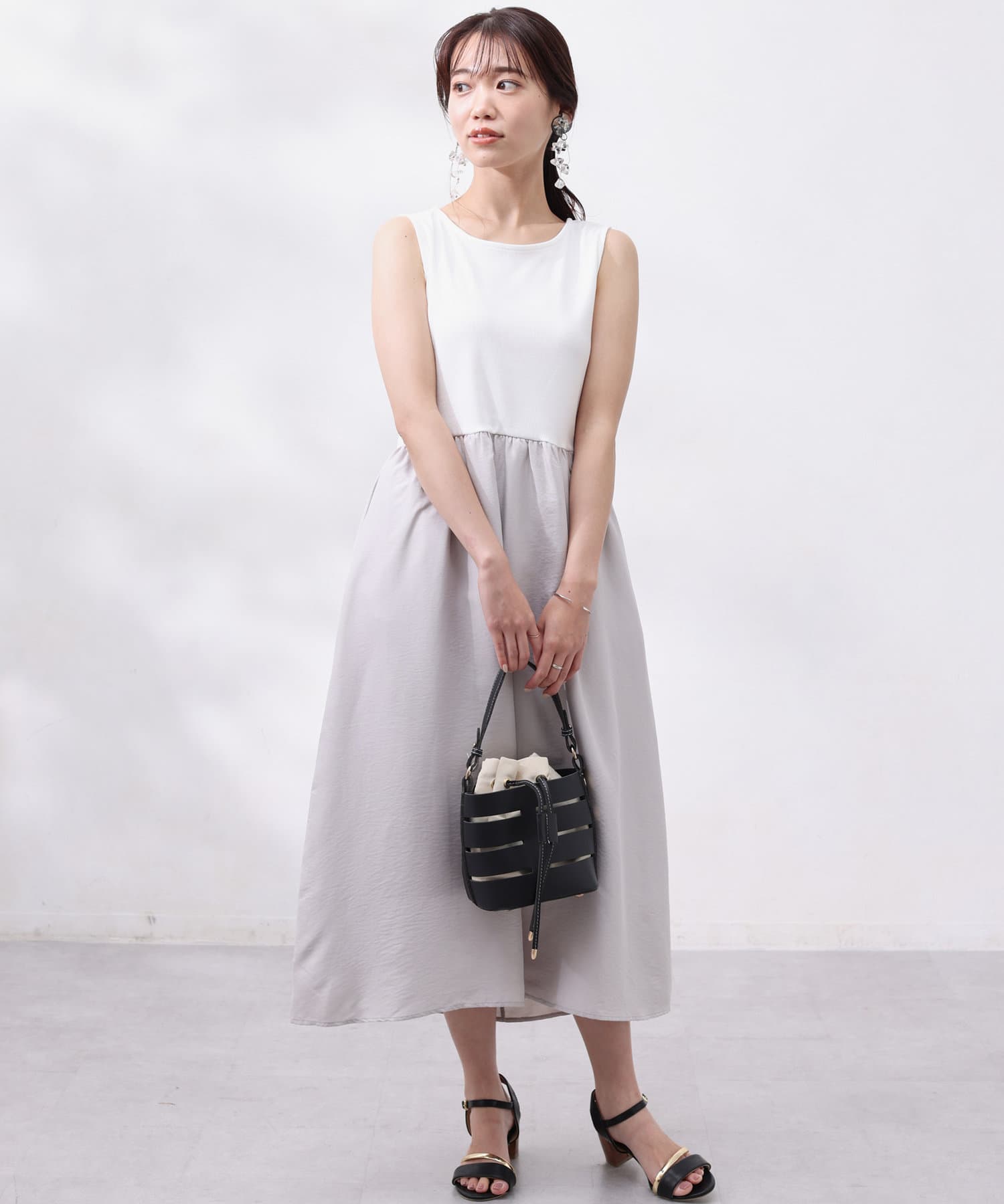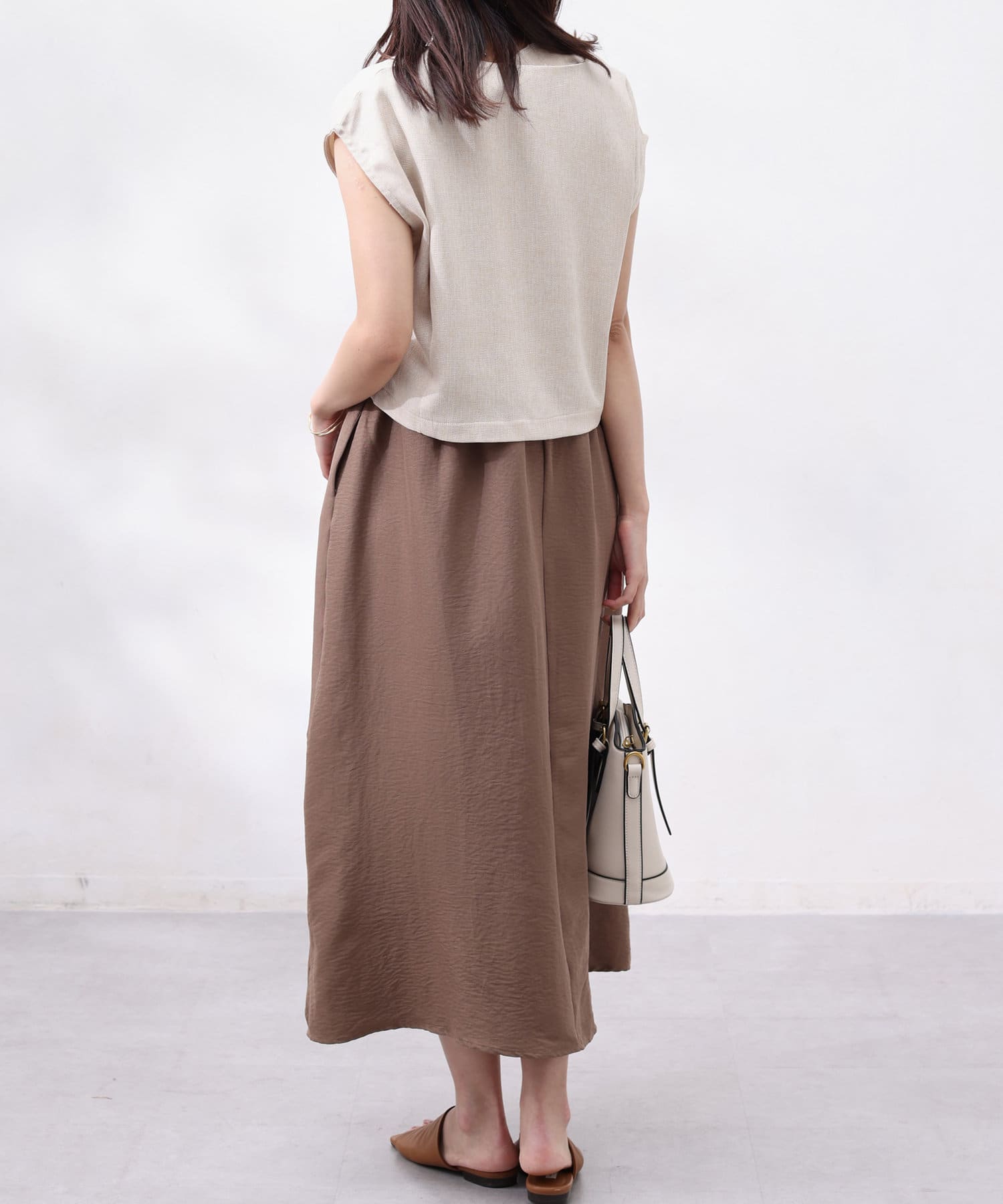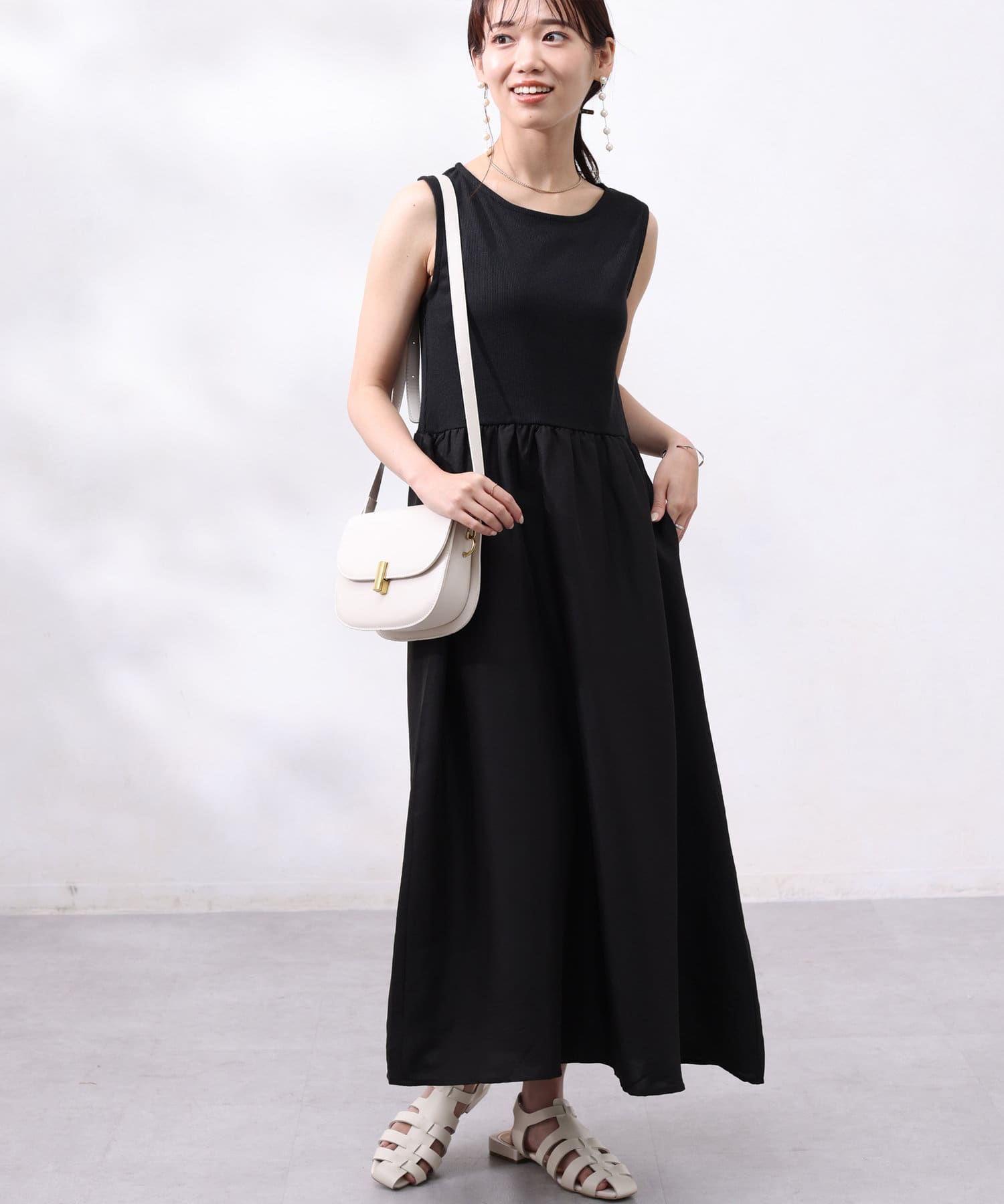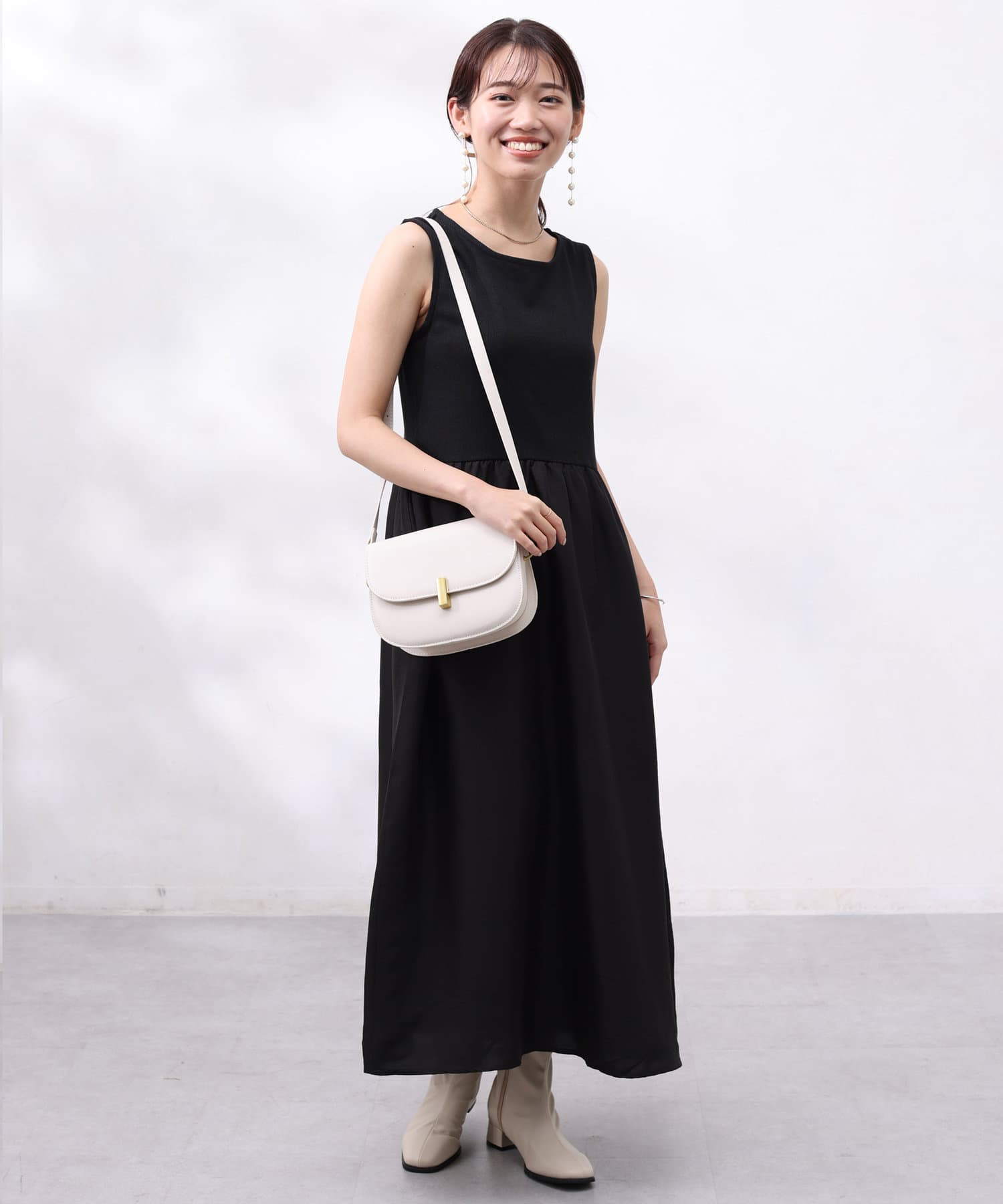 ワンピースは上部がリブの切替になっており、インナー感の出ない大人カジュアルなデザイン。