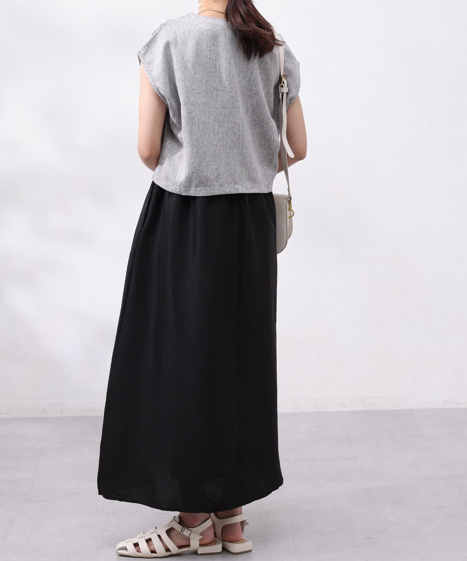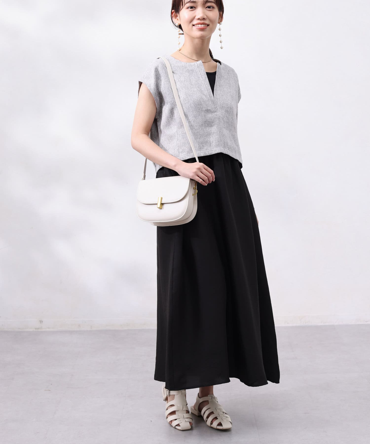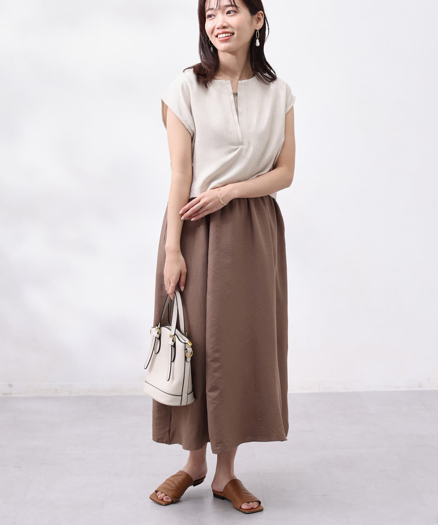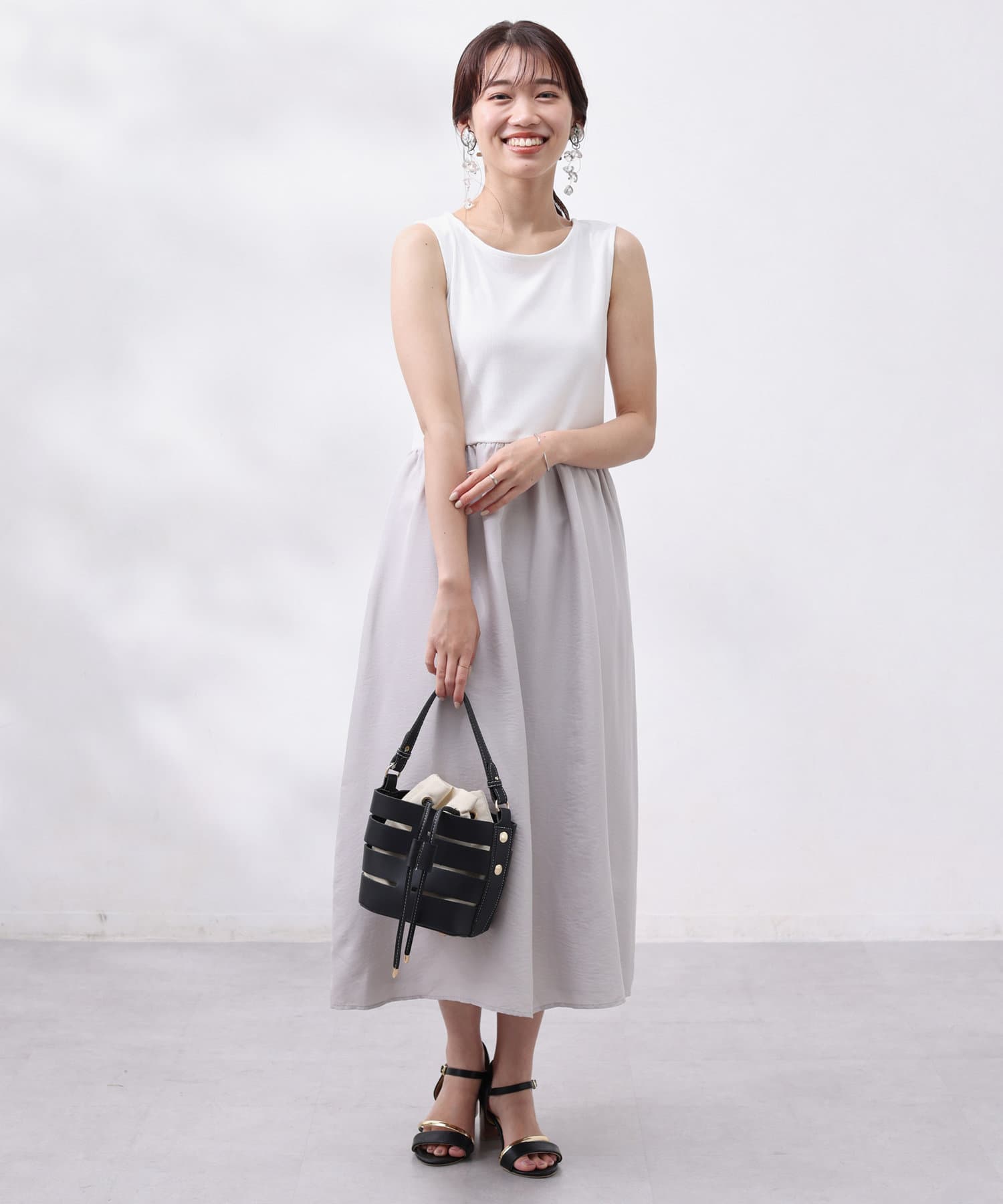 ワンピースは上部がリブの切替になっており、インナー感の出ない大人カジュアルなデザイン。