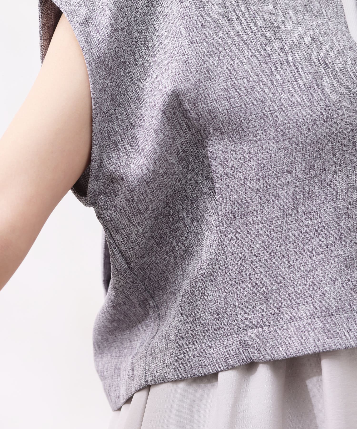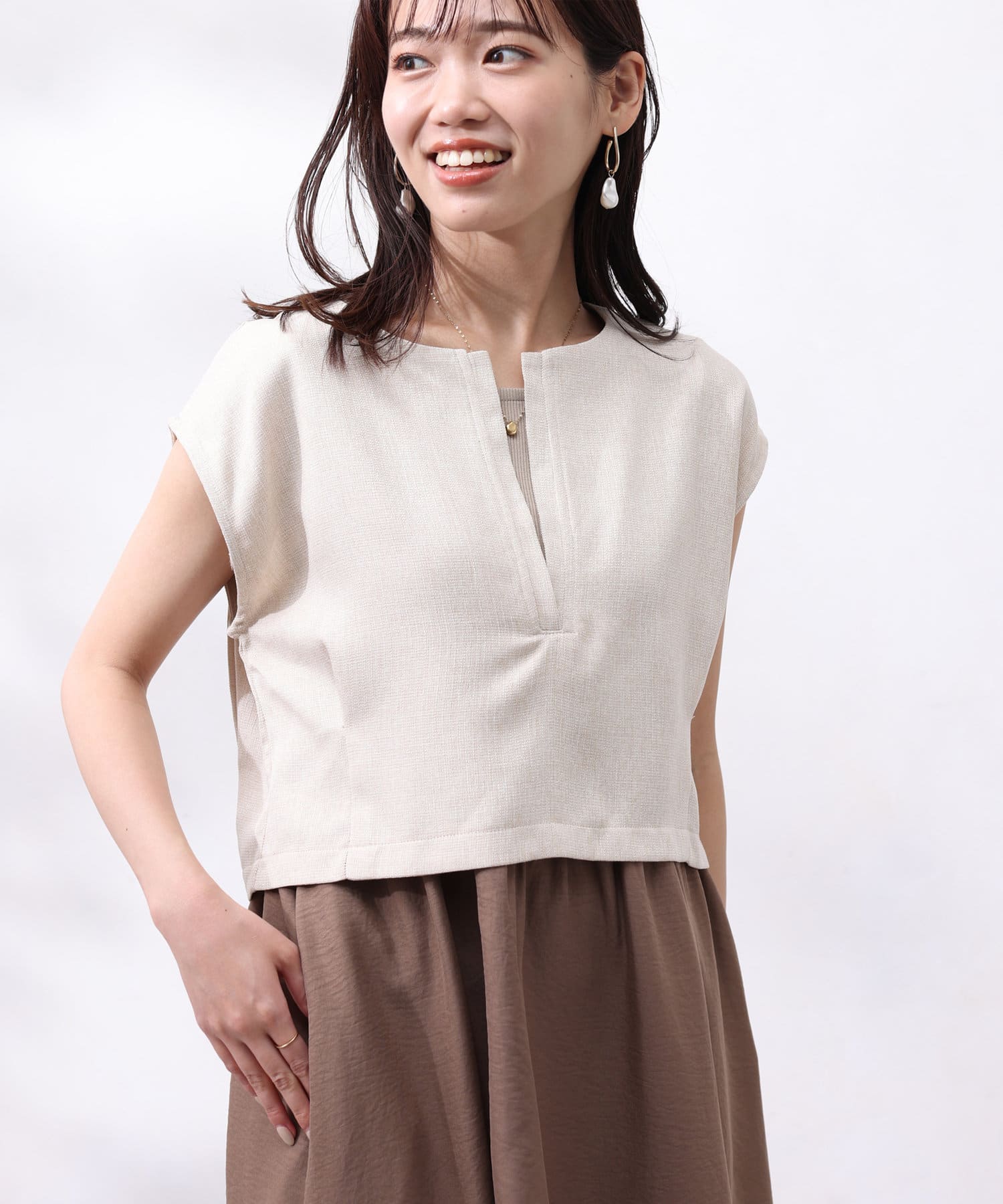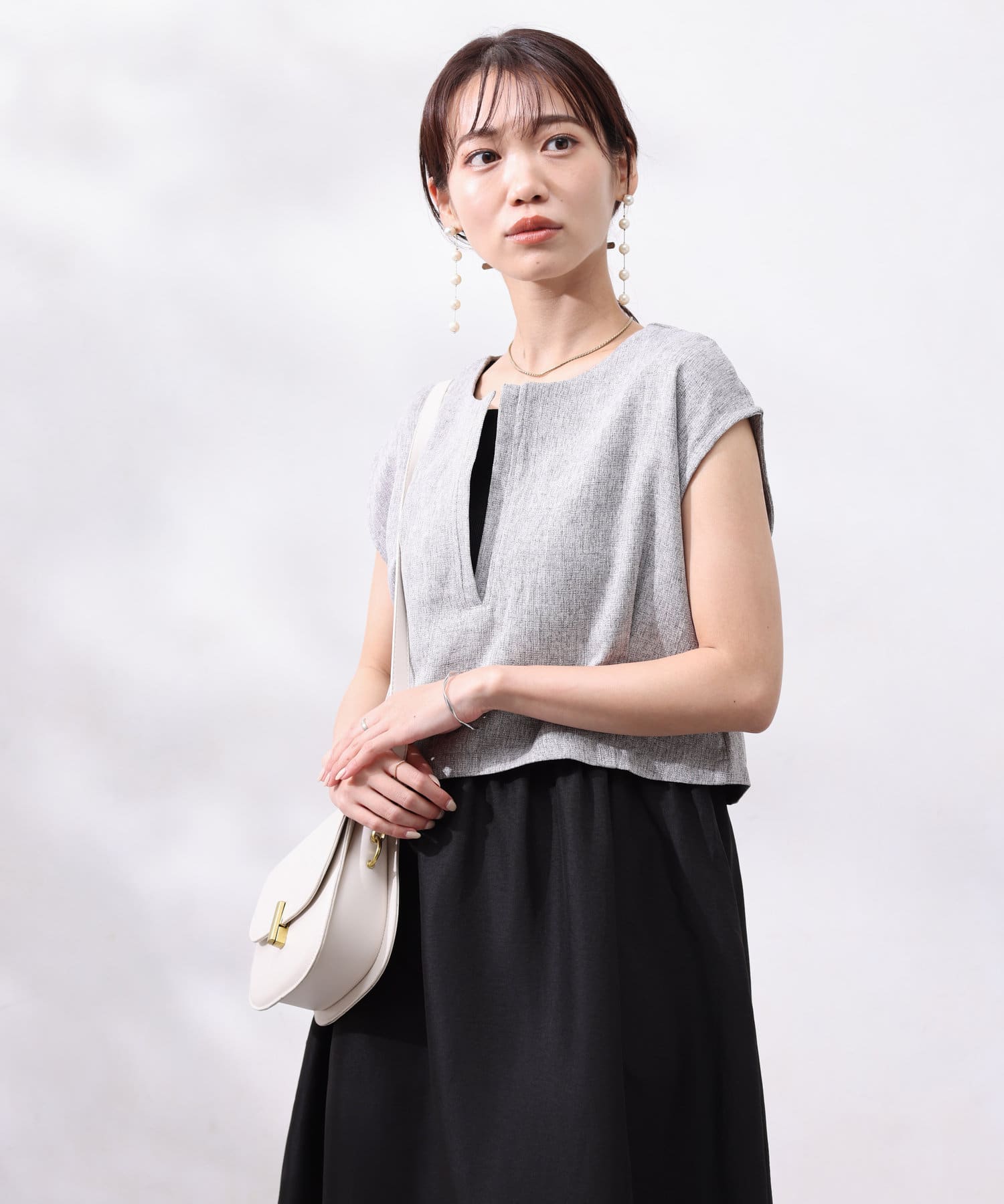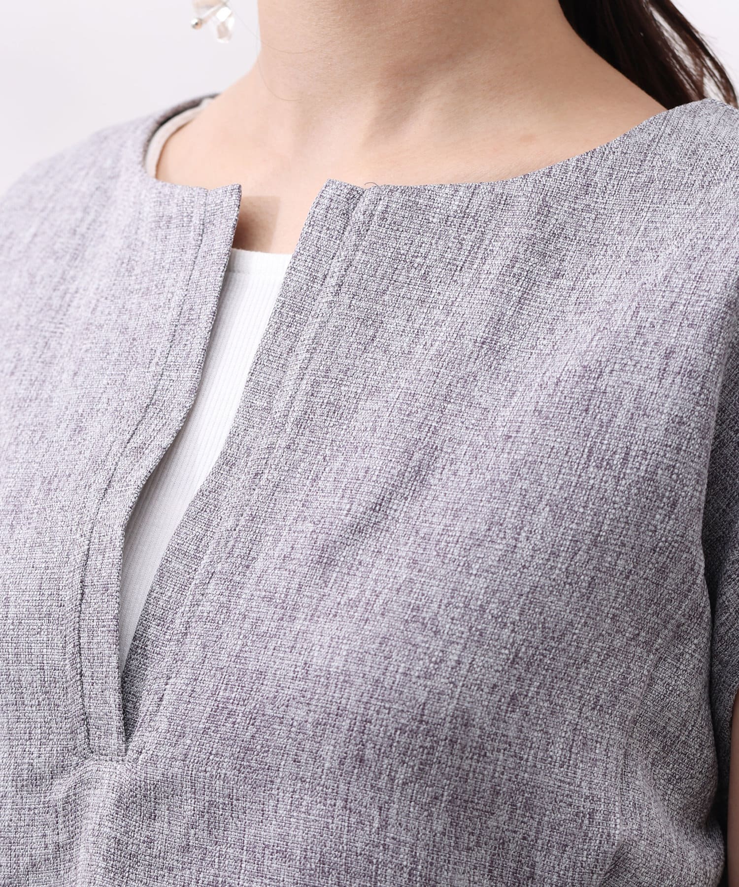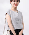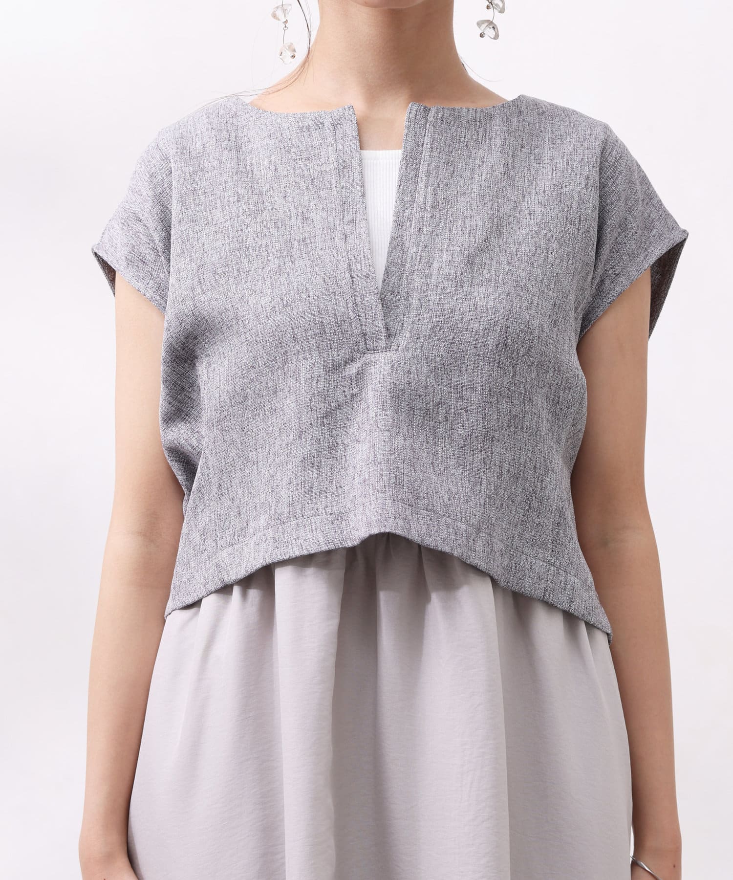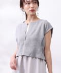 ツイードプルオーバーは短丈にスリットネック、フレンチスリーブとスタイルアップ要素満点!