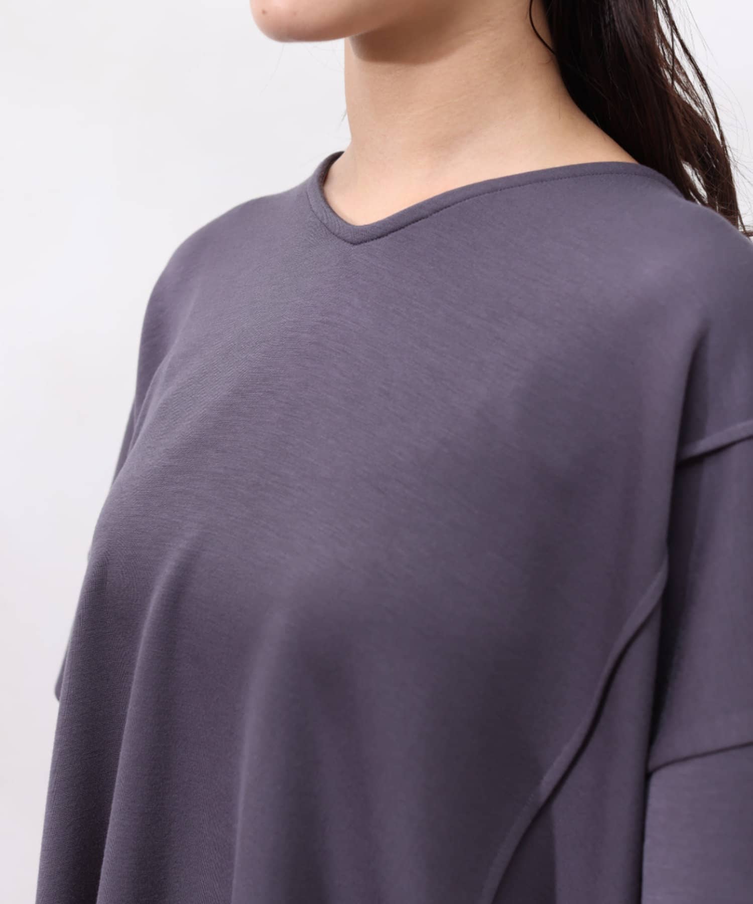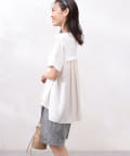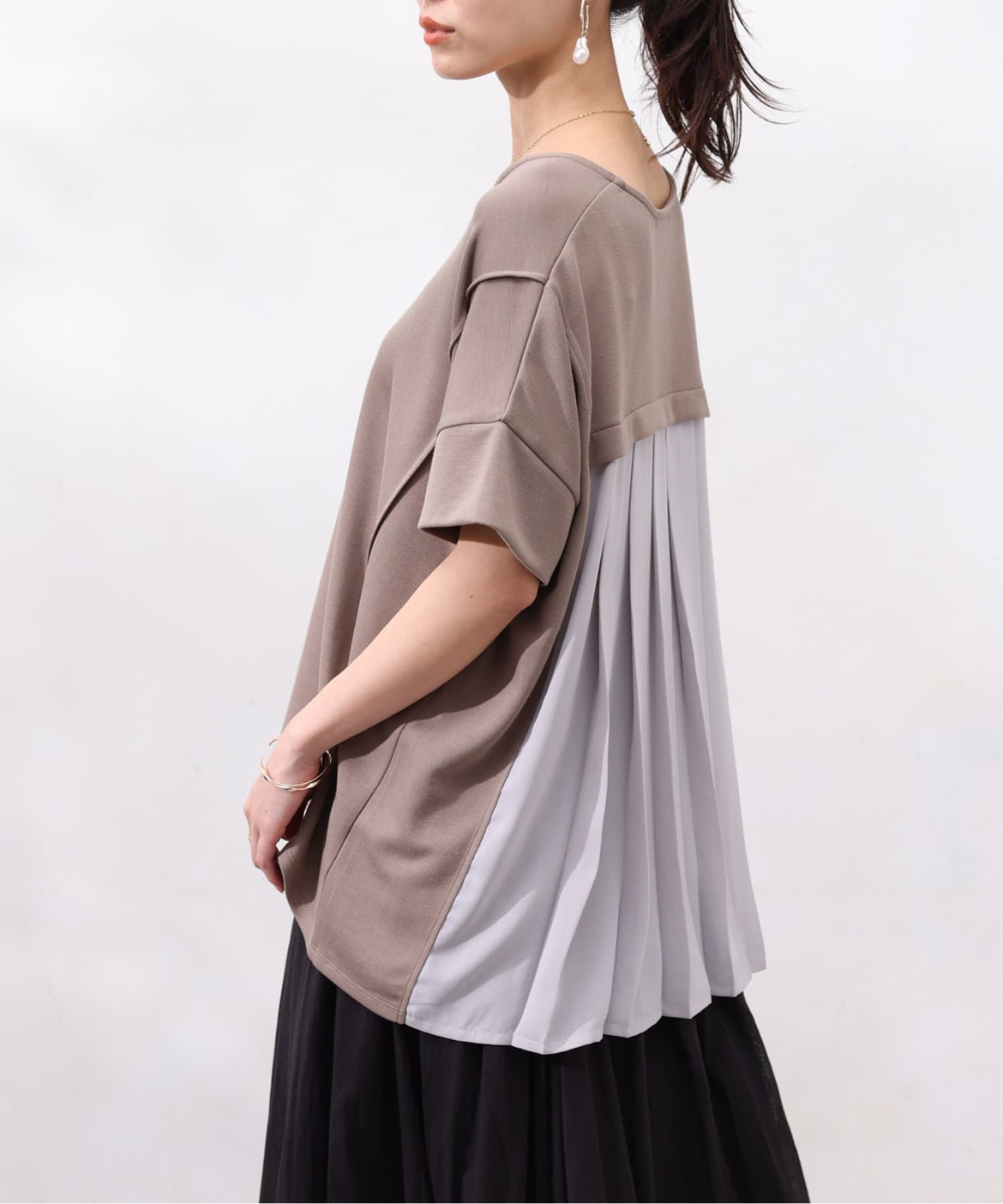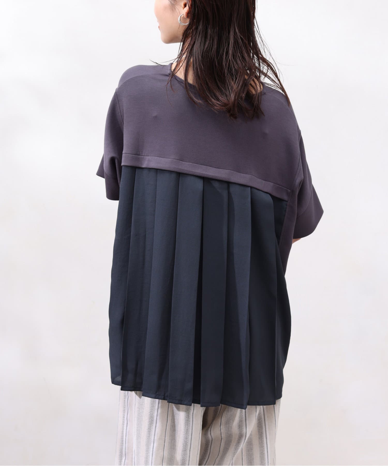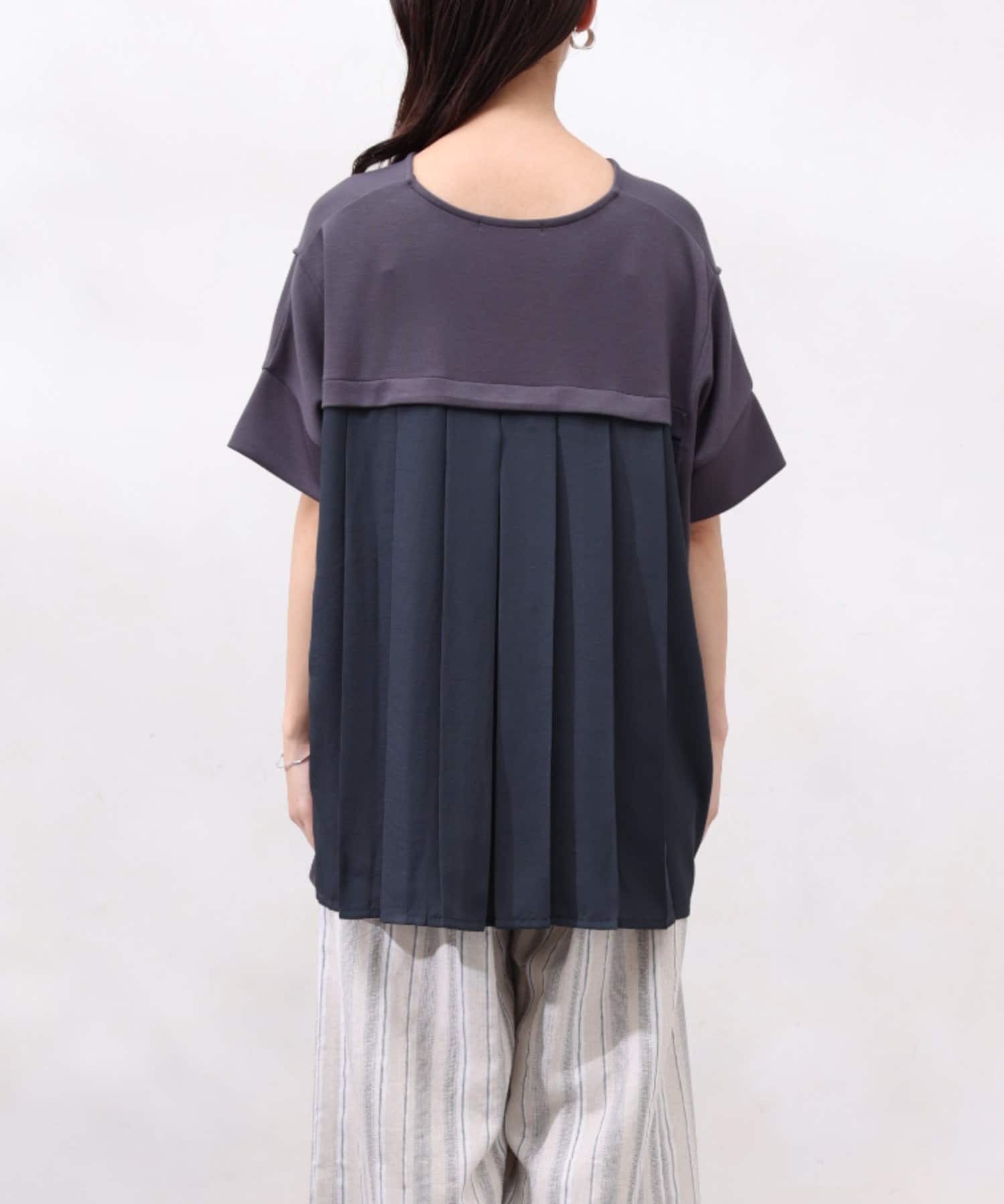 後身頃は布帛生地の切替でプリーツ仕様に。ゆったりとしたシルエットでも、衿ぐりをVネックにすることですっきりとした印象になるように仕上げました。