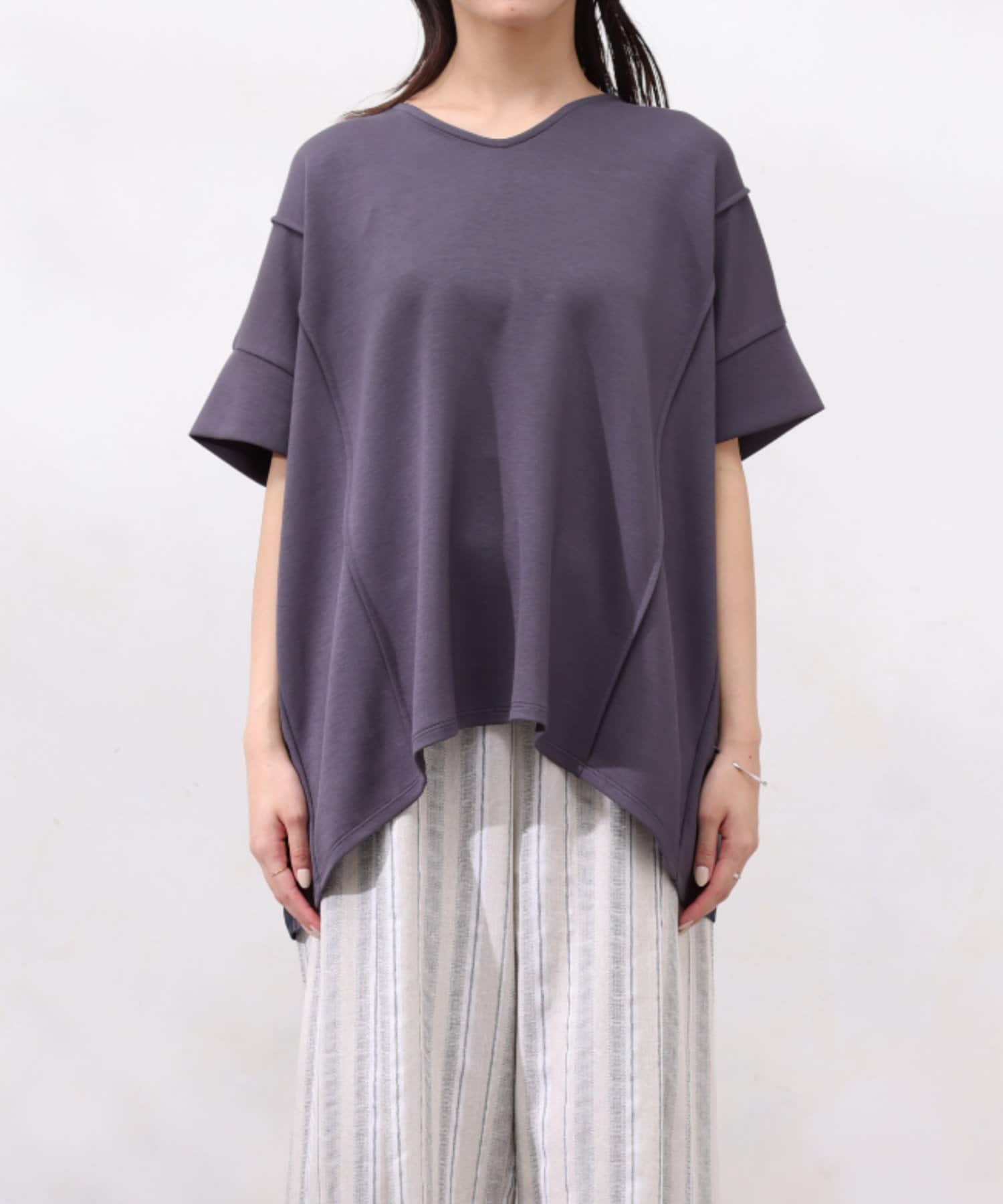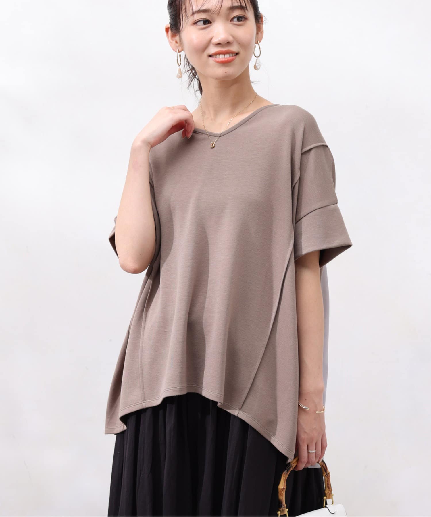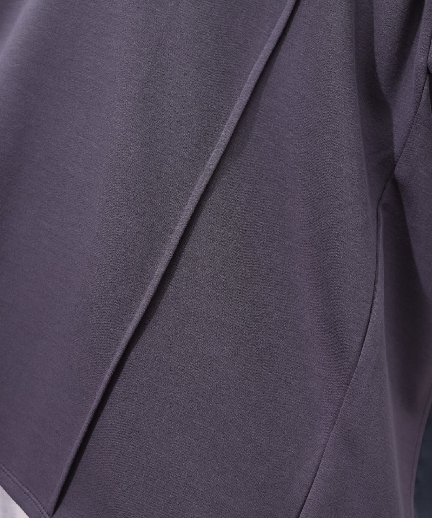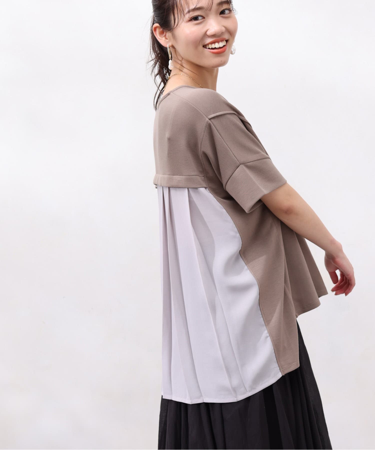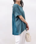 後身頃は布帛生地の切替でプリーツ仕様に。ゆったりとしたシルエットでも、衿ぐりをVネックにすることですっきりとした印象になるように仕上げました。