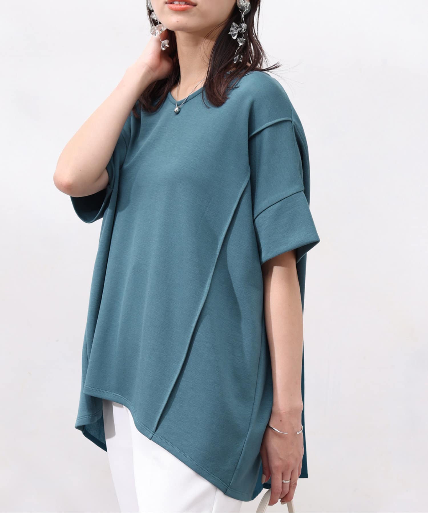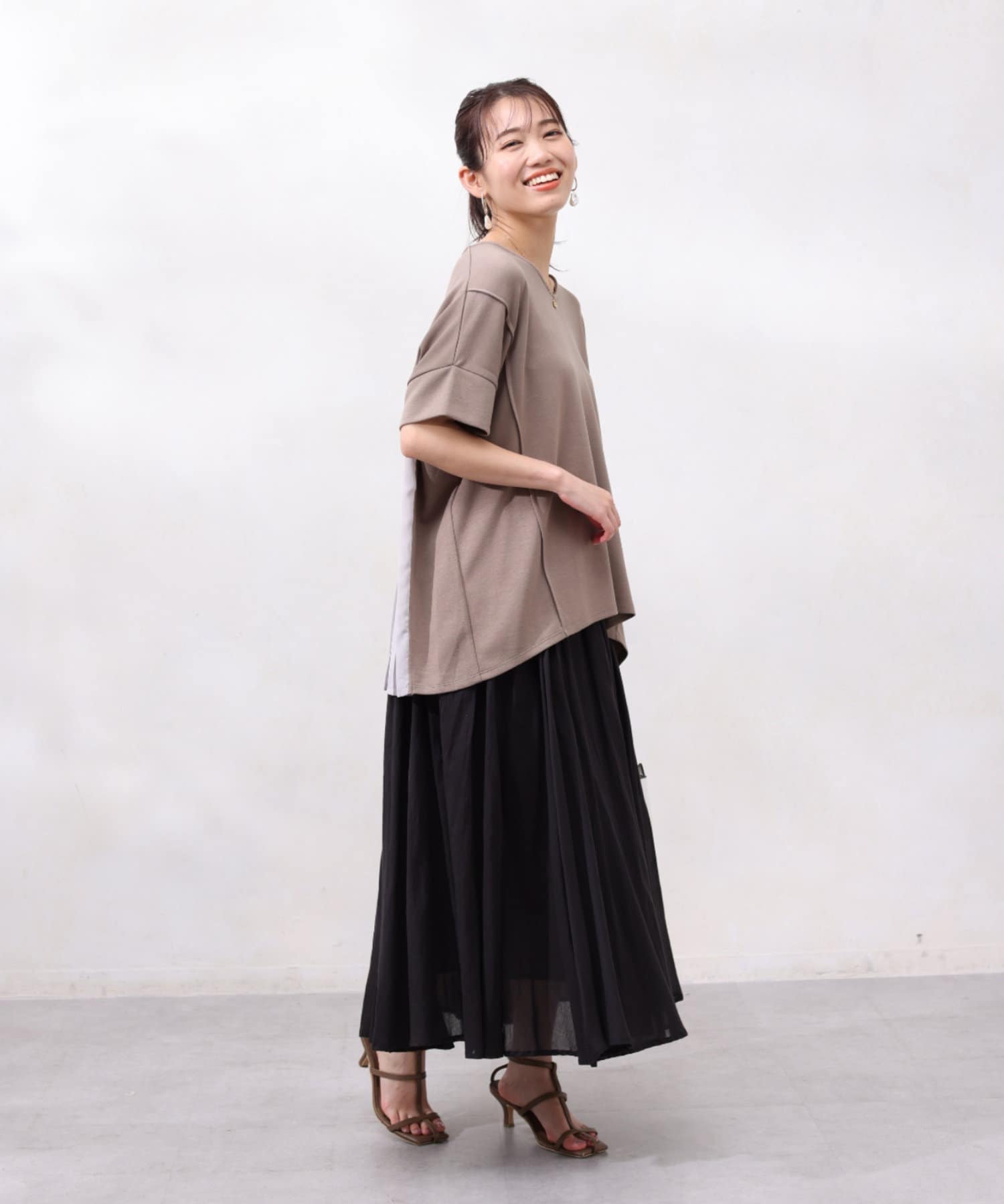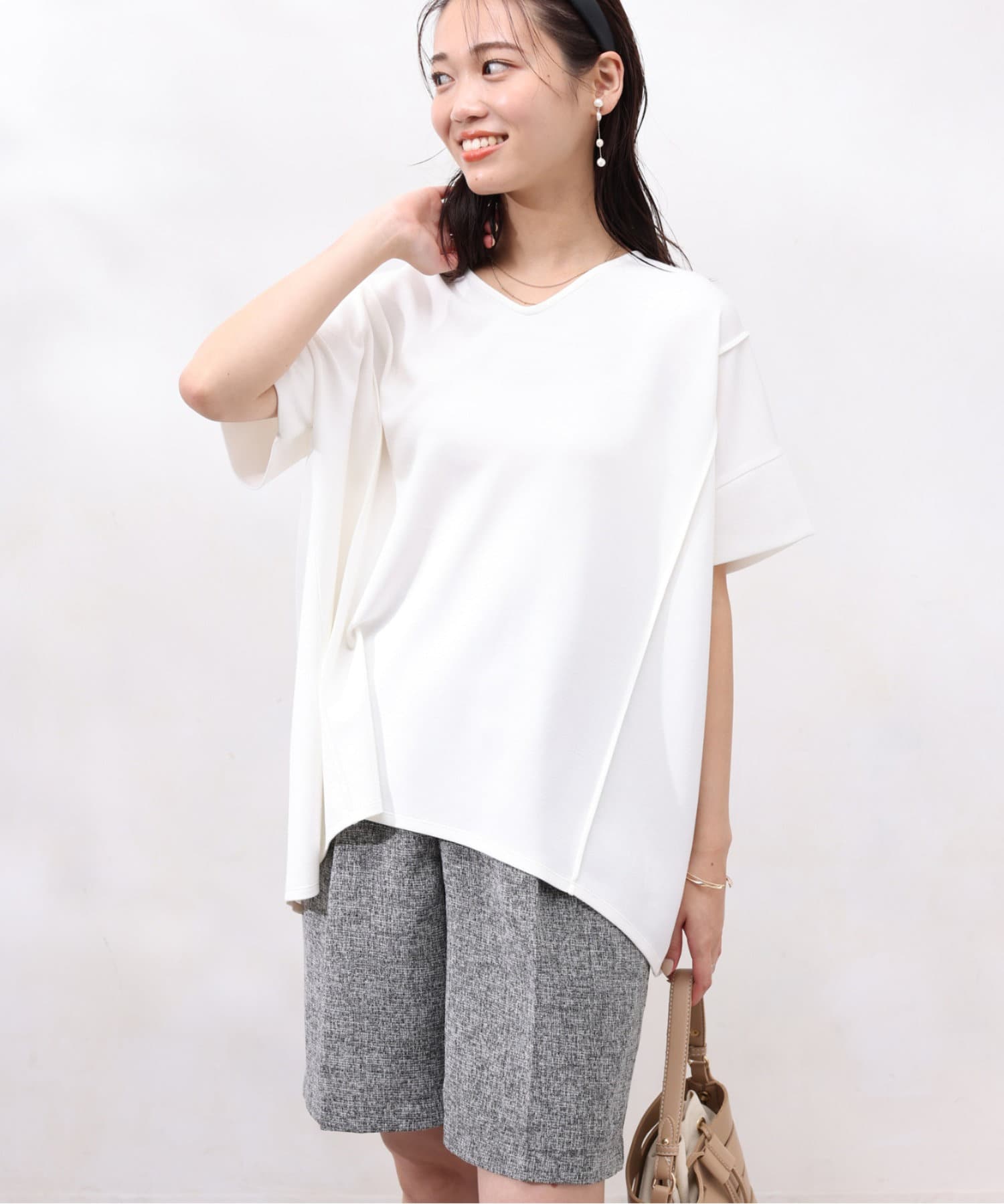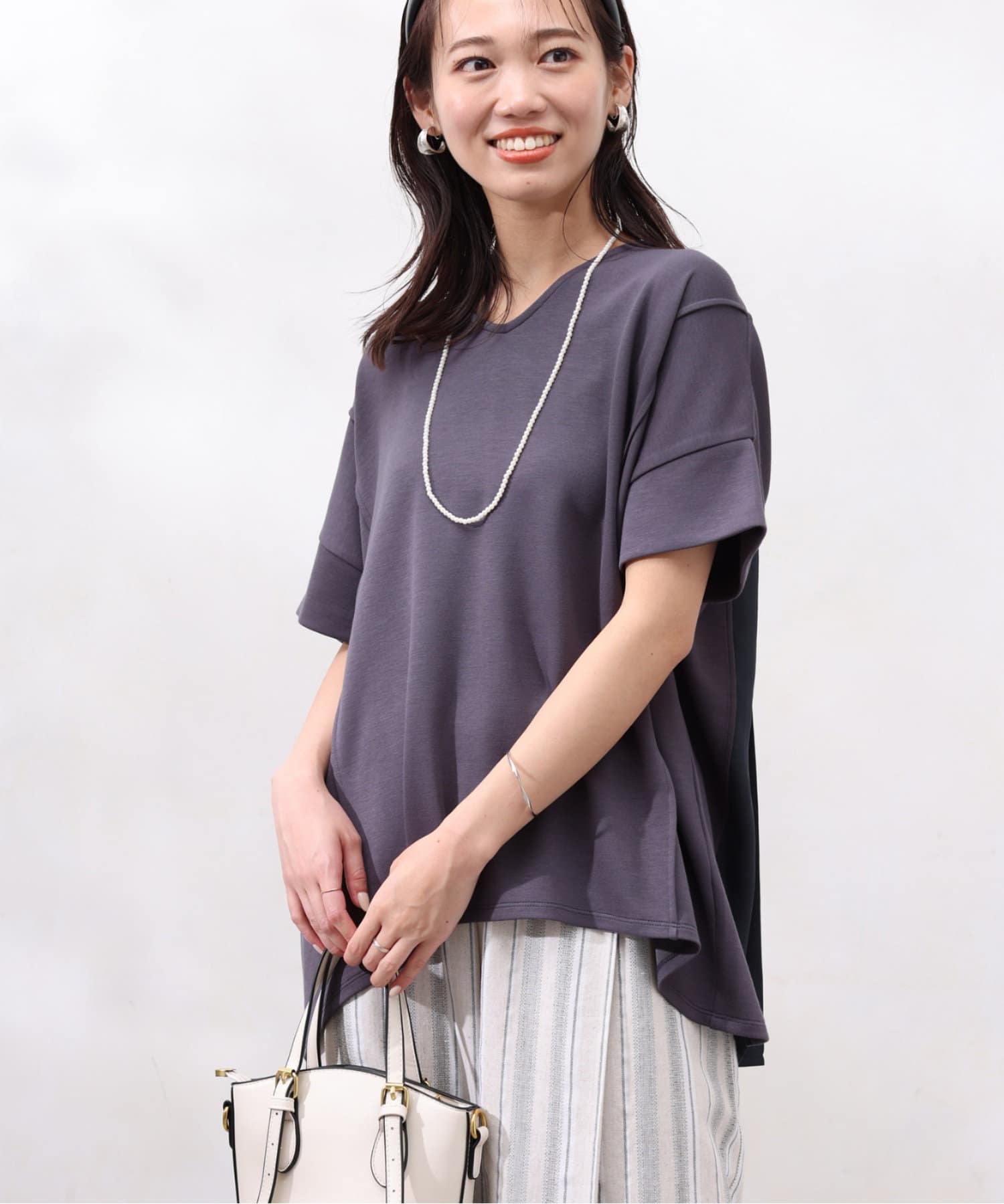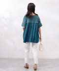 後身頃は布帛生地の切替でプリーツ仕様に。ゆったりとしたシルエットでも、衿ぐりをVネックにすることですっきりとした印象になるように仕上げました。
