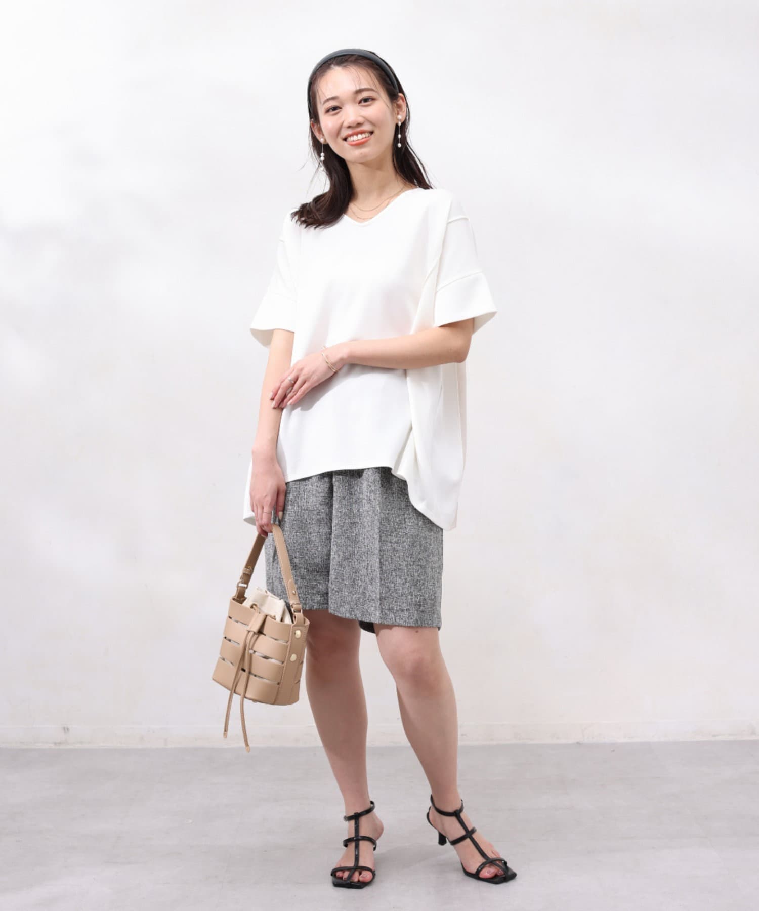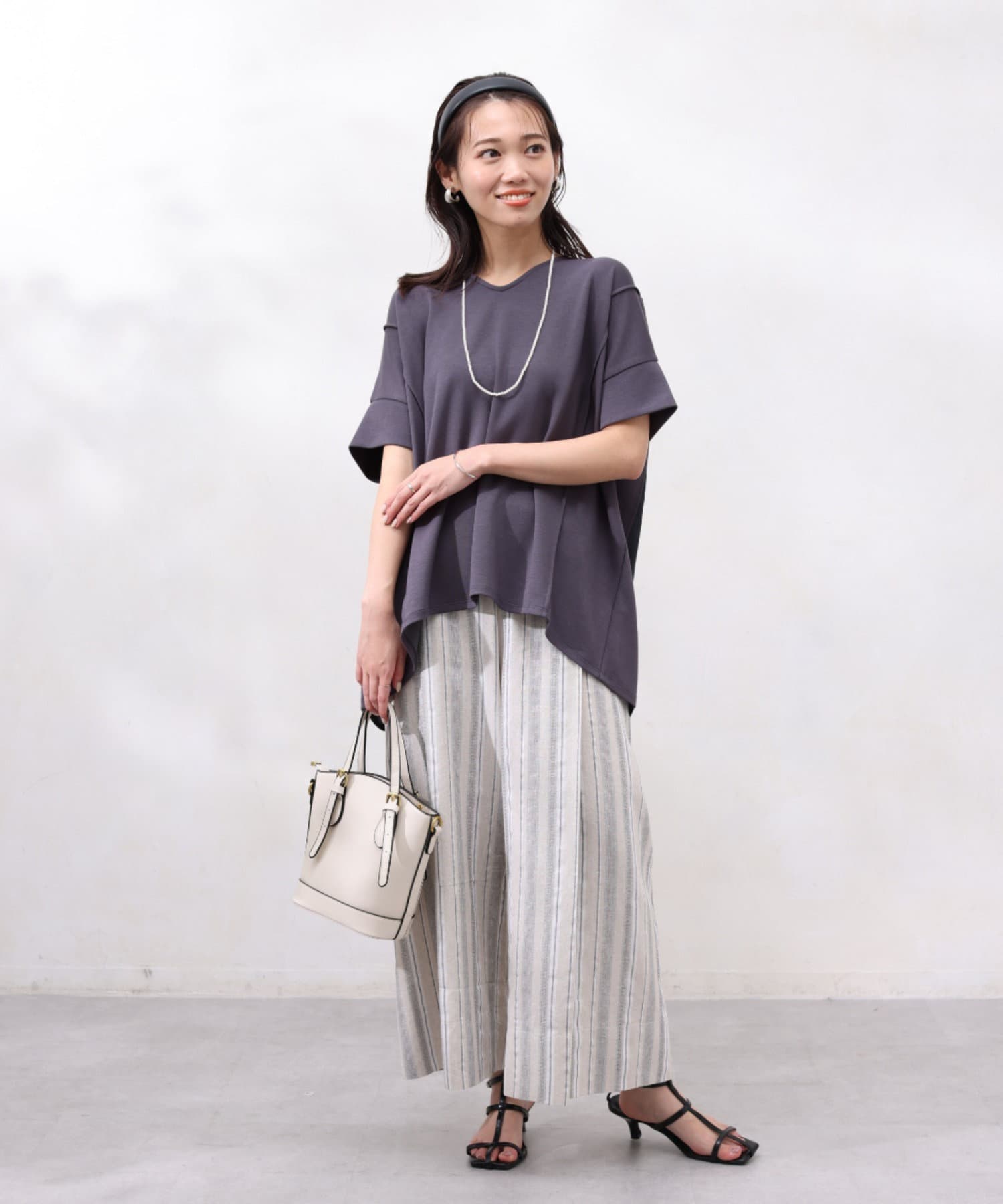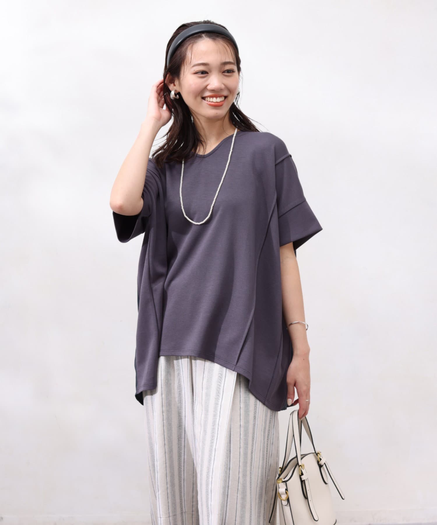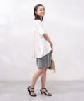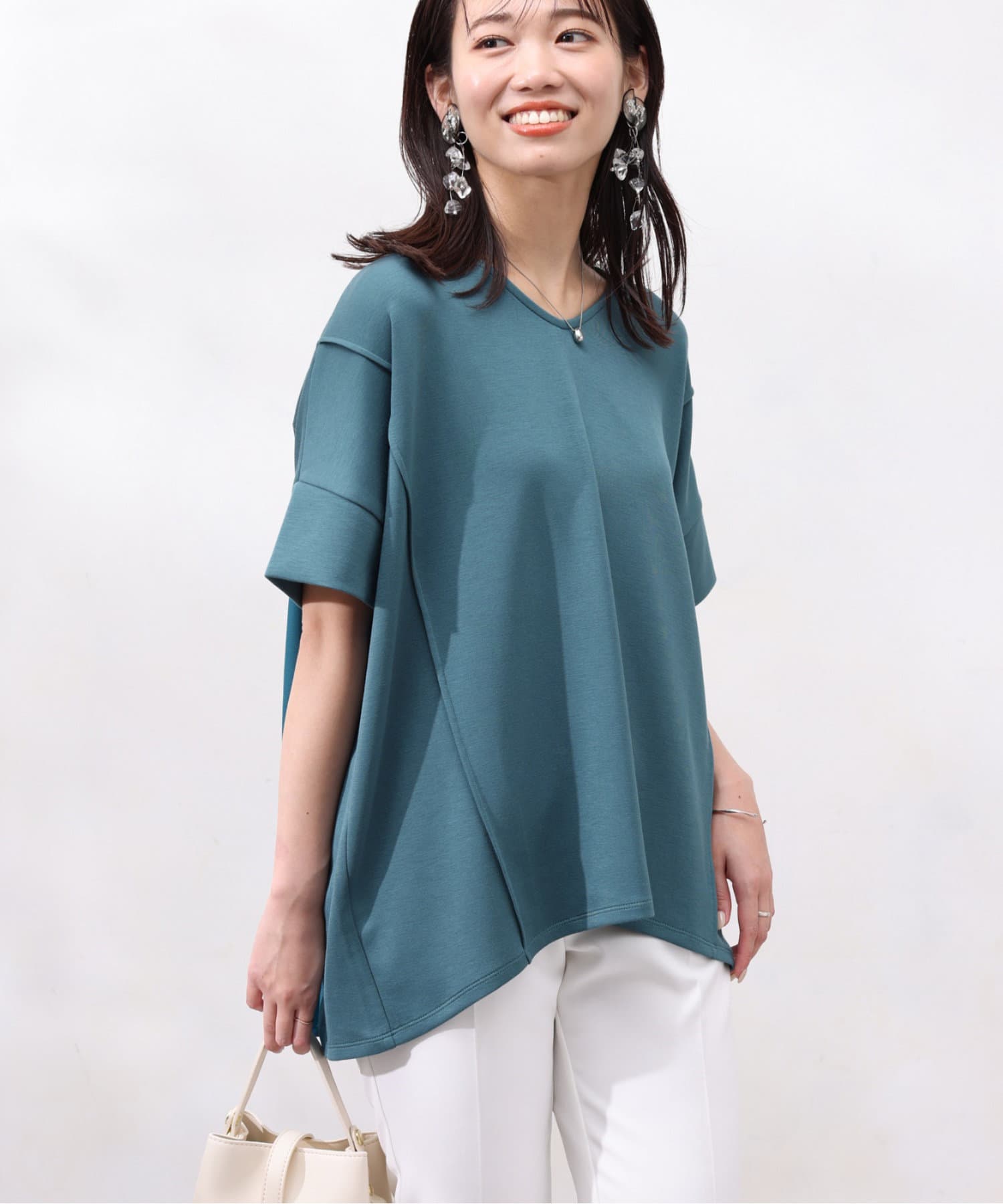 後身頃は布帛生地の切替でプリーツ仕様に。ゆったりとしたシルエットでも、衿ぐりをVネックにすることですっきりとした印象になるように仕上げました。