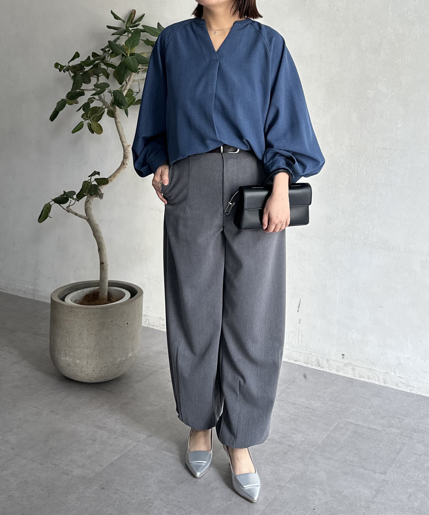 張りのある生地感で、きちんと見えするのでお仕事スタイルにもおすすめ。