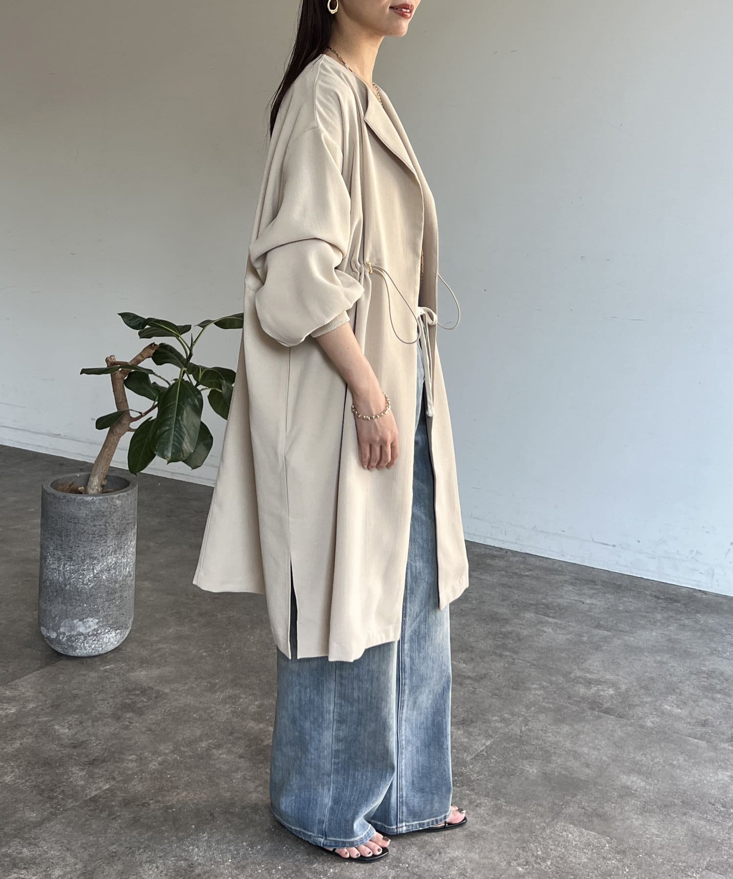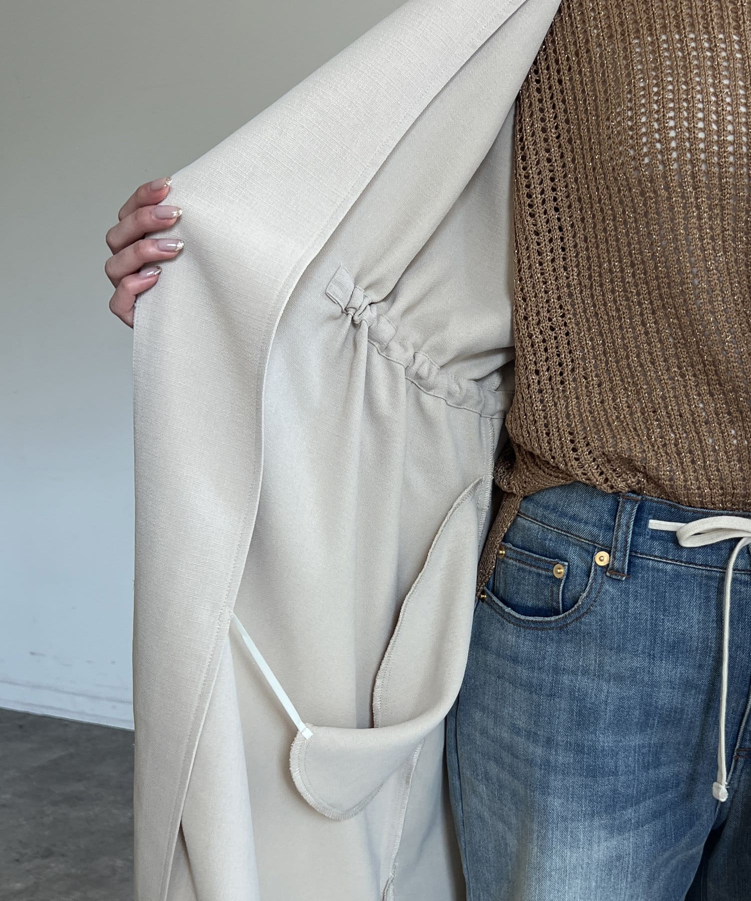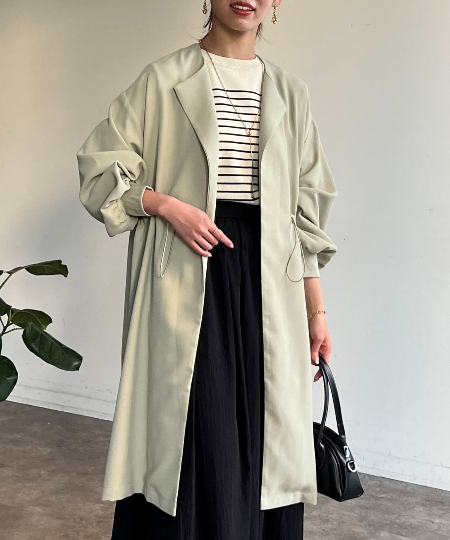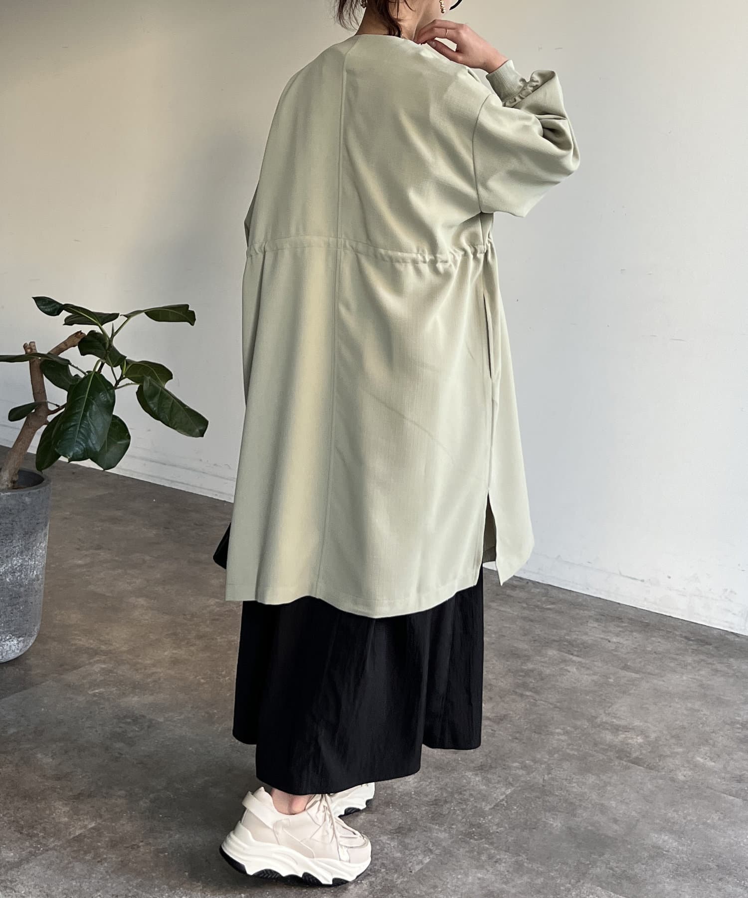 ウエストのドロストが付いているので、お好みのスタイルで楽しんでいただけるライトコート。