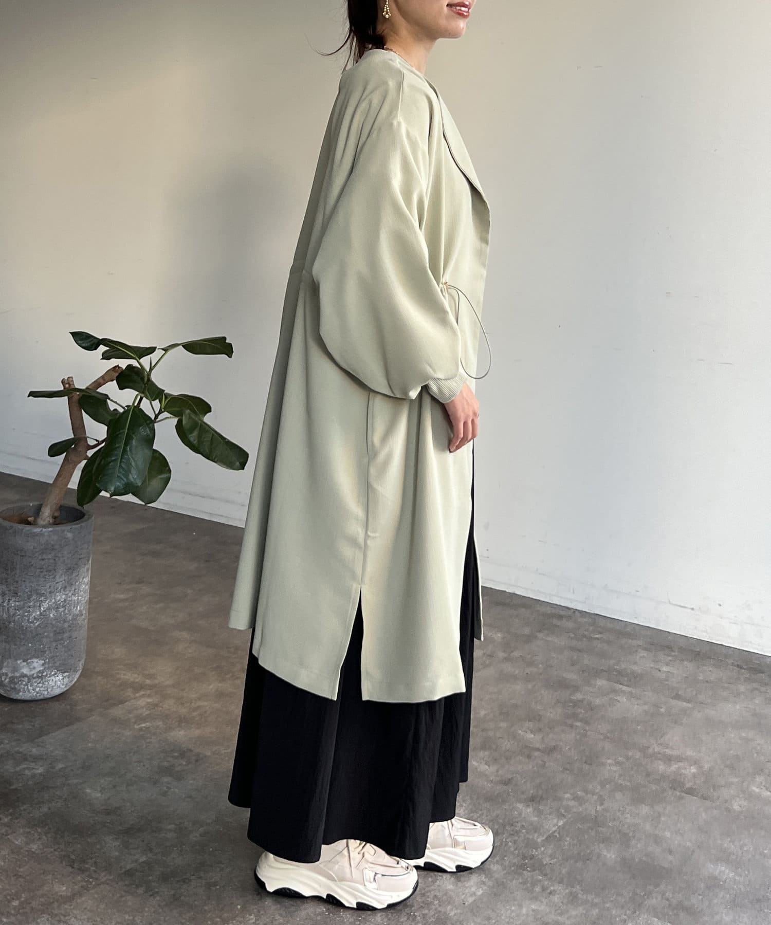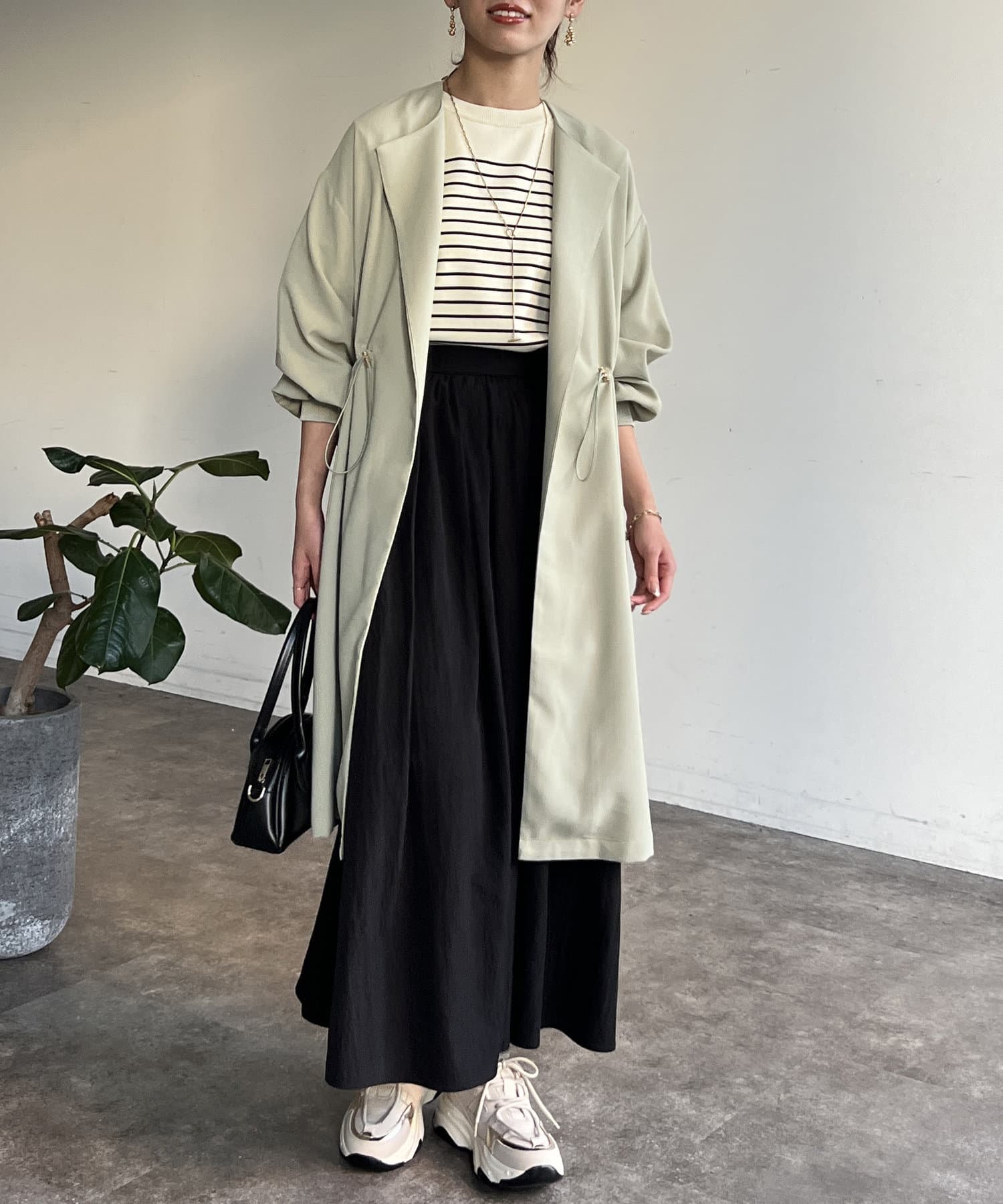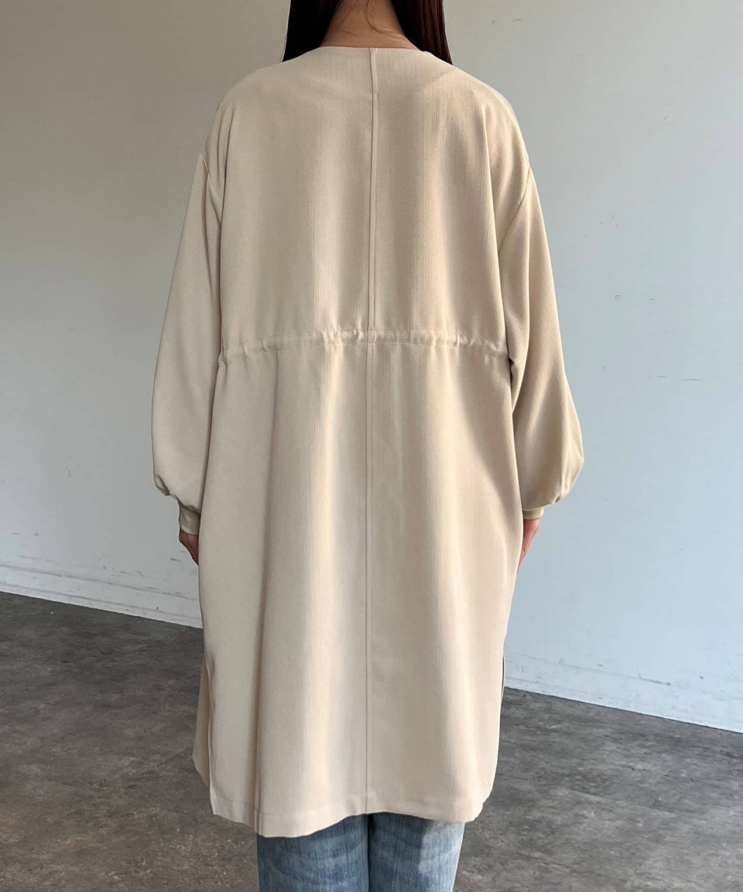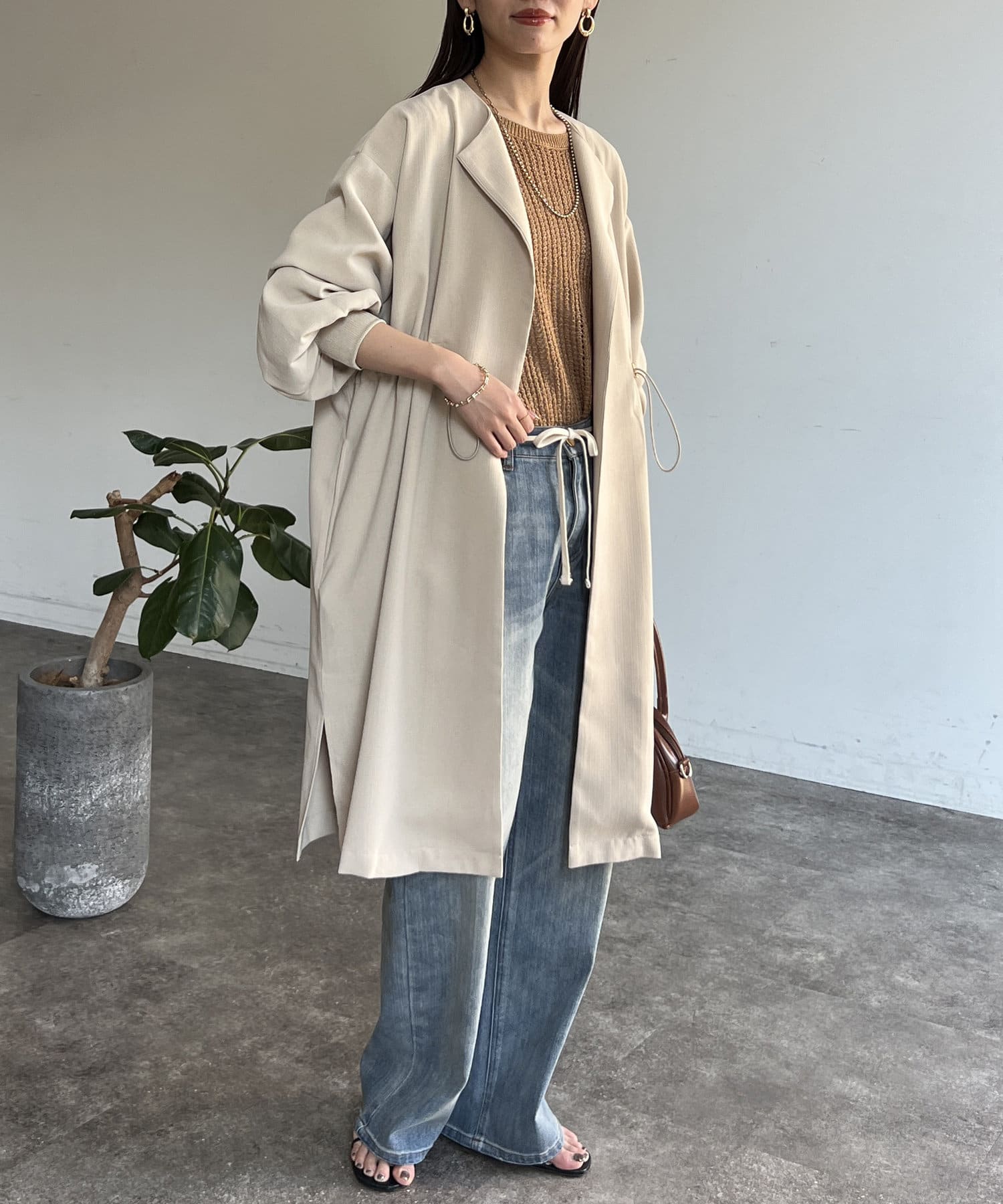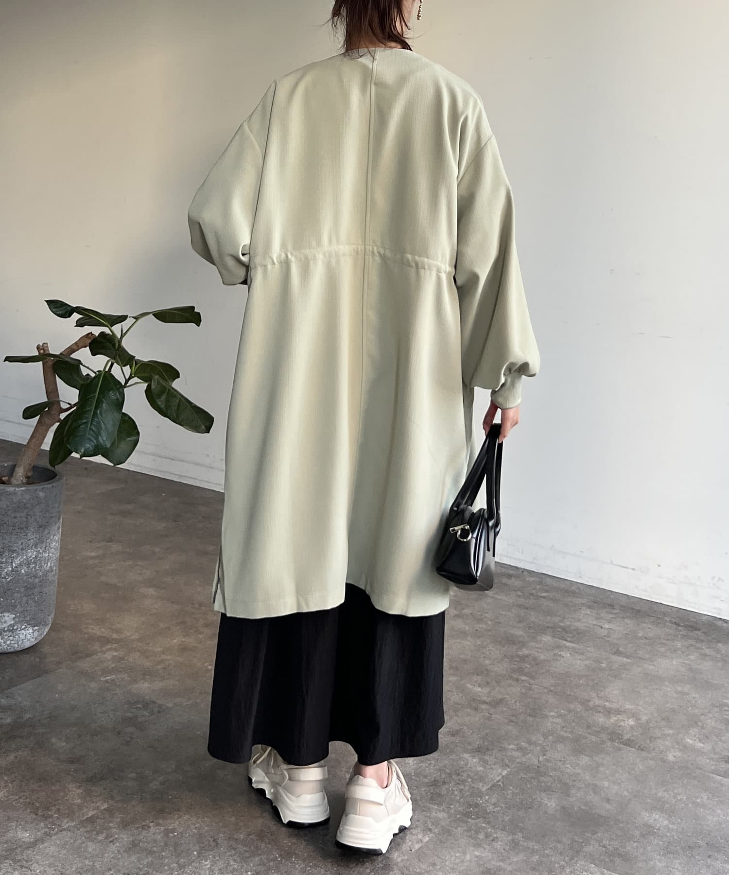 ウエストのドロストが付いているので、お好みのスタイルで楽しんでいただけるライトコート。