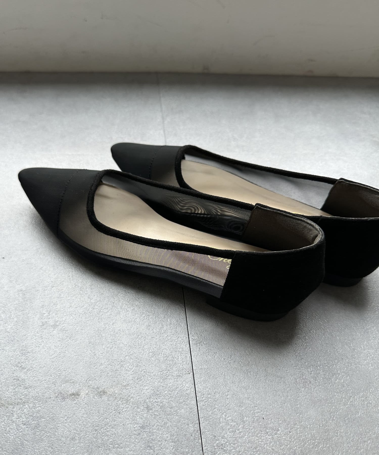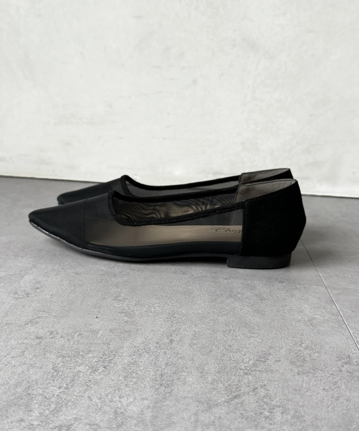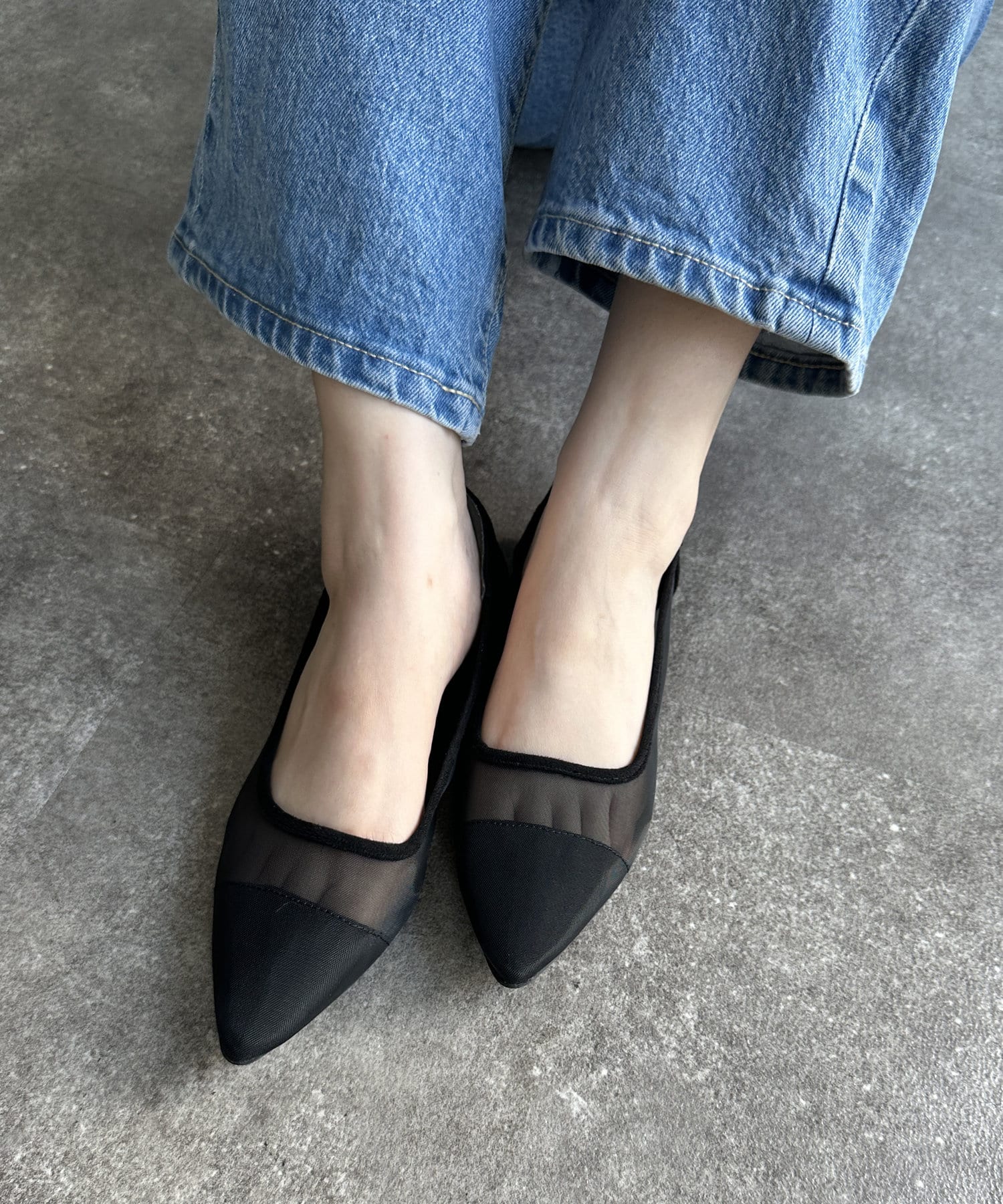 シアーなチュール素材を施し、フラットシューズをエレガントにランクアップ。