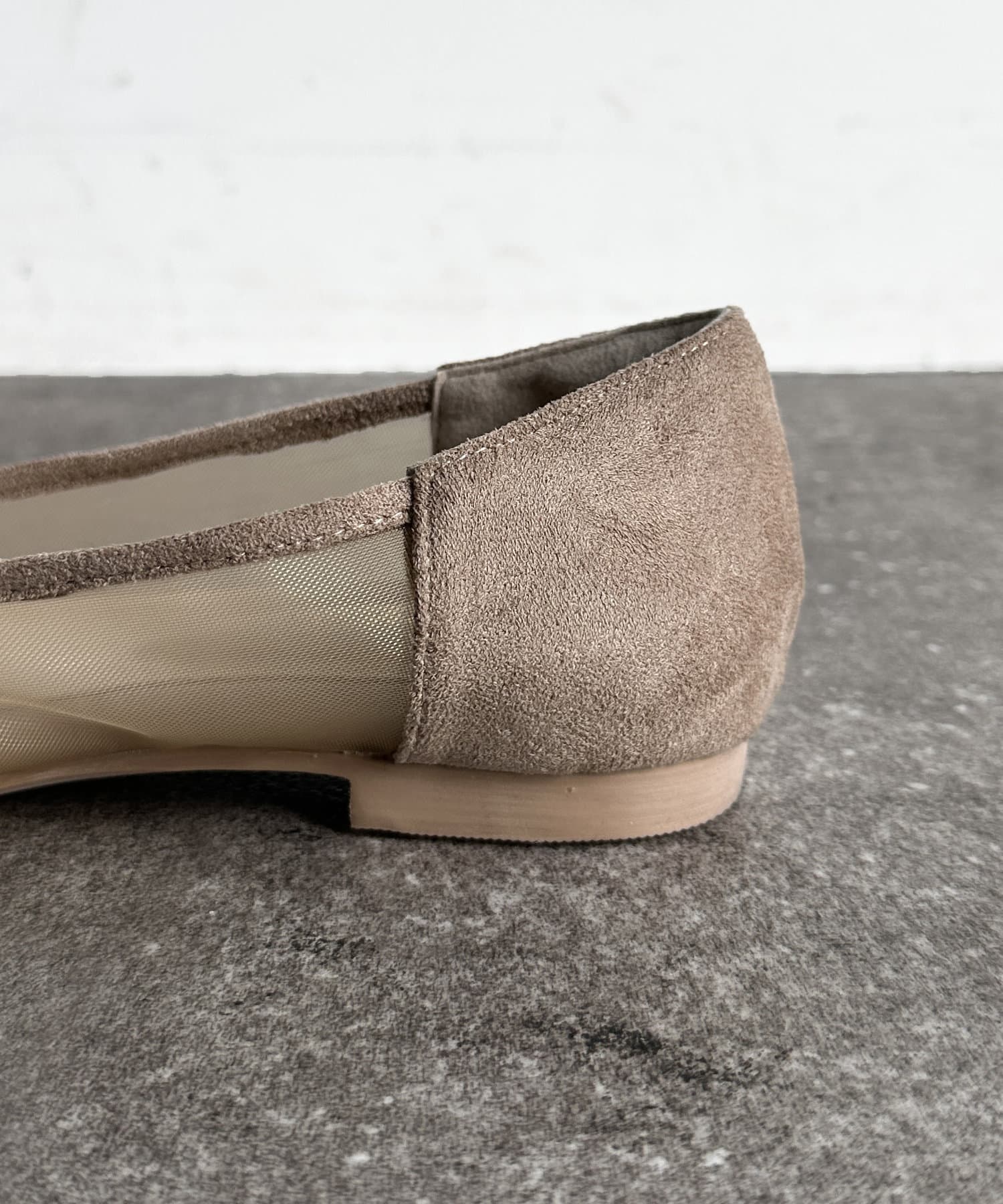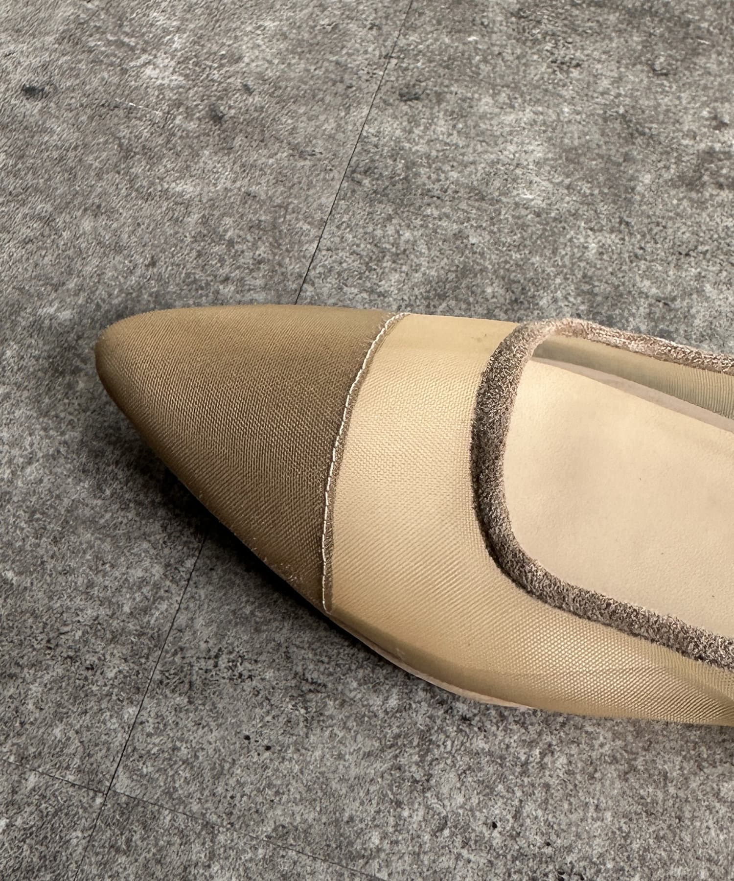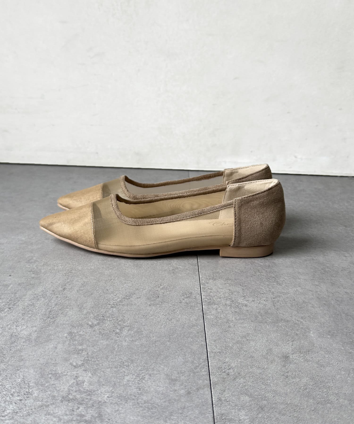 シアーなチュール素材を施し、フラットシューズをエレガントにランクアップ。