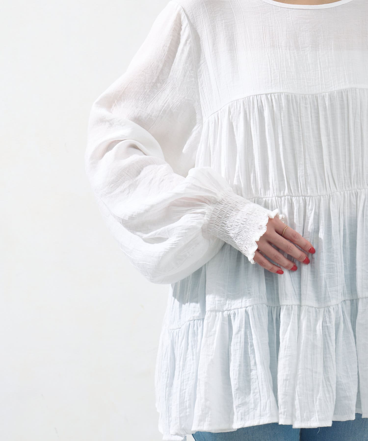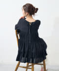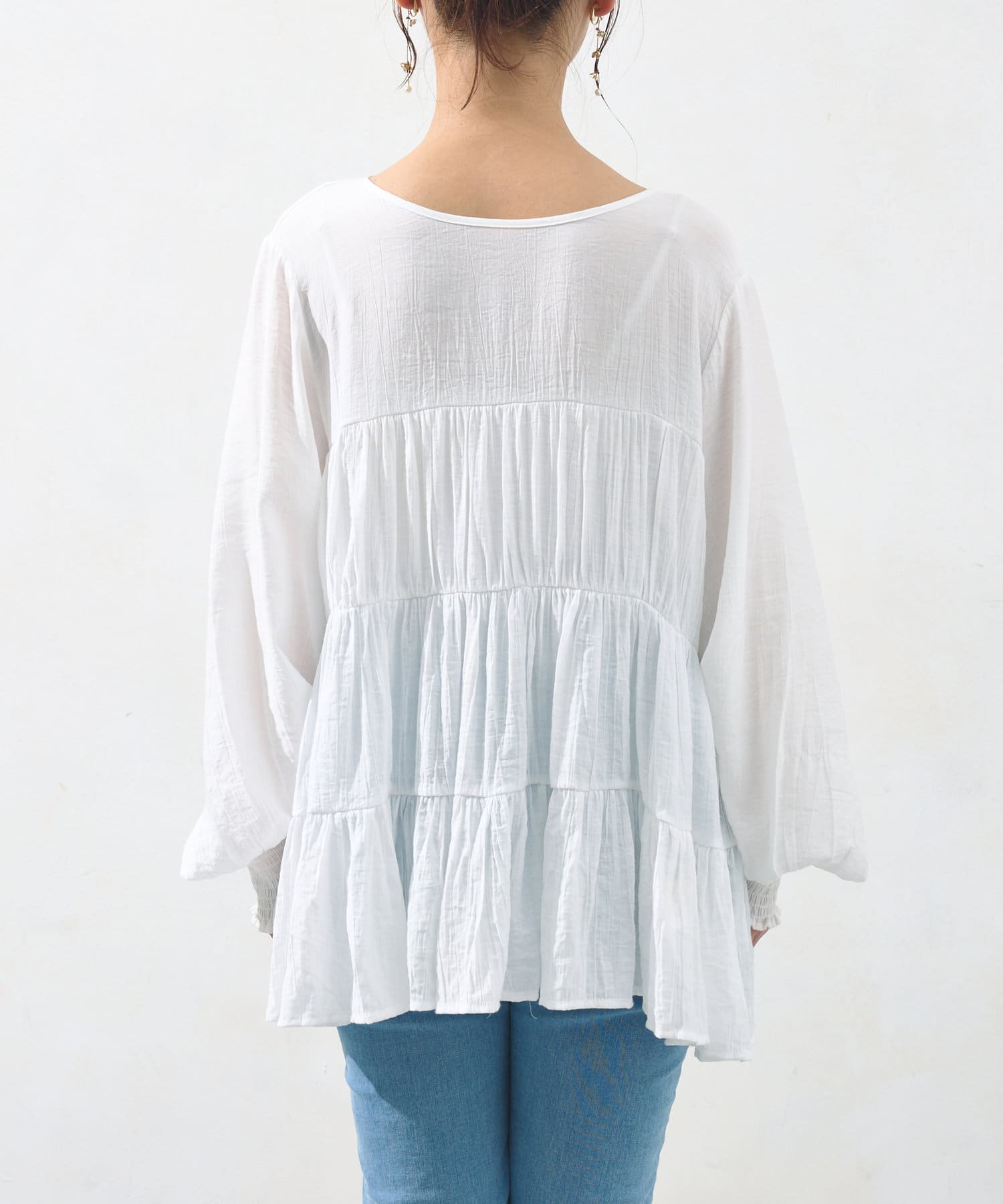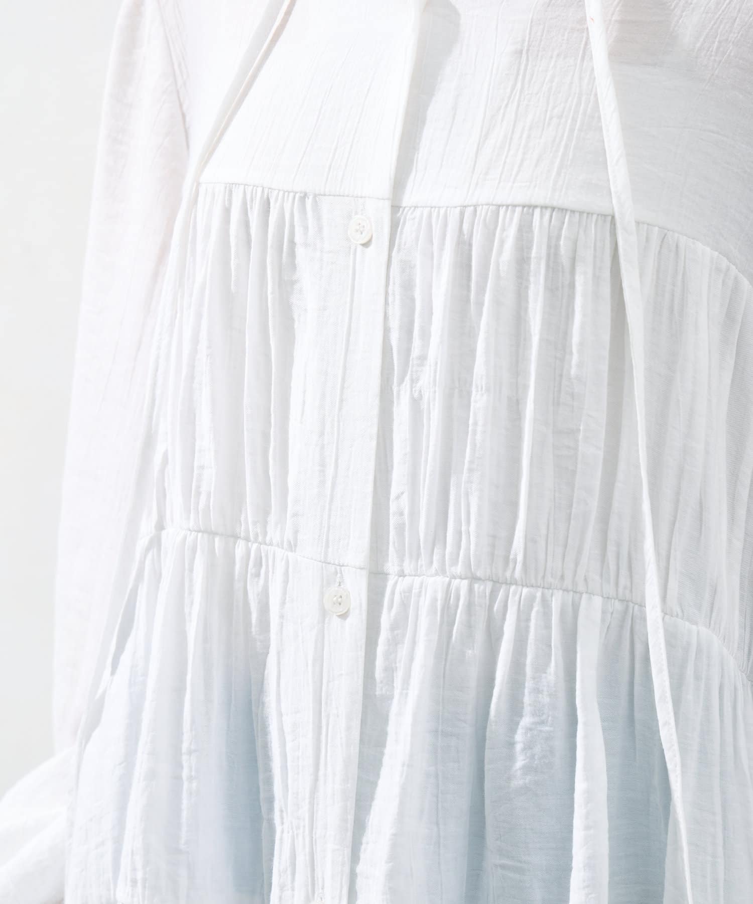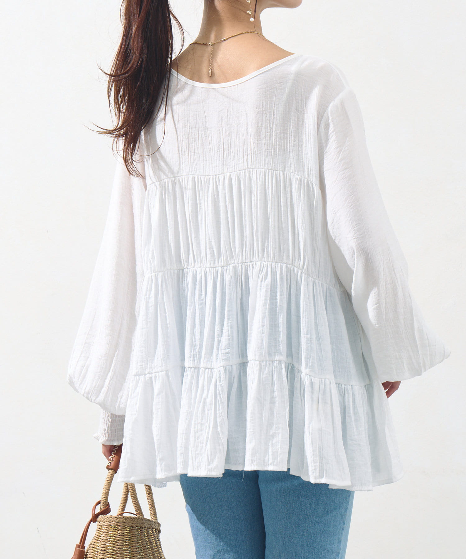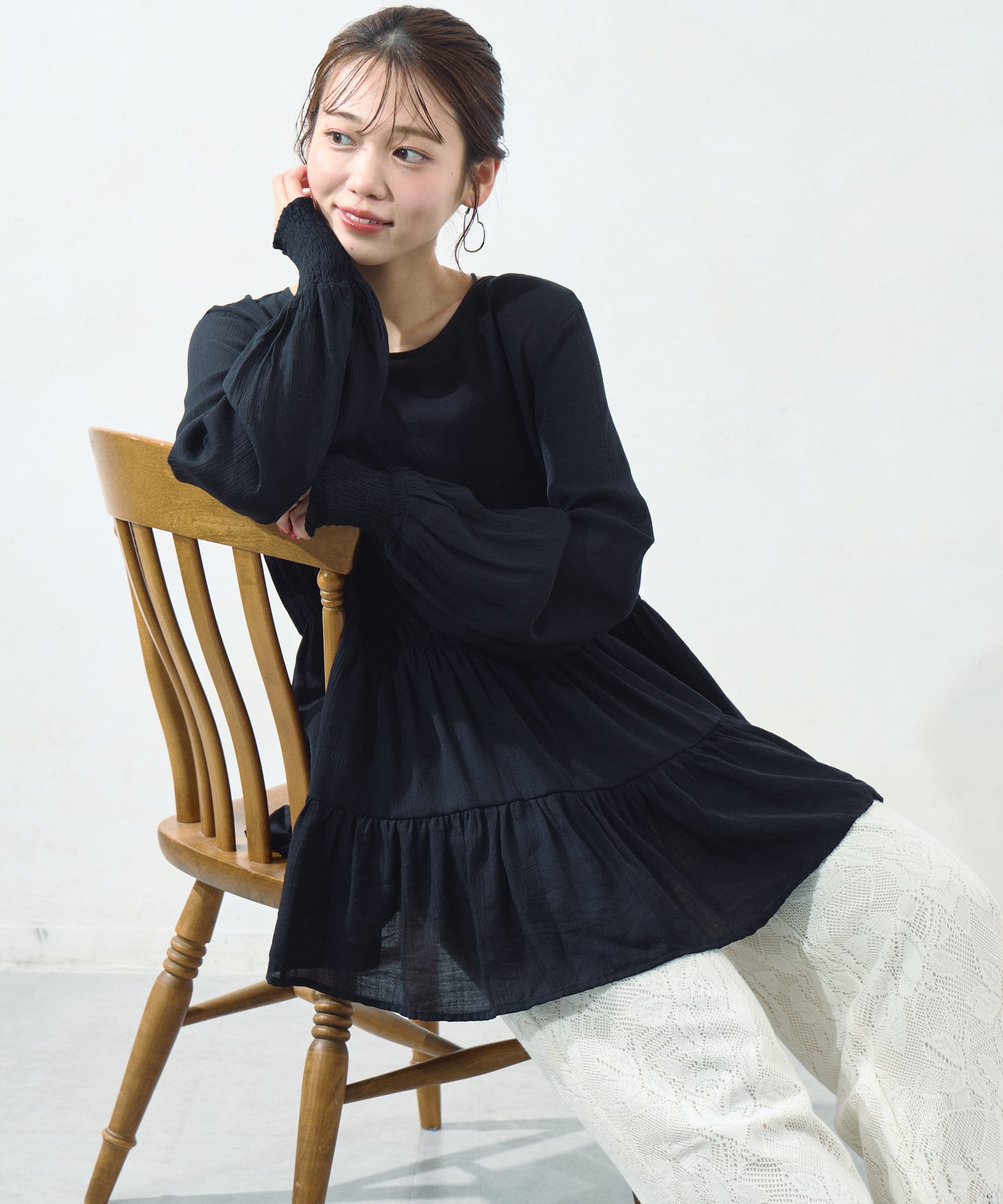 切り替え部分のティアードが女性らしい印象にしてくれるチュニック。