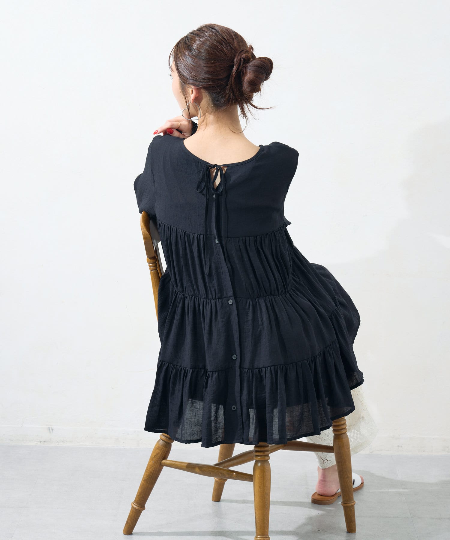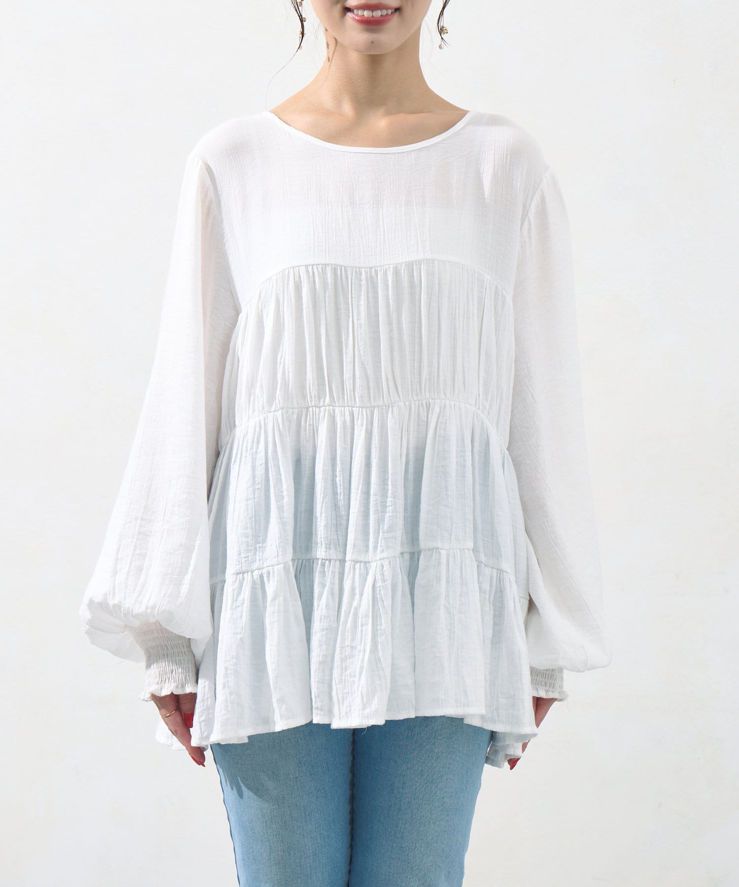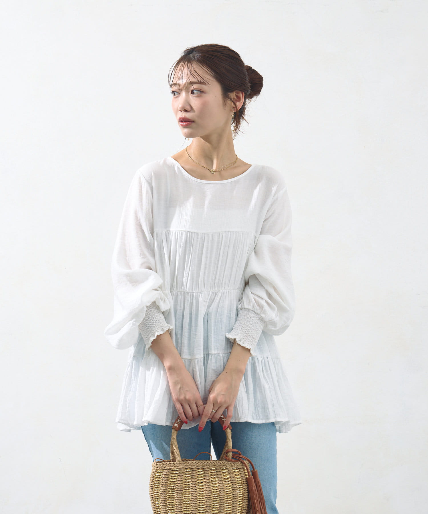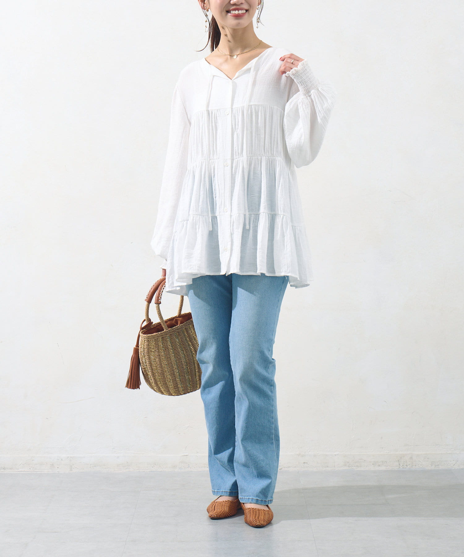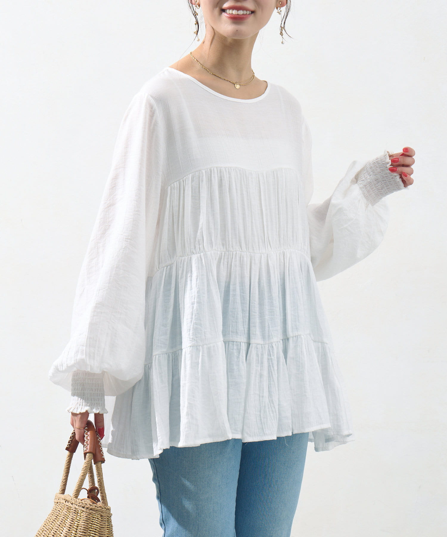 切り替え部分のティアードが女性らしい印象にしてくれるチュニック。
