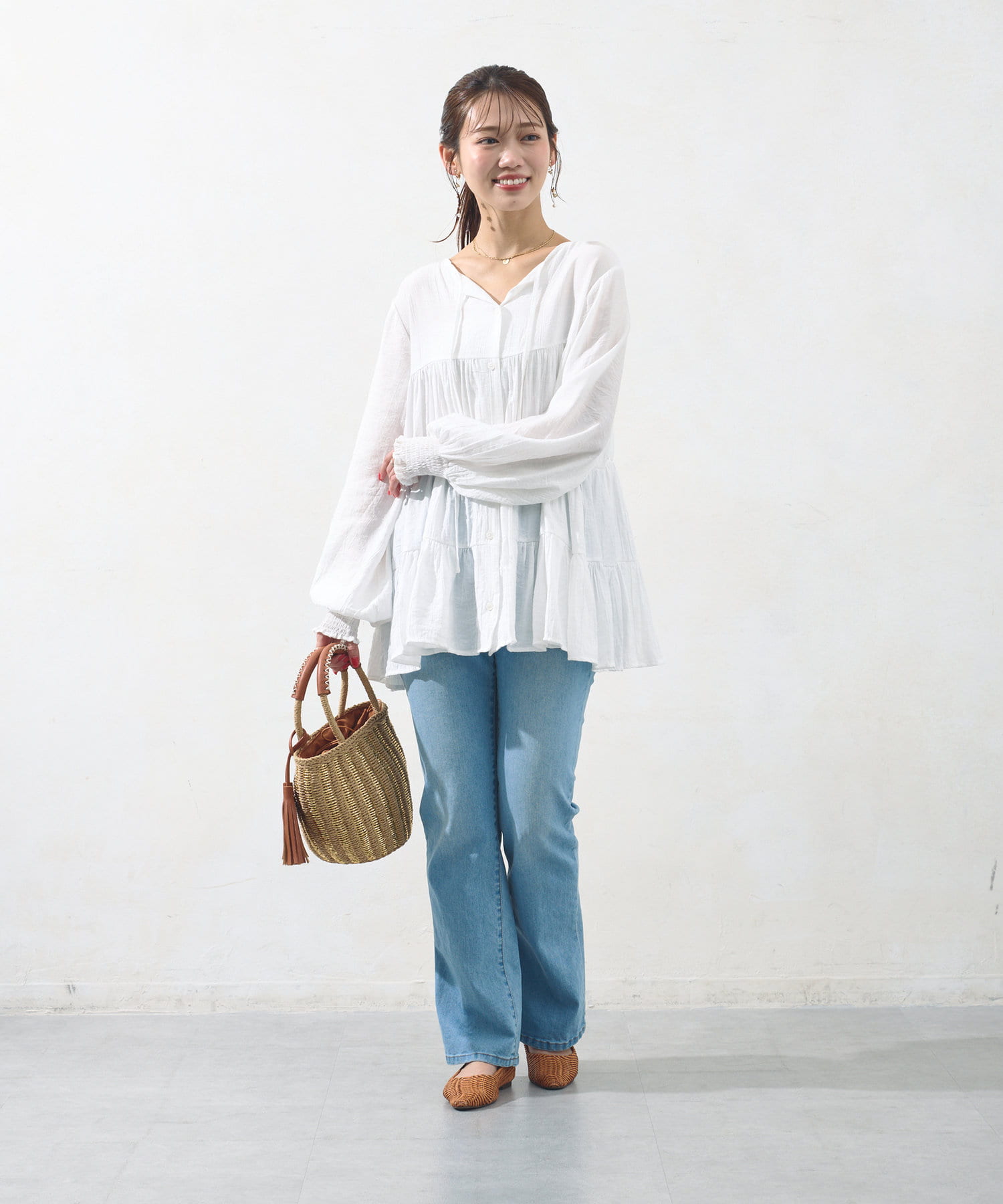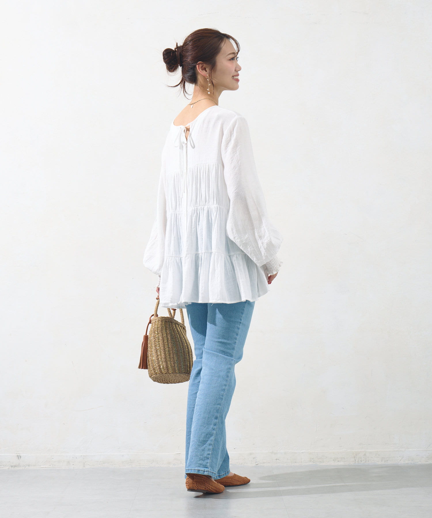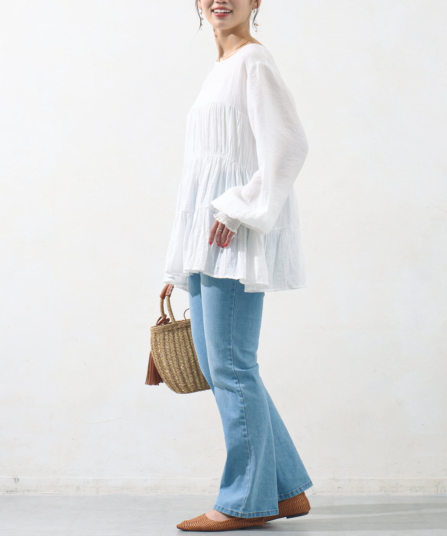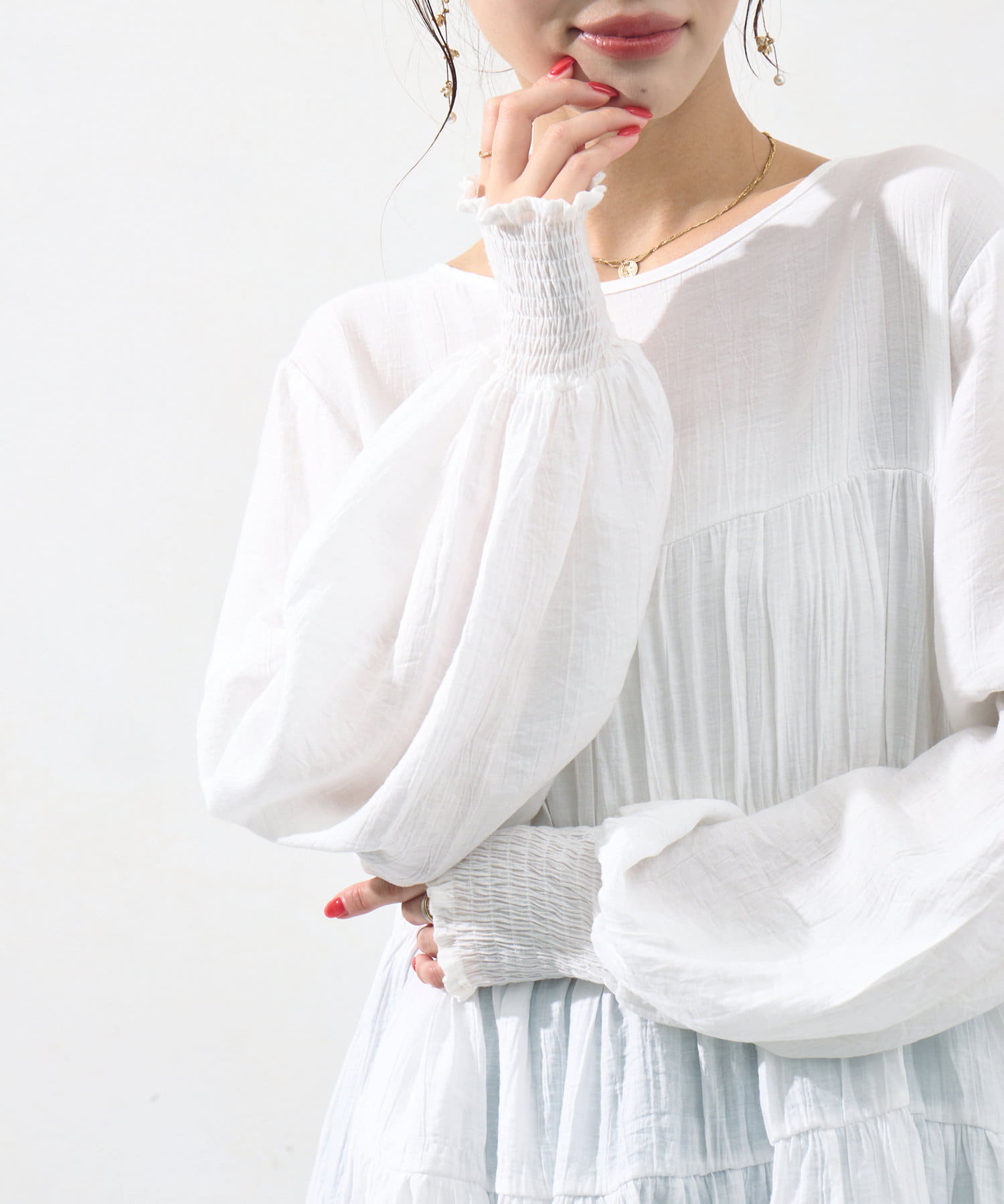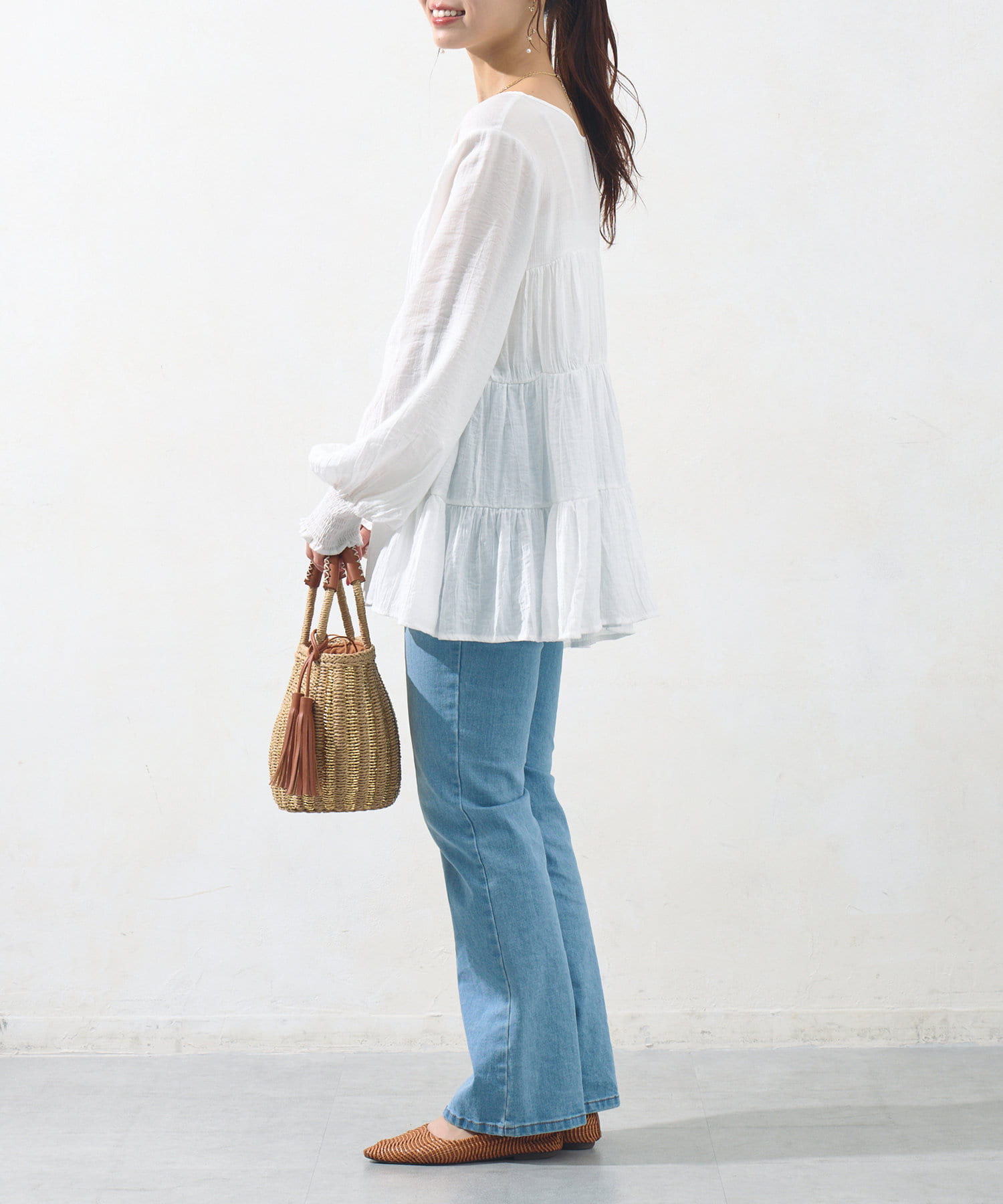 切り替え部分のティアードが女性らしい印象にしてくれるチュニック。