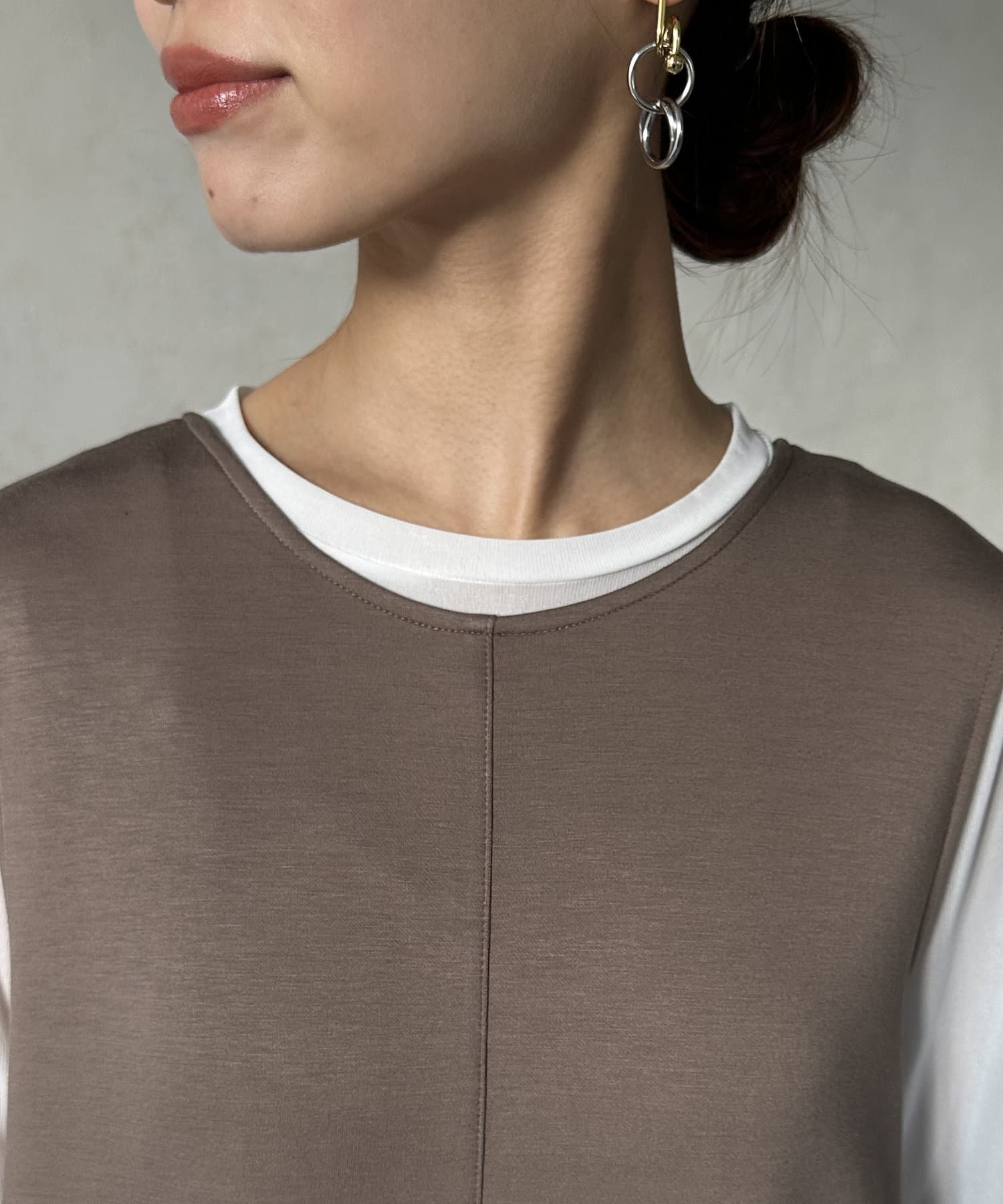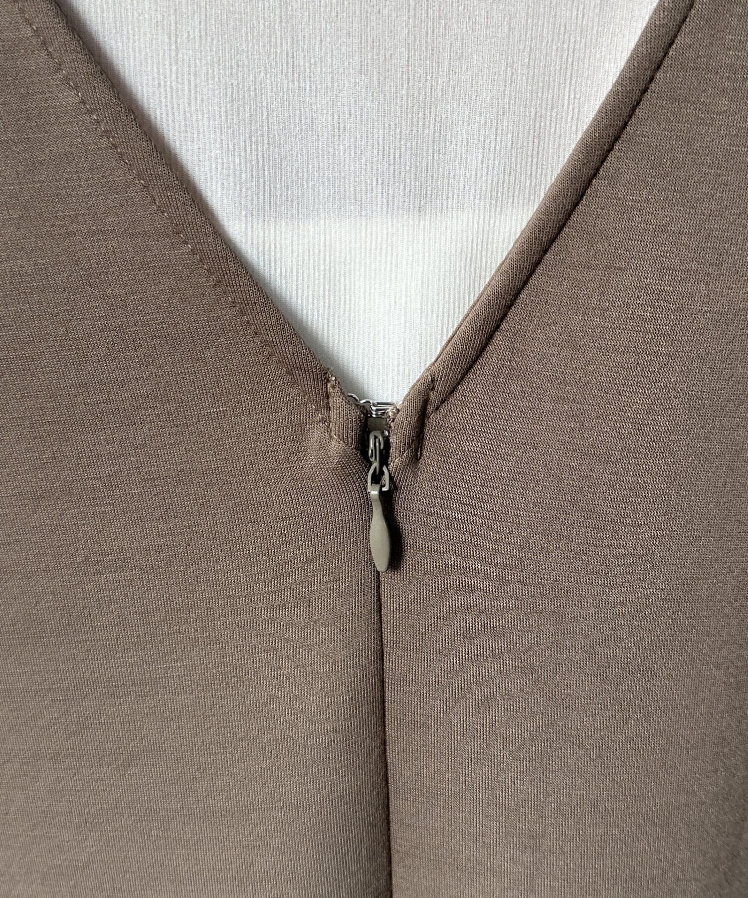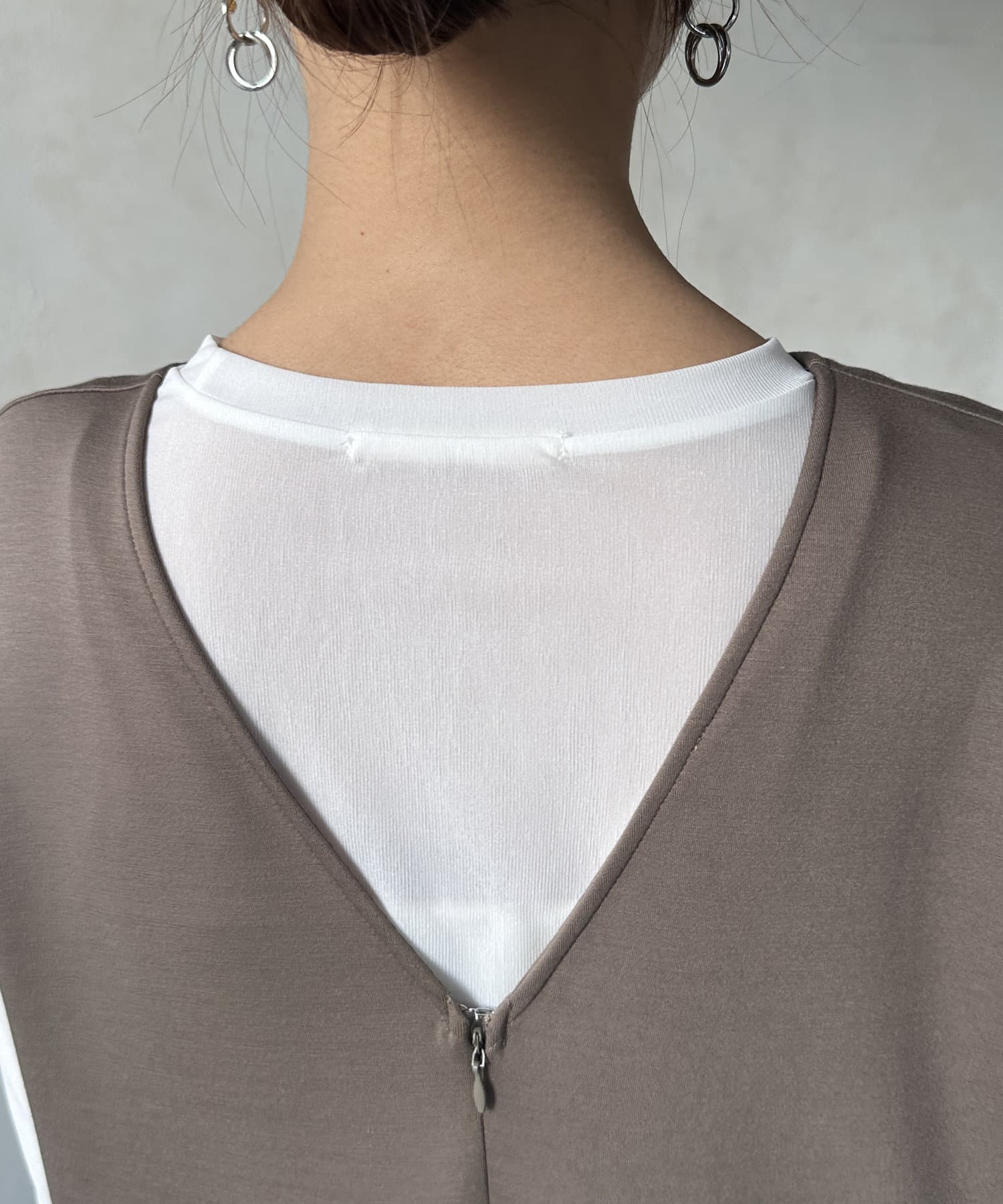 体型をカバーするゆったりシルエットながら、後ろの深めVネックですっきりとした着こなしに。
