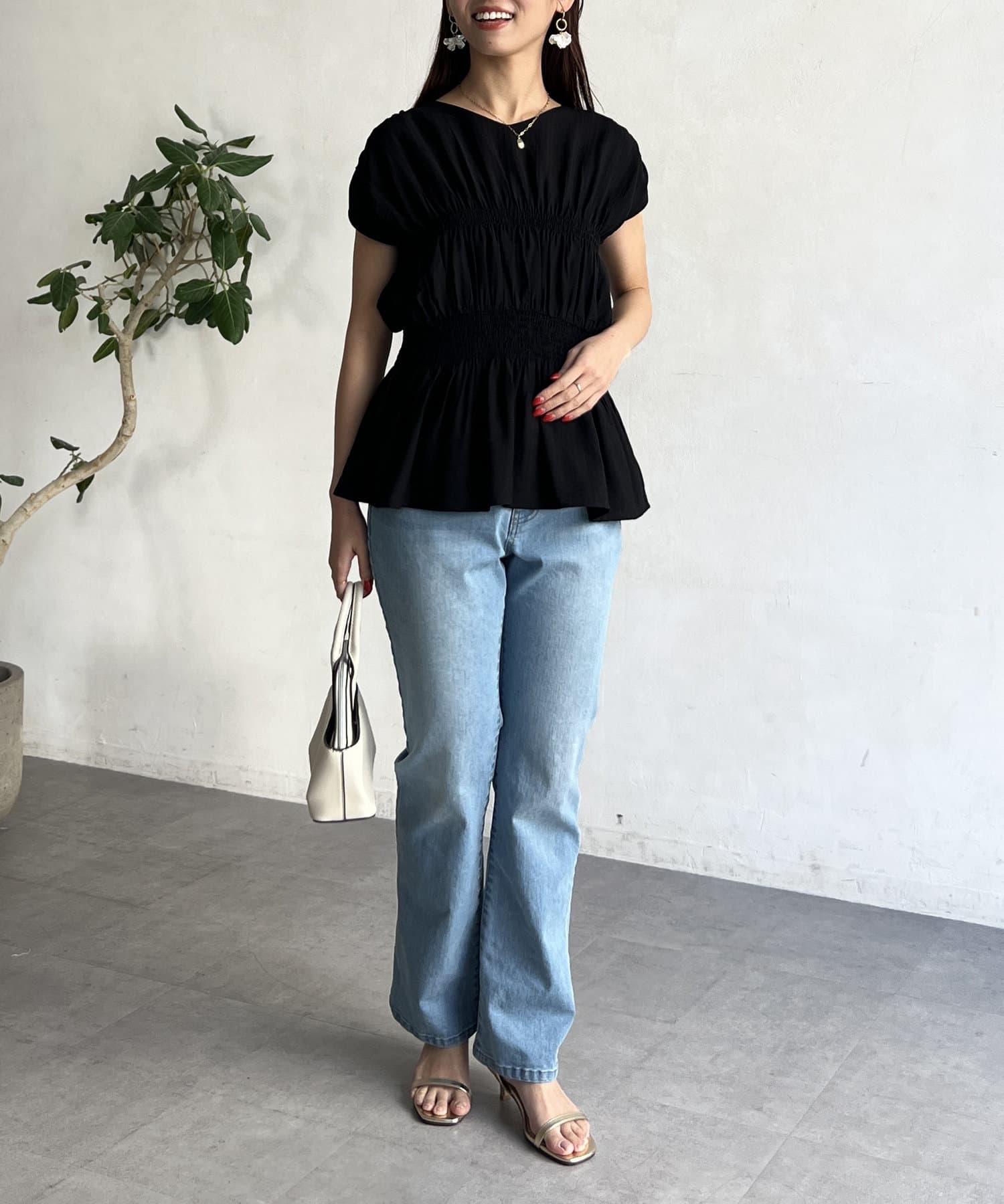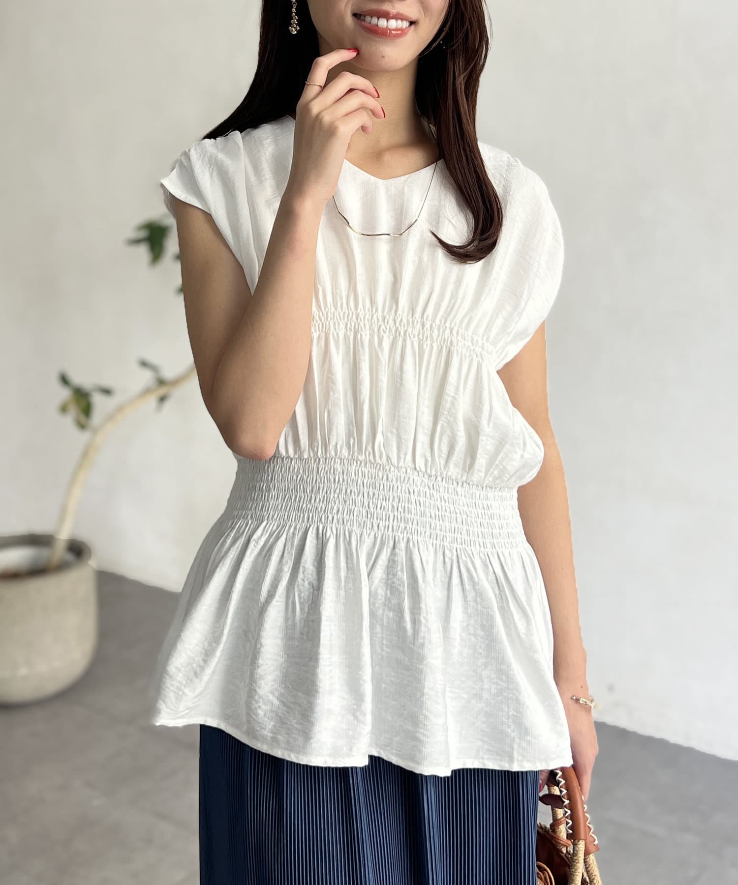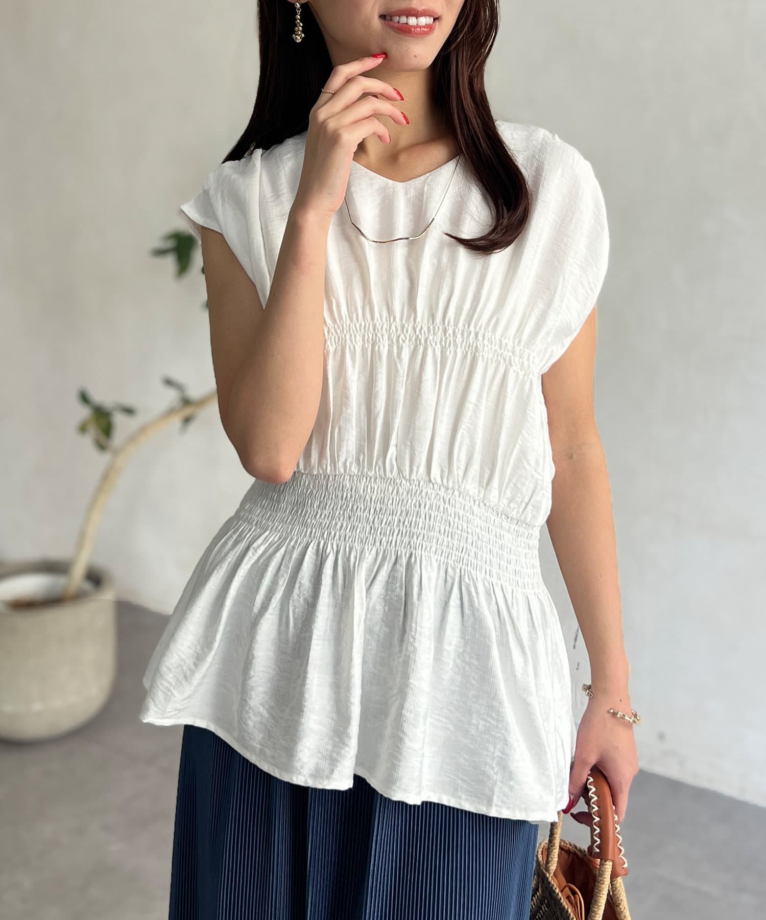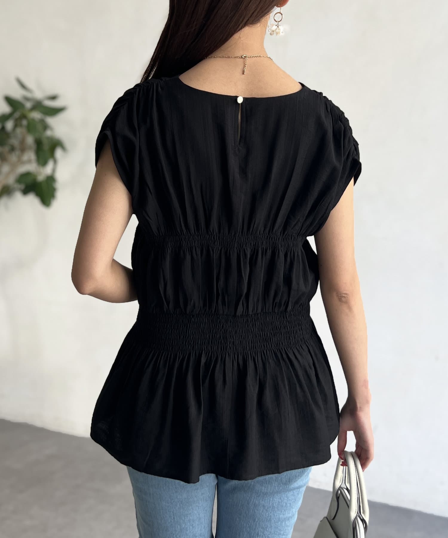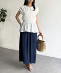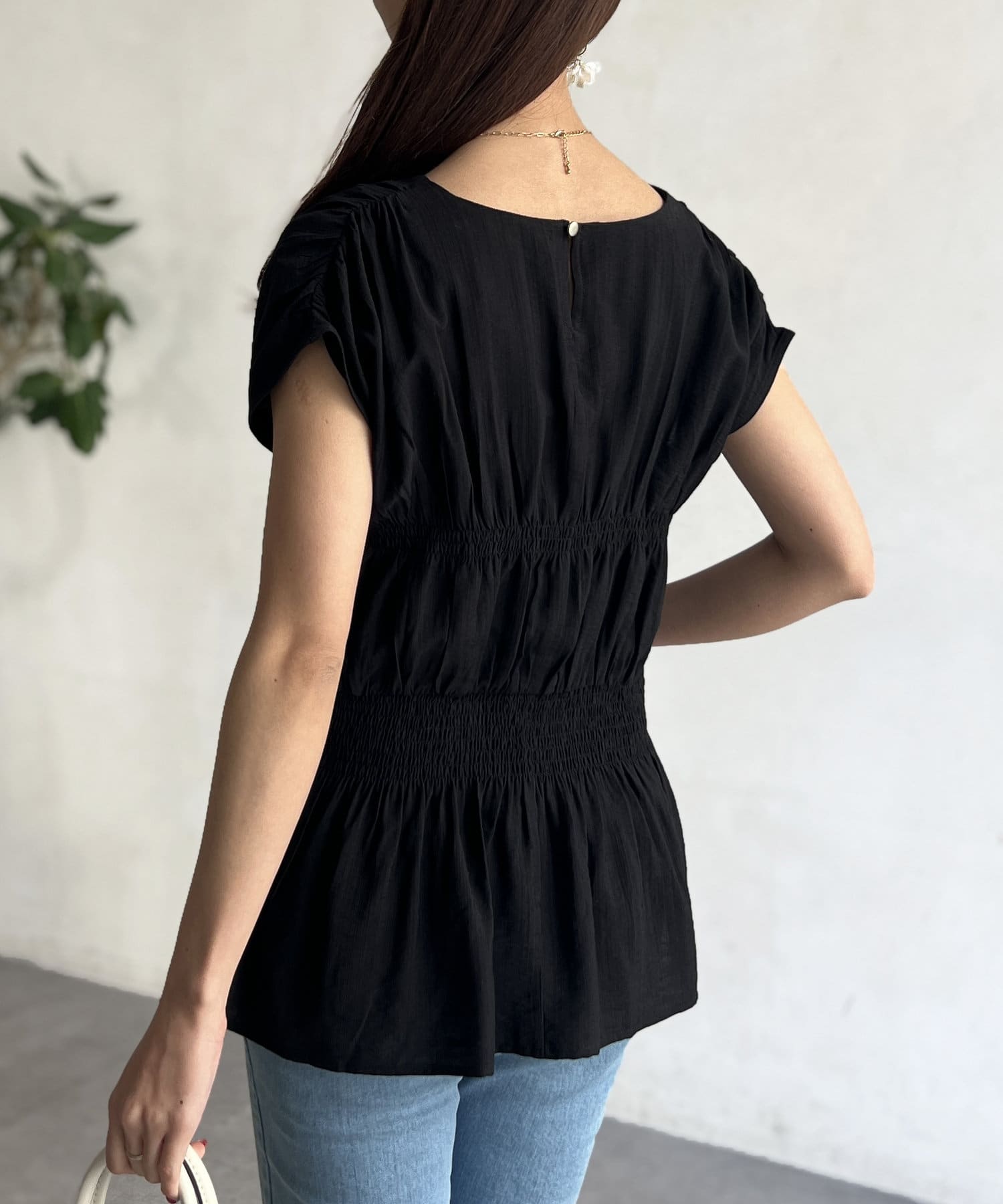ウエスト部分のシャーリングが可愛くシンプルかつデザイン性のあるトップスです。