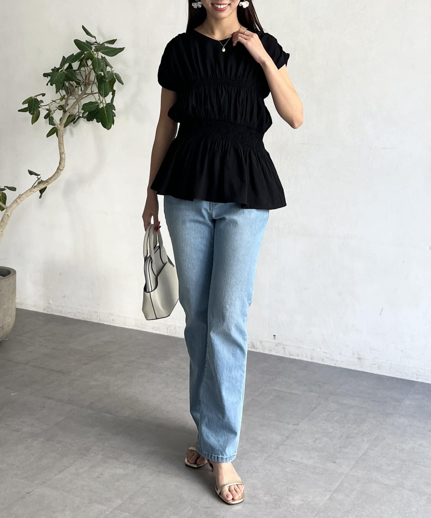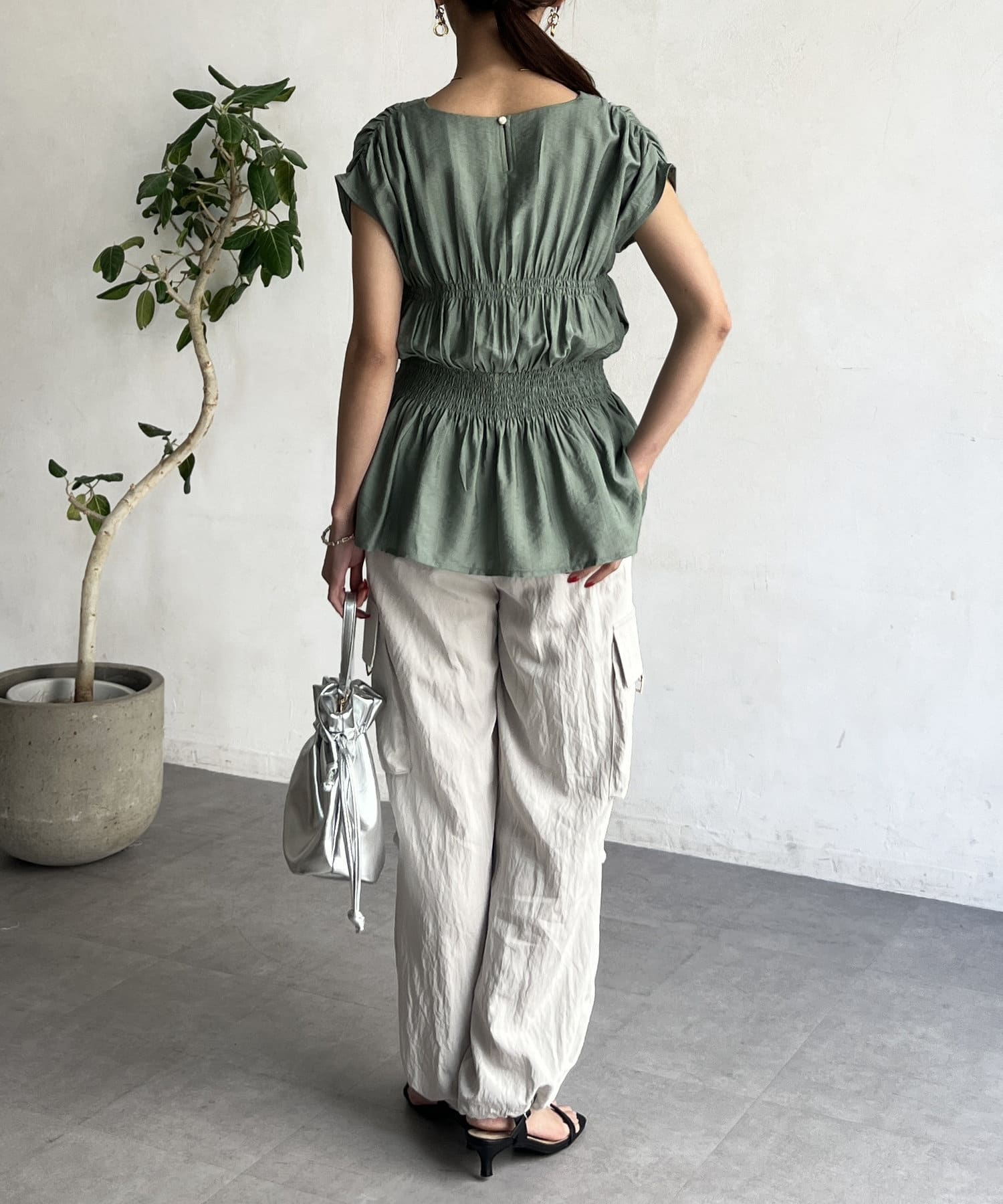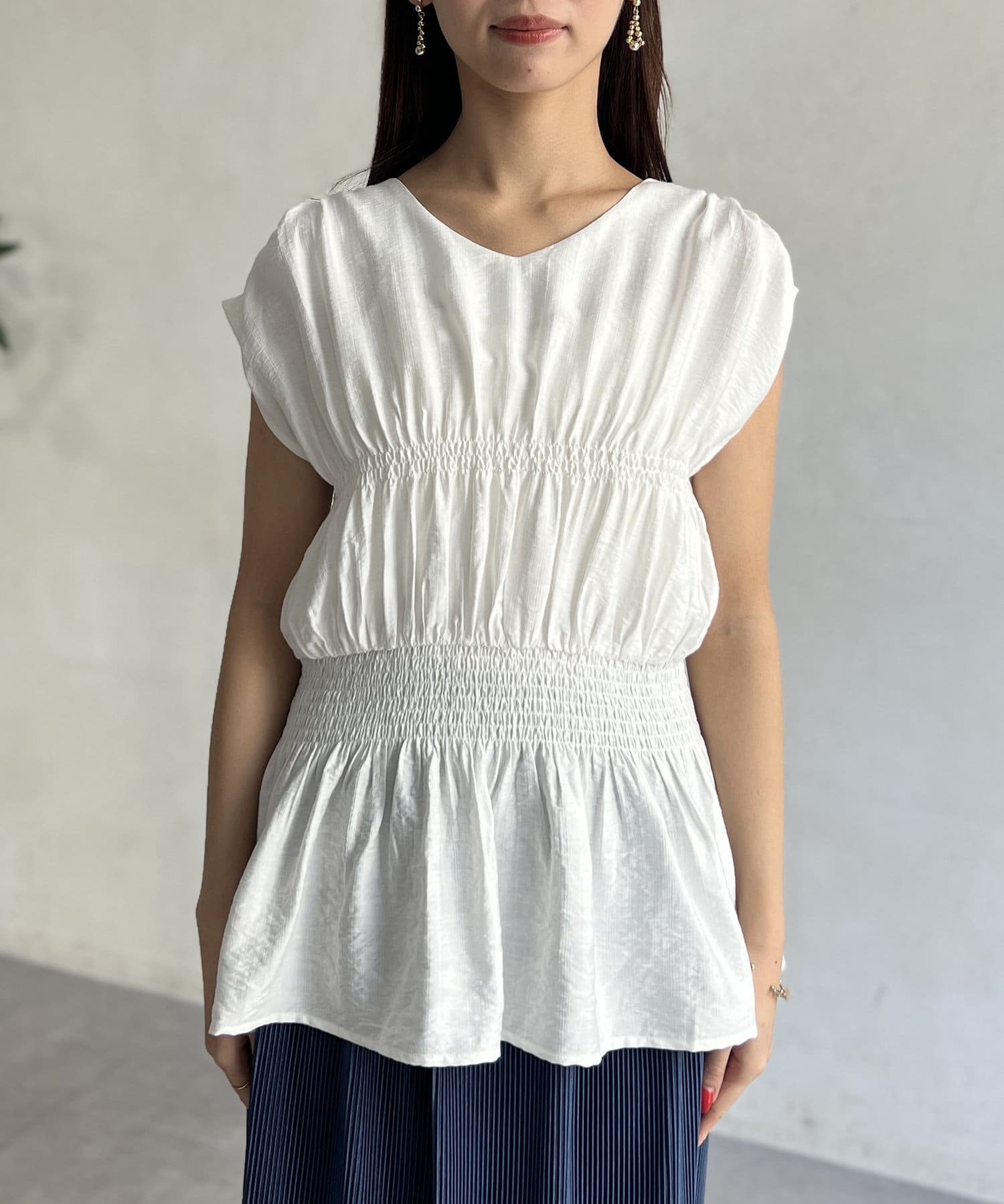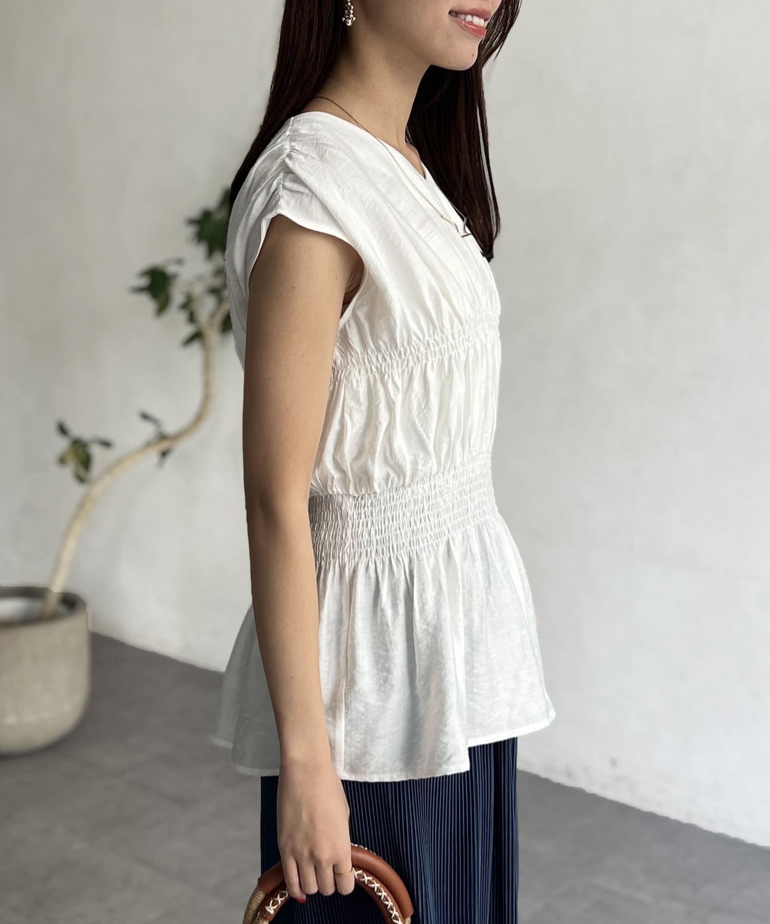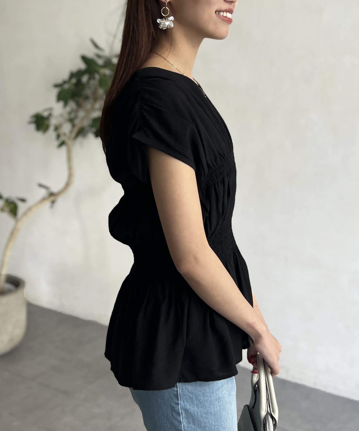 ウエスト部分のシャーリングが可愛くシンプルかつデザイン性のあるトップスです。