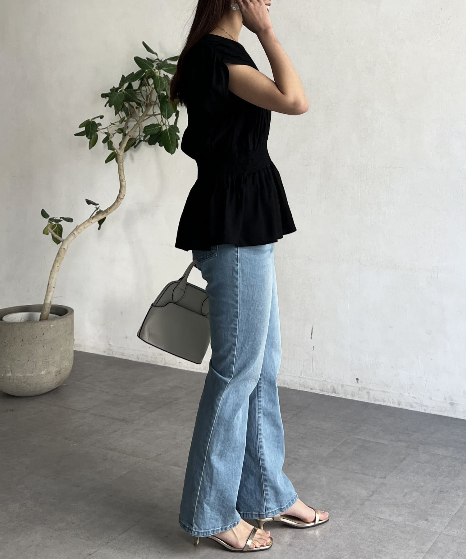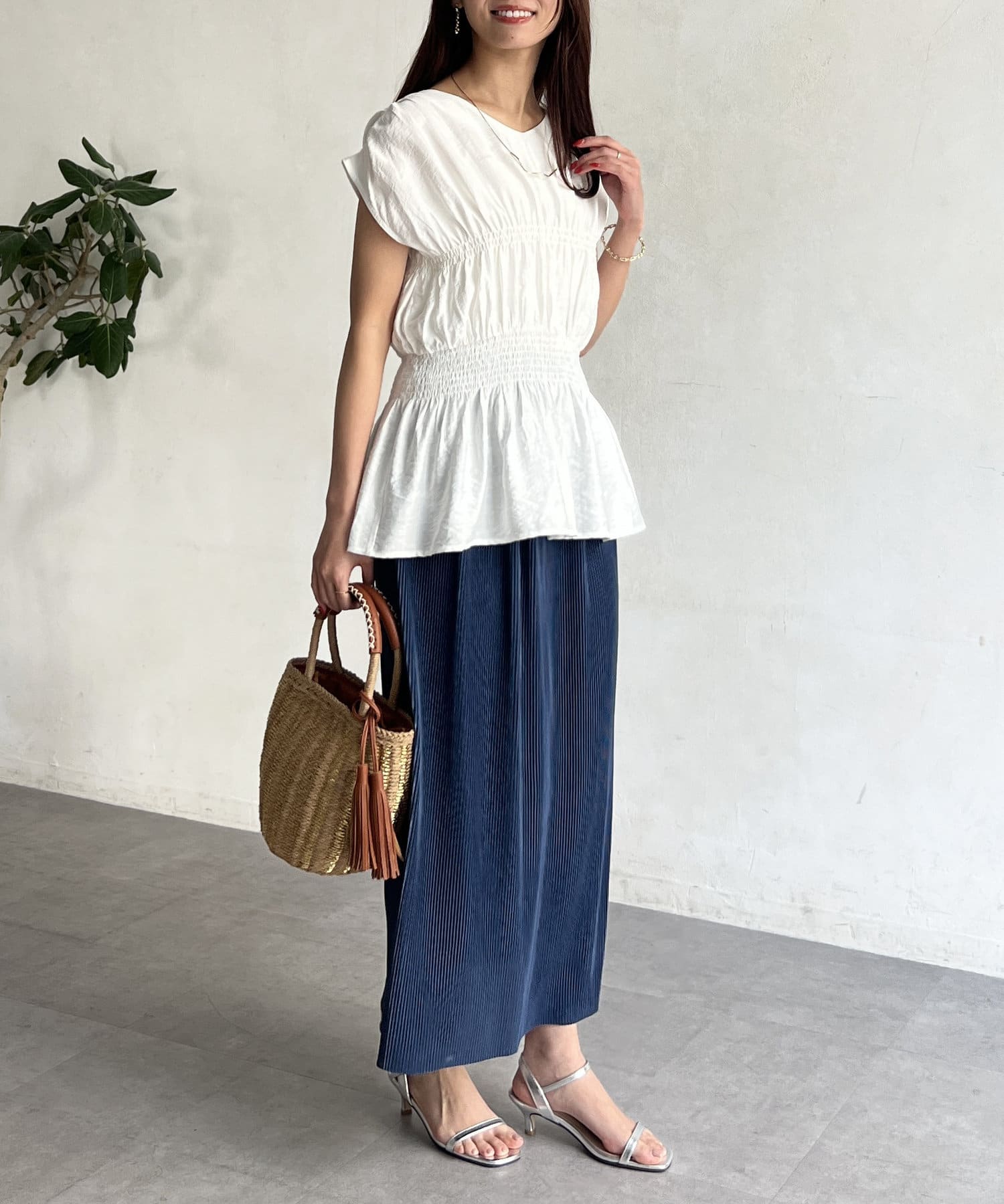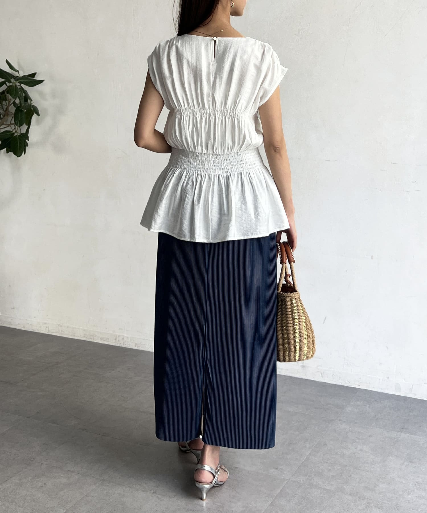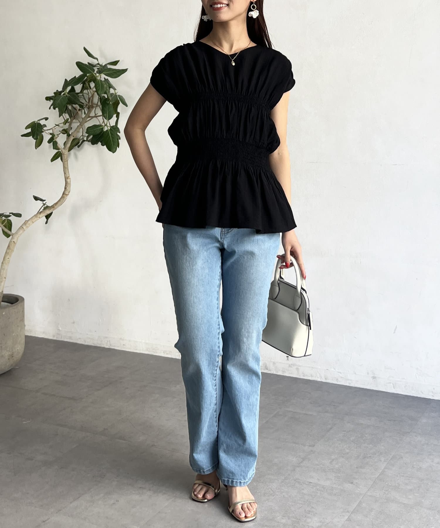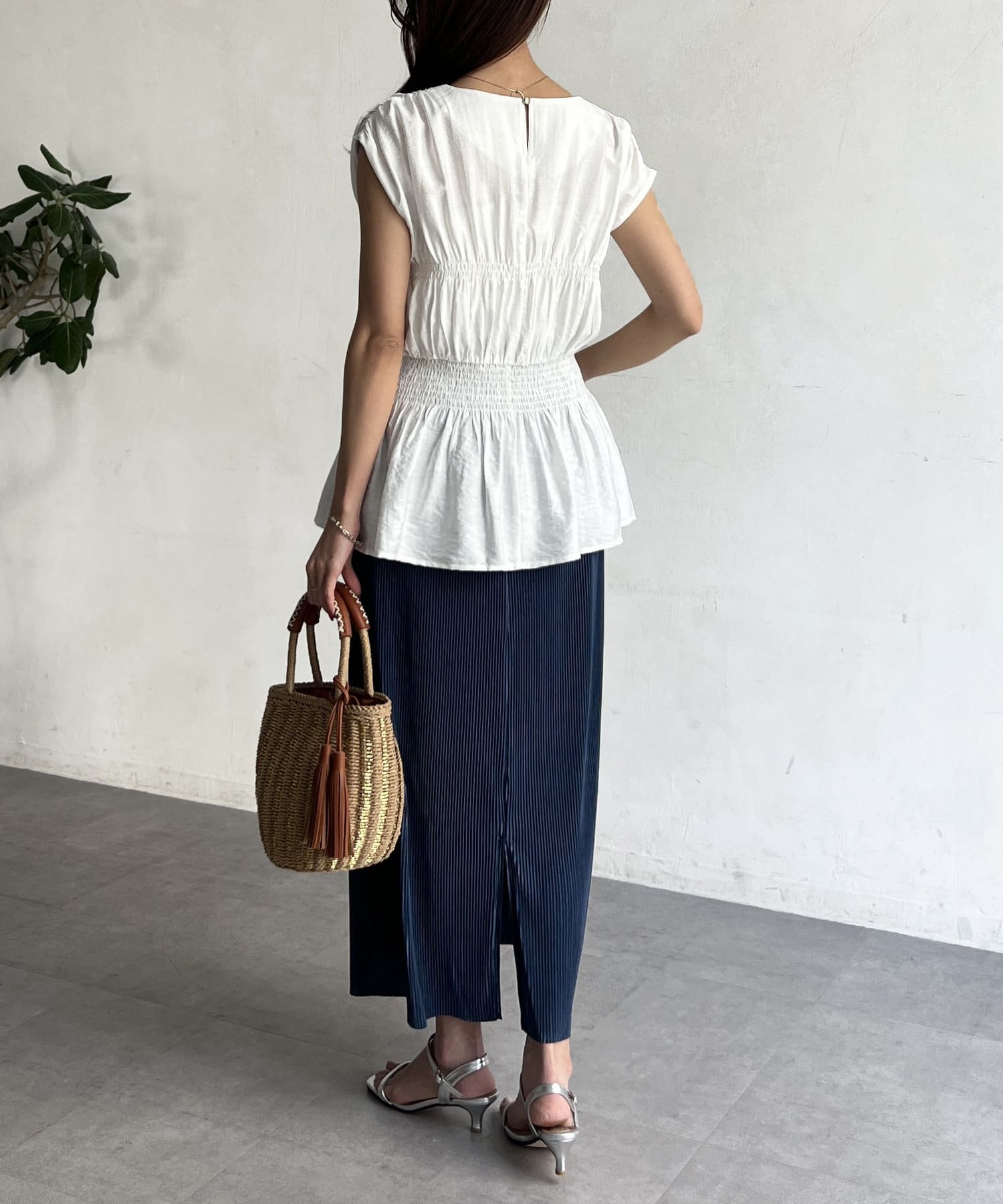 ウエスト部分のシャーリングが可愛くシンプルかつデザイン性のあるトップスです。