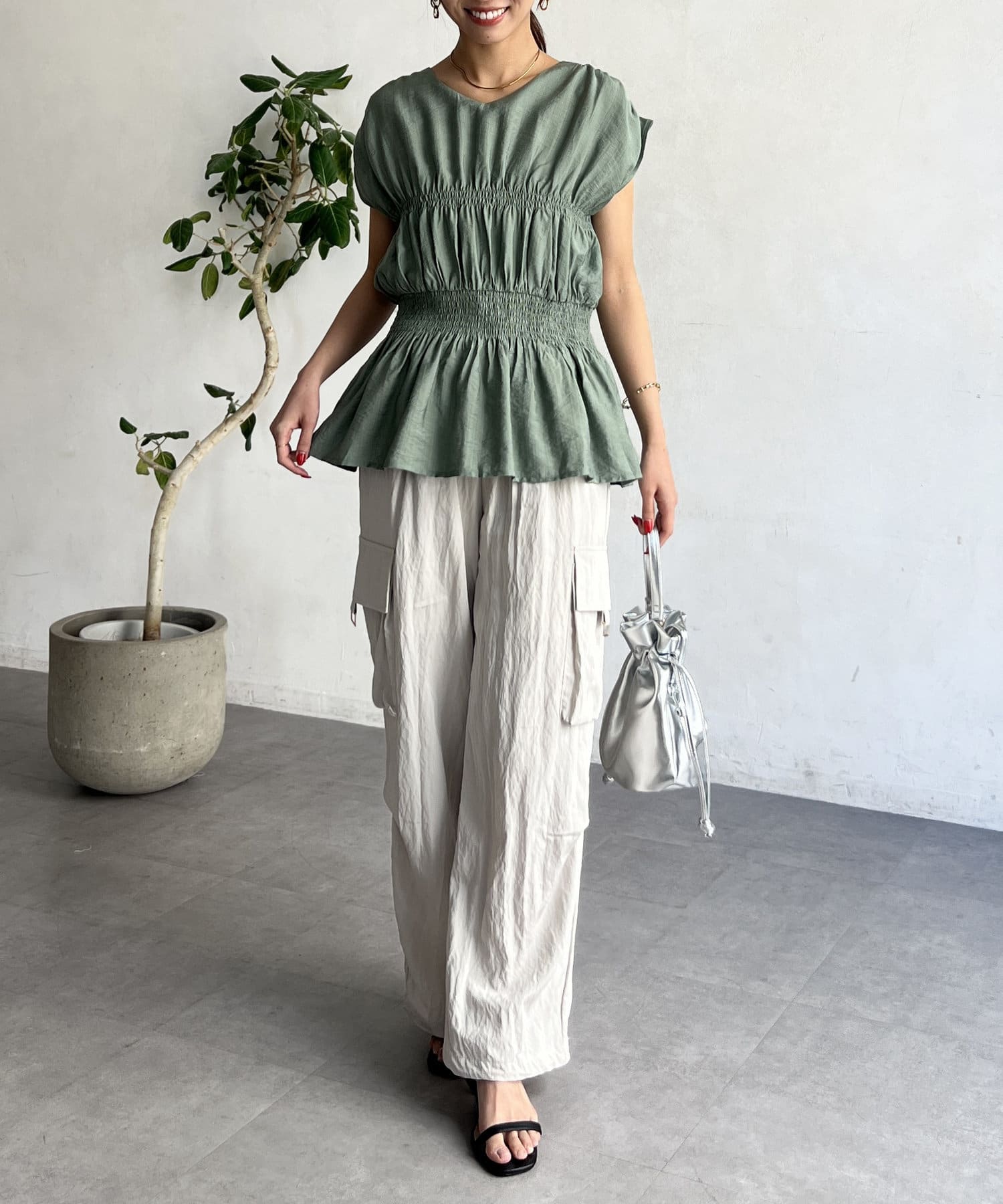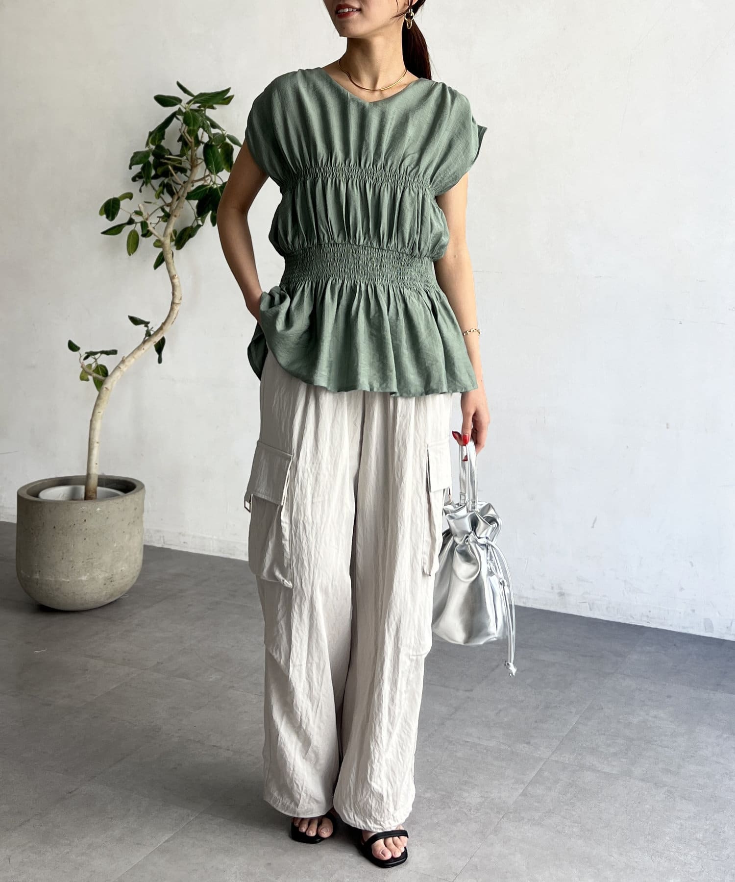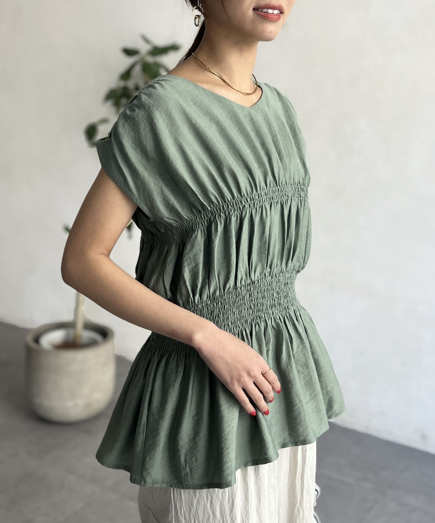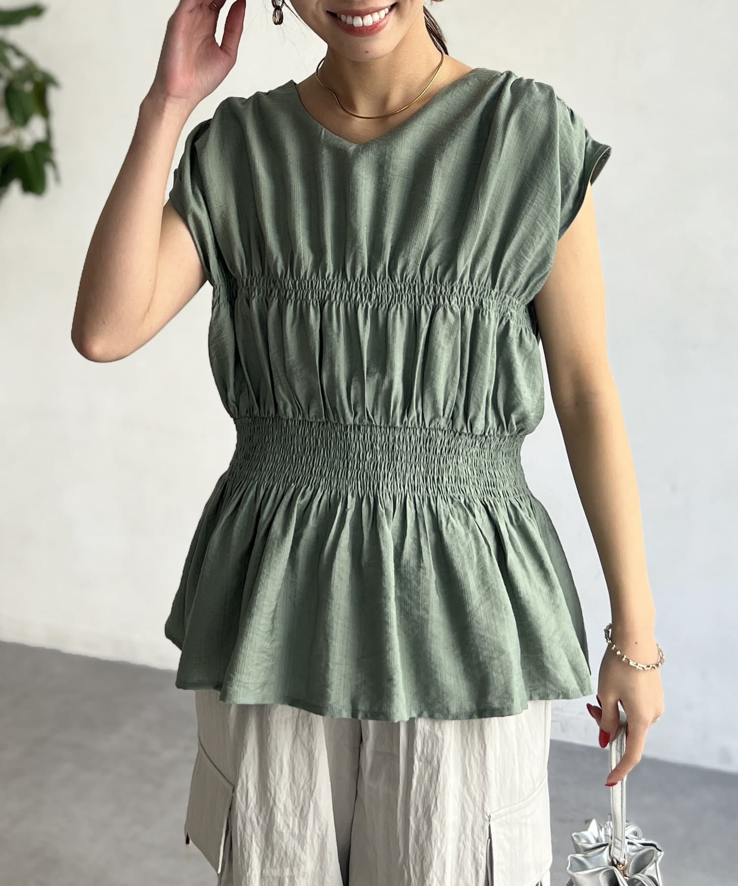 お洒落見えするシャーリングブラウス