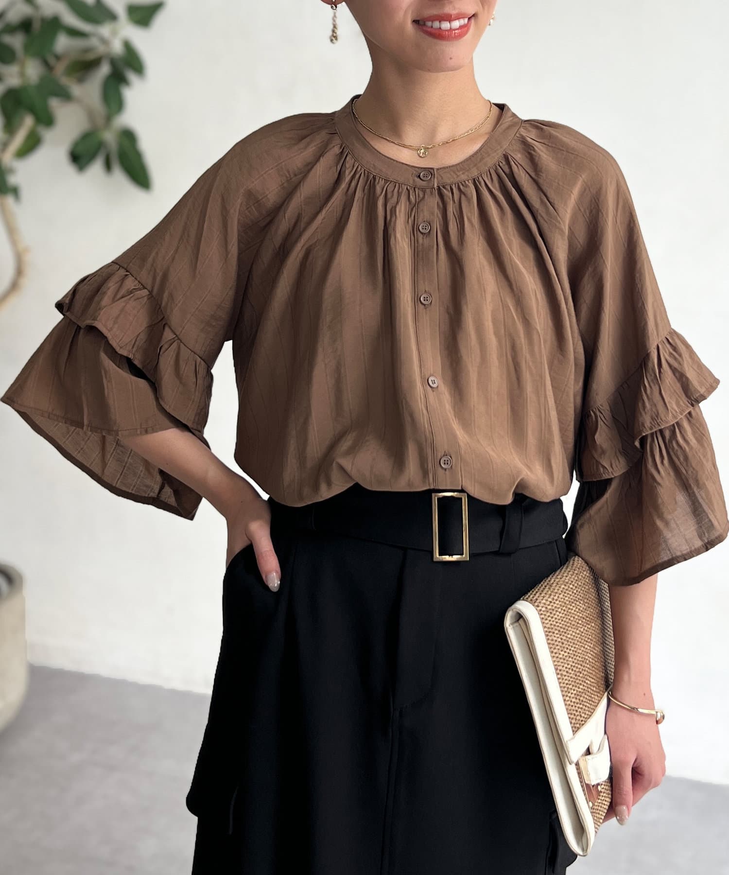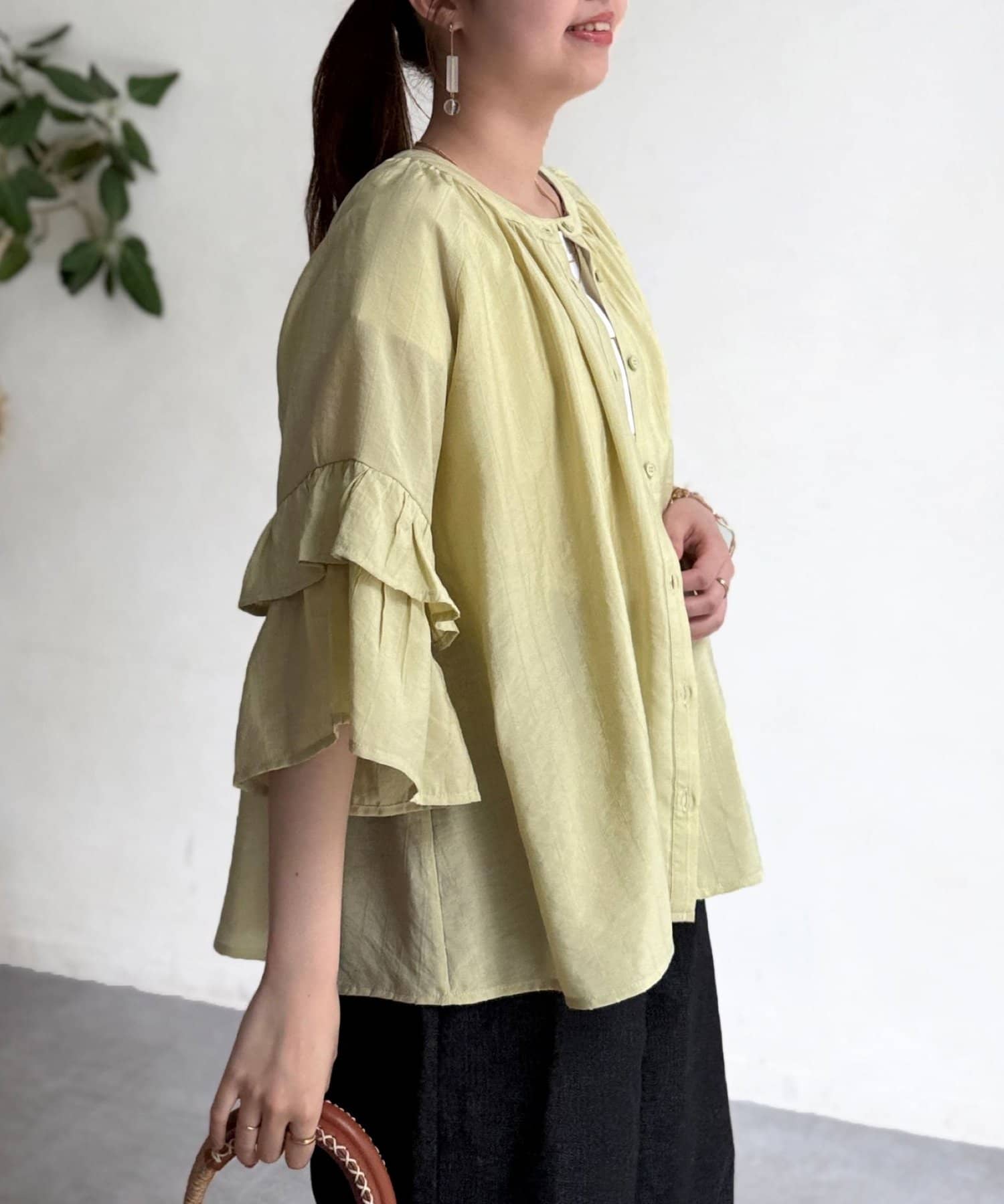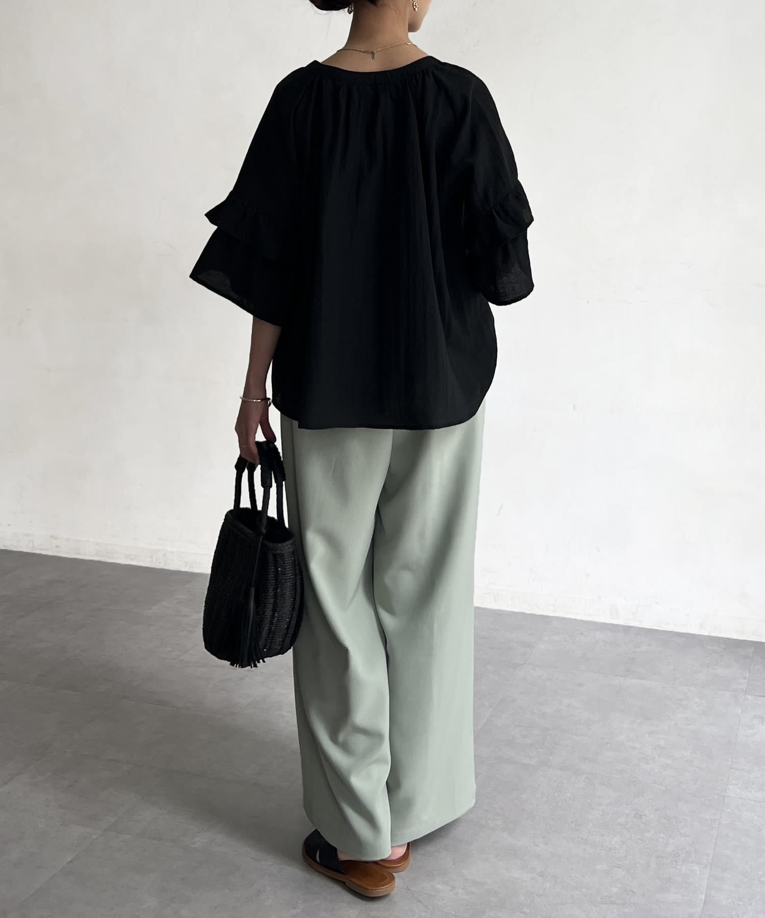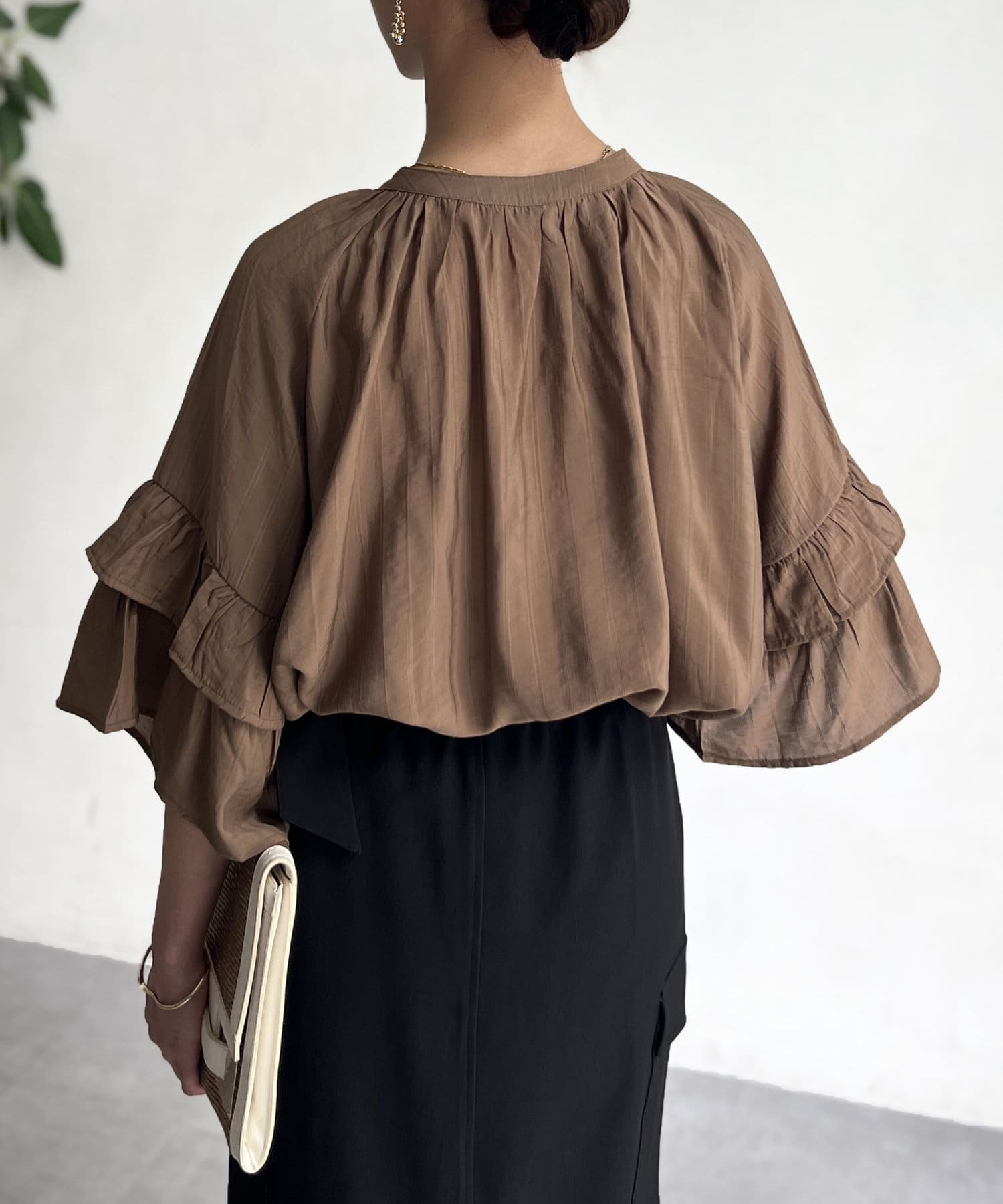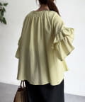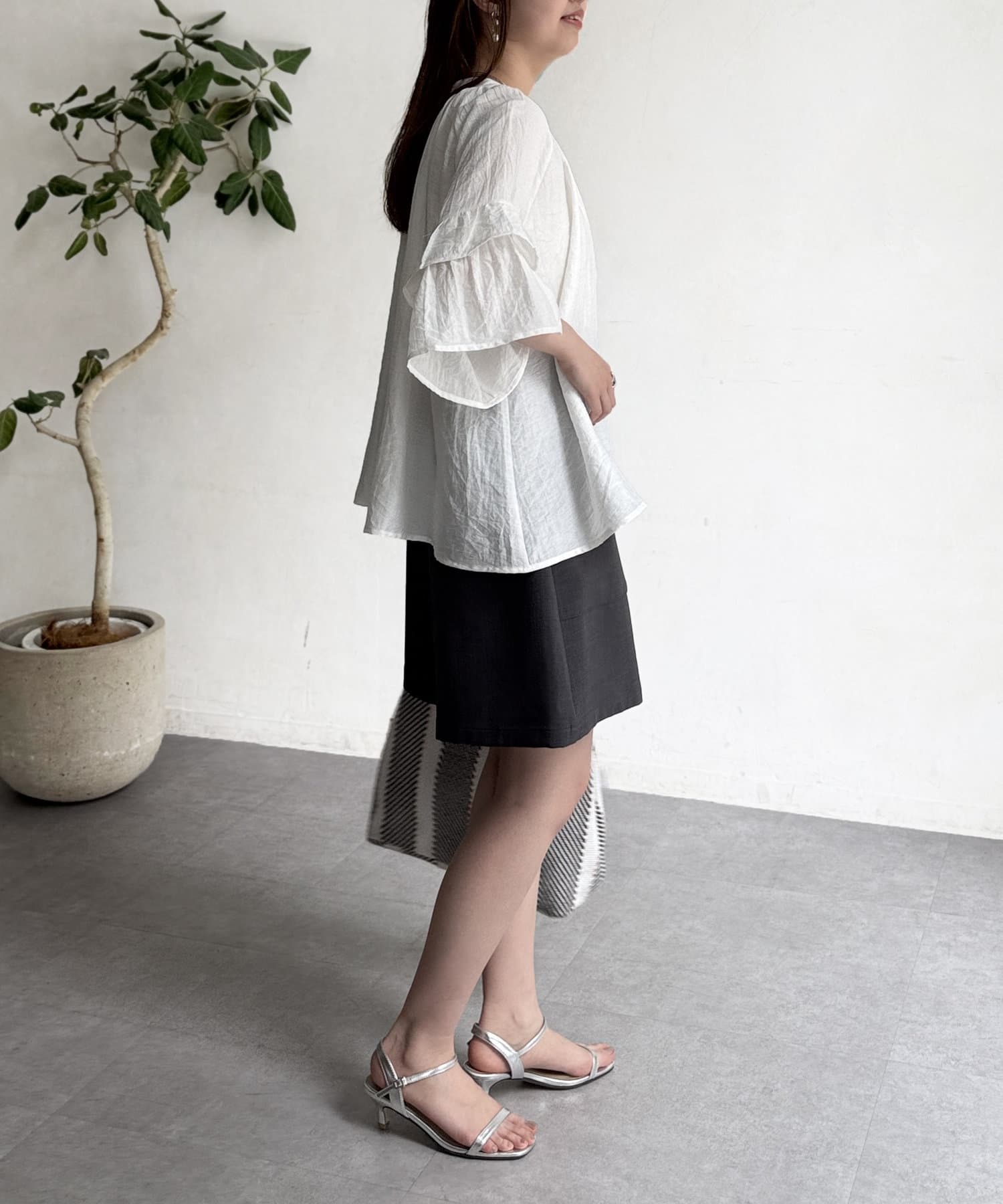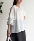 袖口のフレアデザインが女性らしく華やかな雰囲気のブラウス。