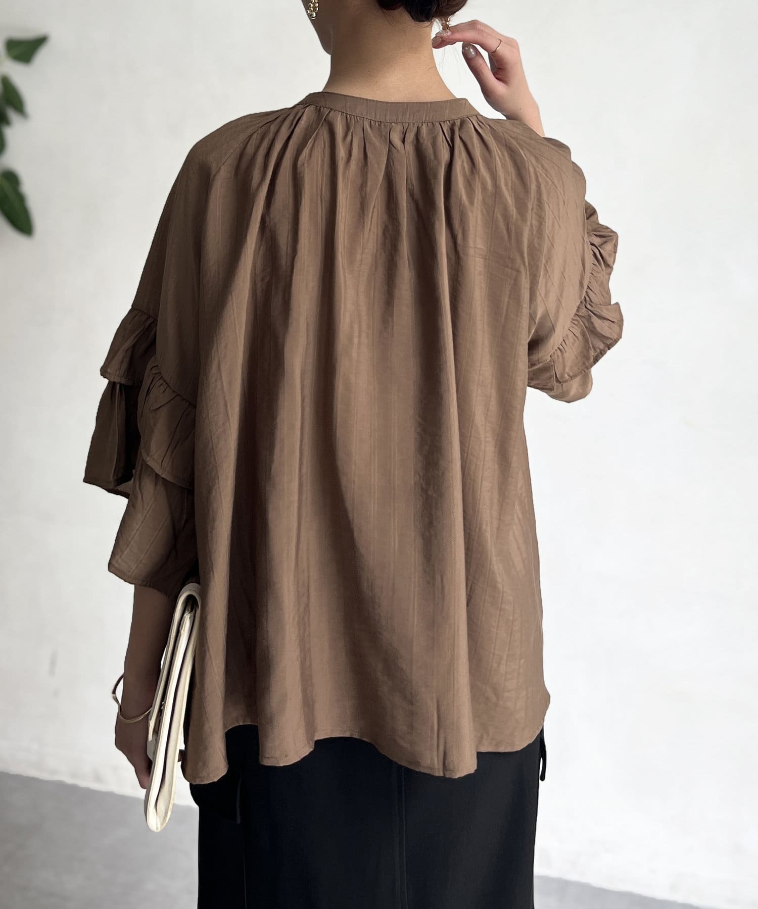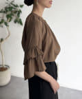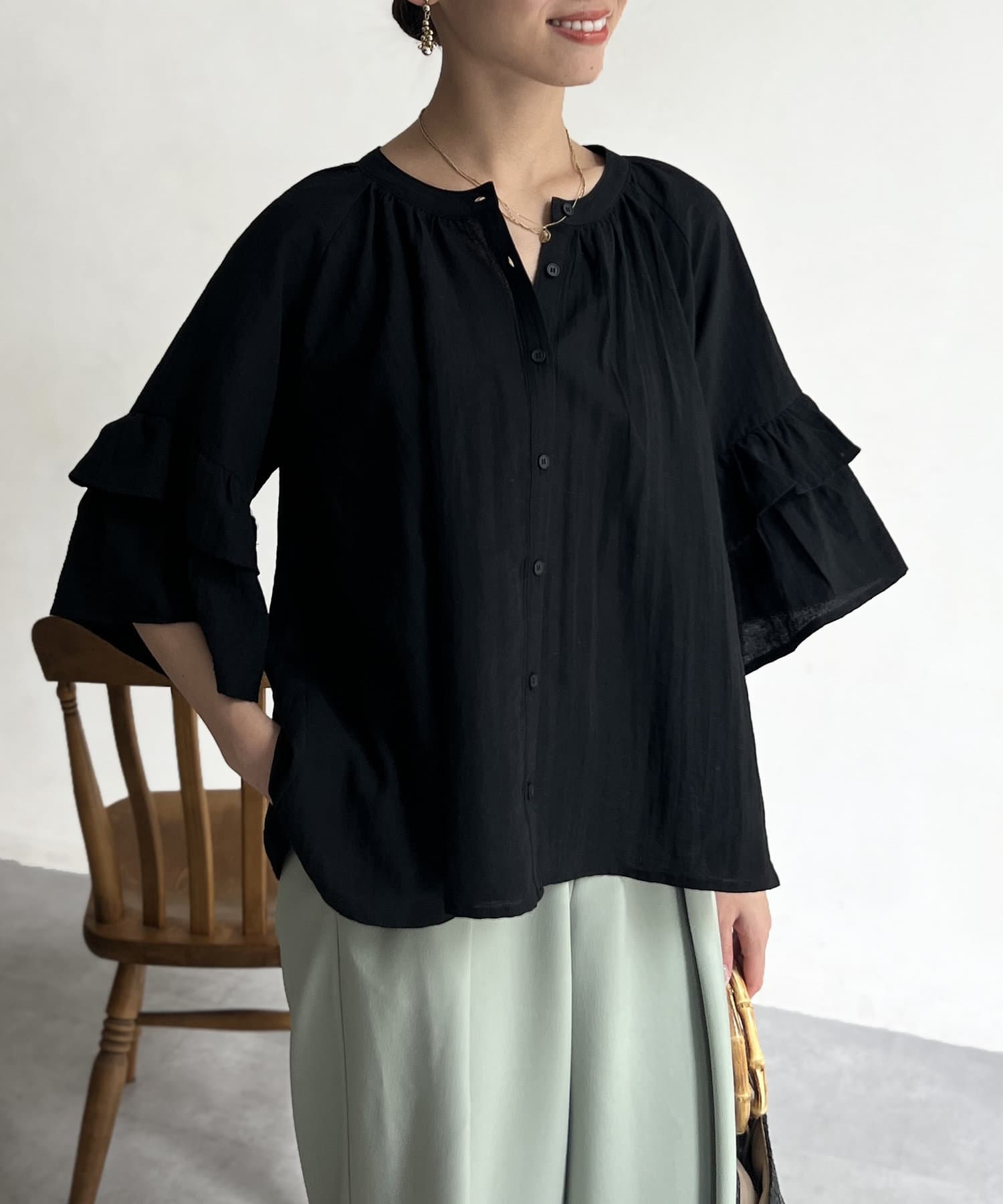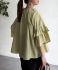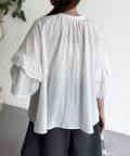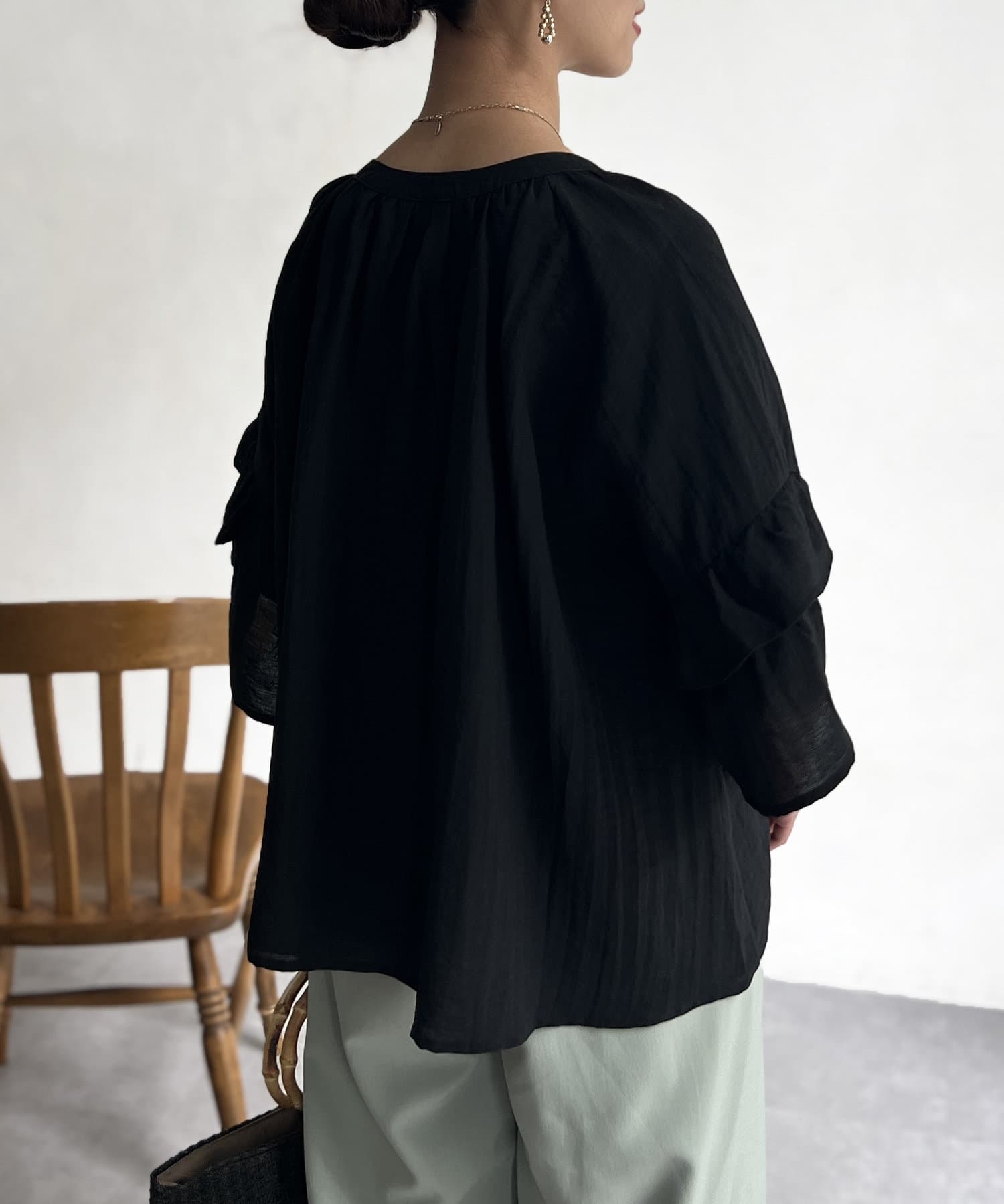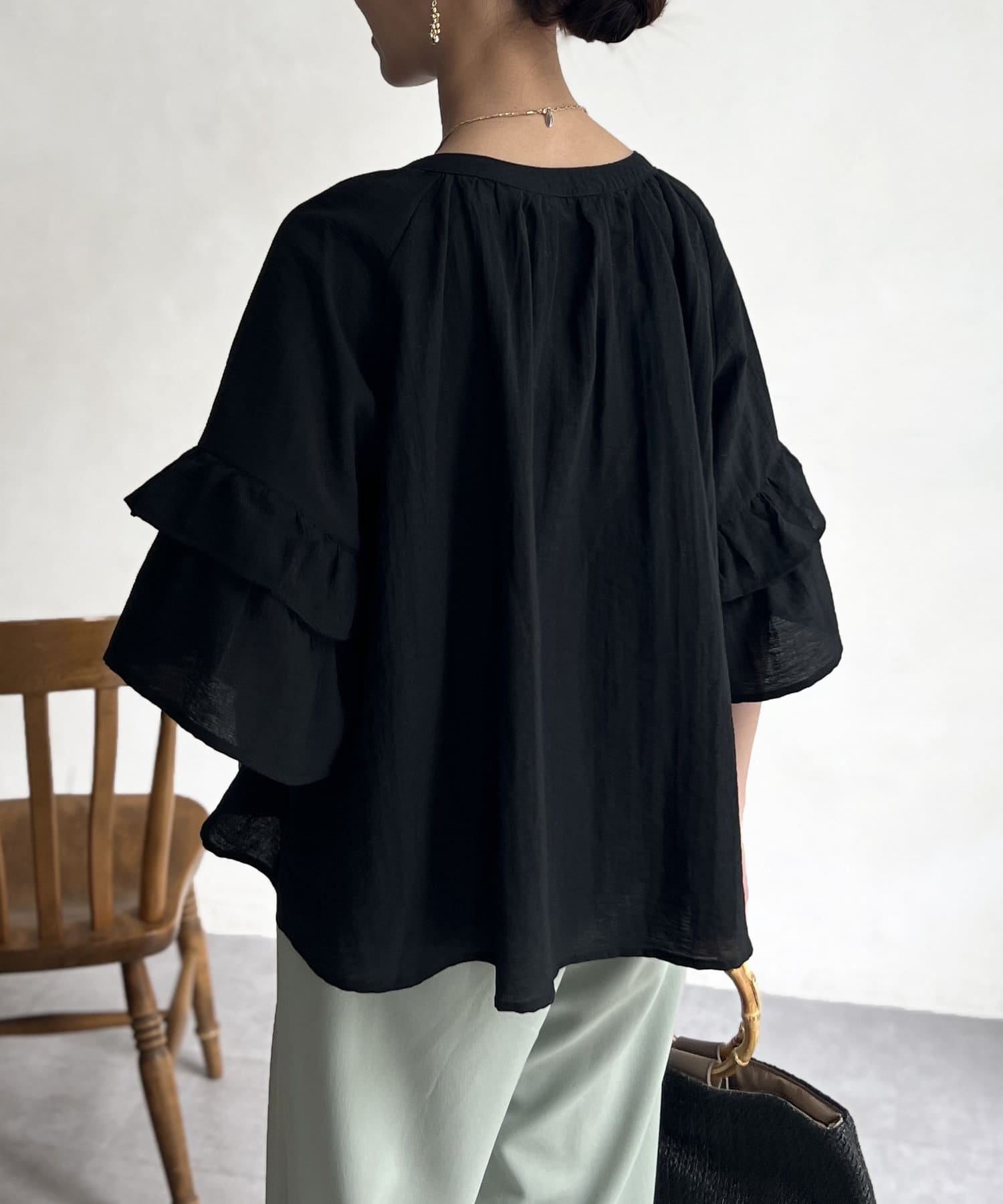 袖口のフレアデザインが女性らしく華やかな雰囲気のブラウス。